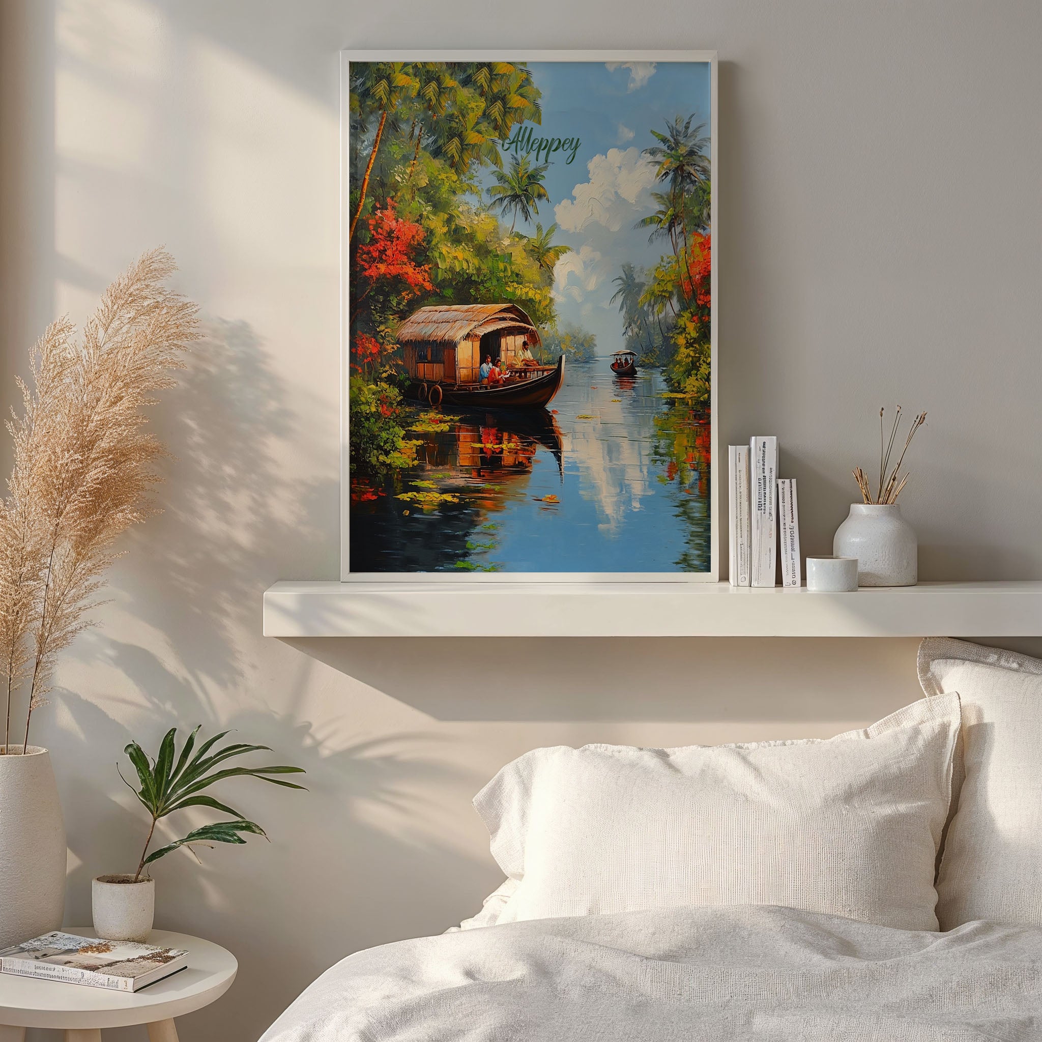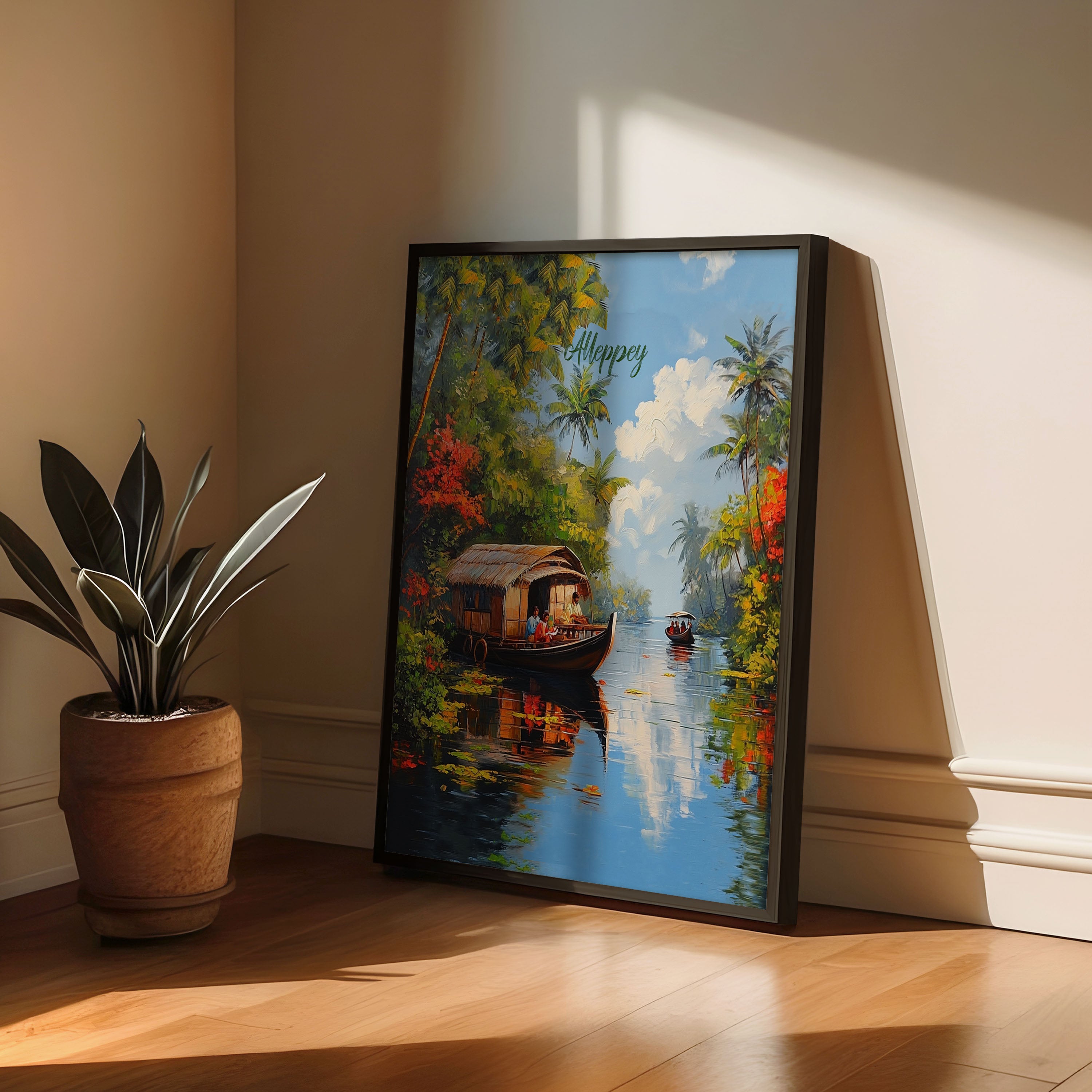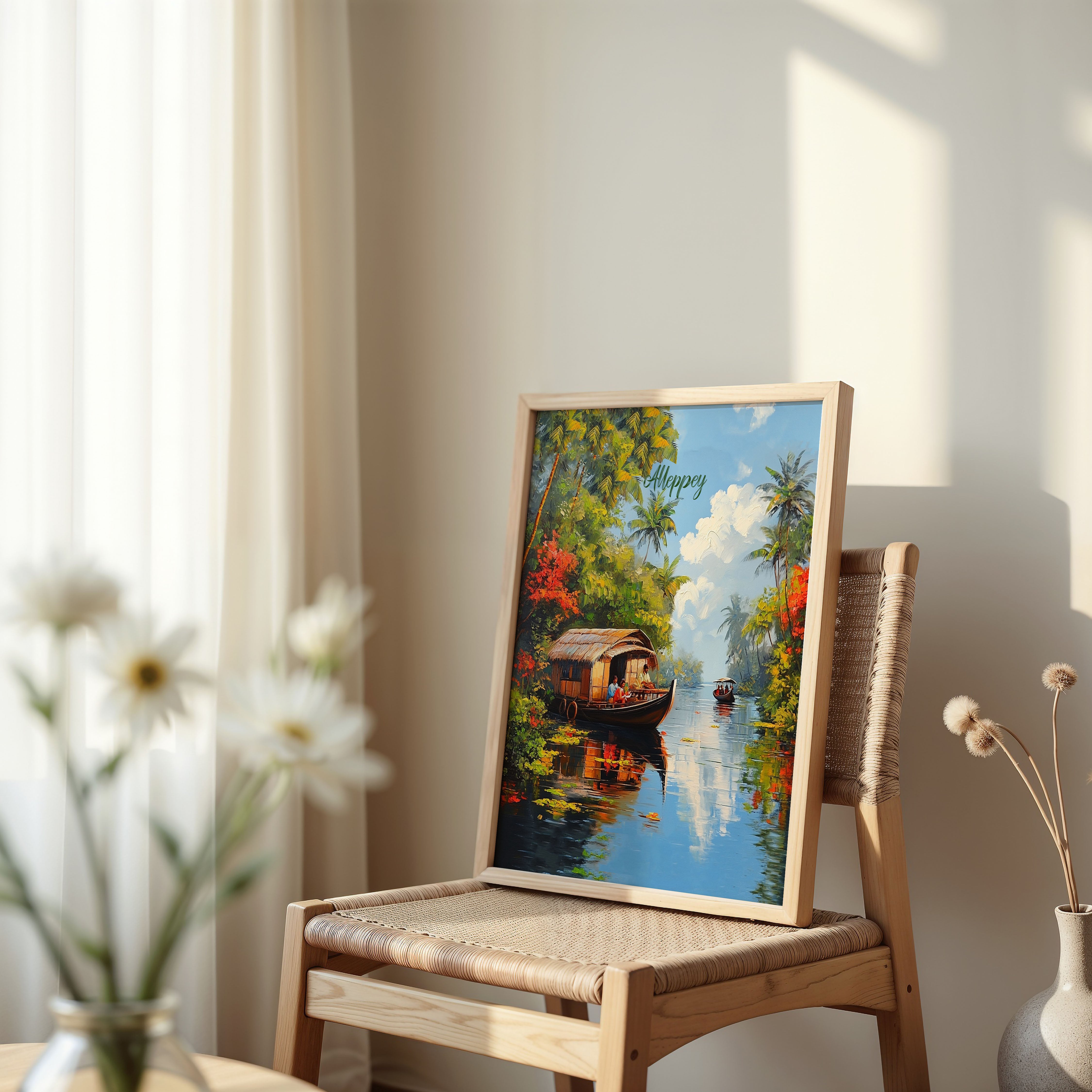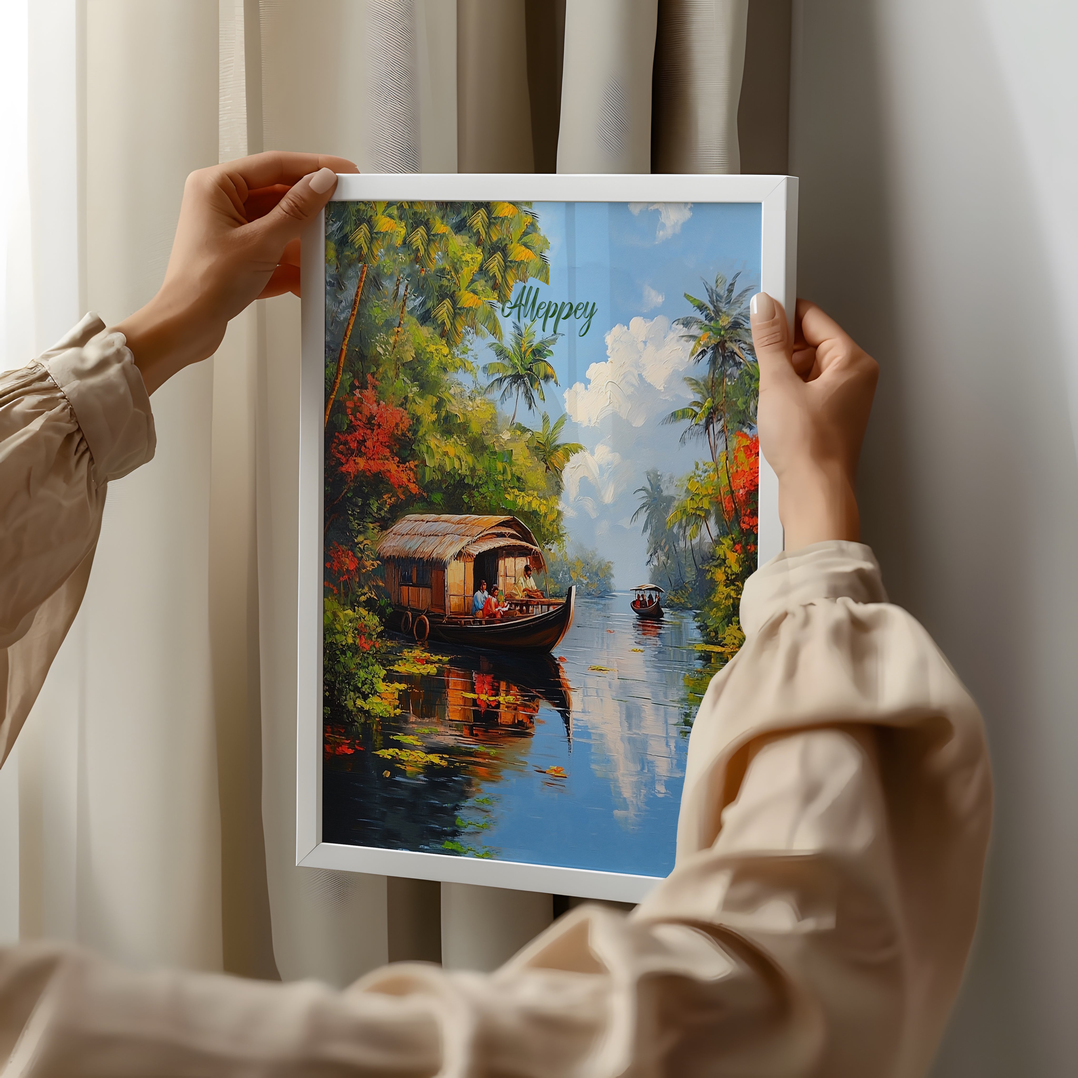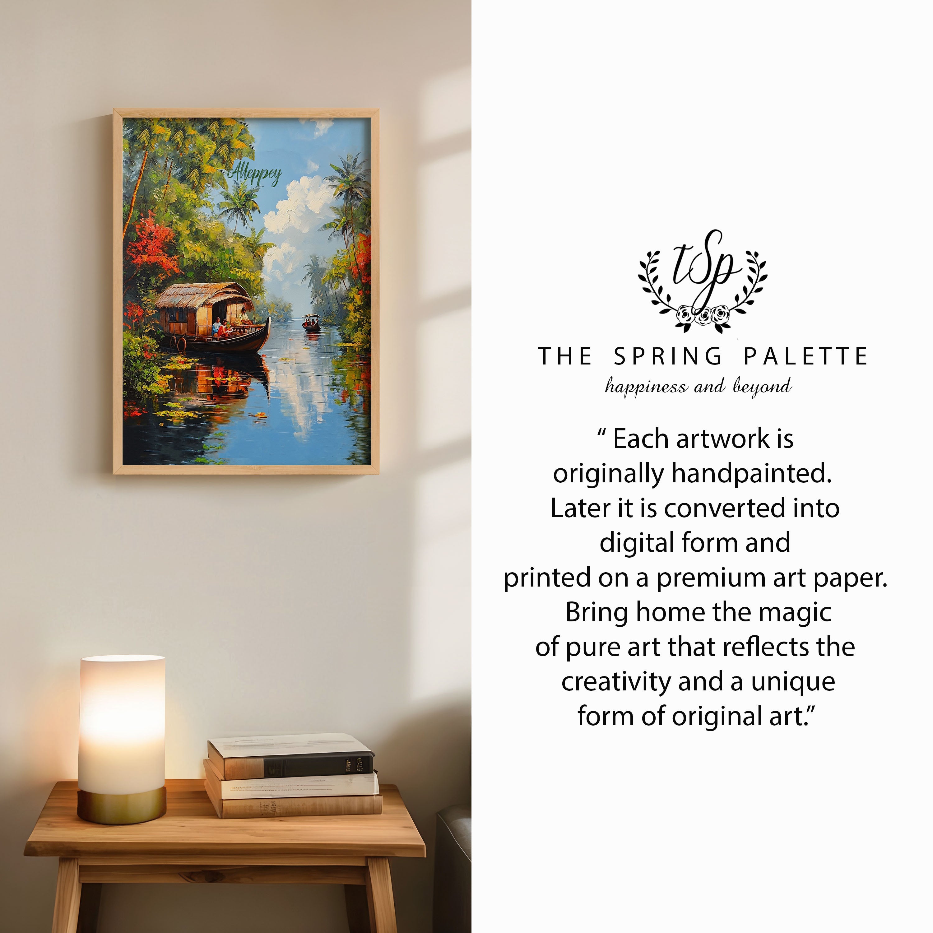 This vibrant illustration titled "Alleppey" captures the tranquil beauty of Kerala's backwaters. The artwork beautifully showcases a traditional houseboat, known as a "Kettuvallam," gliding through serene waters surrounded by lush greenery and tropical palm trees. The warm hues of the foliage and the reflections on the calm water create a peaceful and dreamy atmosphere. The artist’s brushwork and vivid color palette bring to life the charm and culture of Alleppey's famous waterways, making this piece a perfect tribute to the beauty of South India.