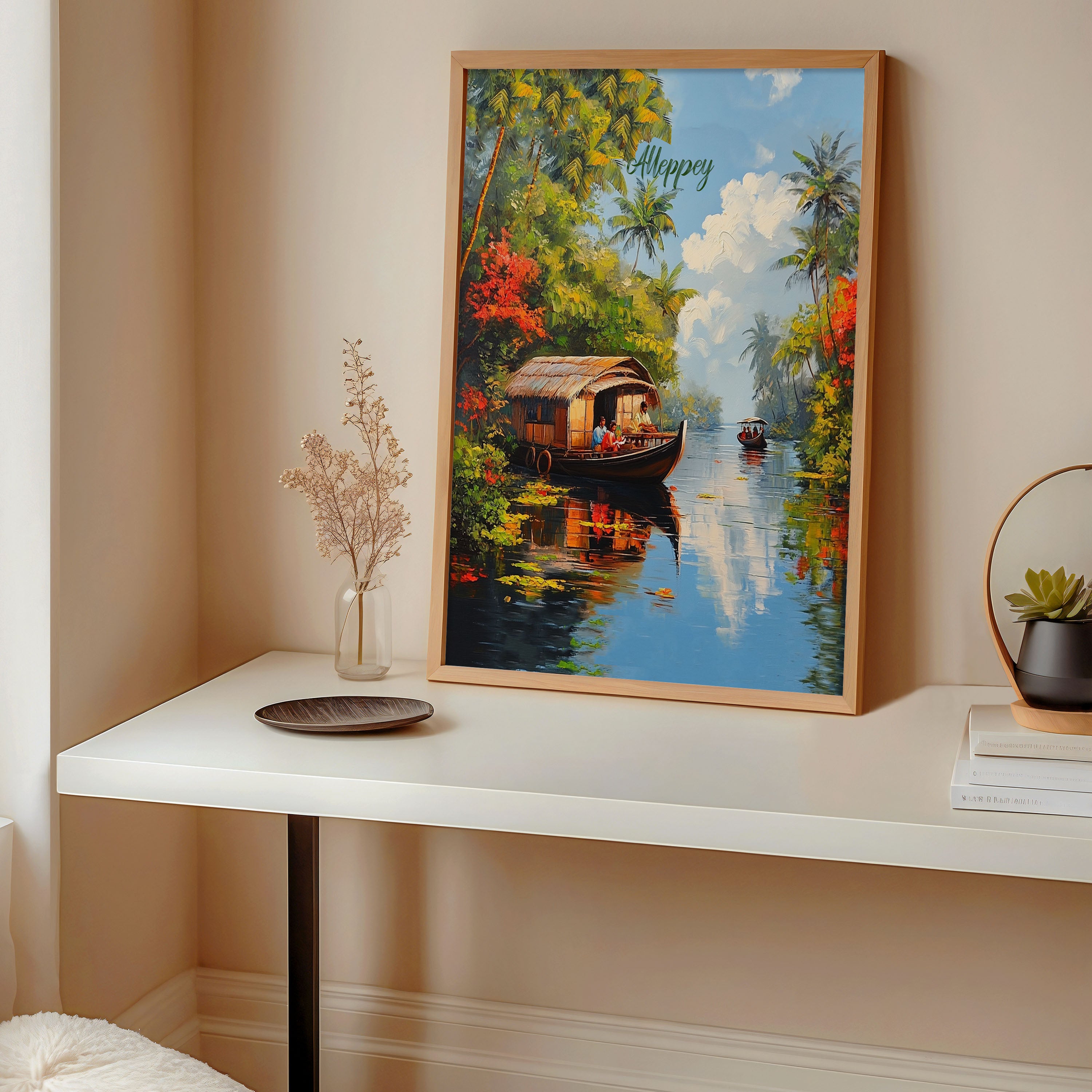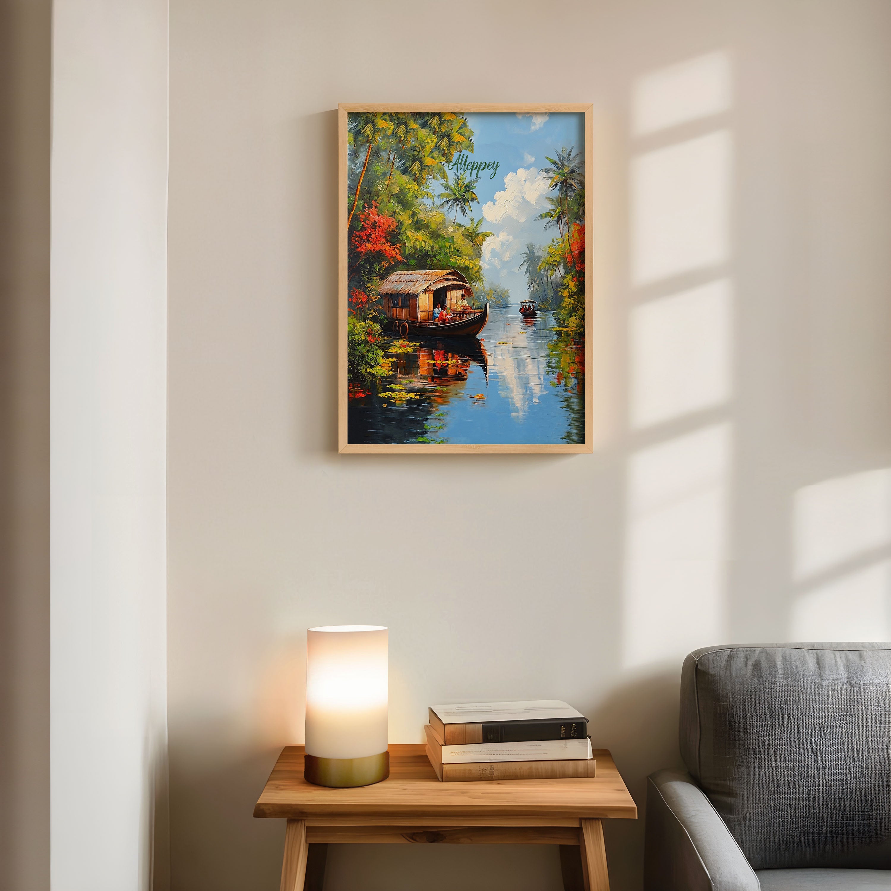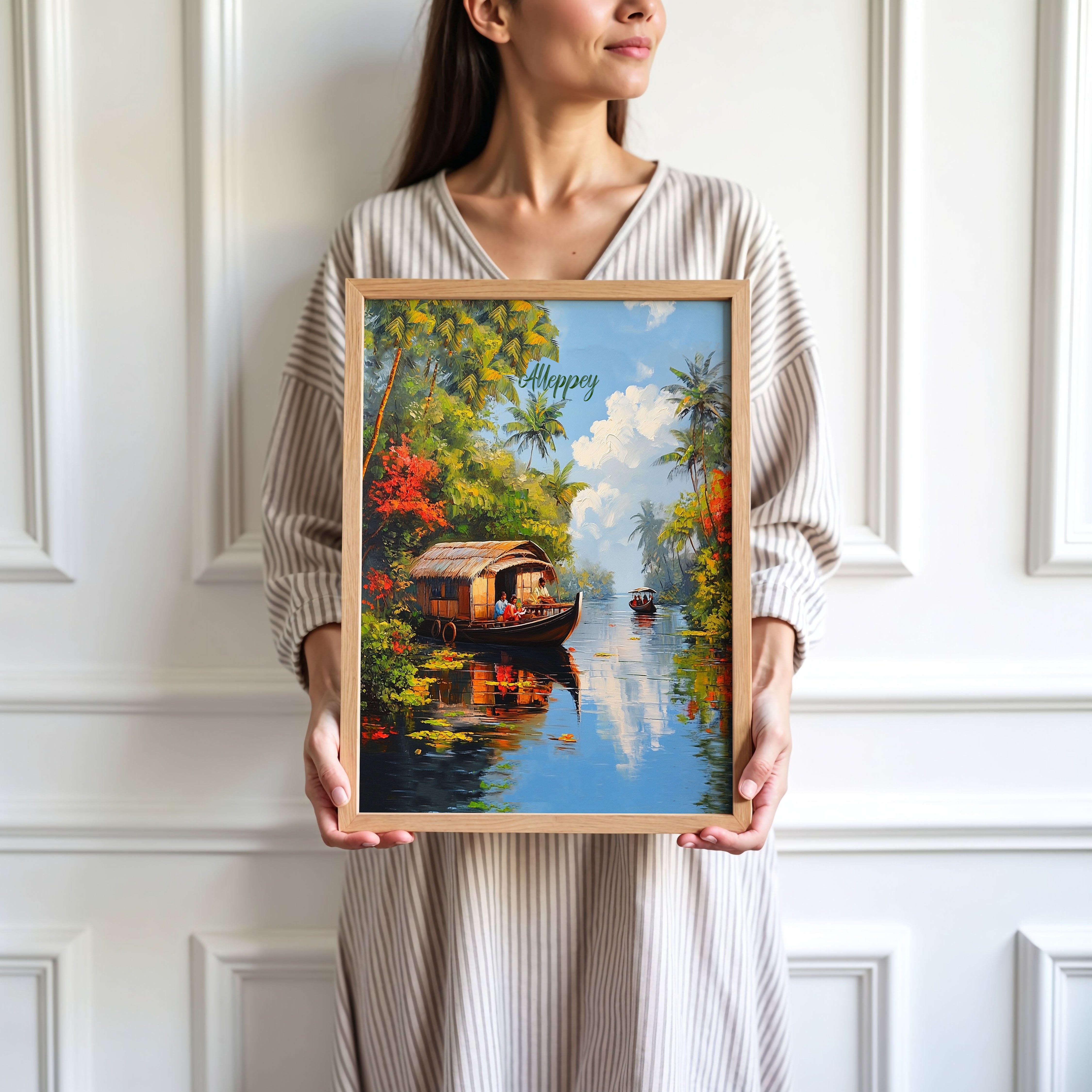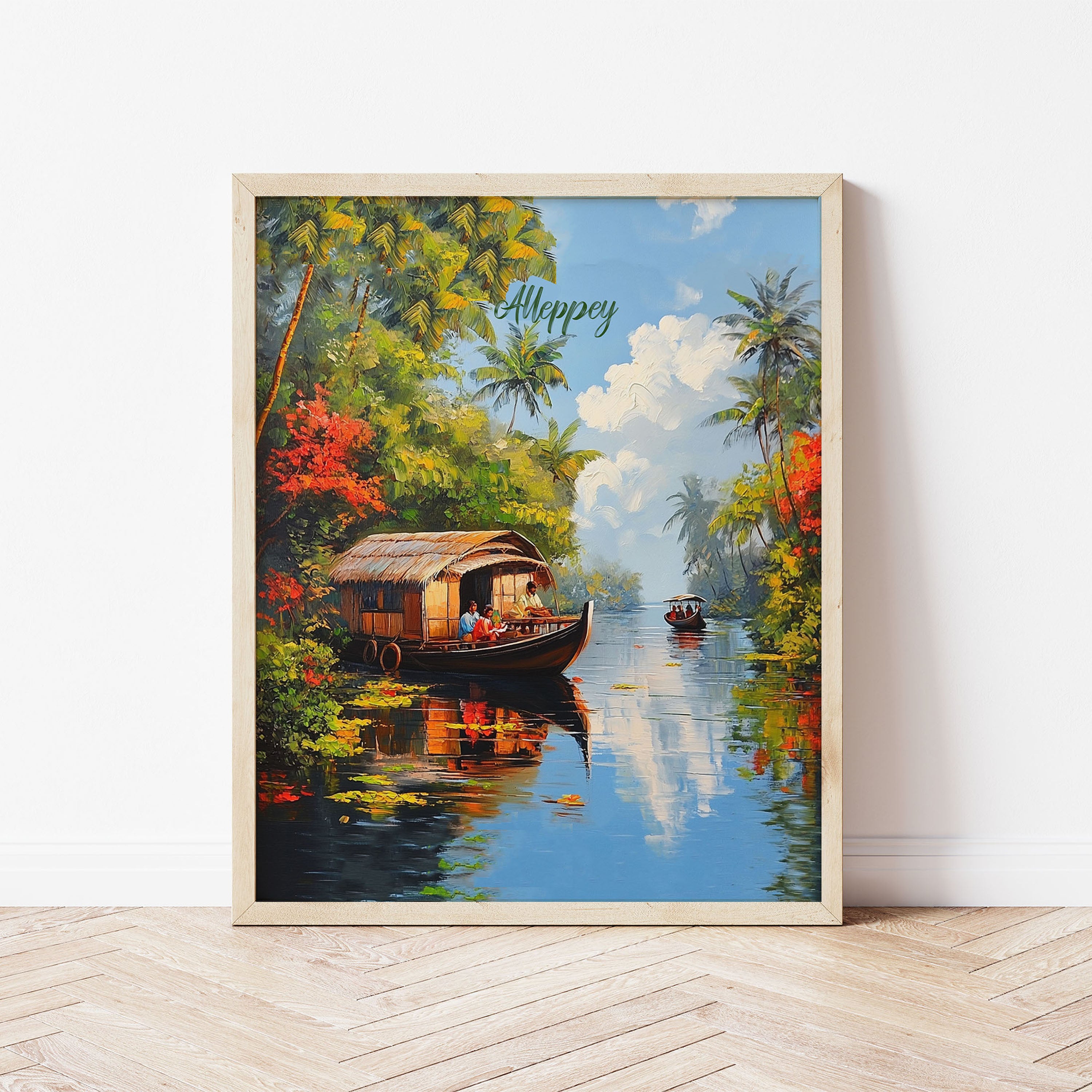 This vibrant illustration titled "Alleppey" captures the tranquil beauty of Kerala's backwaters. The artwork beautifully showcases a traditional houseboat, known as a "Kettuvallam," gliding through serene waters surrounded by lush greenery and tropical palm trees. The warm hues of the foliage and the reflections on the calm water create a peaceful and dreamy atmosphere. The artist’s brushwork and vivid color palette bring to life the charm and culture of Alleppey's famous waterways, making this piece a perfect tribute to the beauty of South India.
