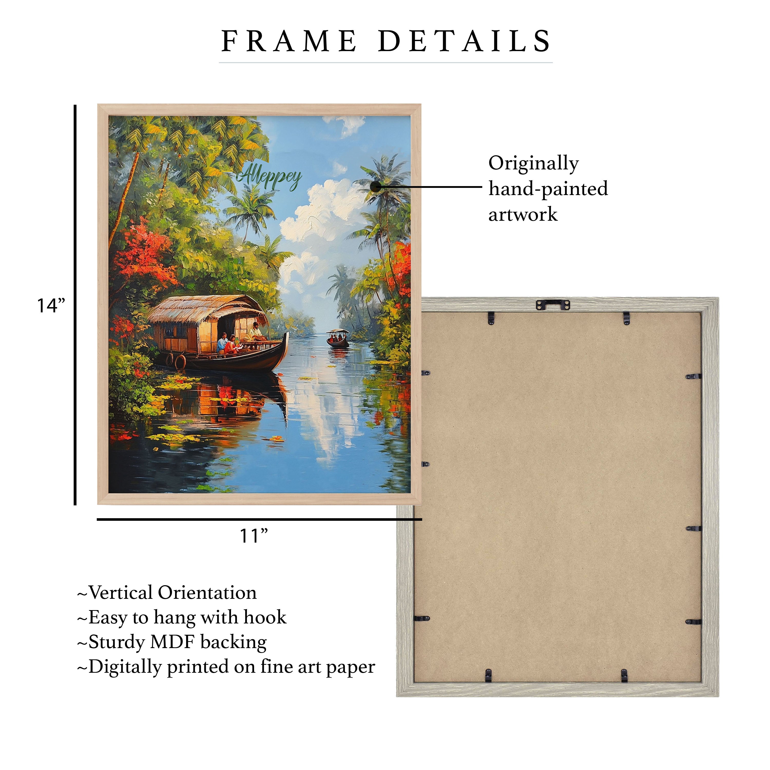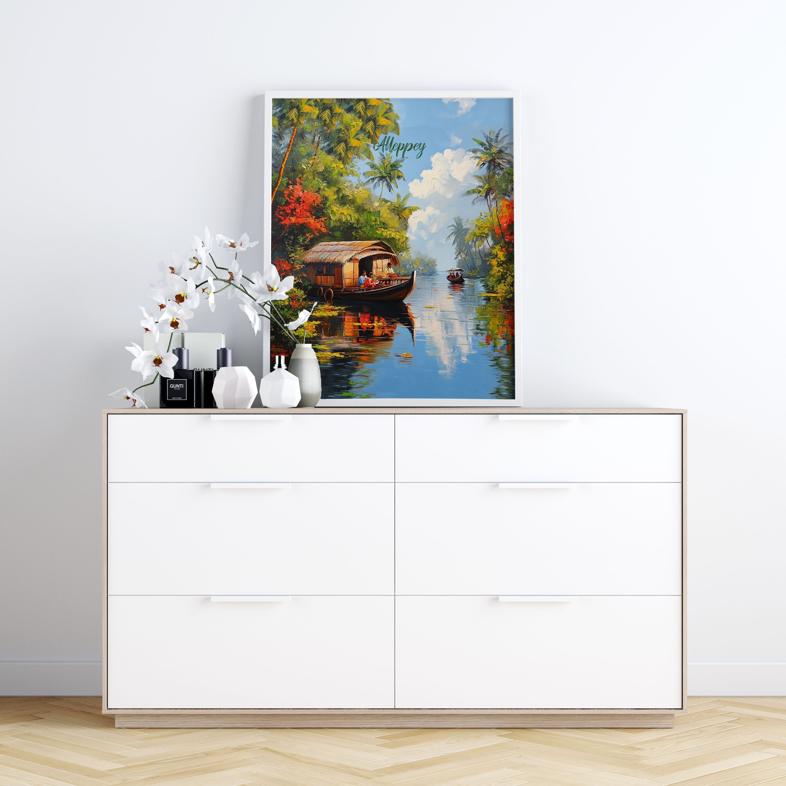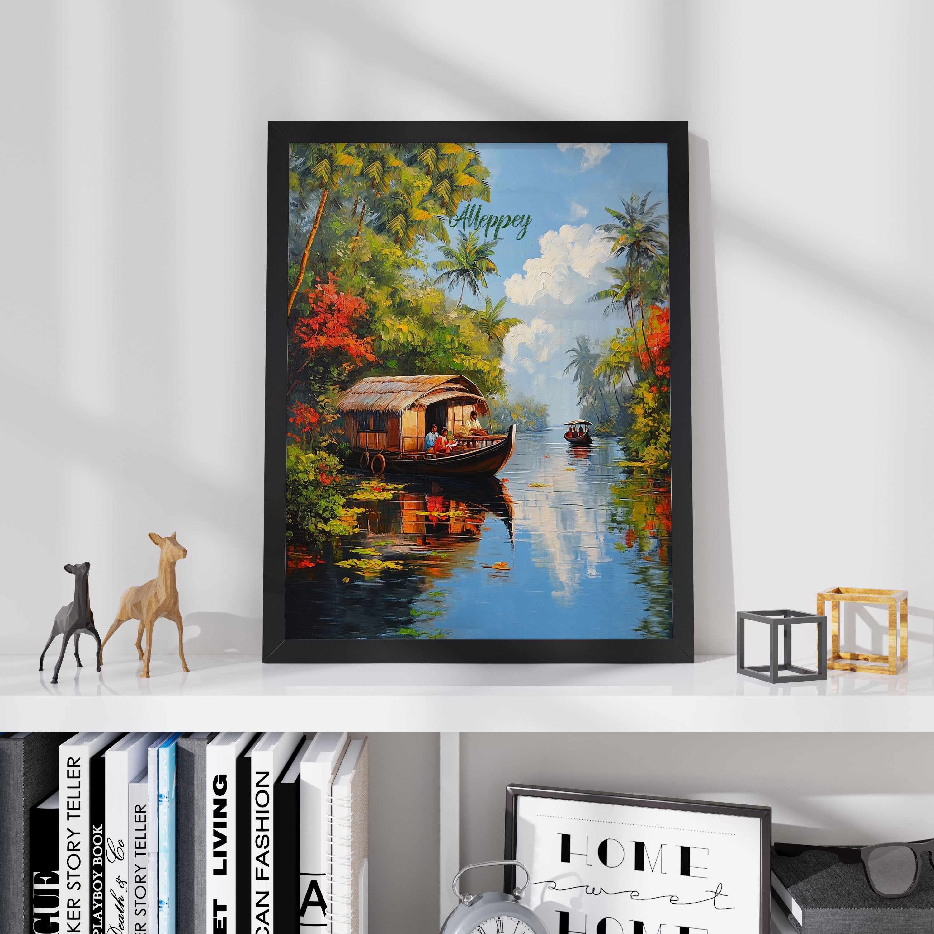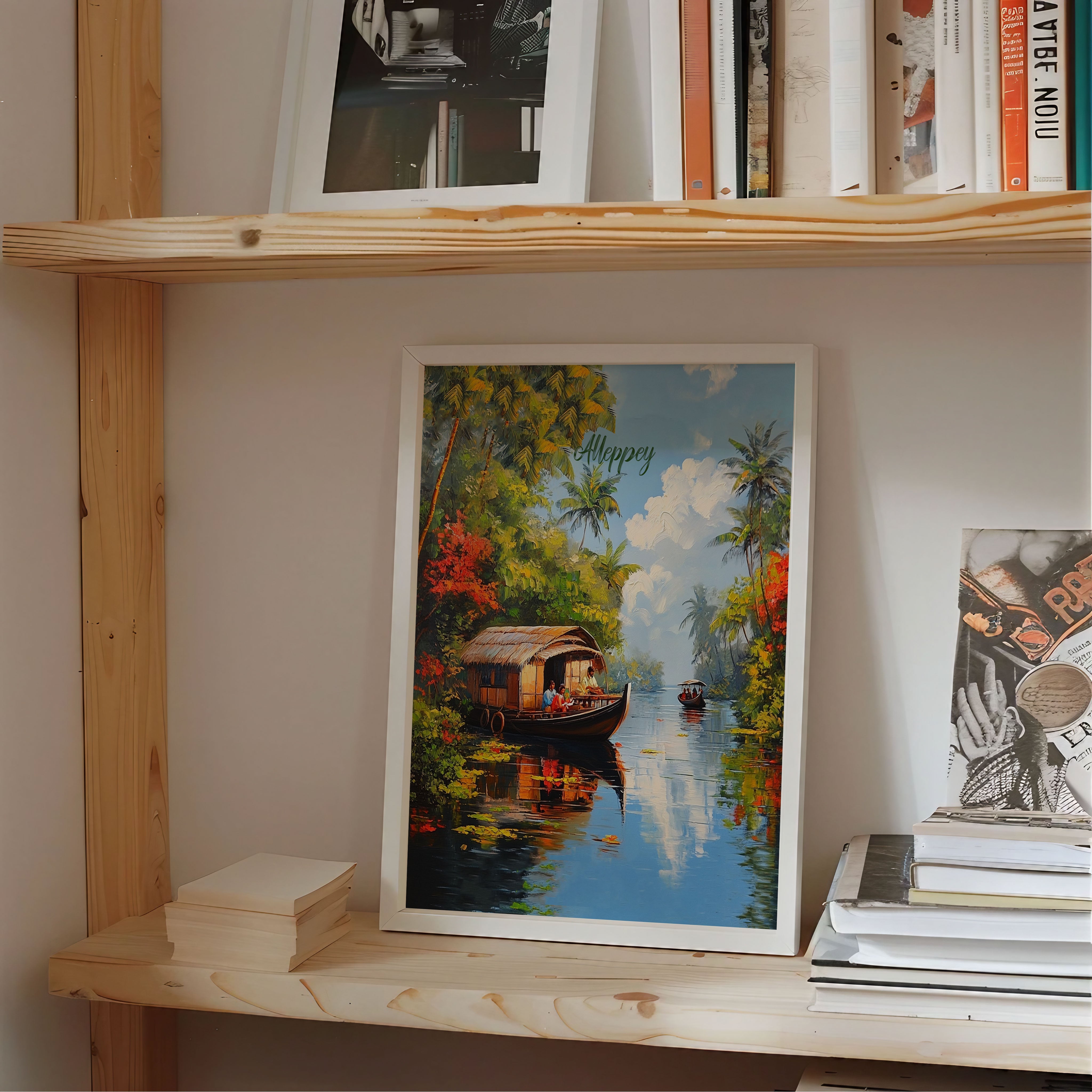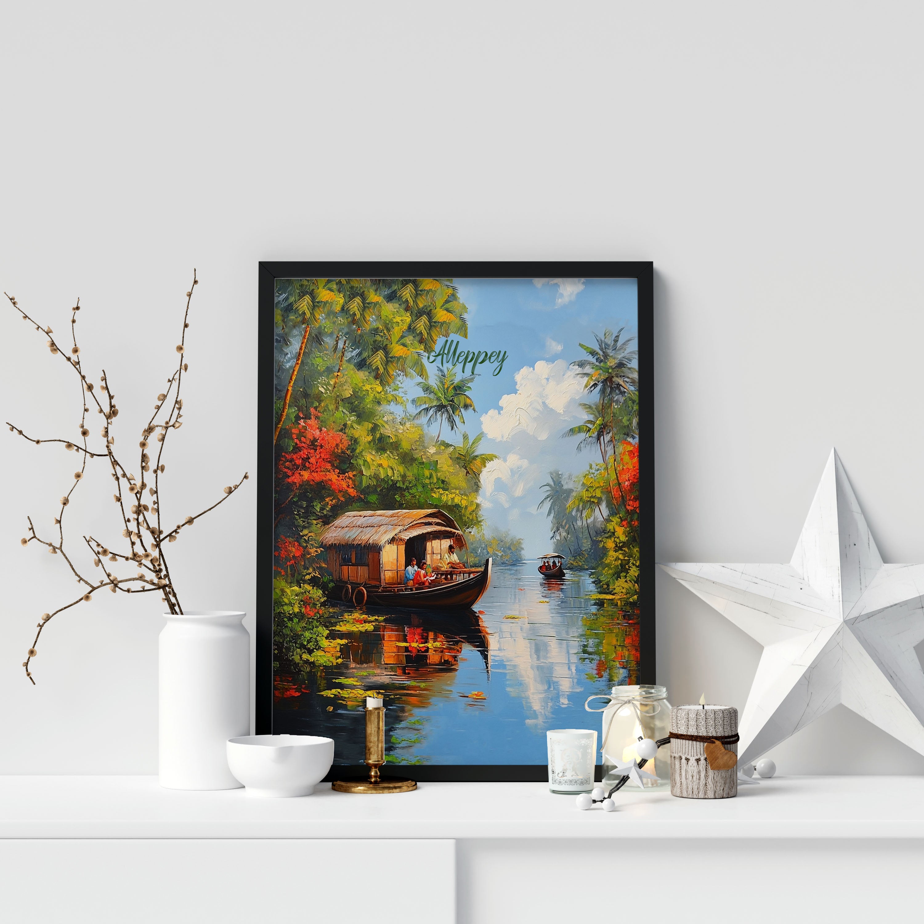 This vibrant illustration titled "Alleppey" captures the tranquil beauty of Kerala's backwaters. The artwork beautifully showcases a traditional houseboat, known as a "Kettuvallam," gliding through serene waters surrounded by lush greenery and tropical palm trees. The warm hues of the foliage and the reflections on the calm water create a peaceful and dreamy atmosphere. The artist’s brushwork and vivid color palette bring to life the charm and culture of Alleppey's famous waterways, making this piece a perfect tribute to the beauty of South India.