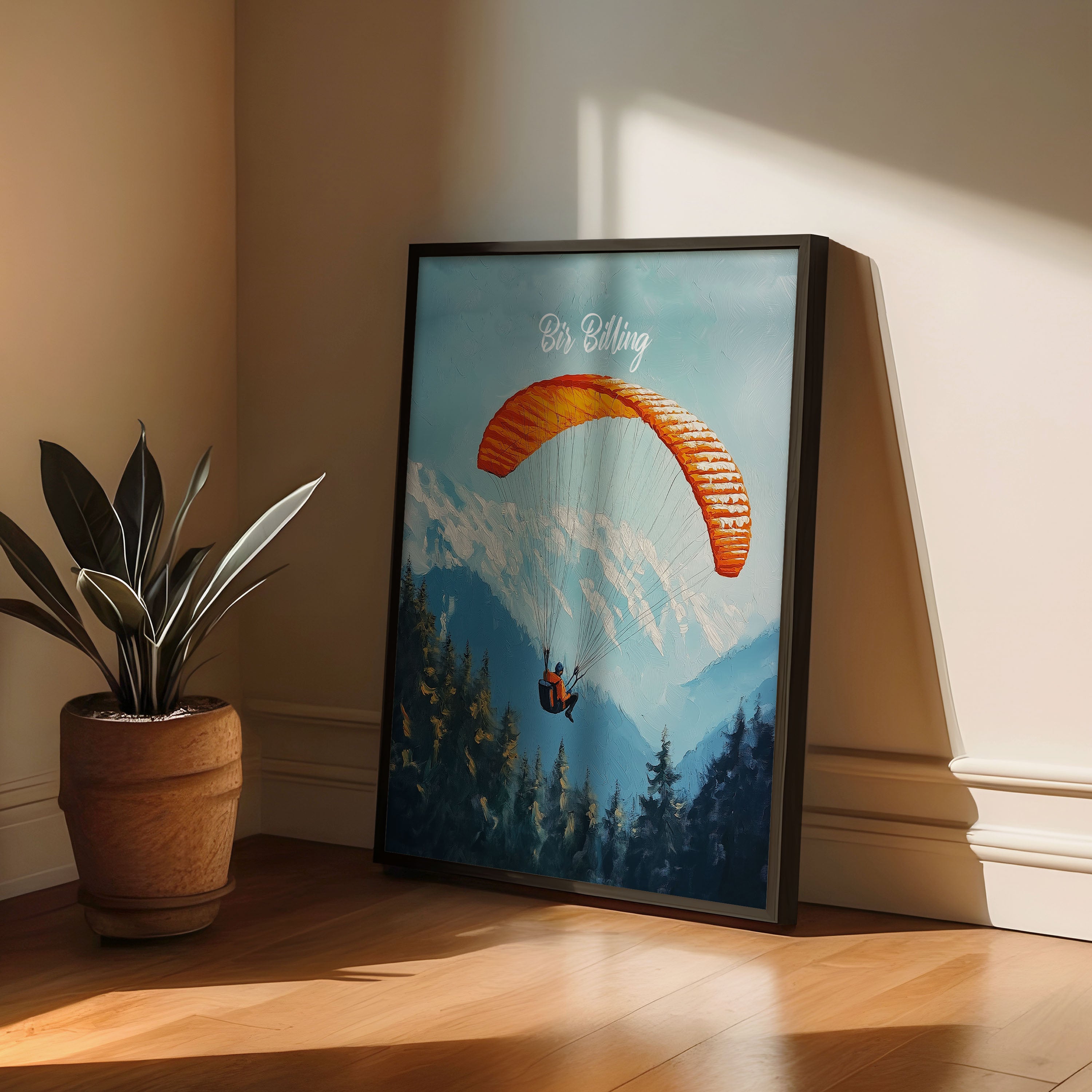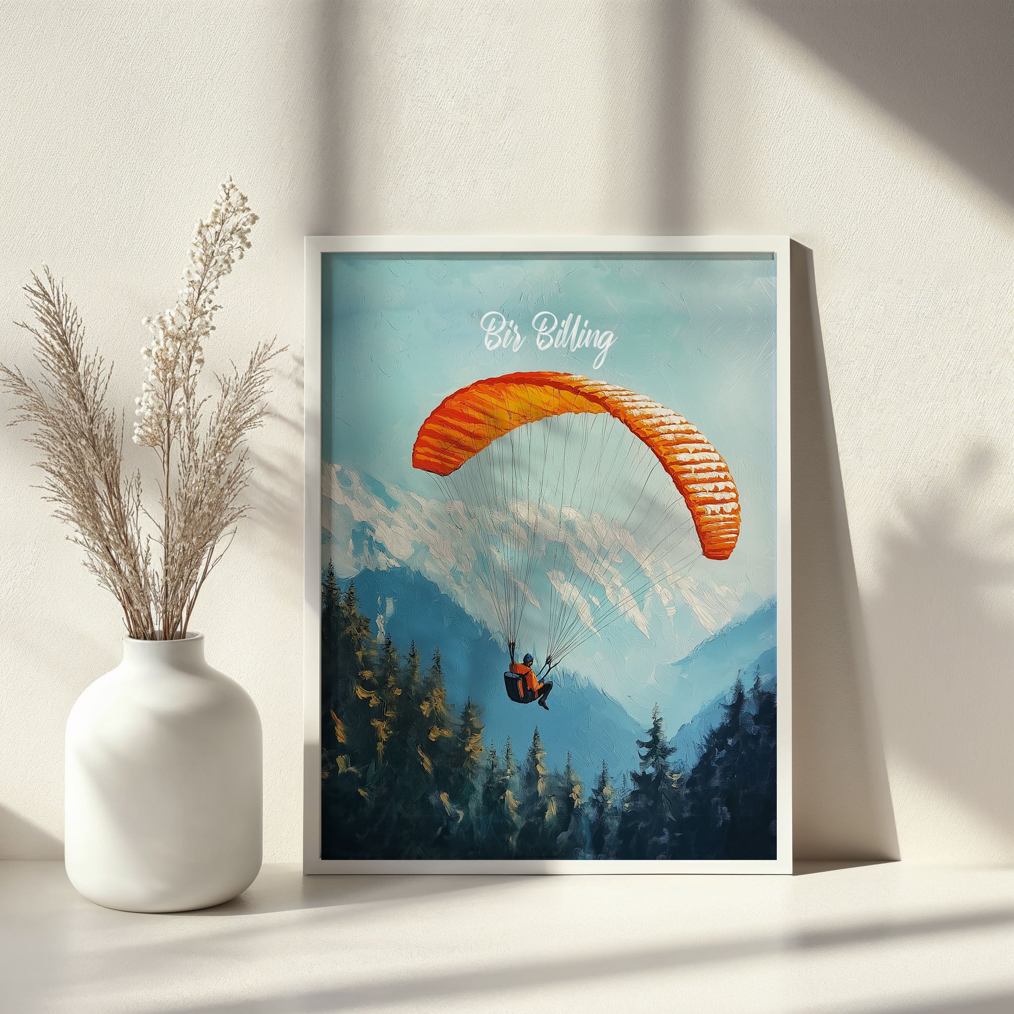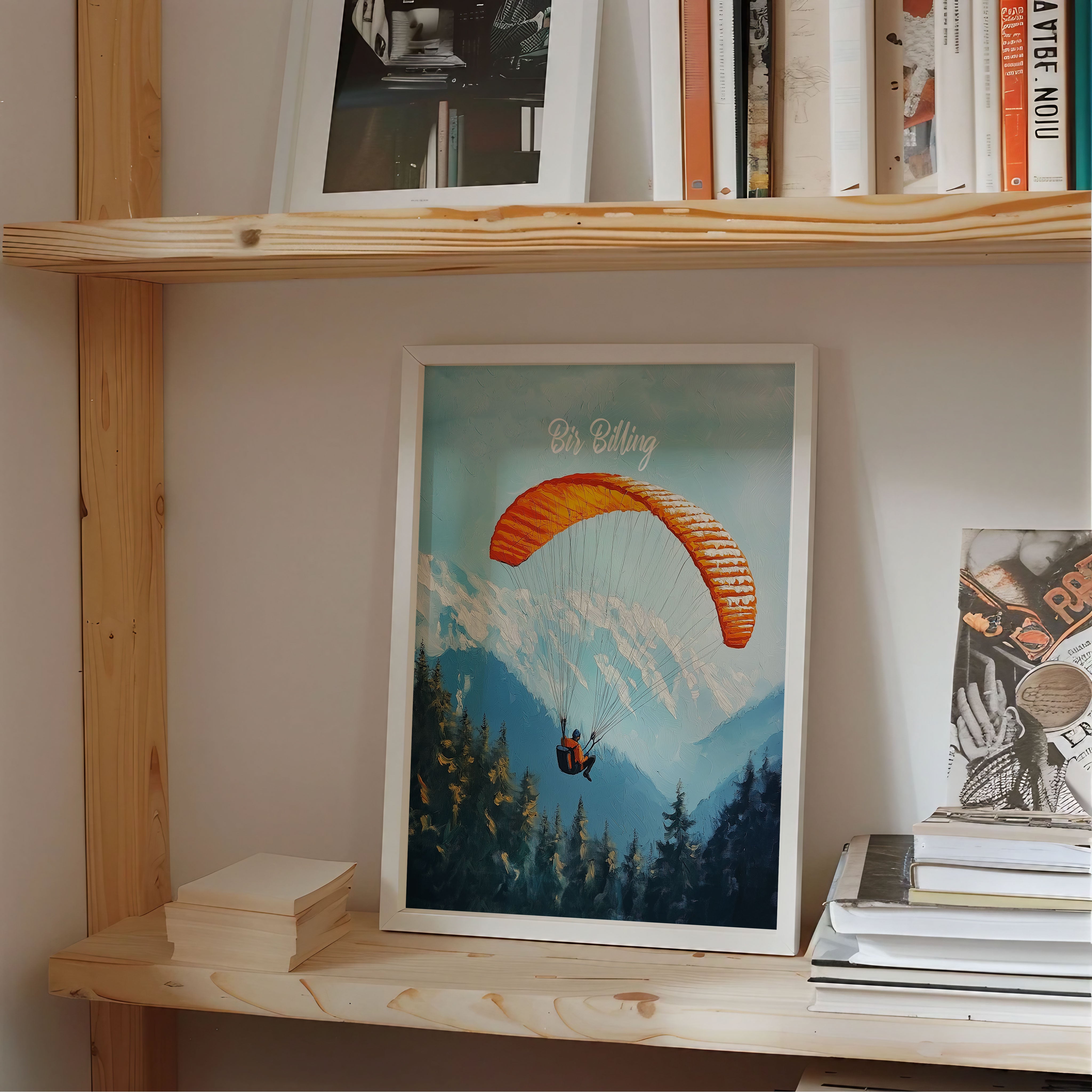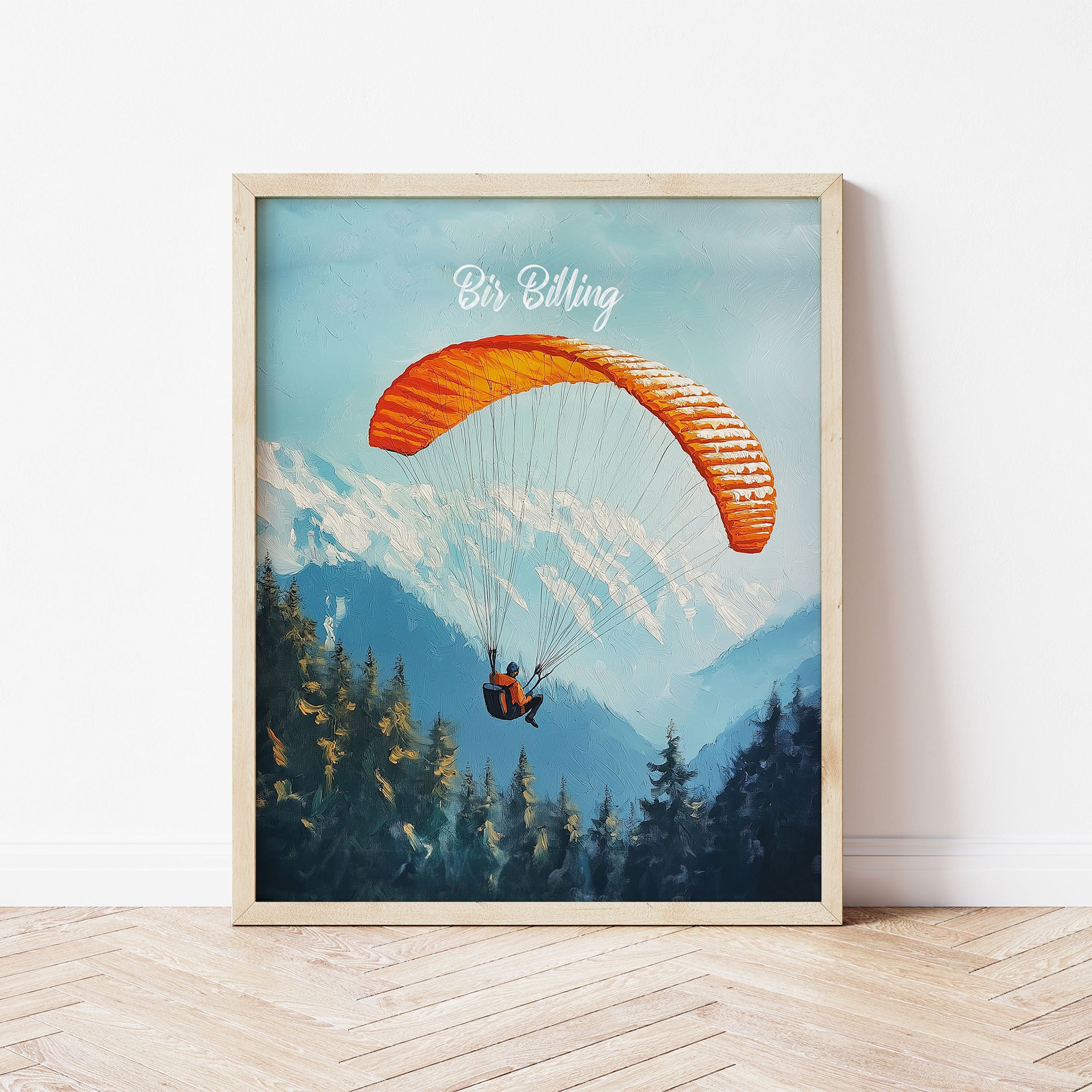 This captivating illustration titled "Bir Billing" captures the thrill of paragliding over the scenic Himalayan ranges. The vibrant orange parachute against the backdrop of snow-capped mountains and dense pine forests creates a sense of adventure and freedom. Perfect for travel lovers and adventure seekers, this artwork brings the essence of India's paragliding capital to life.