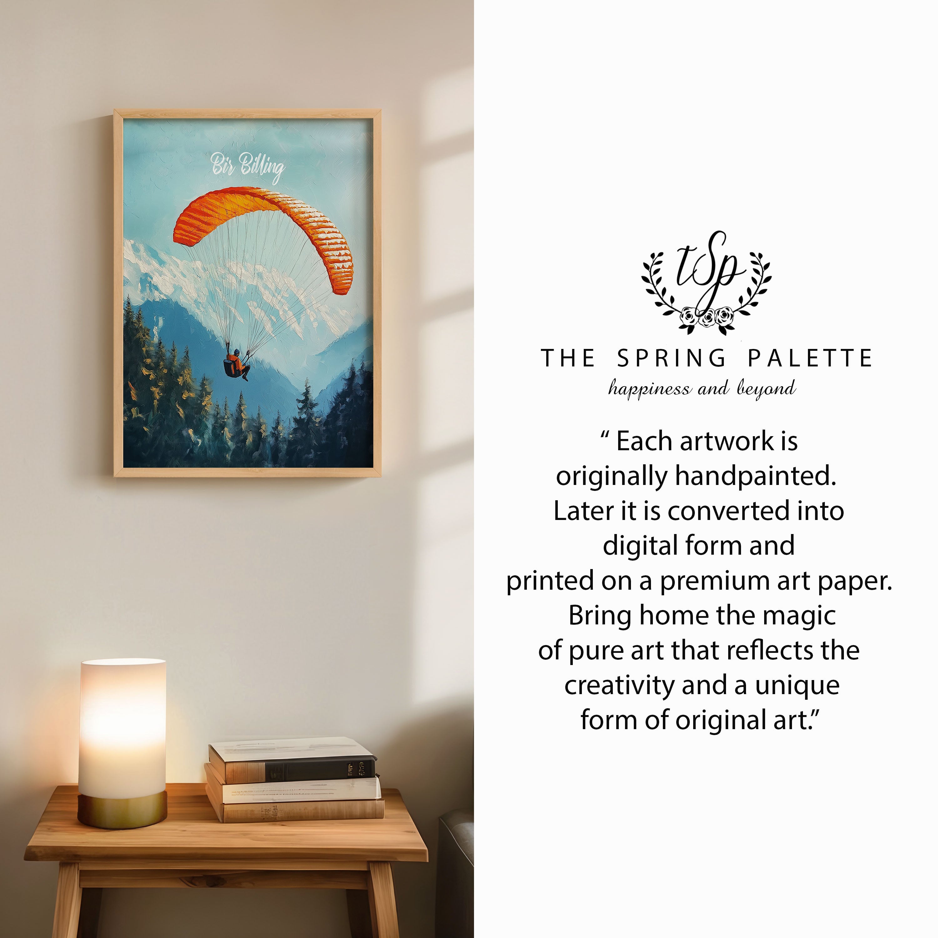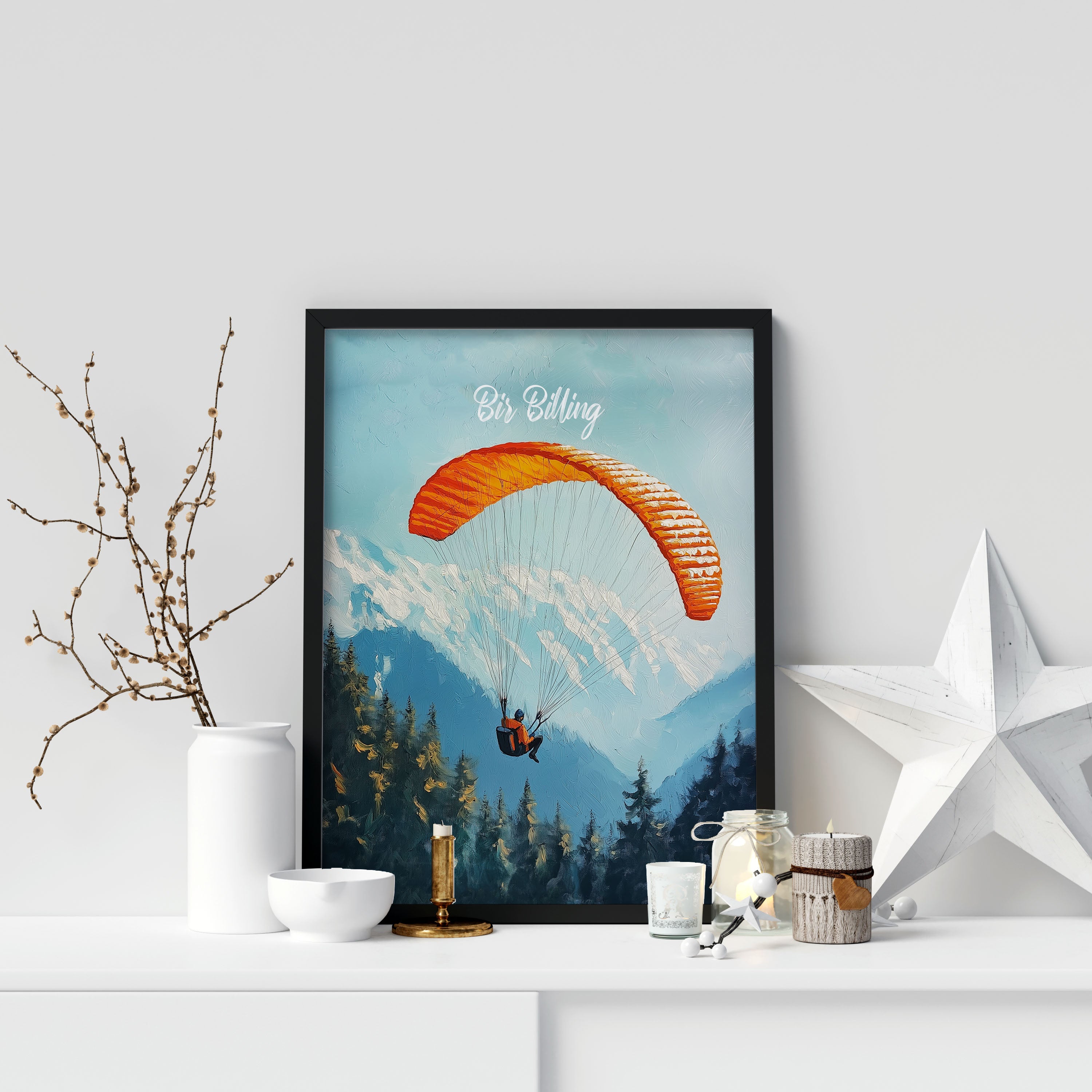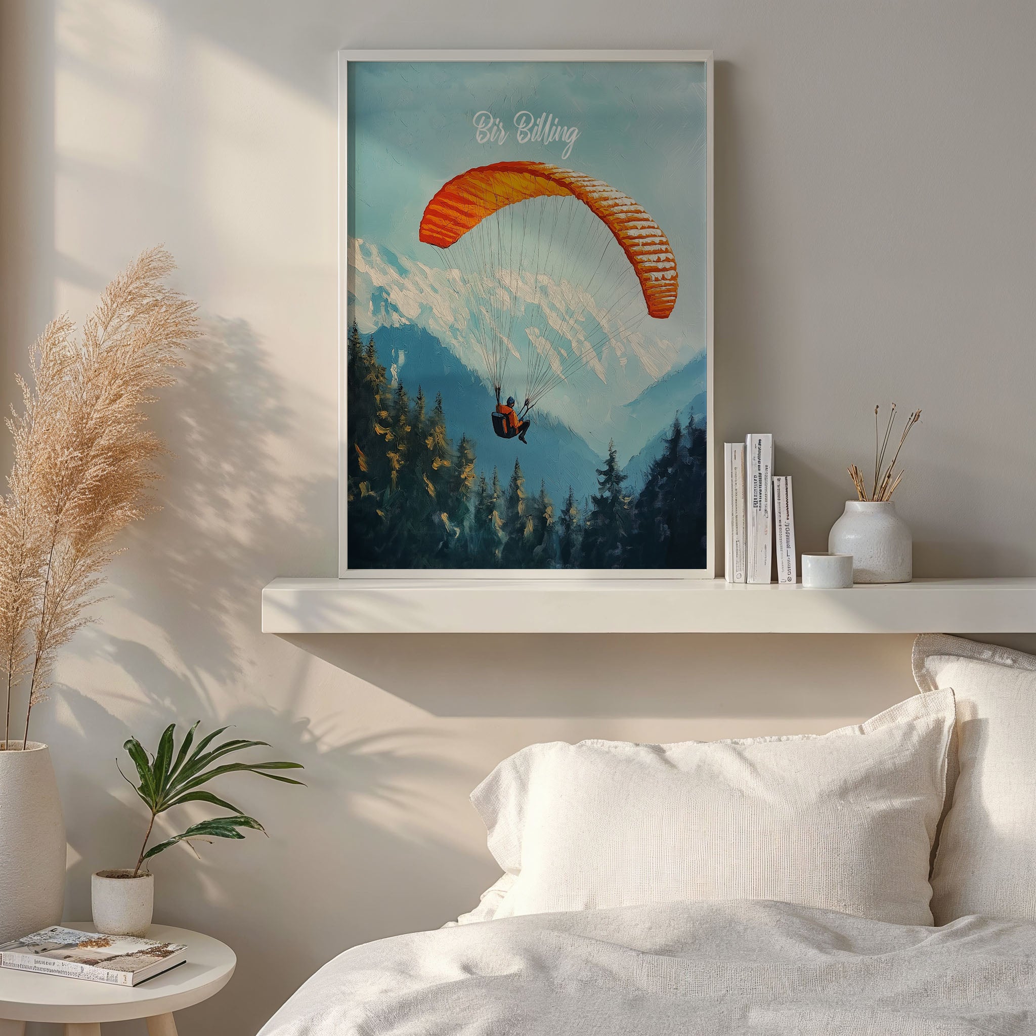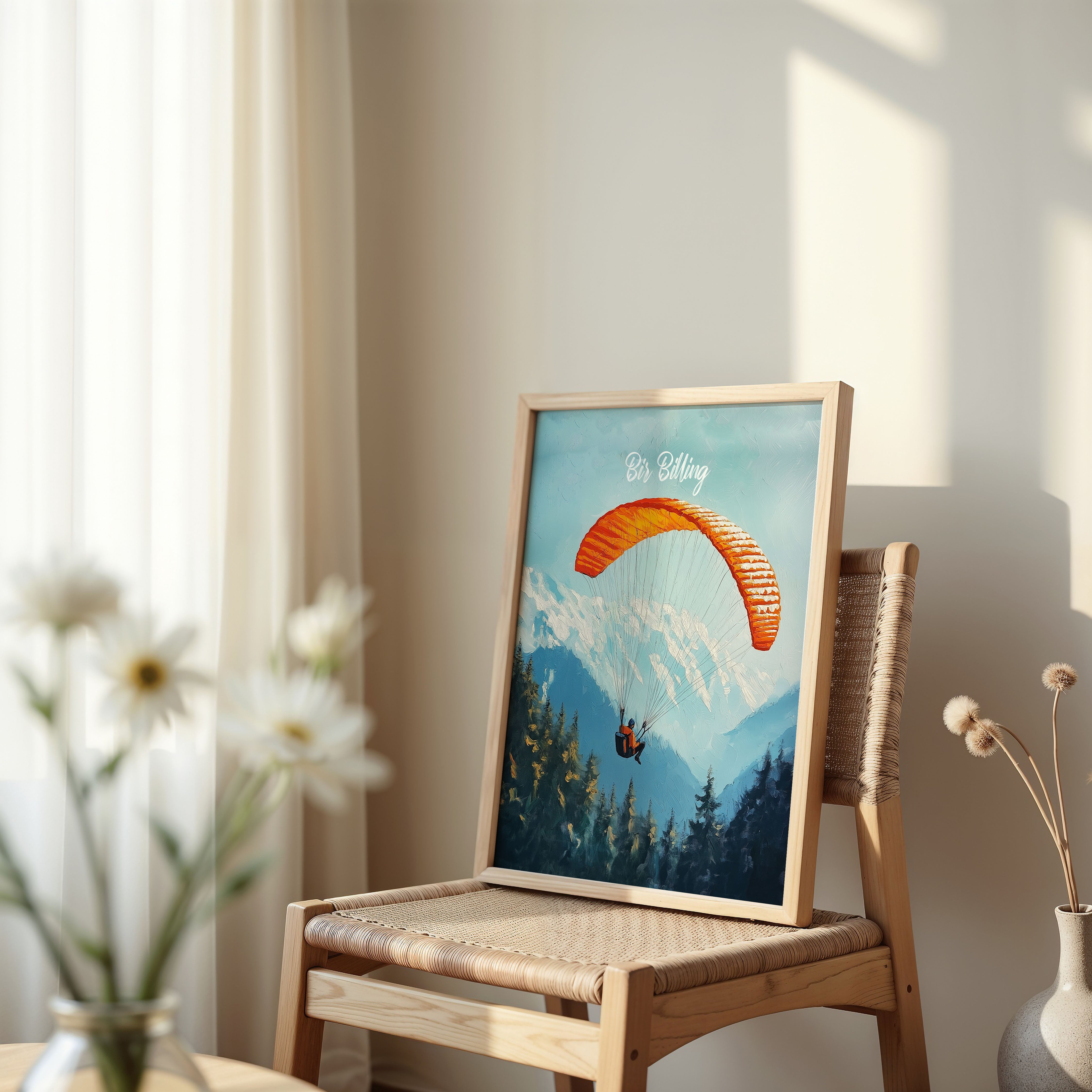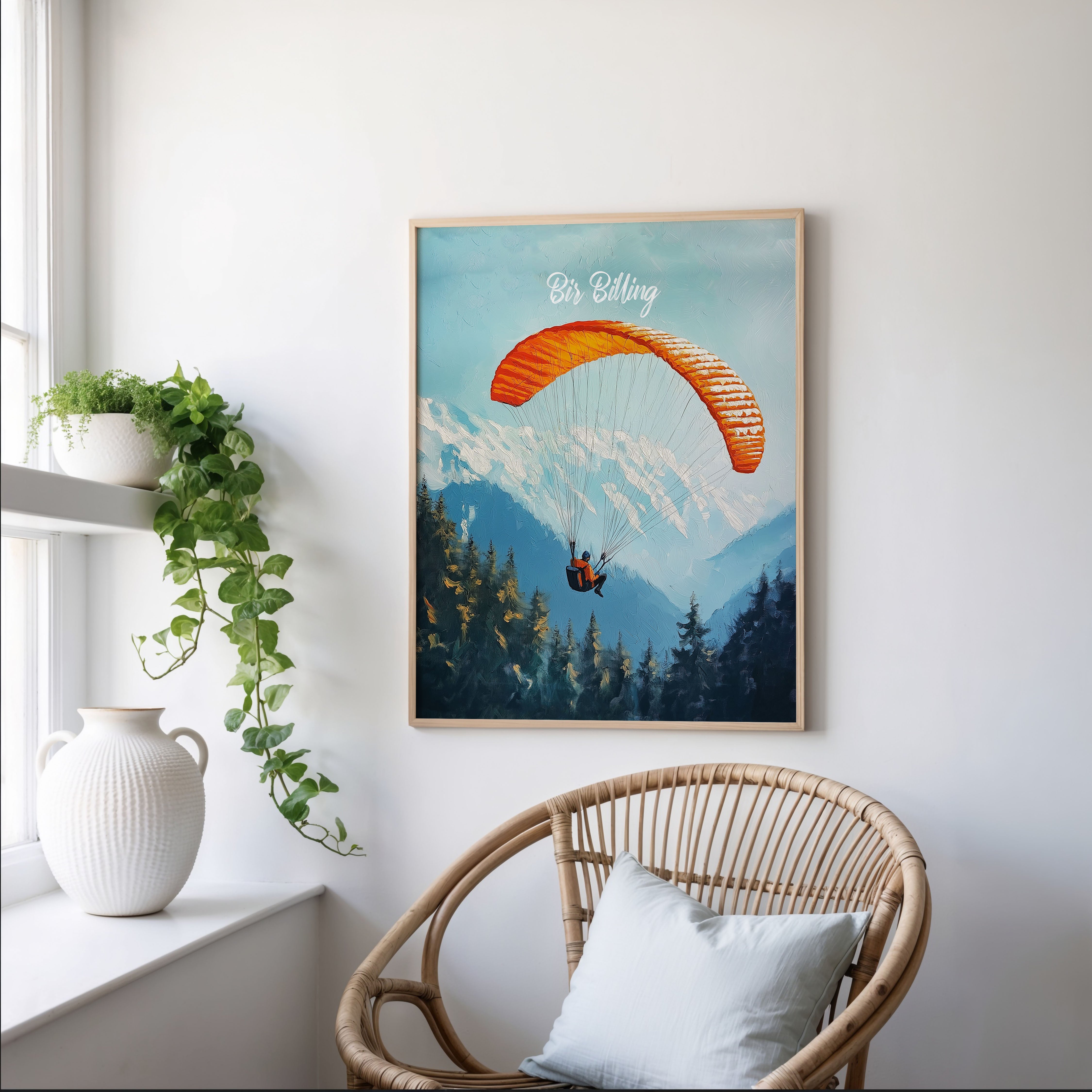 This captivating illustration titled "Bir Billing" captures the thrill of paragliding over the scenic Himalayan ranges. The vibrant orange parachute against the backdrop of snow-capped mountains and dense pine forests creates a sense of adventure and freedom. Perfect for travel lovers and adventure seekers, this artwork brings the essence of India's paragliding capital to life.
