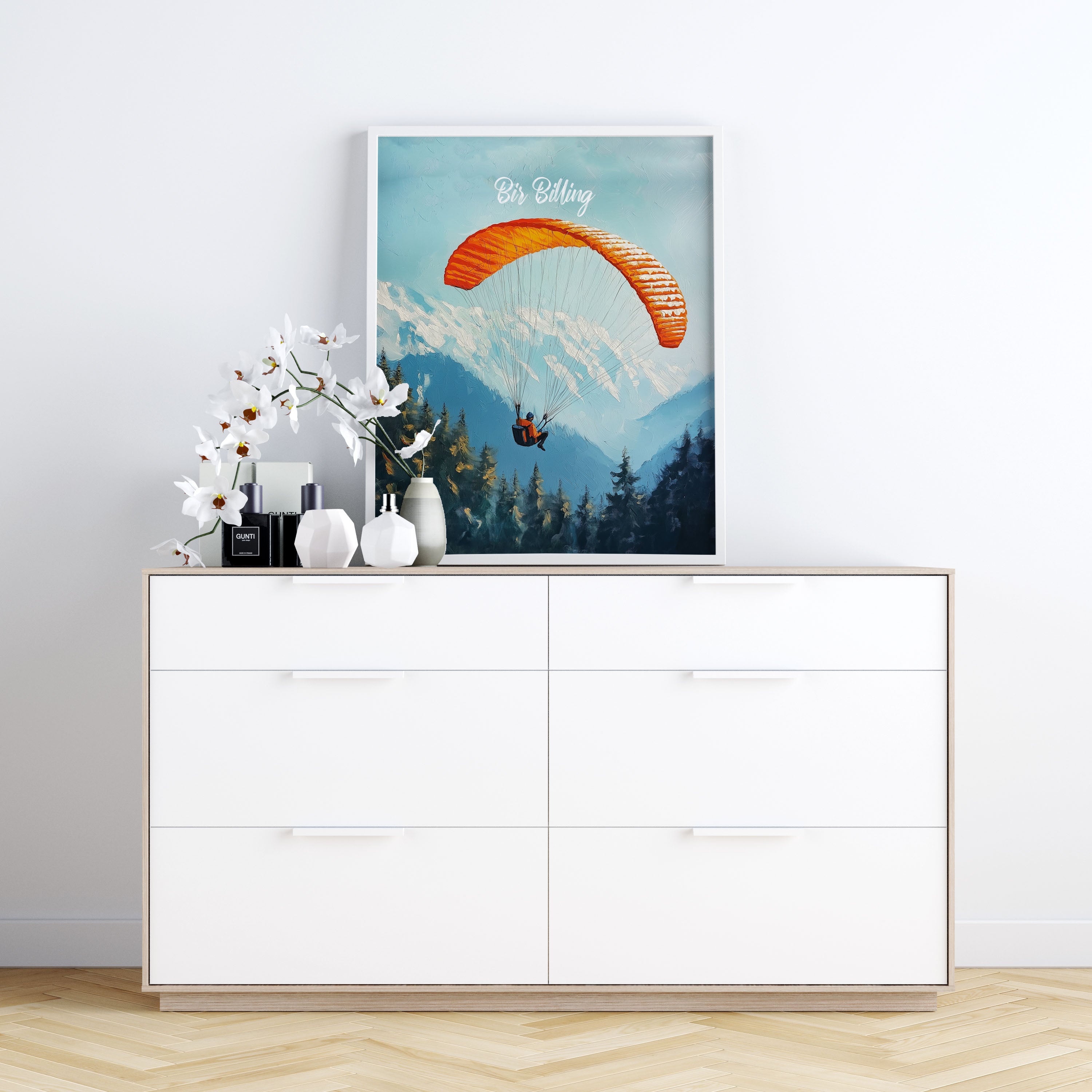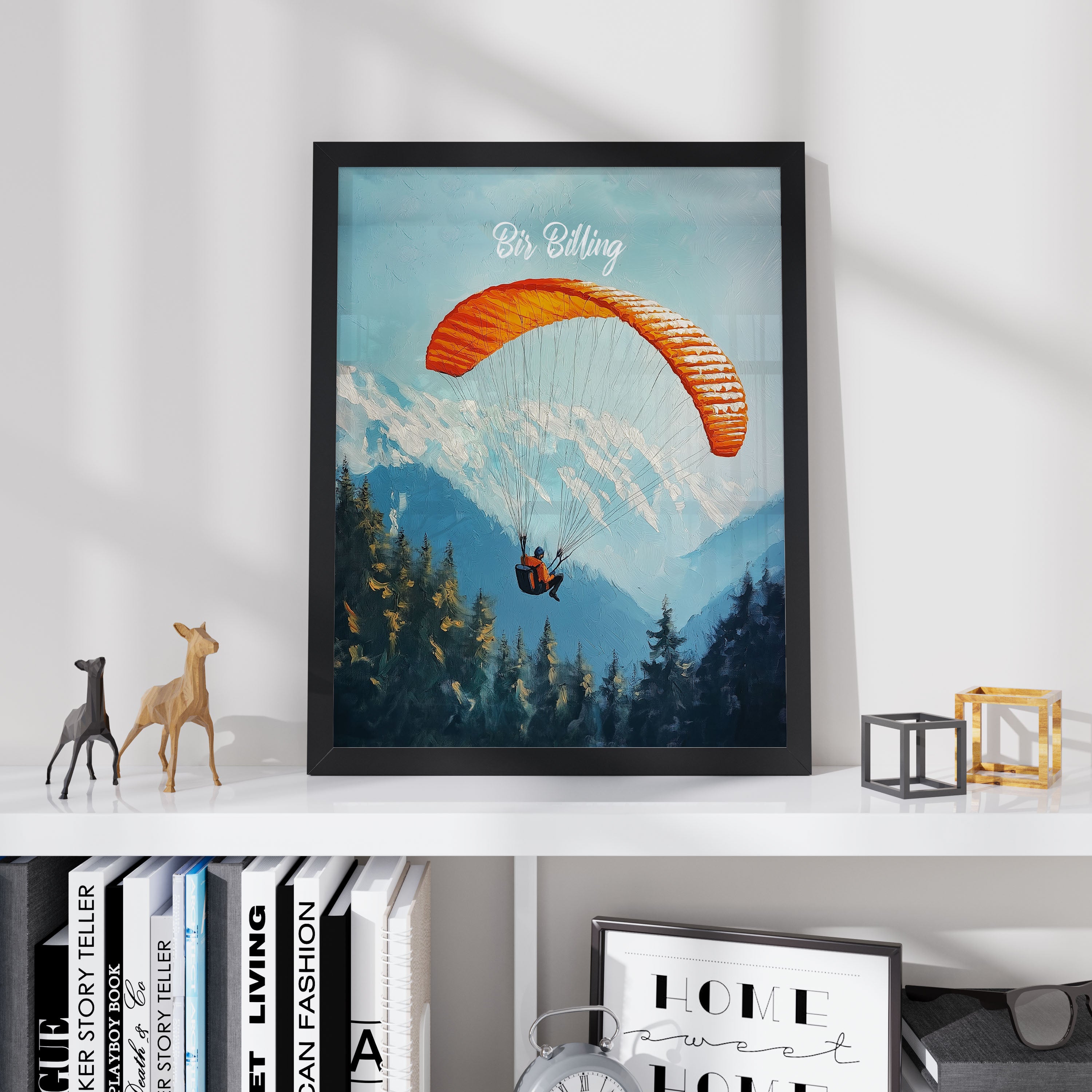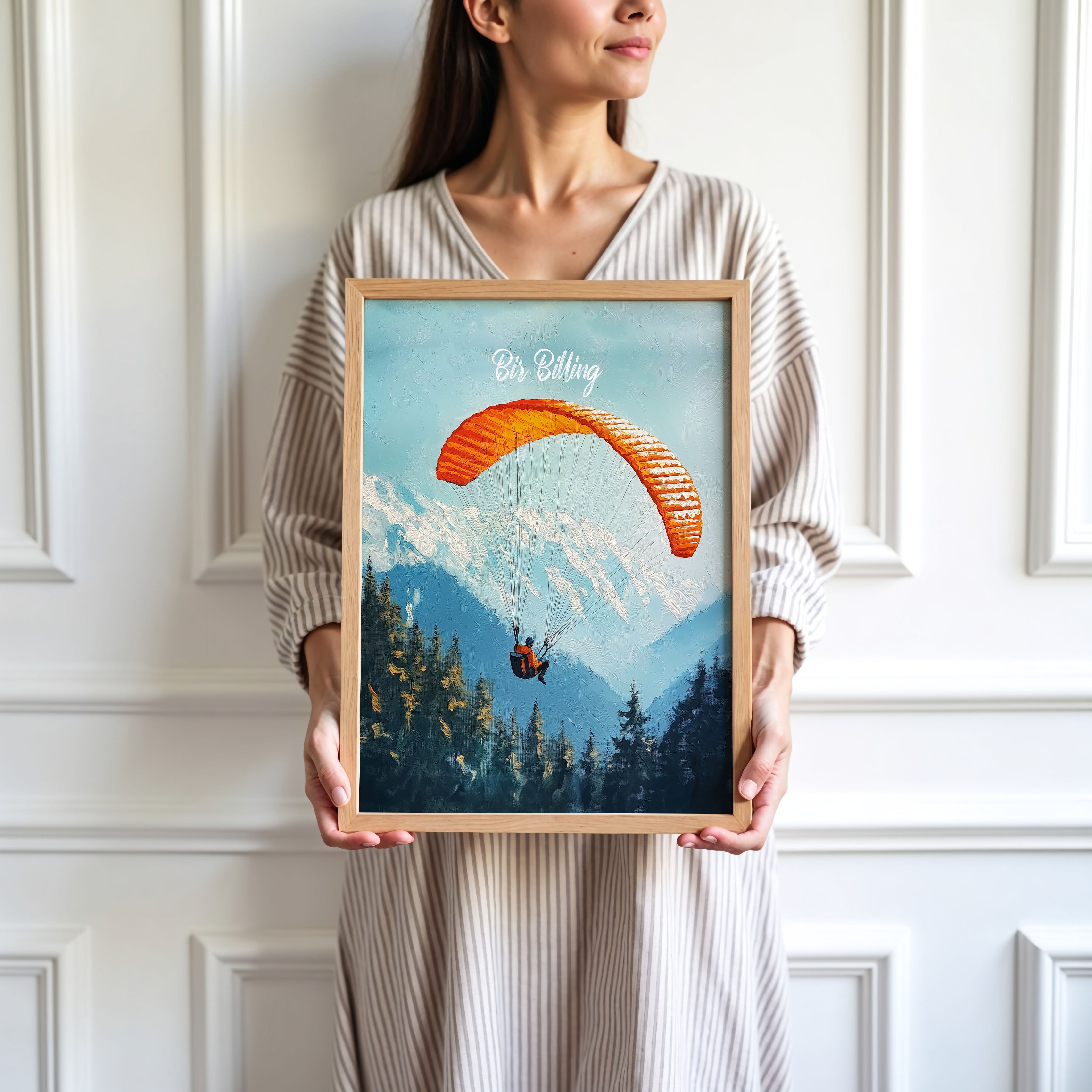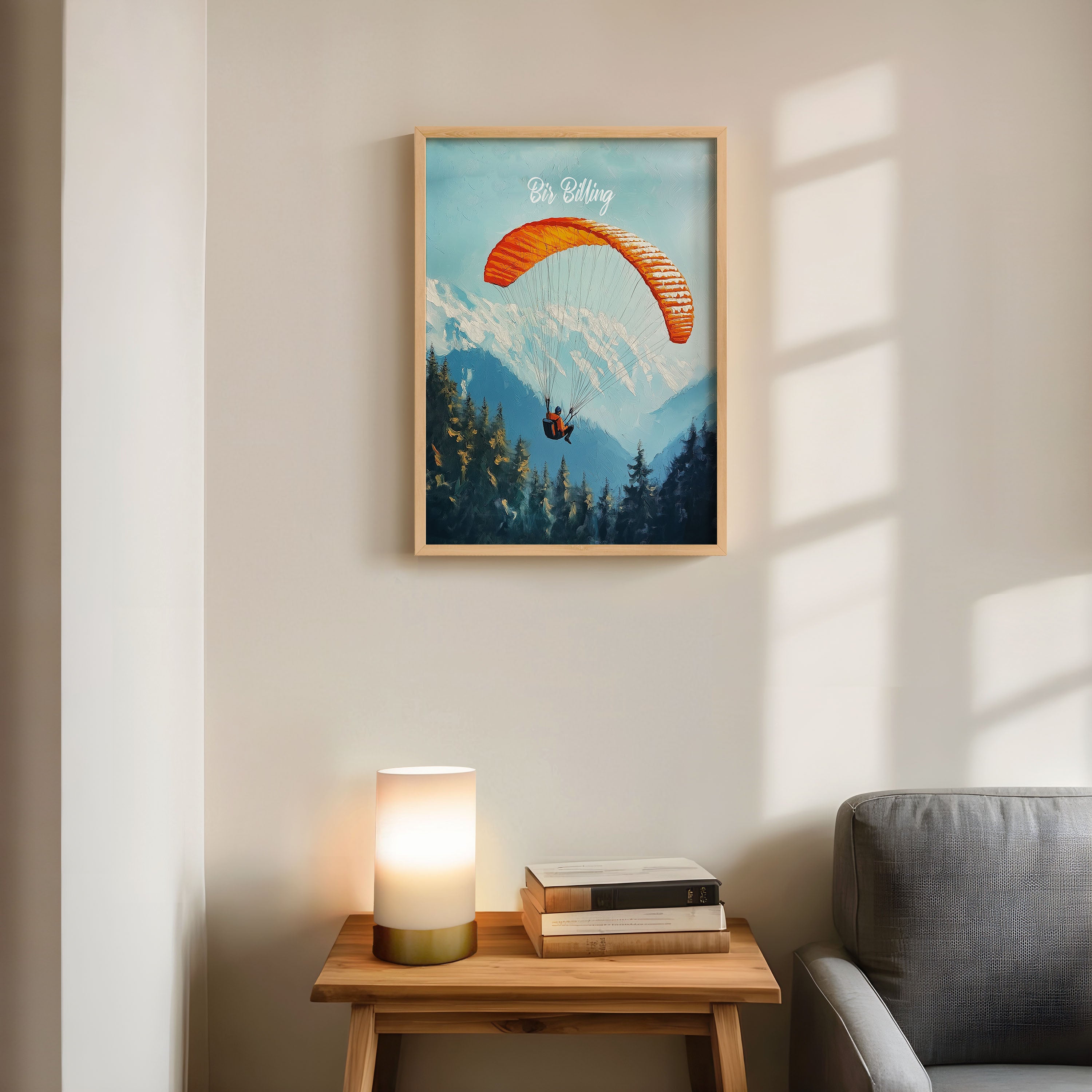 This captivating illustration titled "Bir Billing" captures the thrill of paragliding over the scenic Himalayan ranges. The vibrant orange parachute against the backdrop of snow-capped mountains and dense pine forests creates a sense of adventure and freedom. Perfect for travel lovers and adventure seekers, this artwork brings the essence of India's paragliding capital to life.