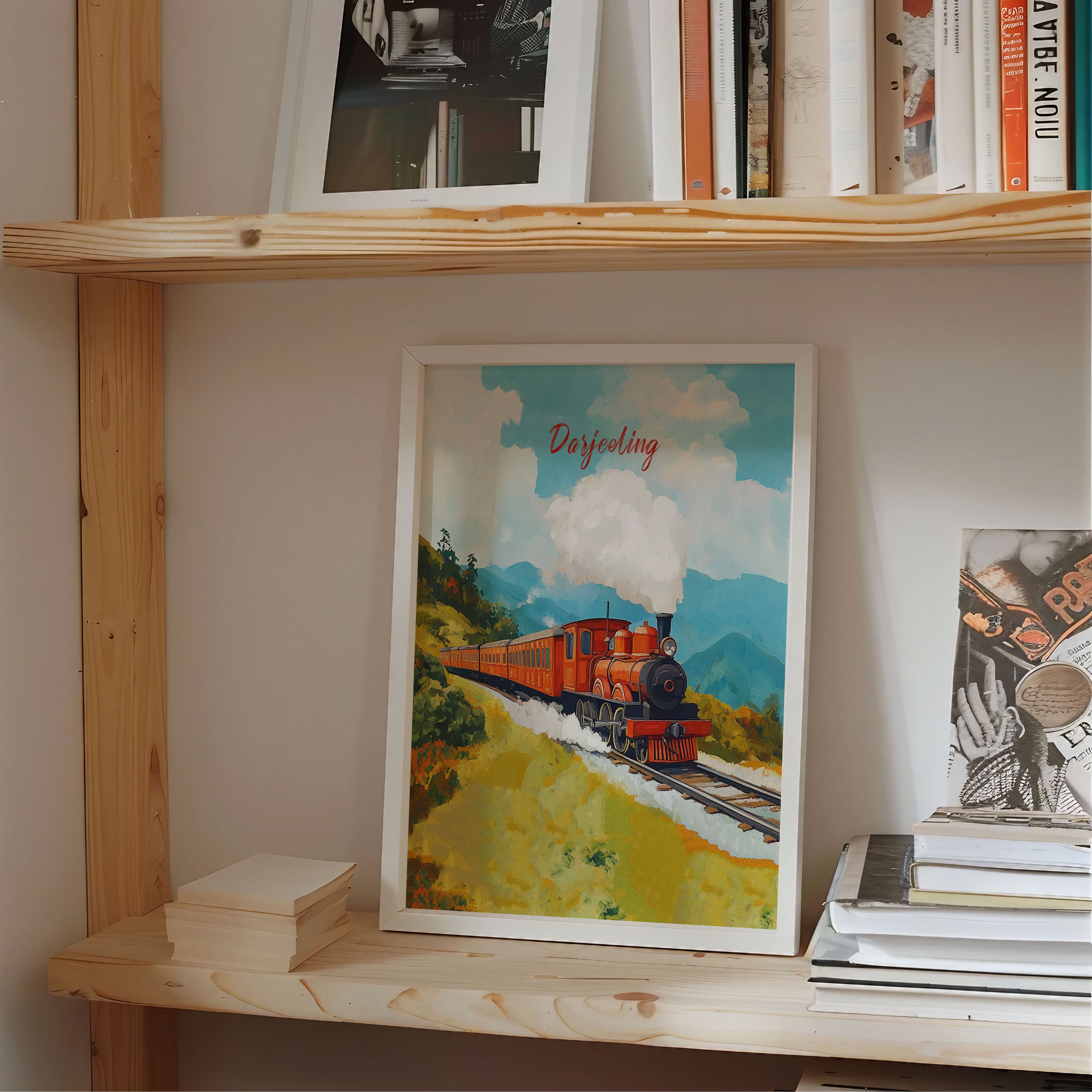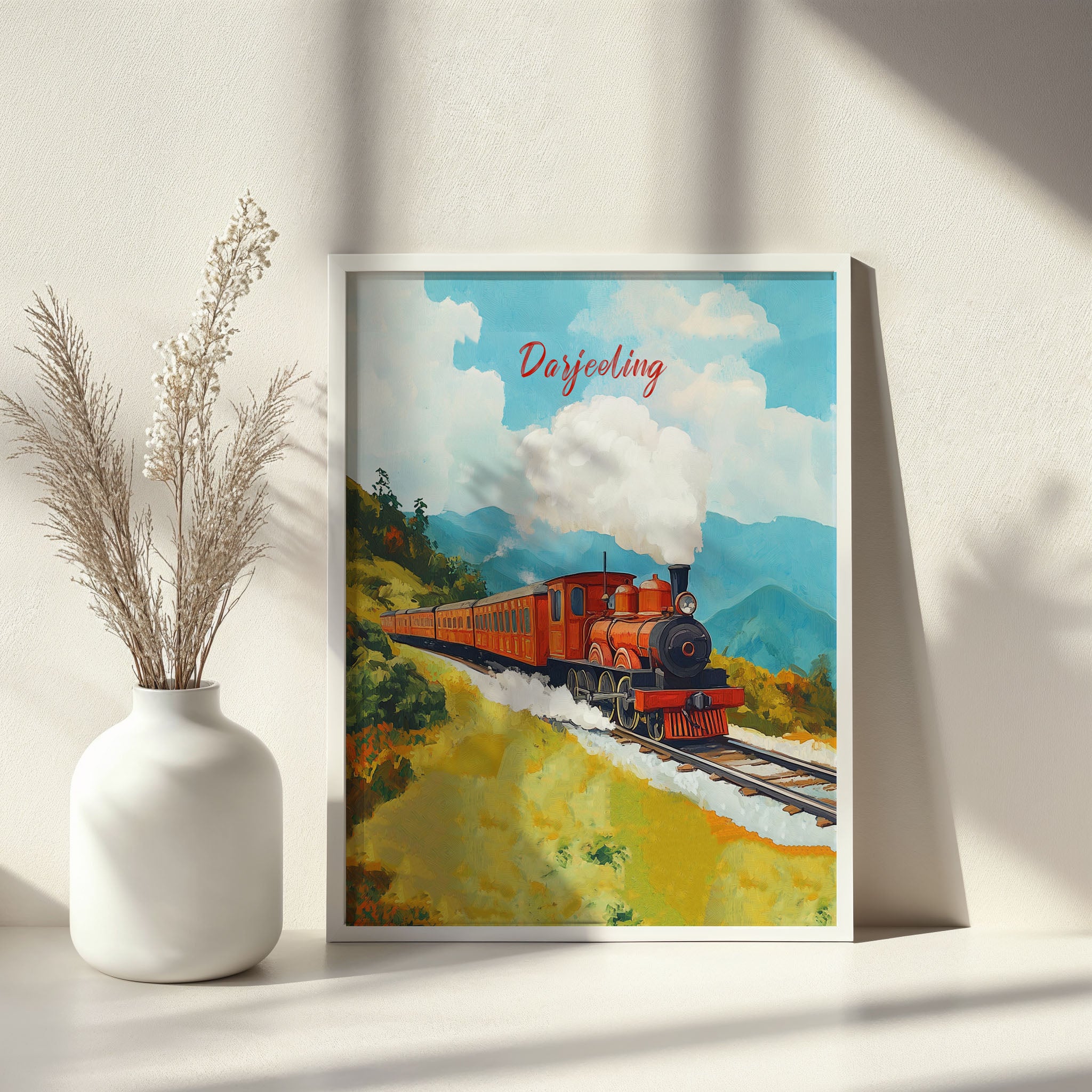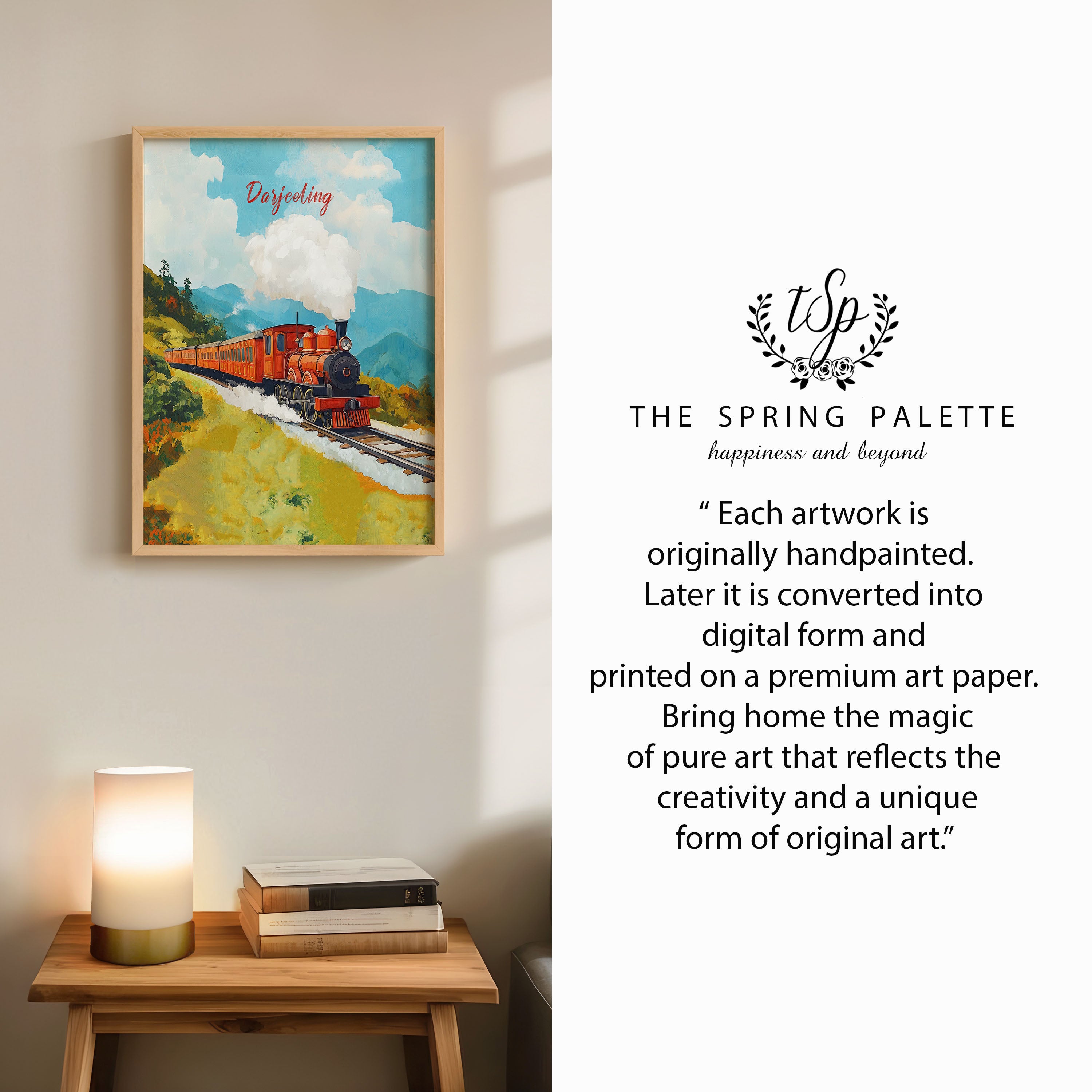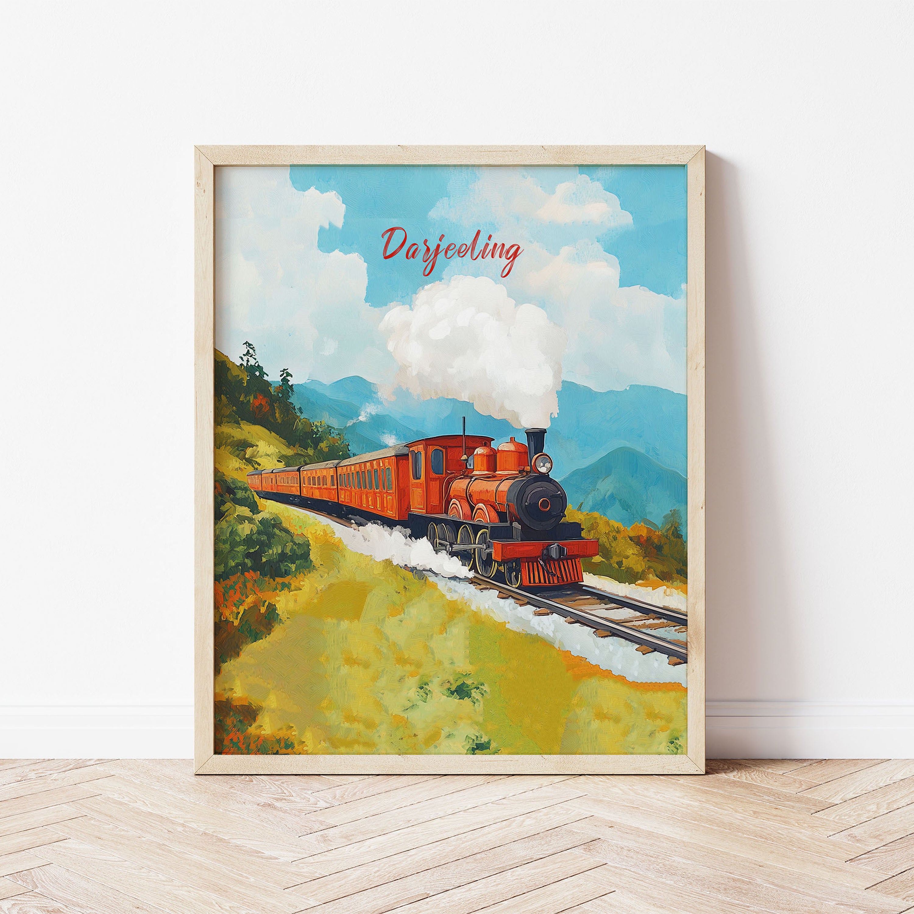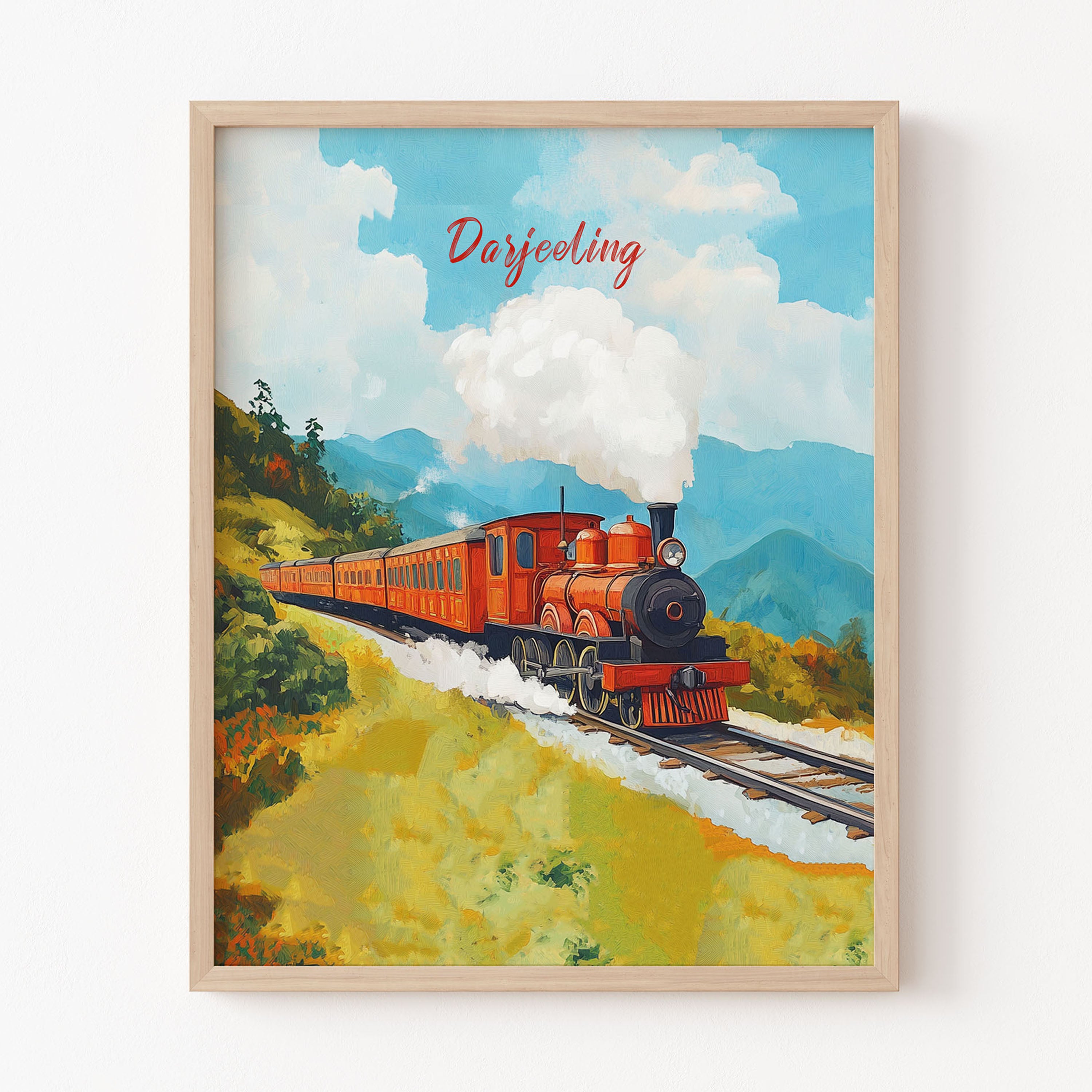 This illustration beautifully captures the essence of the iconic Darjeeling Himalayan Railway, also known as the "Toy Train." The artwork showcases a vibrant vintage steam locomotive chugging through lush green hills, with puffs of white smoke blending into the clear blue sky. The painting exudes a nostalgic charm, reflecting the rich heritage and scenic beauty of the Darjeeling region.