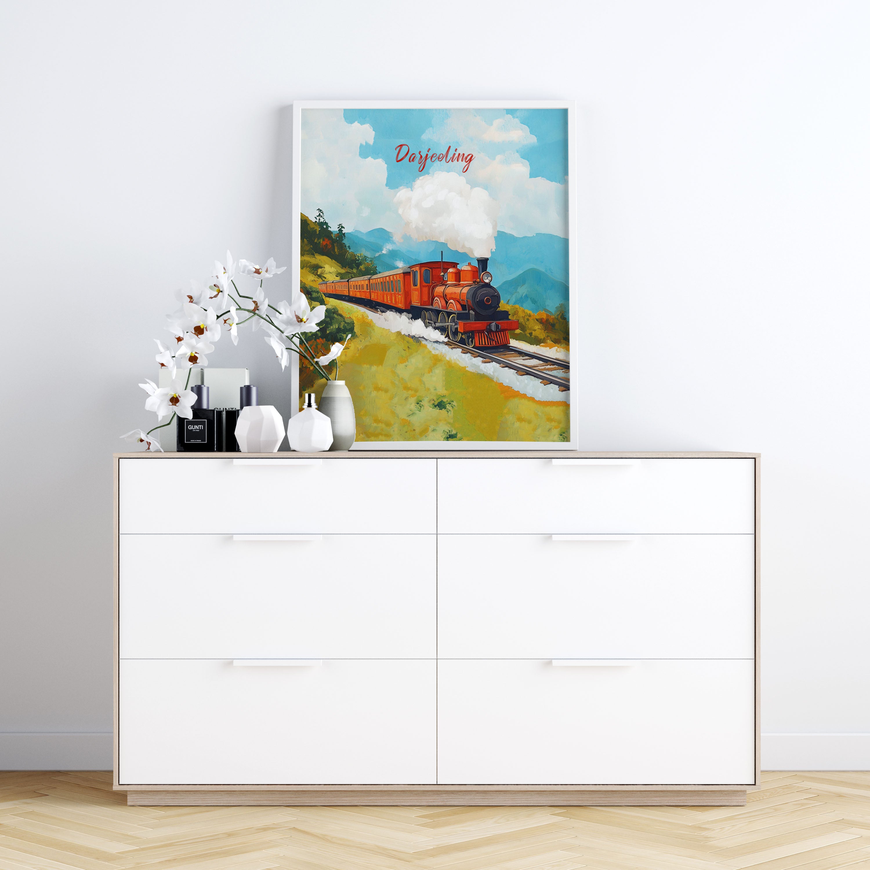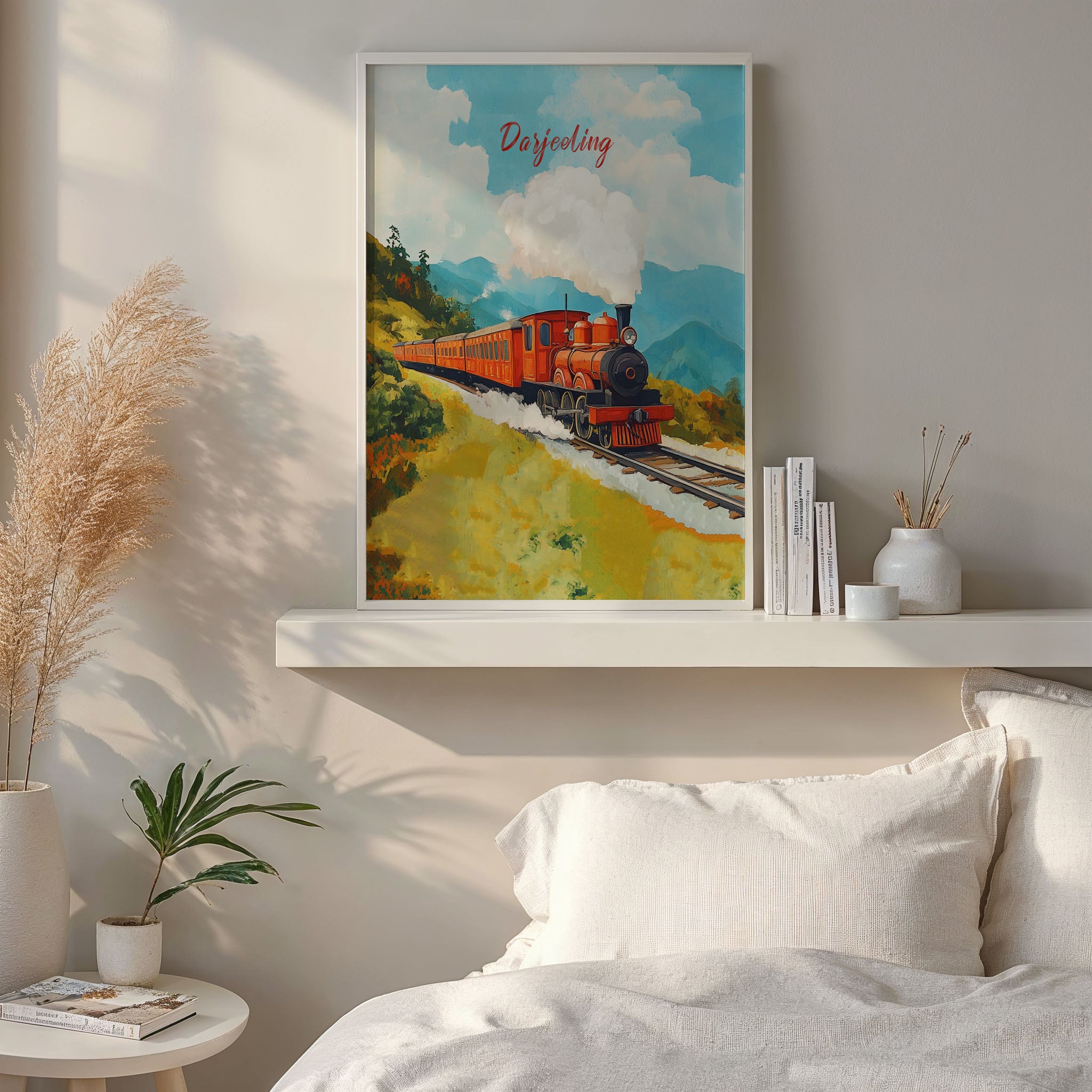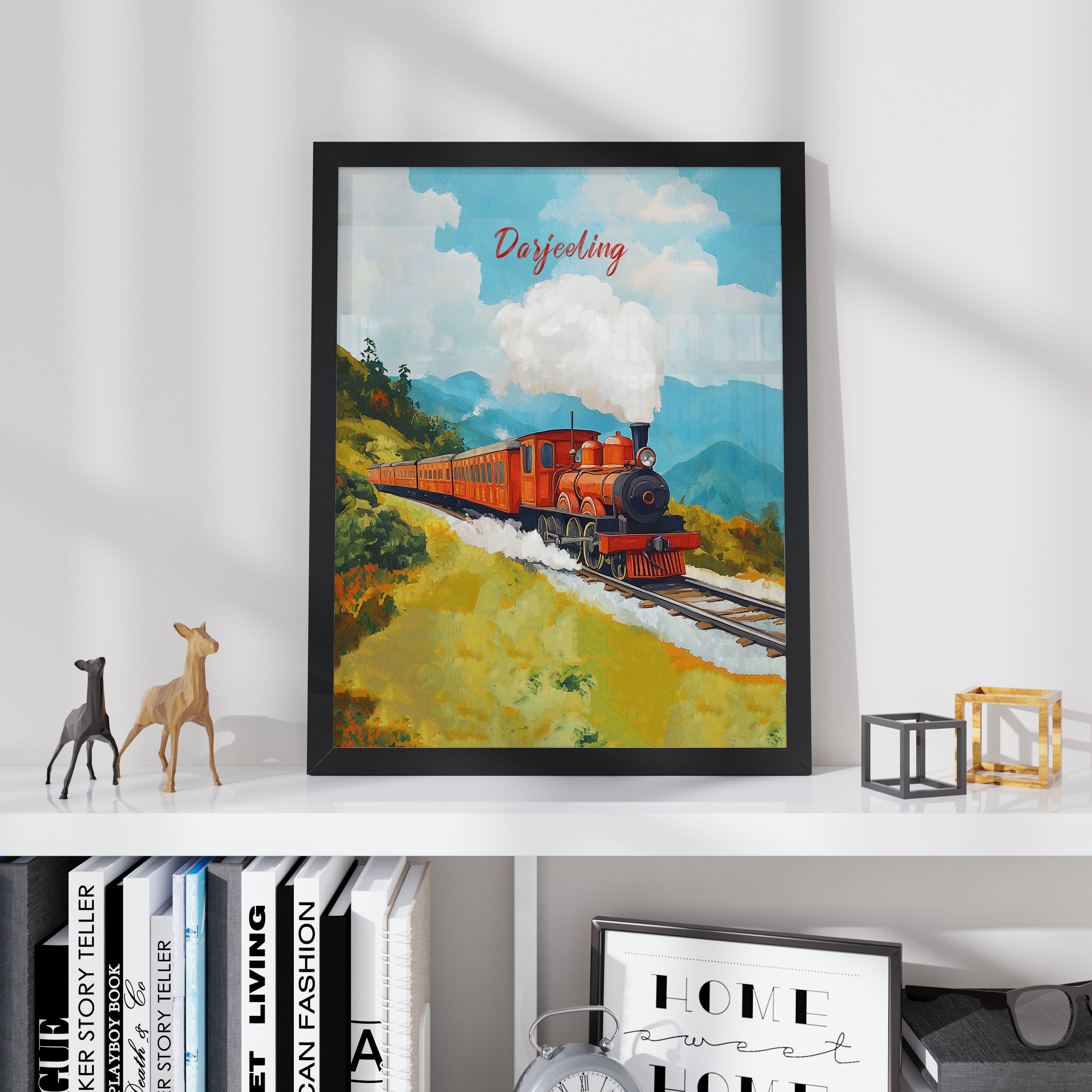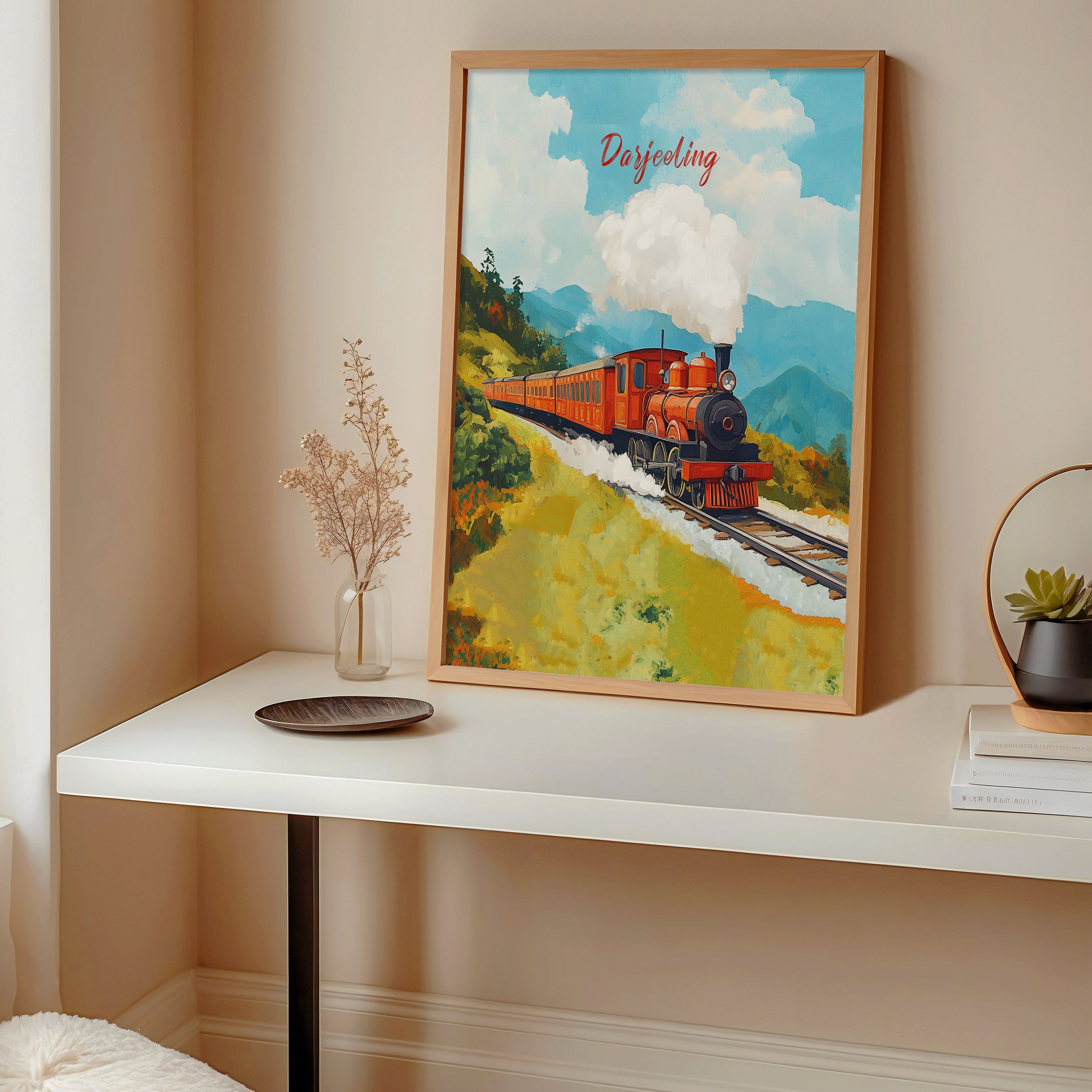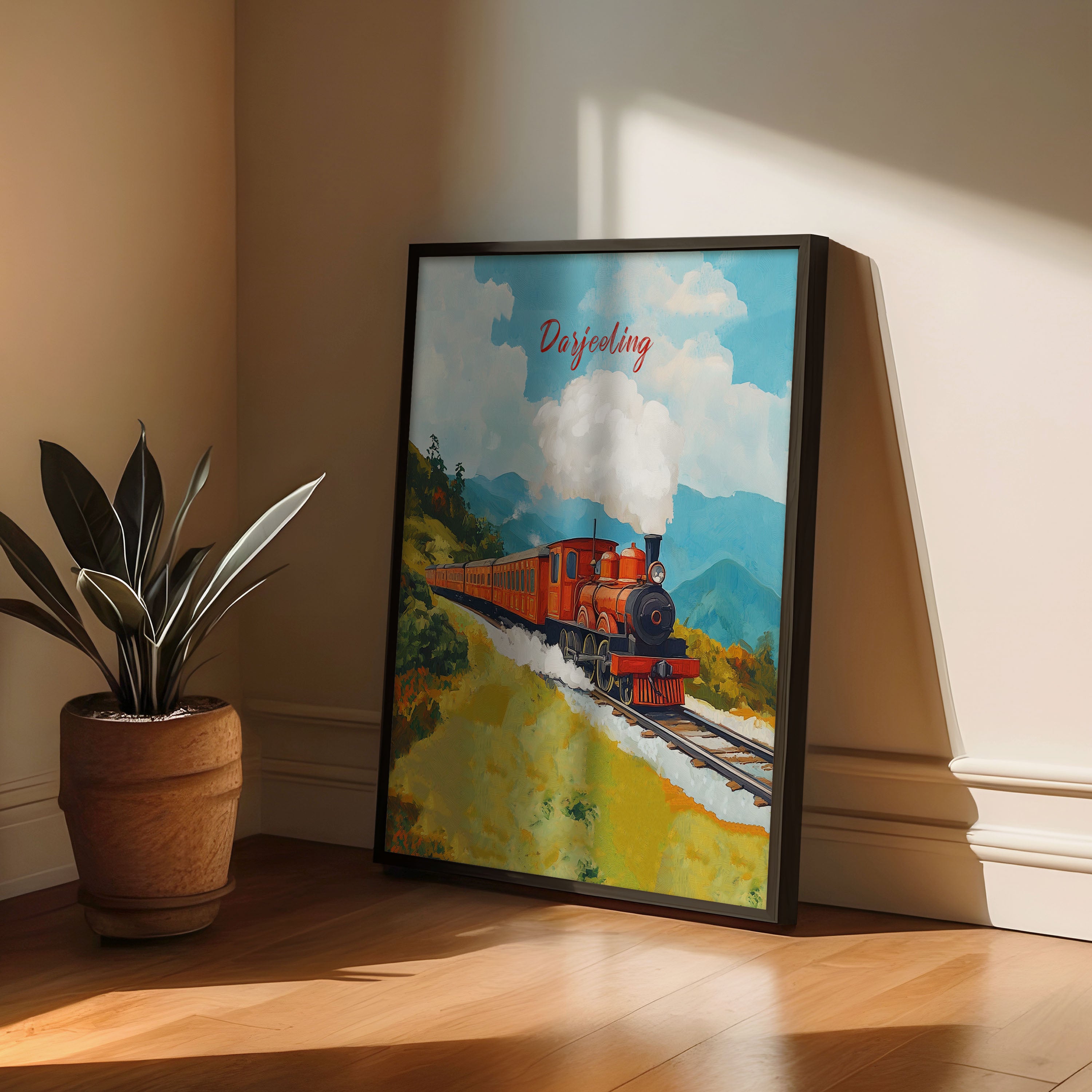 This illustration beautifully captures the essence of the iconic Darjeeling Himalayan Railway, also known as the "Toy Train." The artwork showcases a vibrant vintage steam locomotive chugging through lush green hills, with puffs of white smoke blending into the clear blue sky. The painting exudes a nostalgic charm, reflecting the rich heritage and scenic beauty of the Darjeeling region.