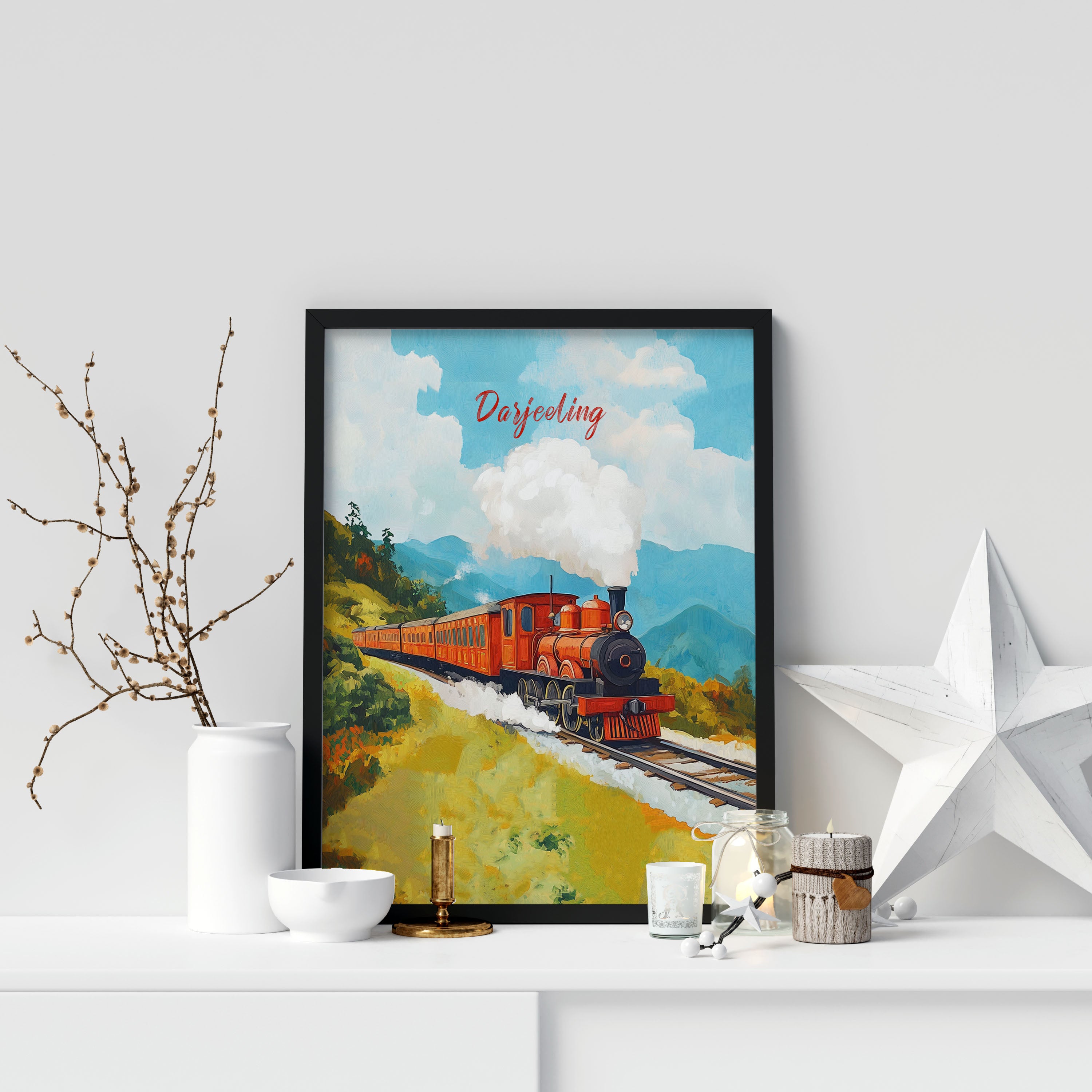 The vintage train, painted in warm hues of red and orange, creates a striking contrast against the cool tones of the sky and hills, making the piece both visually appealing and emotionally evocative. This illustration perfectly captures the magic of slow travel and the timeless allure of the Indian hill stations.