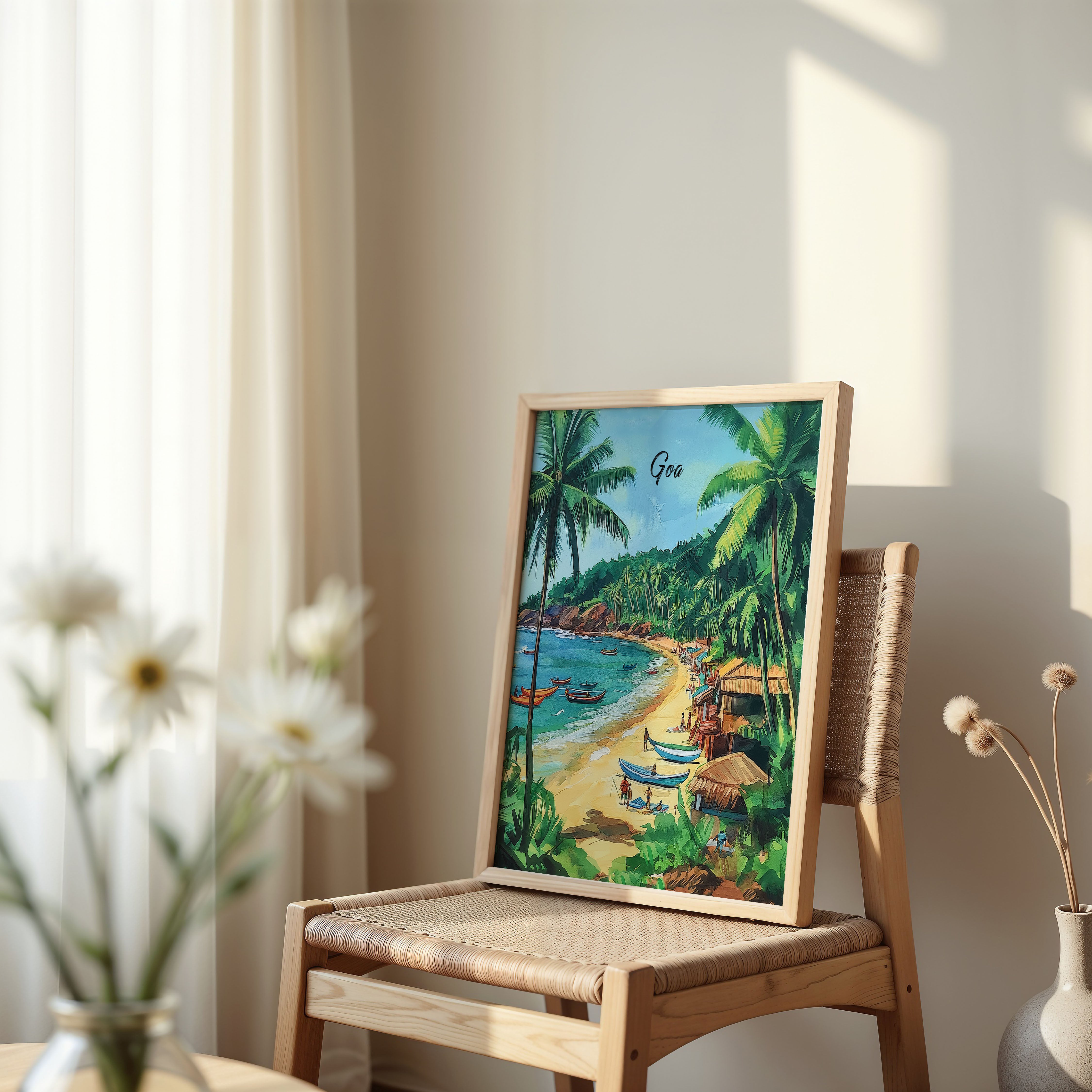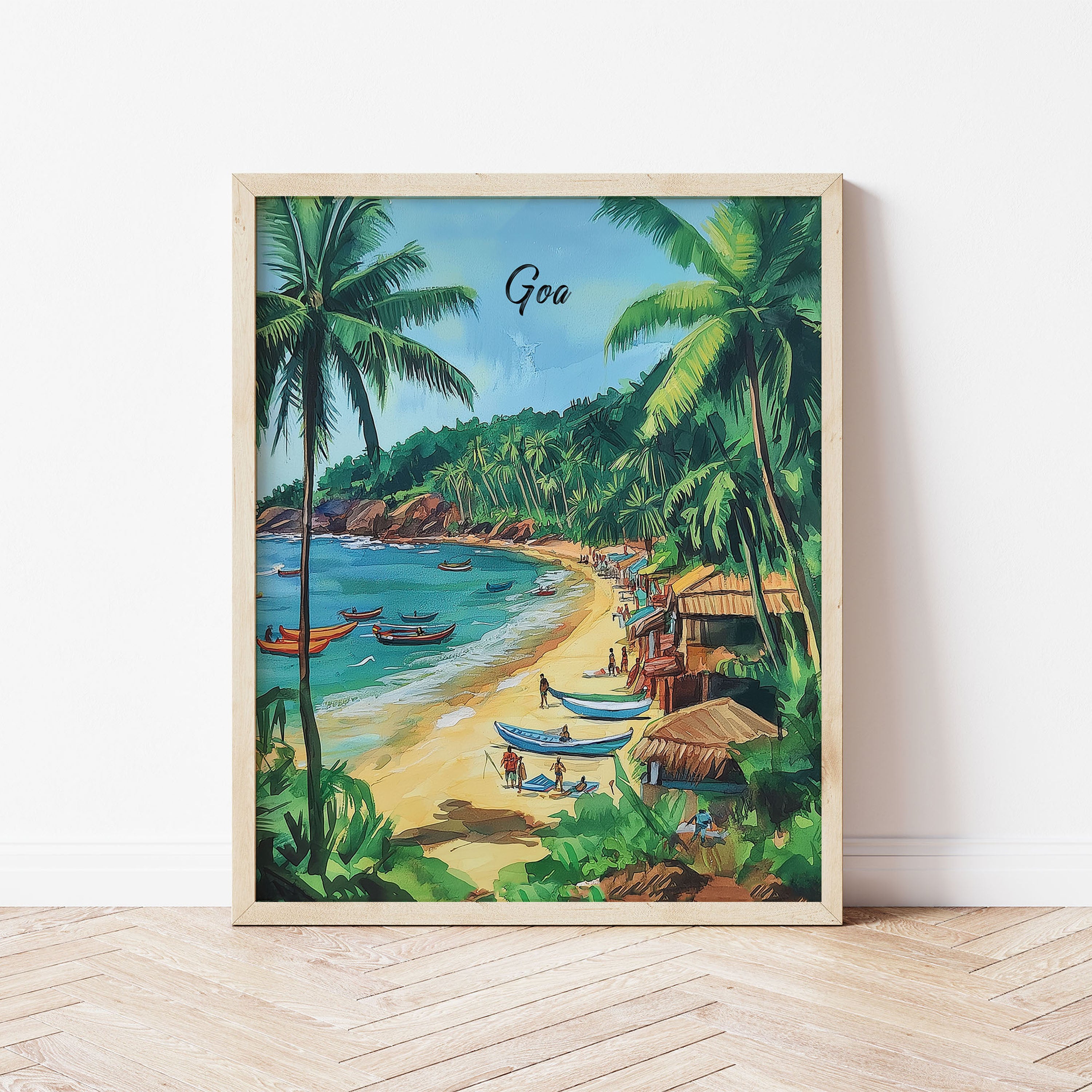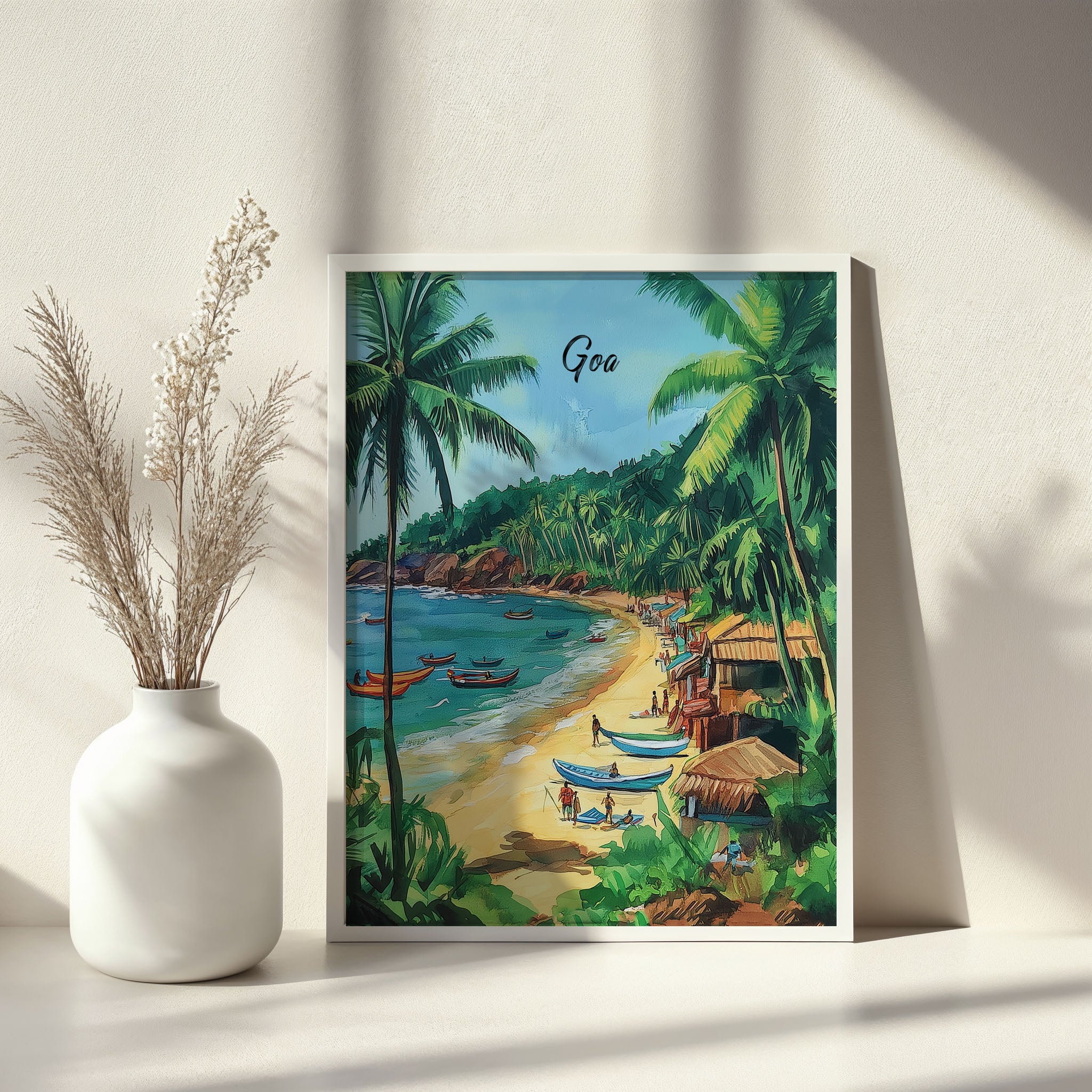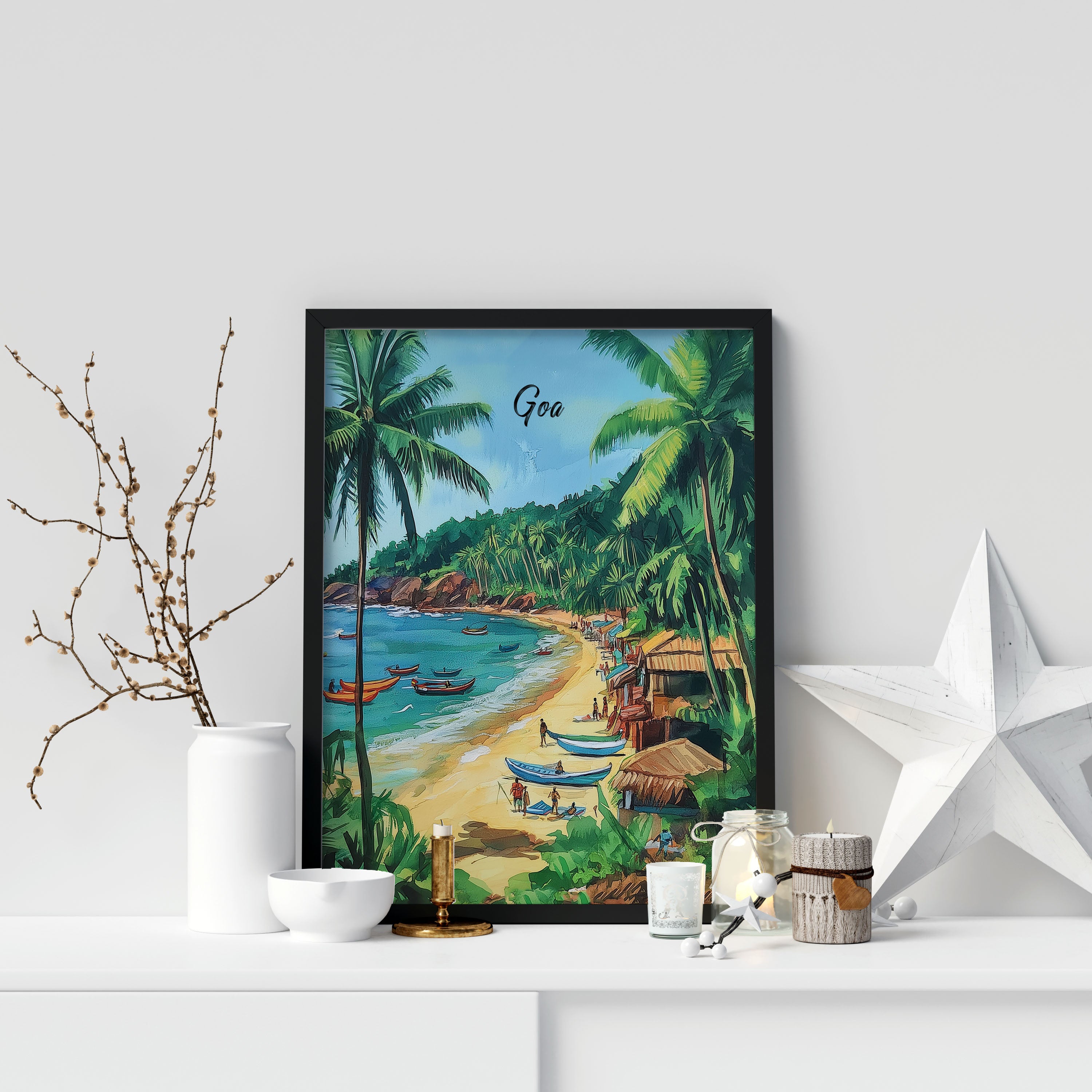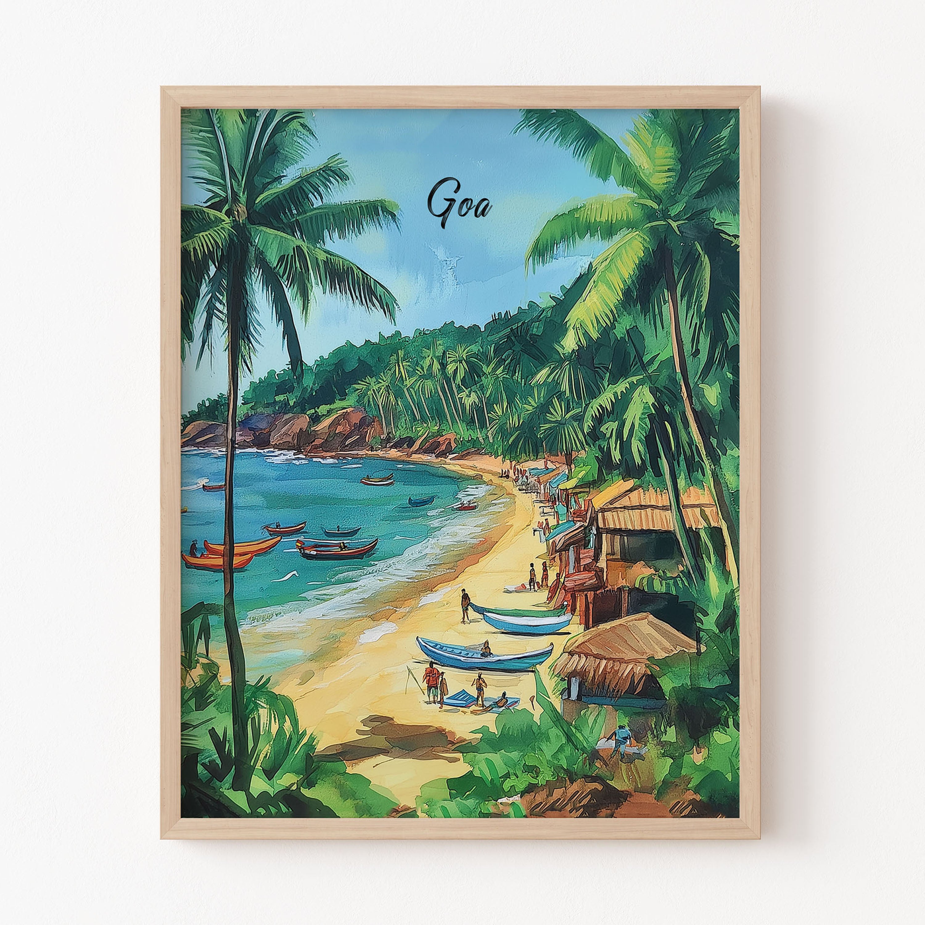 This vibrant artwork titled "Goa" beautifully captures the essence of the tropical beach paradise. With golden sands, palm trees swaying in the breeze, and colorful fishing boats lining the shore, this illustration perfectly reflects the laid-back and scenic vibe of Goa. Ideal for beach lovers and travel enthusiasts, this piece adds a splash of coastal charm to any space.