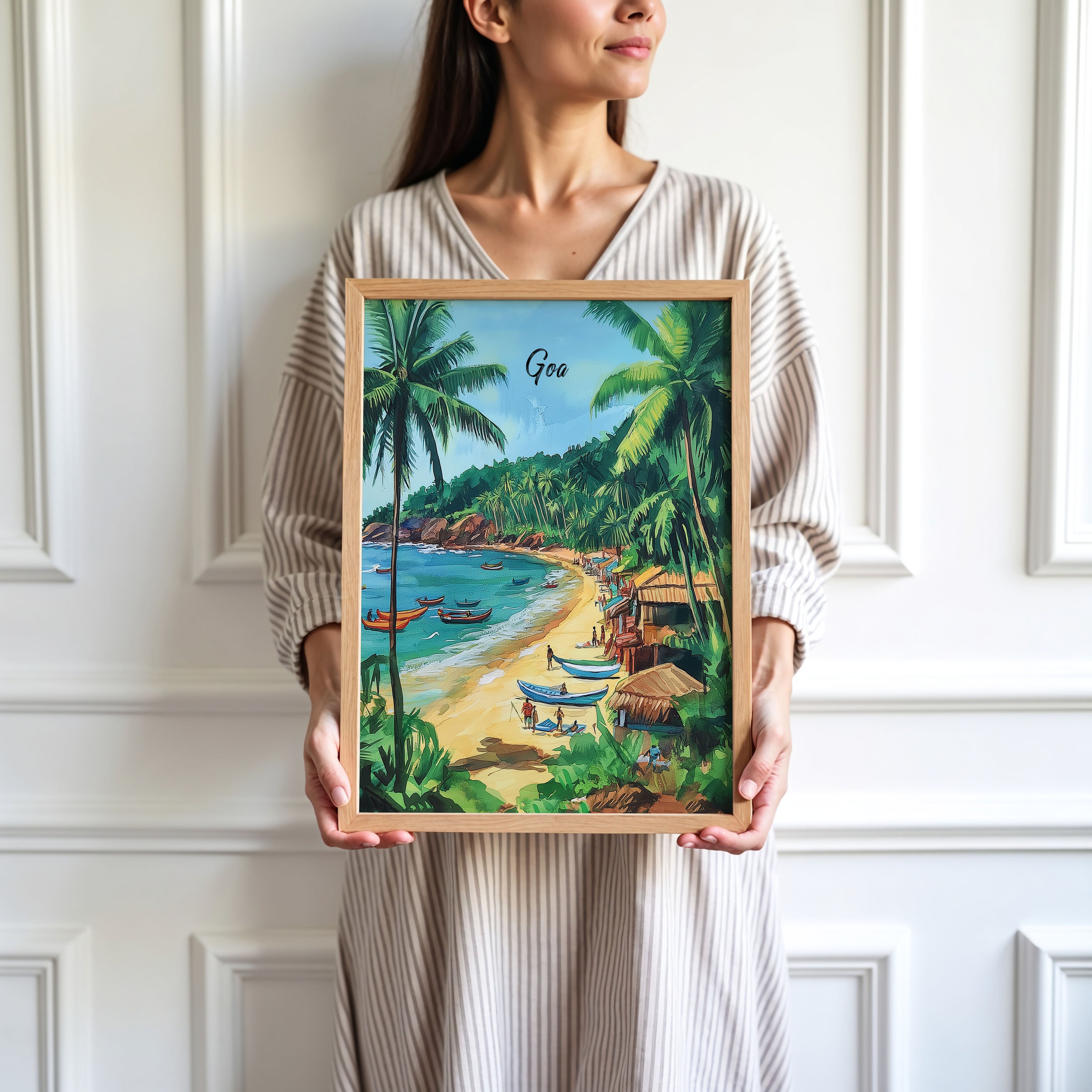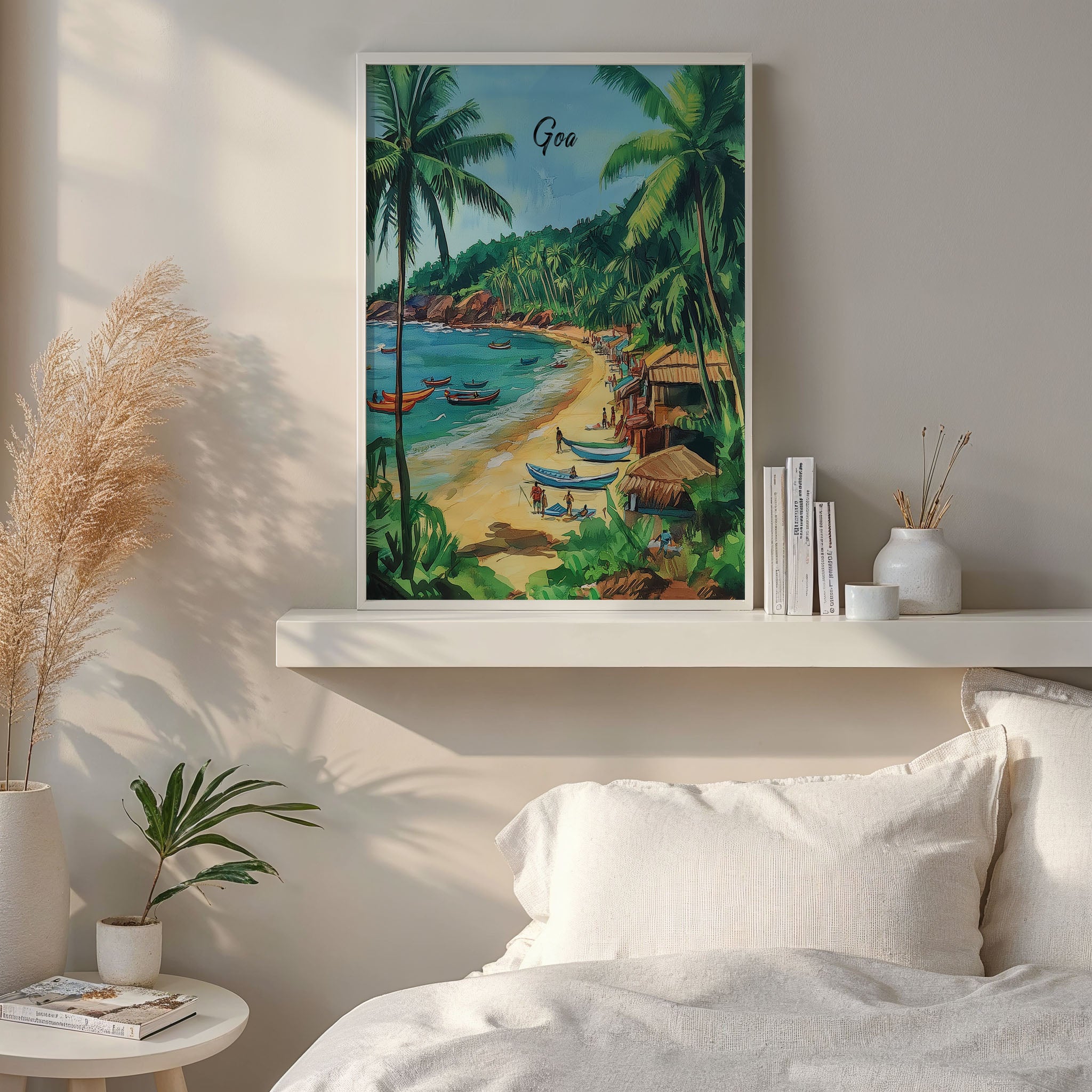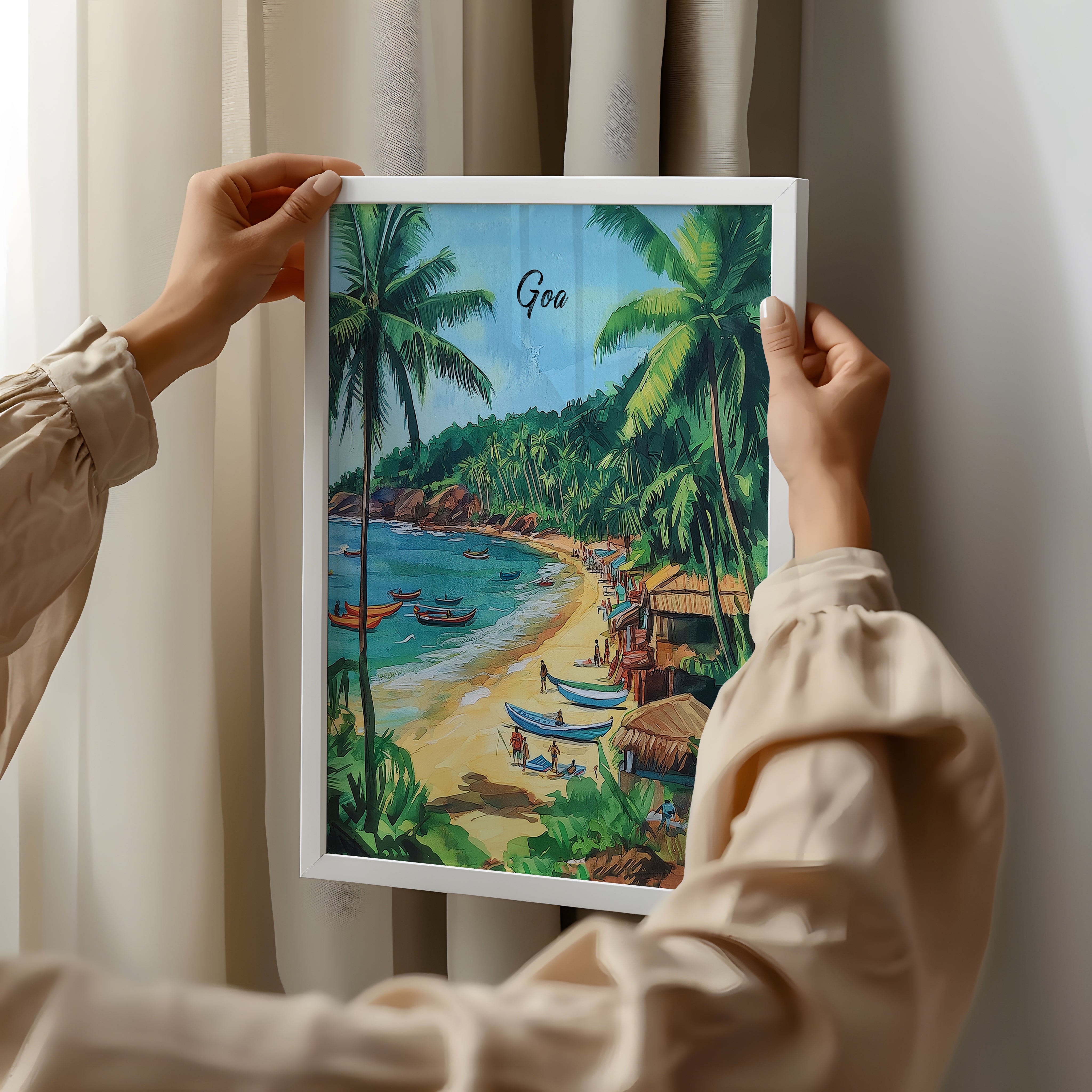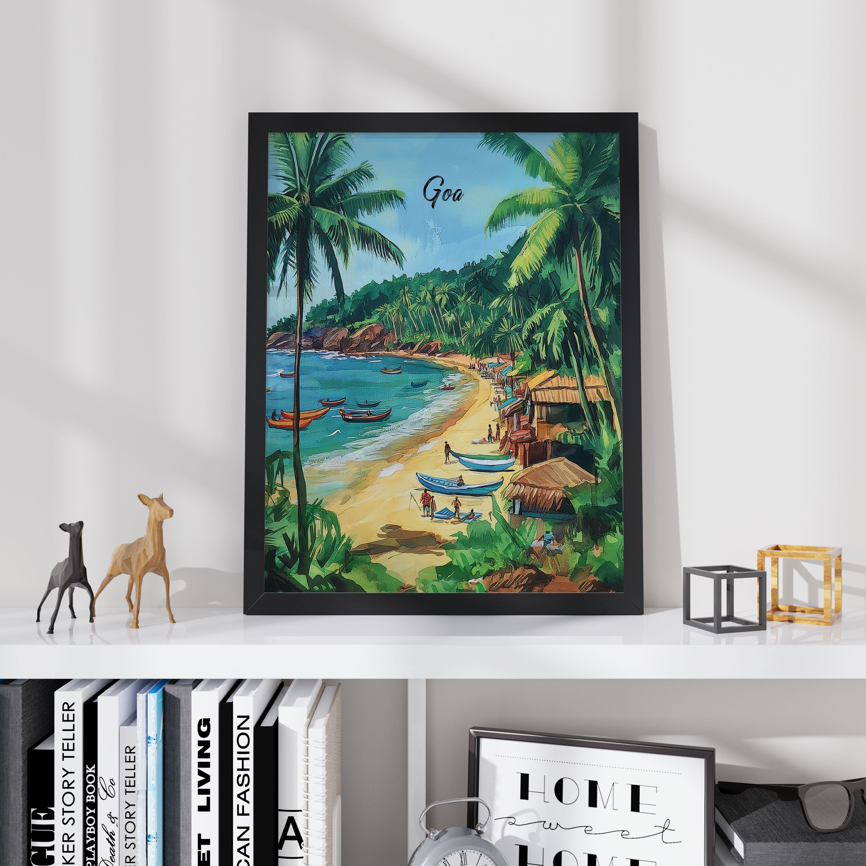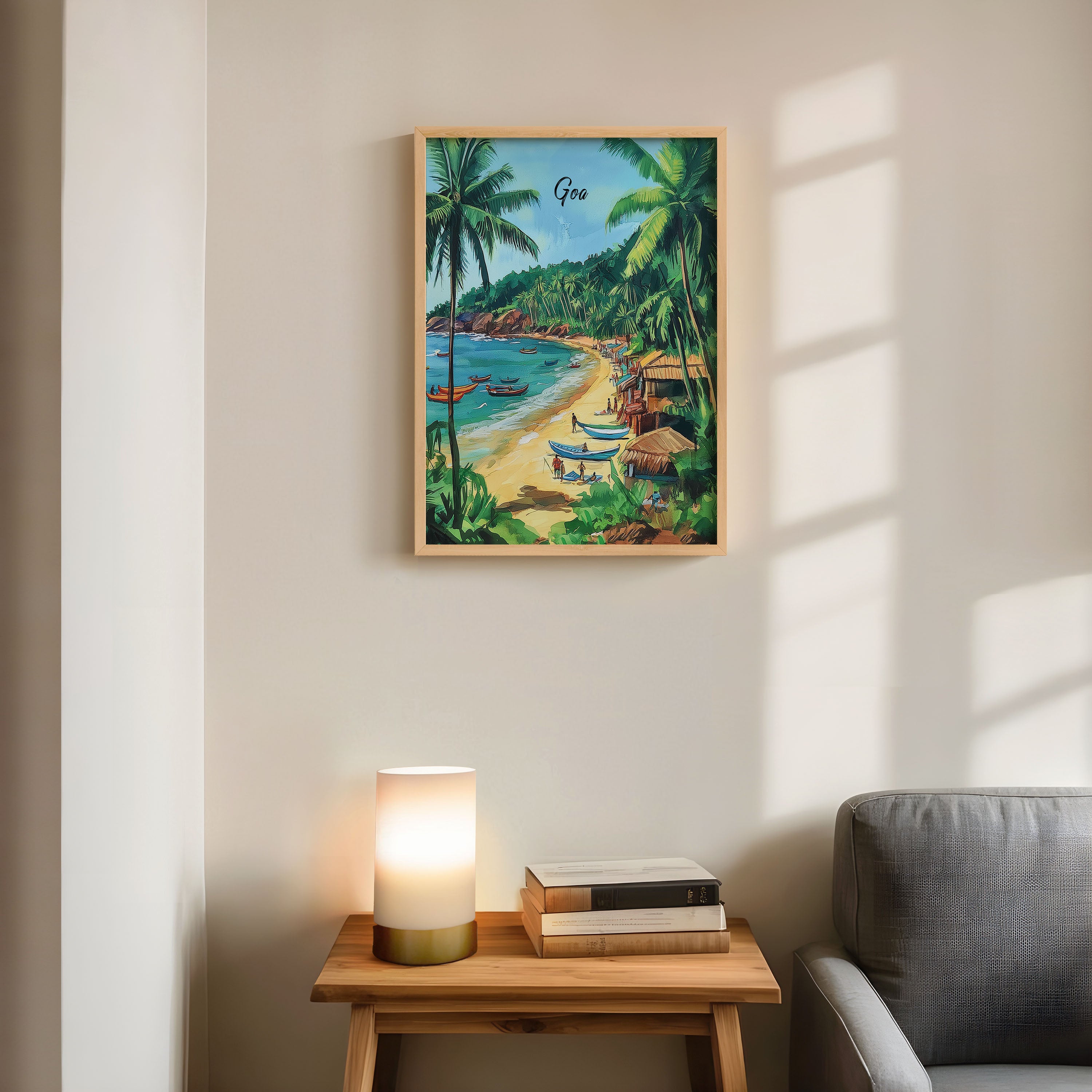 This vibrant artwork titled "Goa" beautifully captures the essence of the tropical beach paradise. With golden sands, palm trees swaying in the breeze, and colorful fishing boats lining the shore, this illustration perfectly reflects the laid-back and scenic vibe of Goa. Ideal for beach lovers and travel enthusiasts, this piece adds a splash of coastal charm to any space.