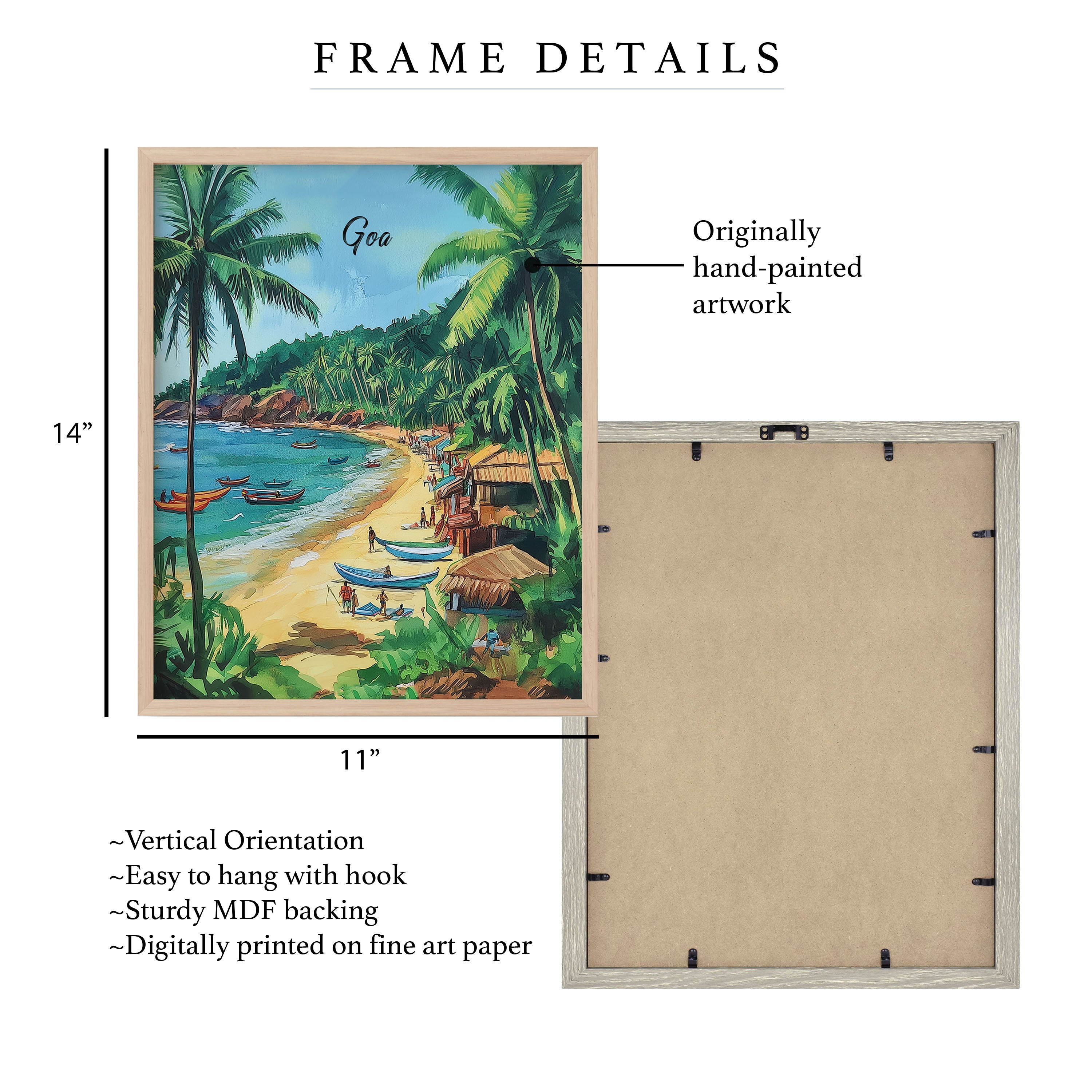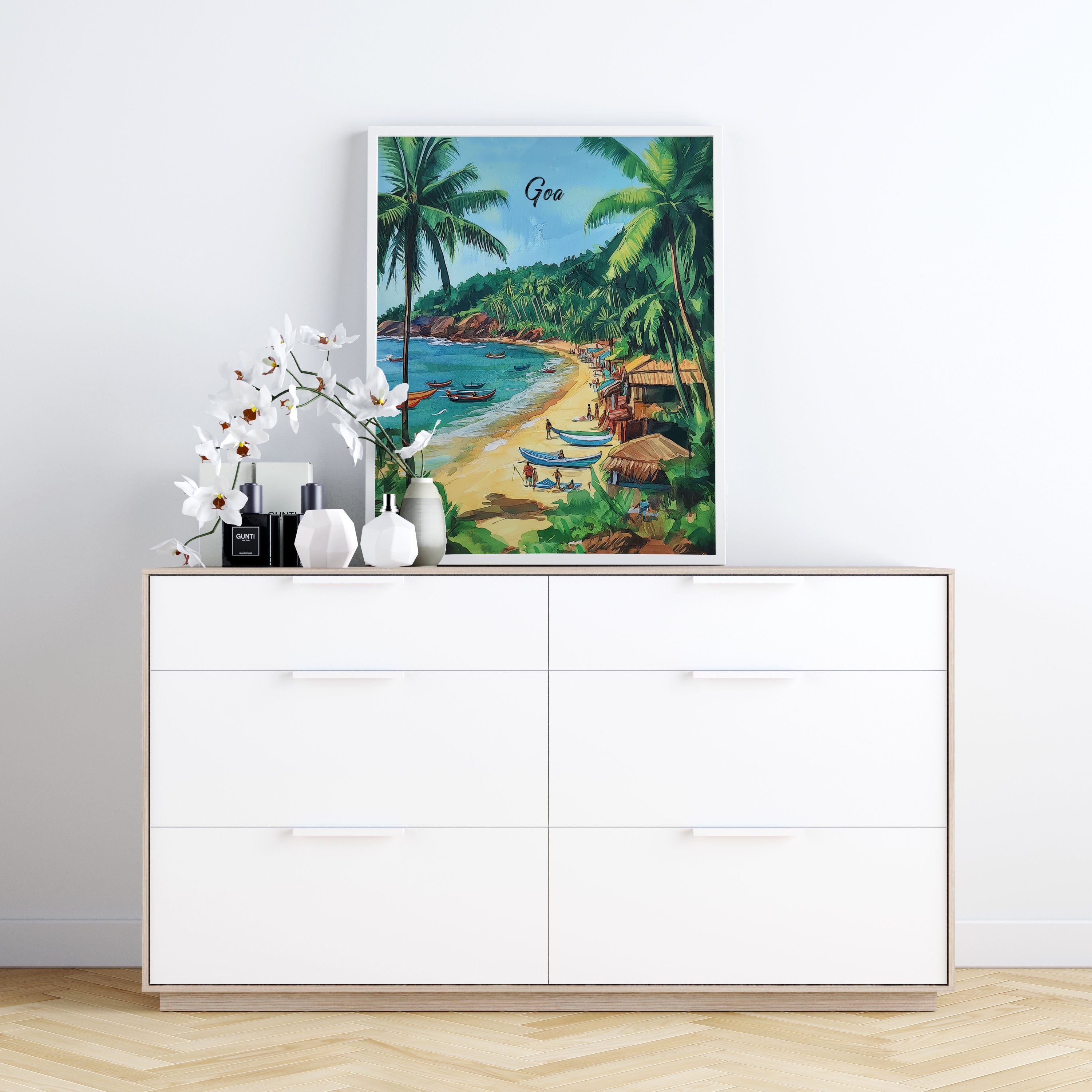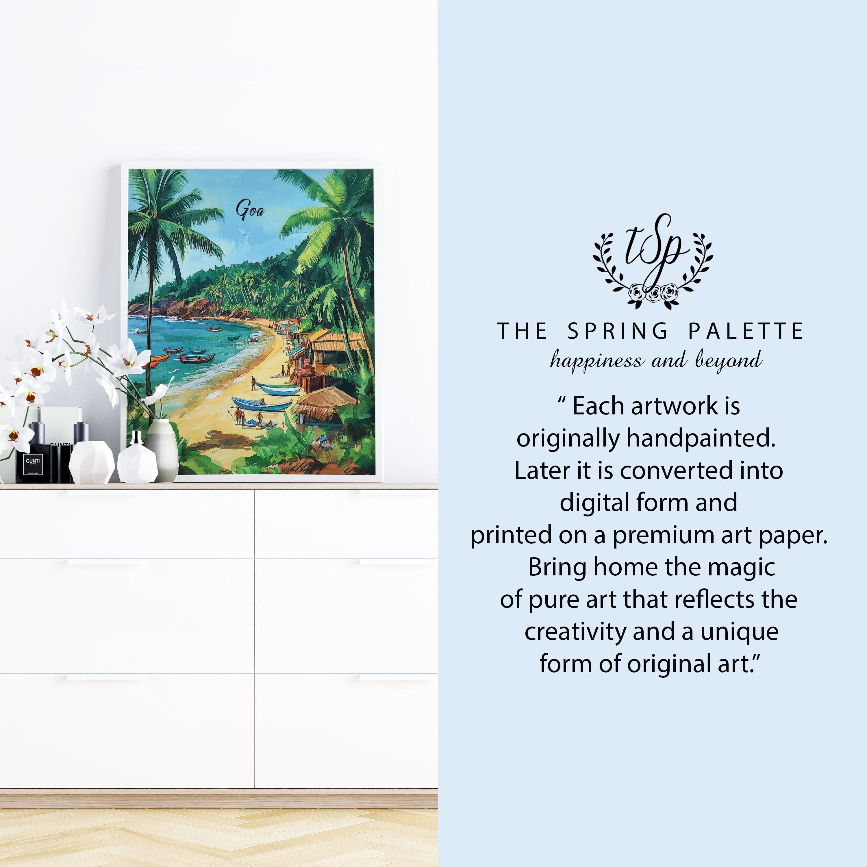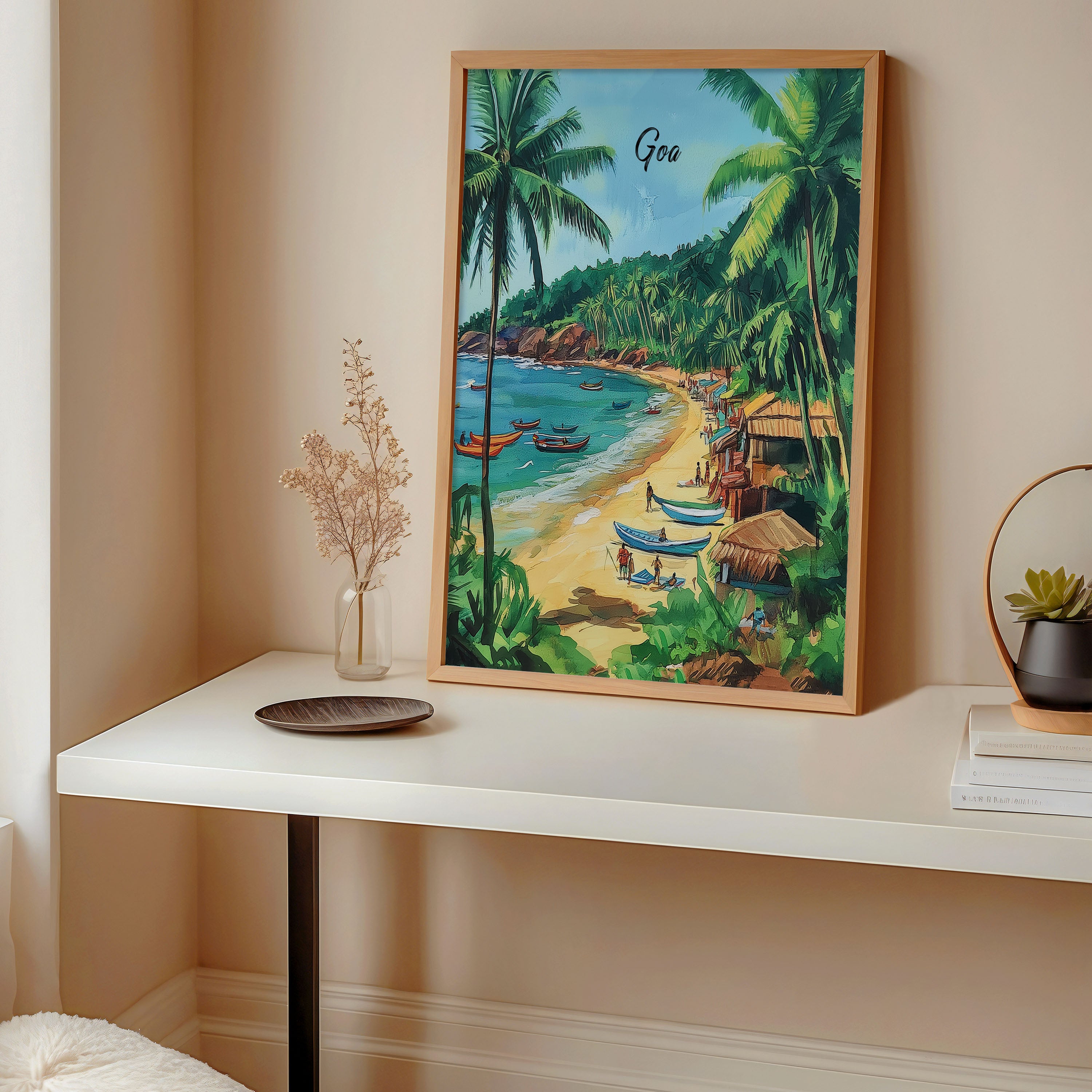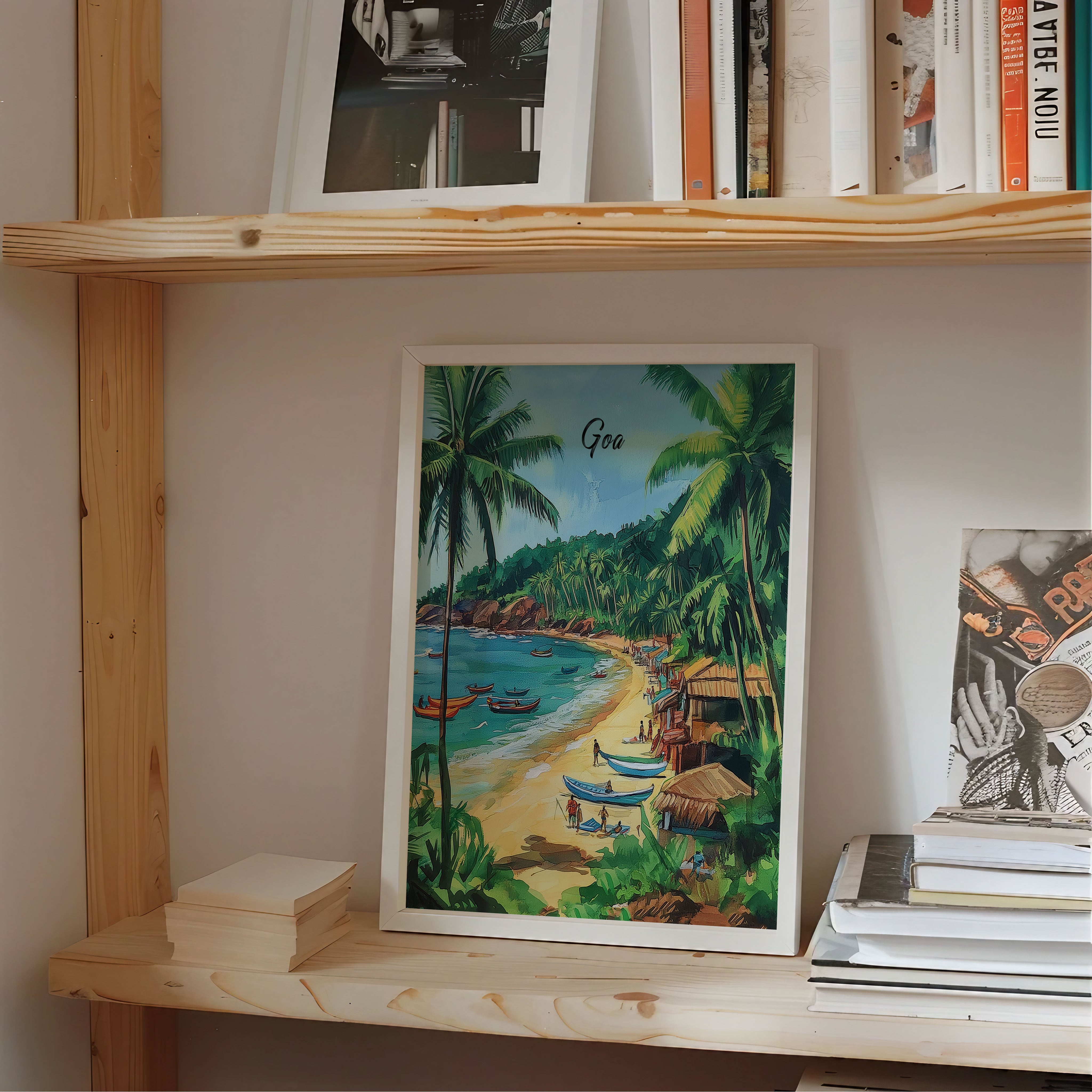 This vibrant artwork titled "Goa" beautifully captures the essence of the tropical beach paradise. With golden sands, palm trees swaying in the breeze, and colorful fishing boats lining the shore, this illustration perfectly reflects the laid-back and scenic vibe of Goa. Ideal for beach lovers and travel enthusiasts, this piece adds a splash of coastal charm to any space.