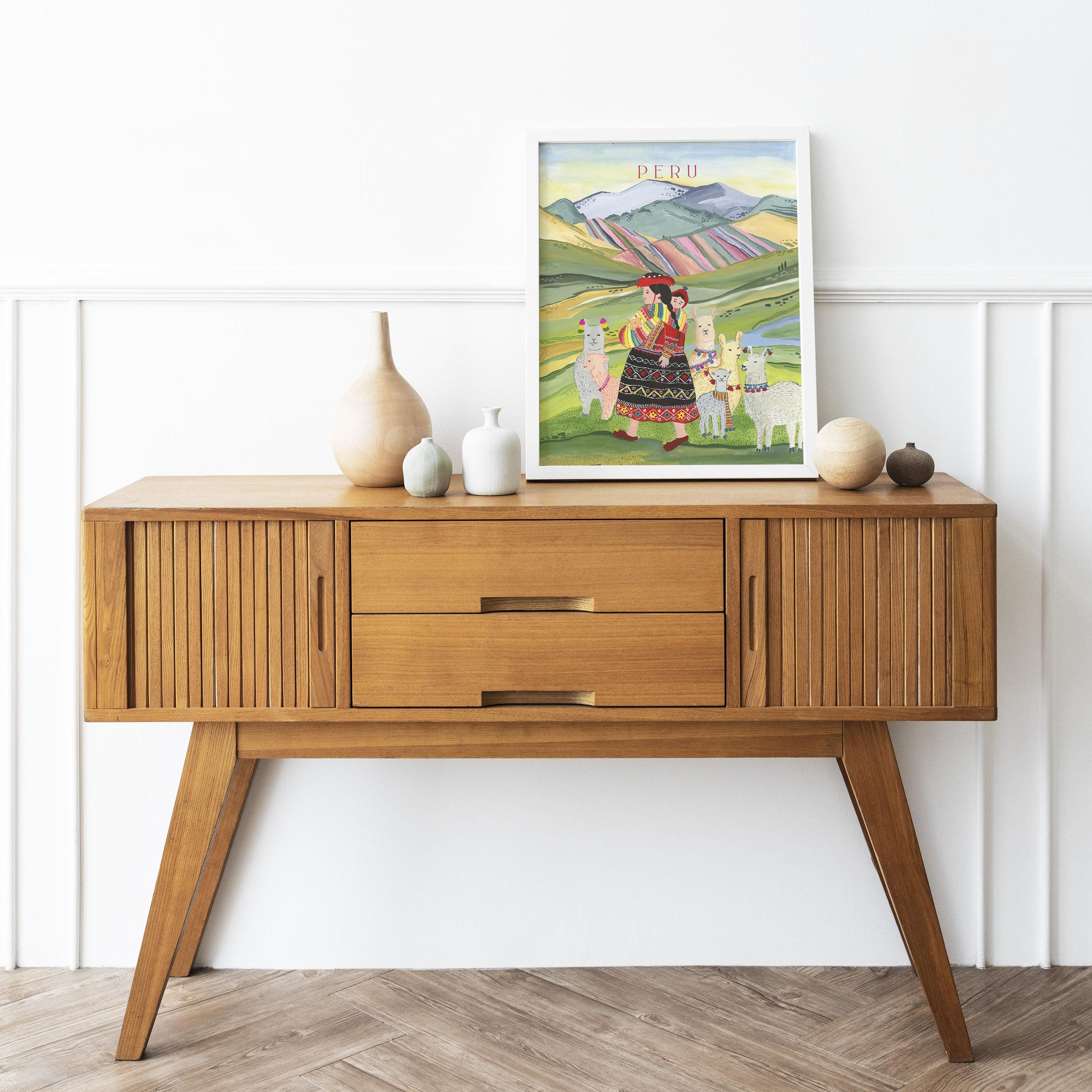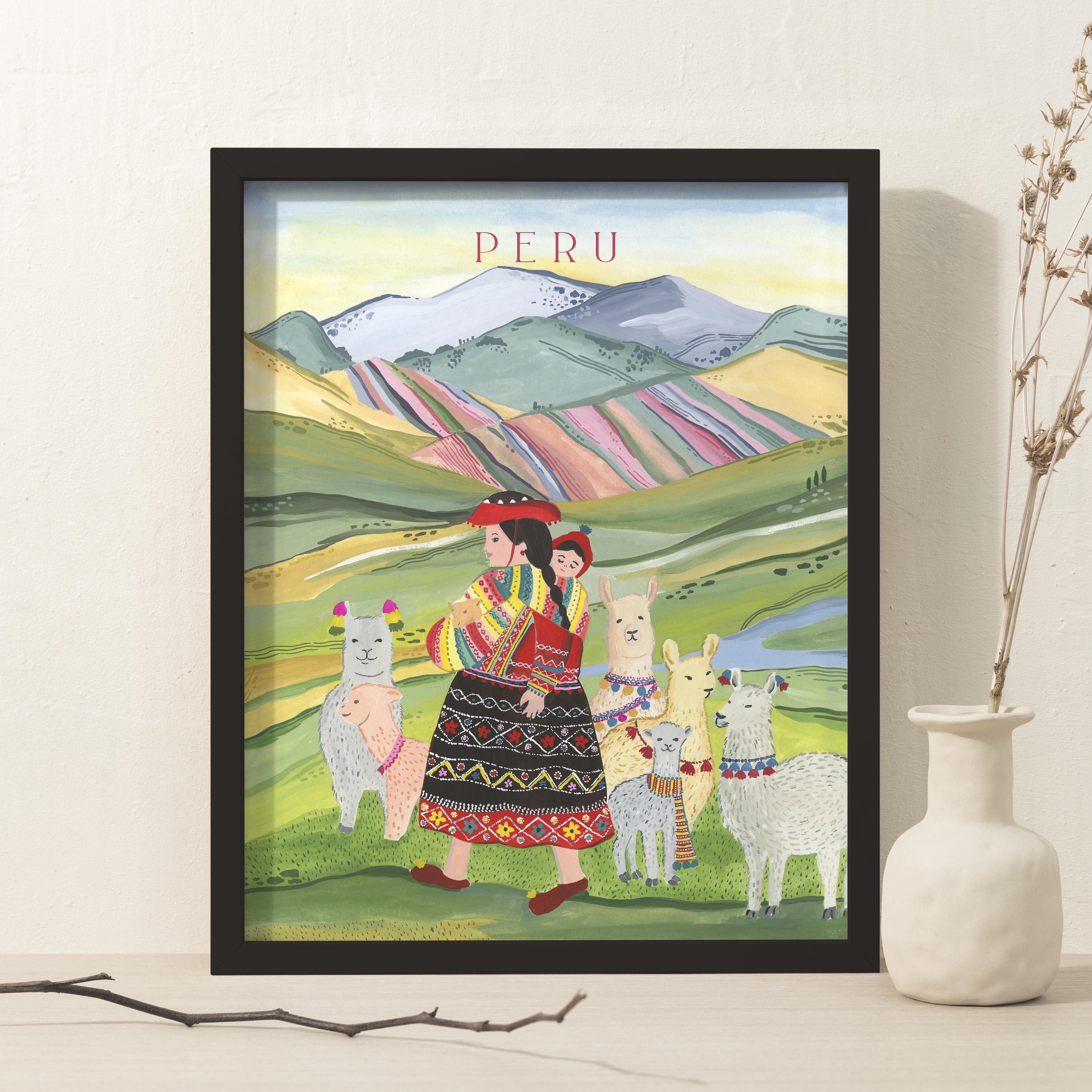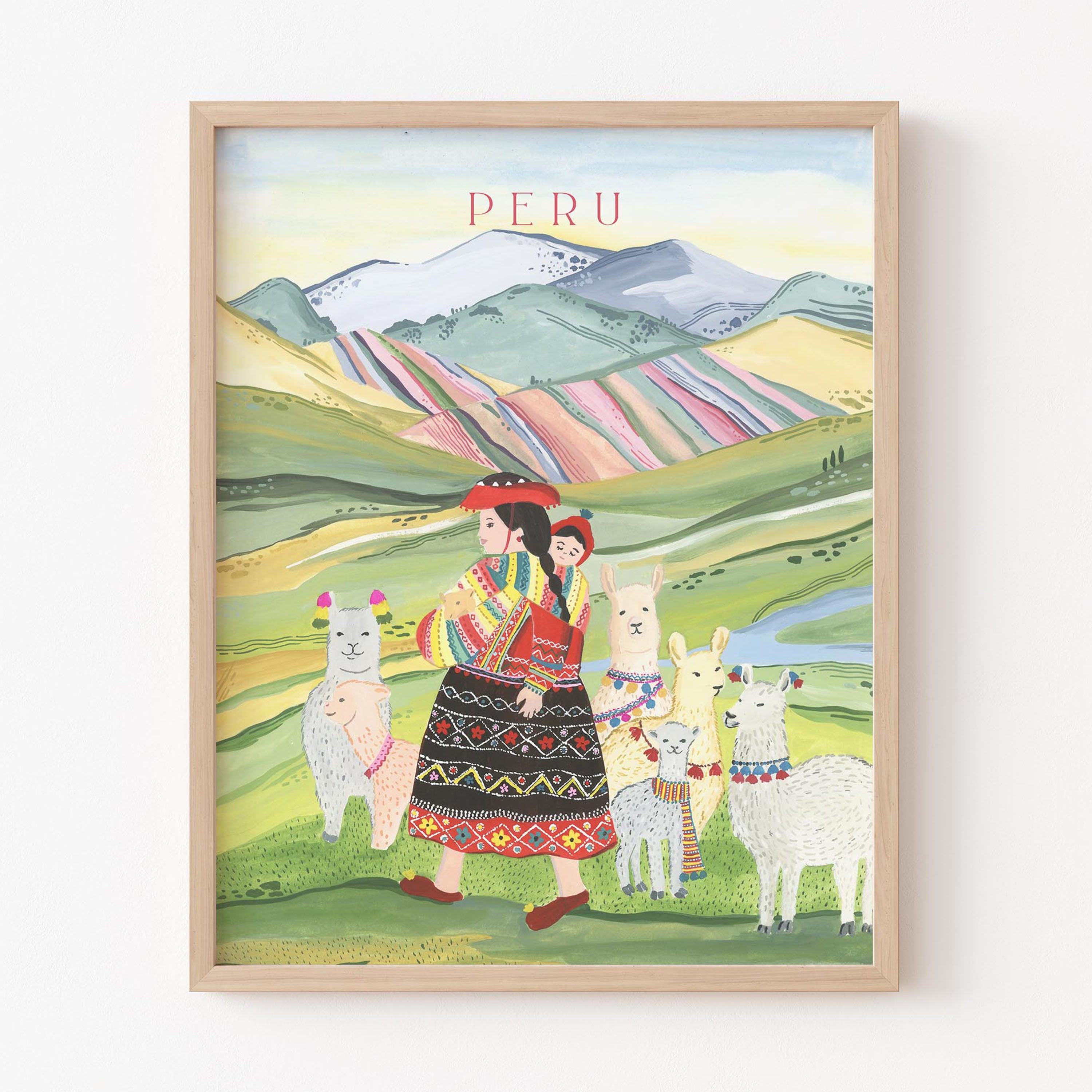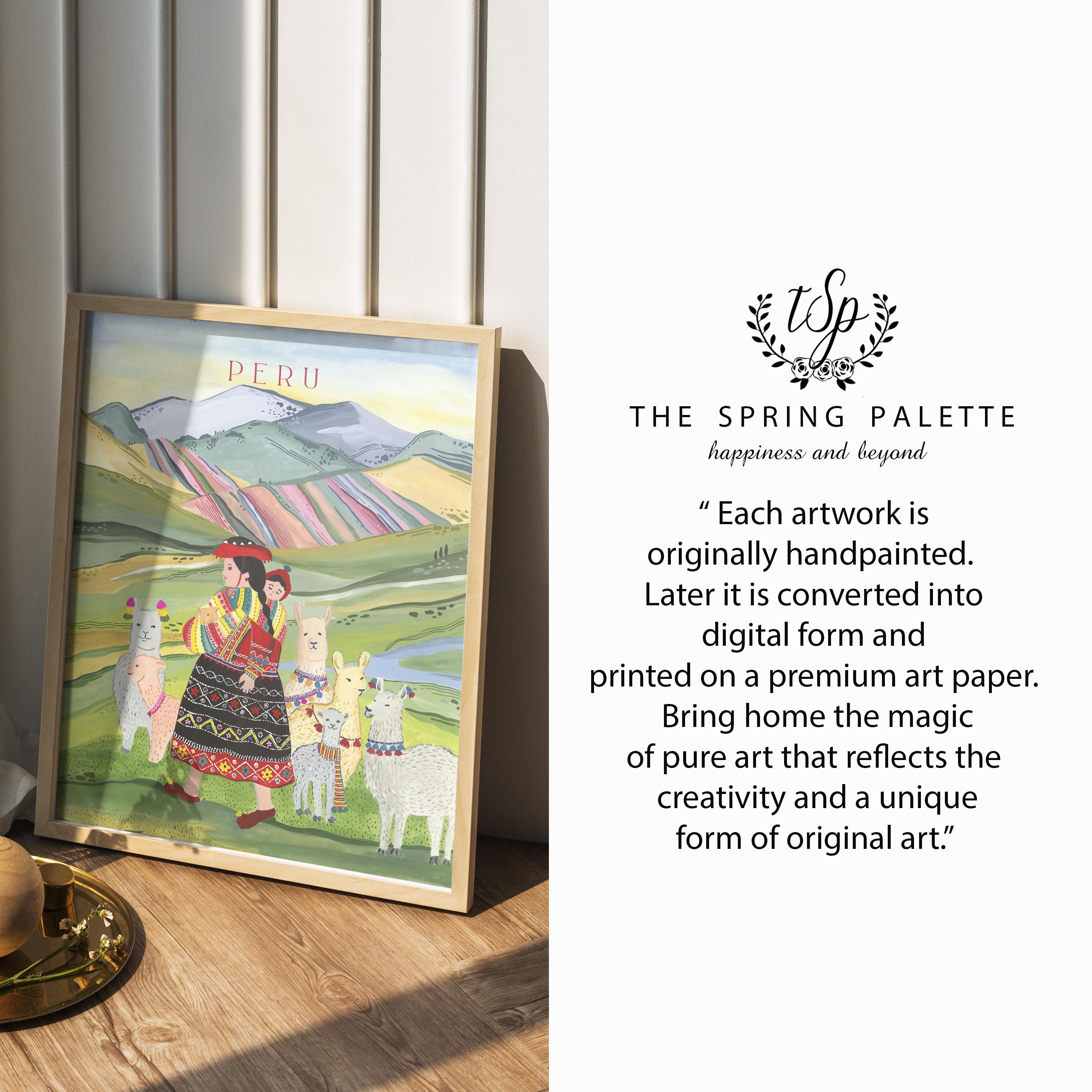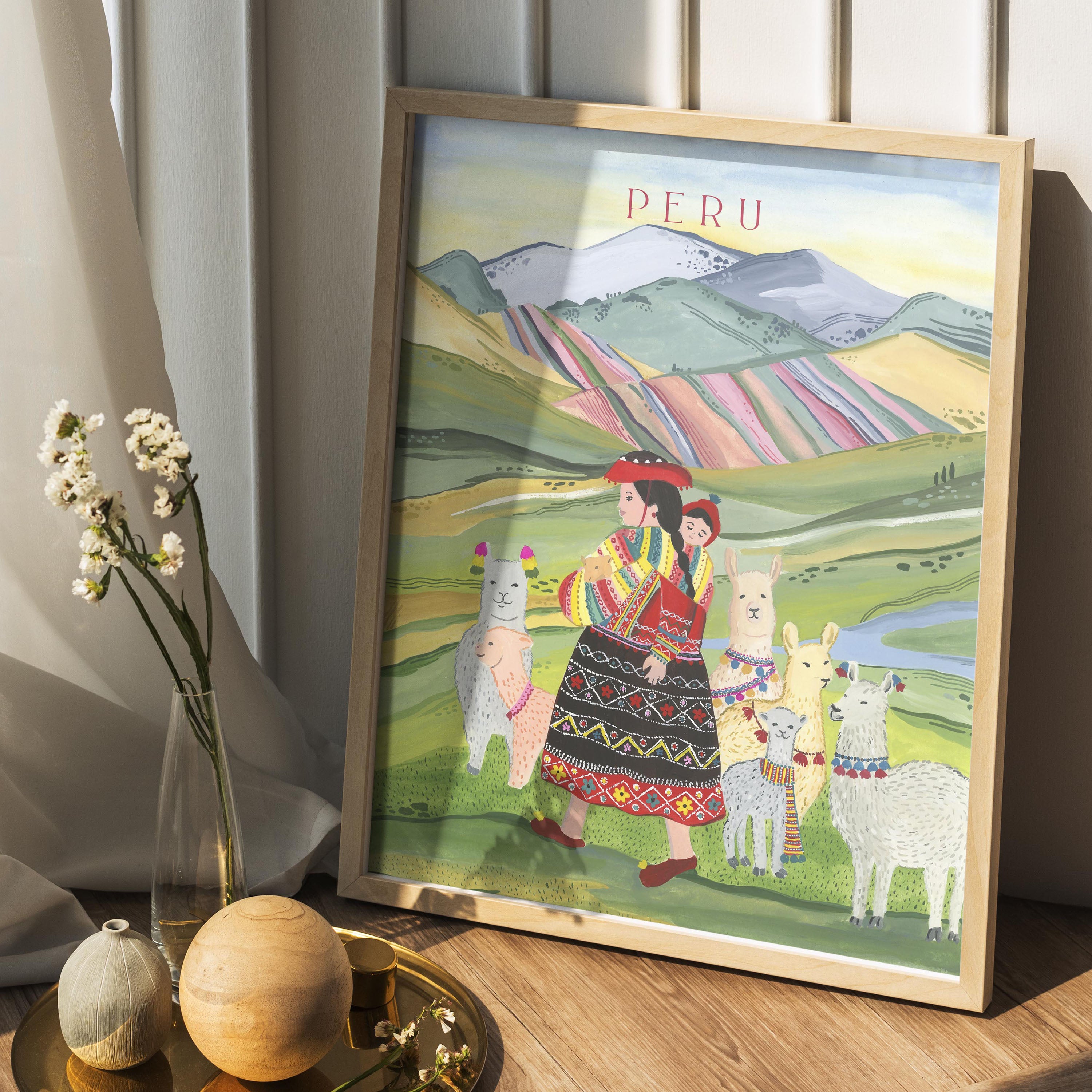 Introducing a breathtaking artwork that captures the essence of Peru's majestic mountains, graceful women, and gentle llamas. This stunning piece of art is a visual ode to the natural beauty and cultural richness of Peru, a land known for its awe-inspiring landscapes and vibrant traditions.