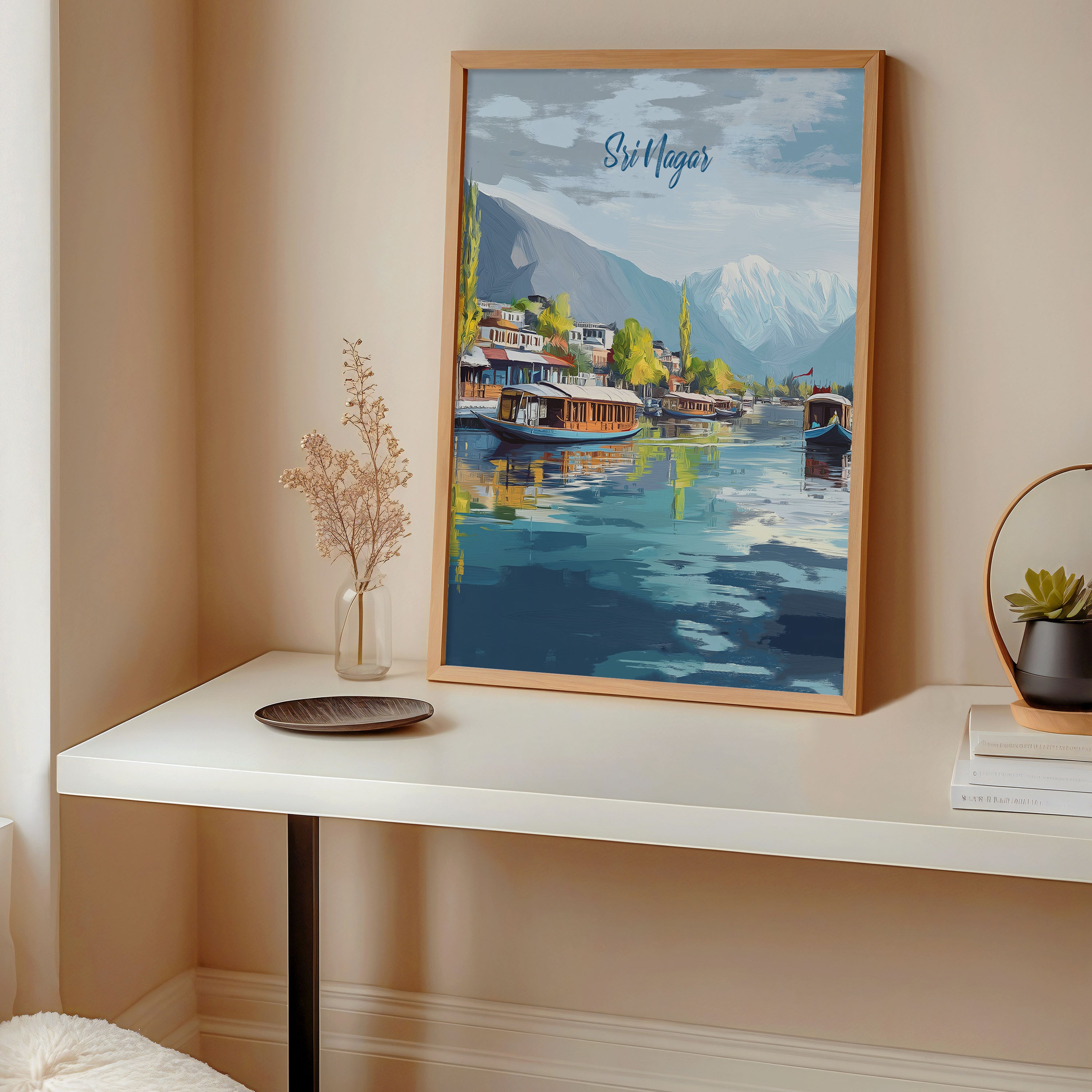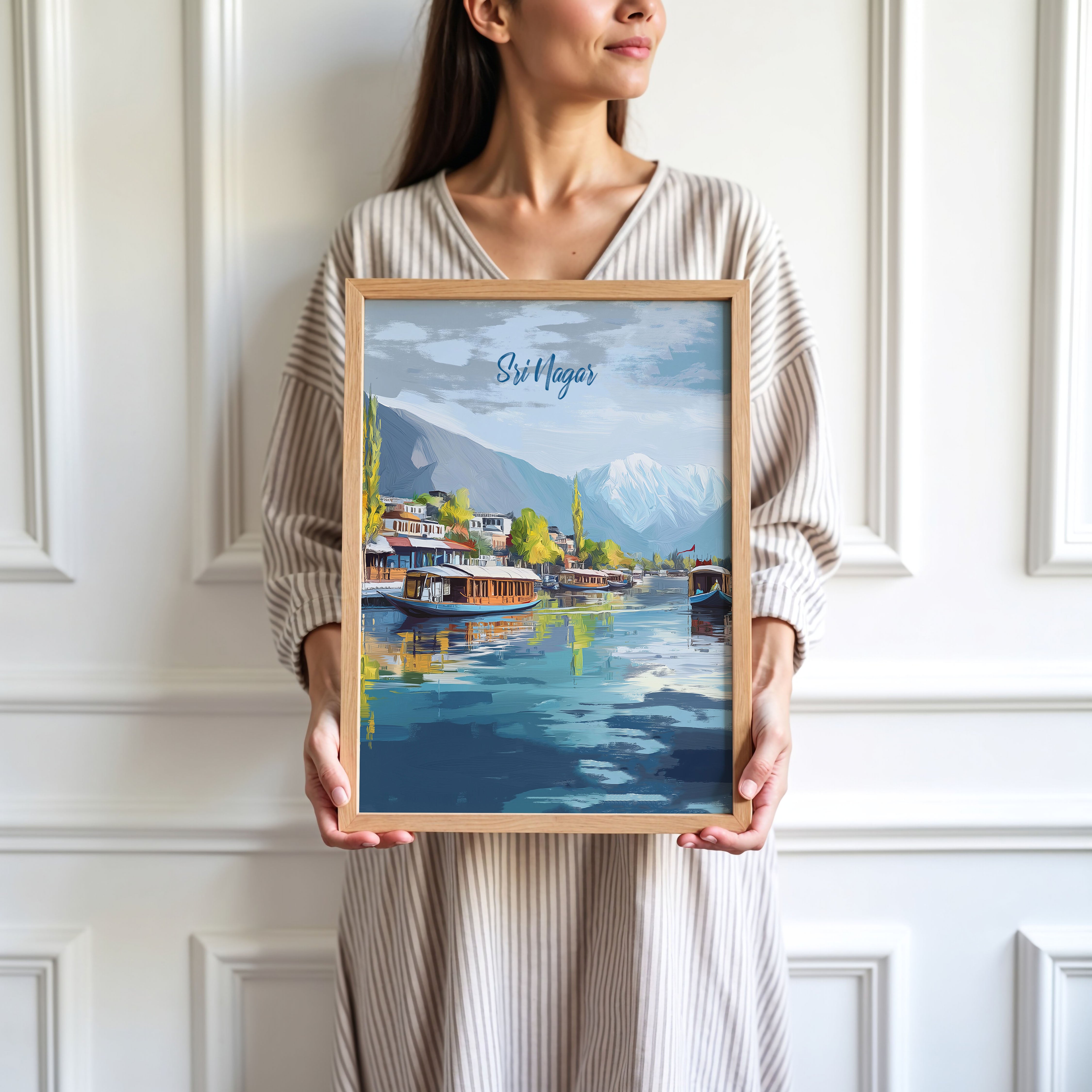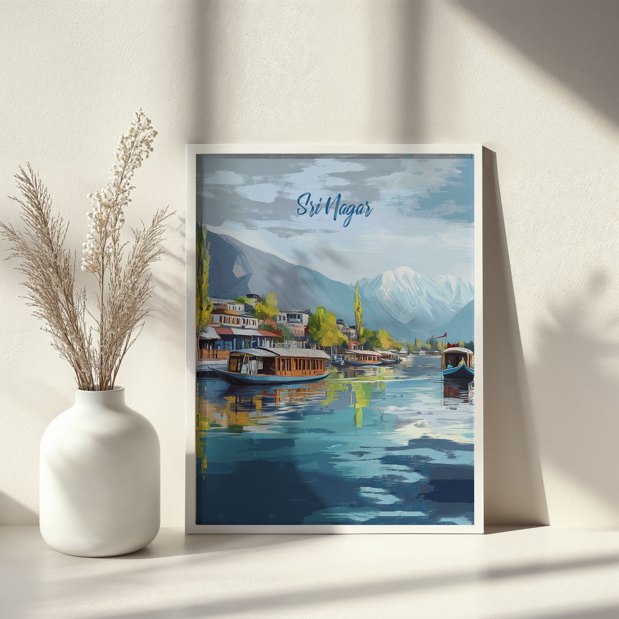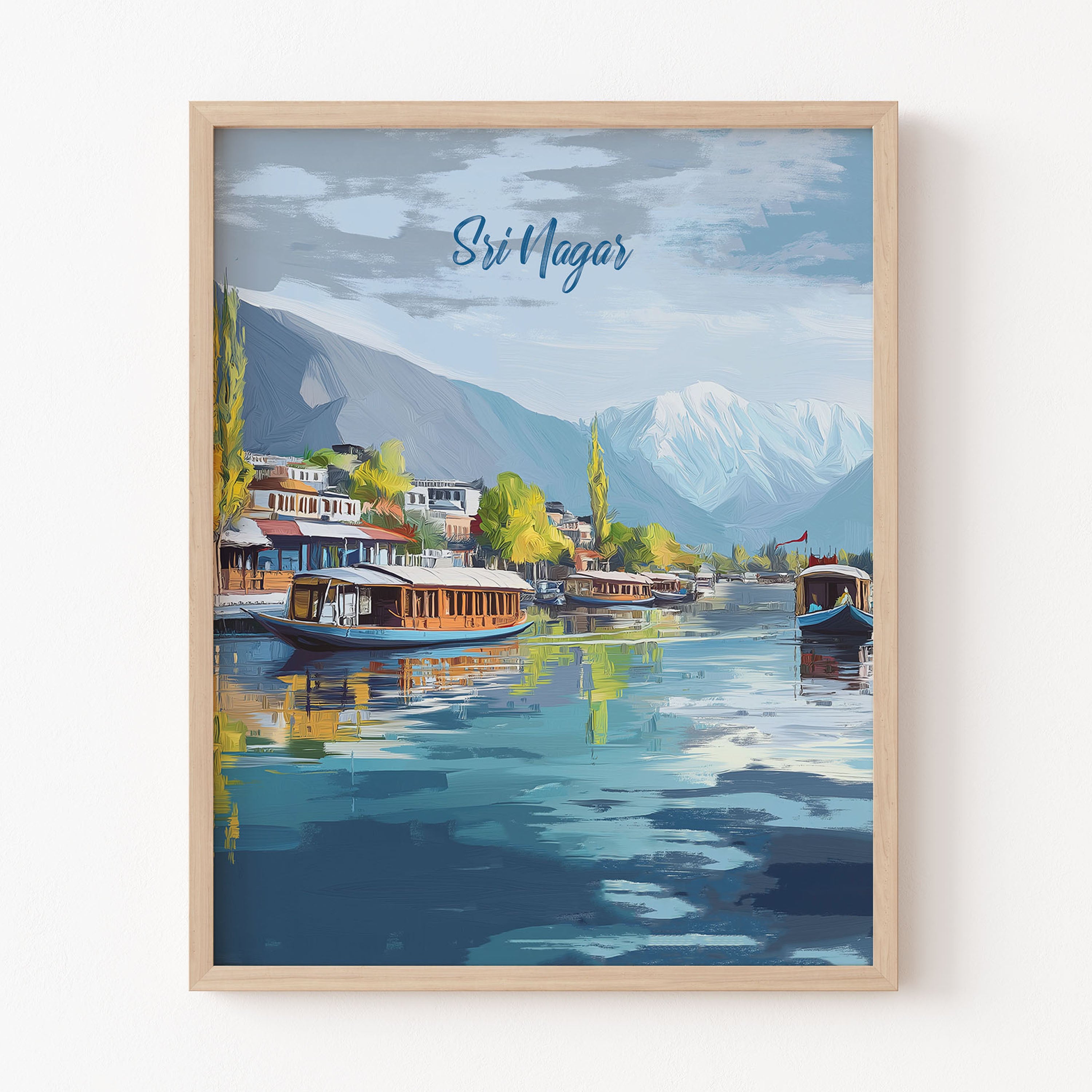 This serene illustration titled "Srinagar" beautifully captures the tranquil beauty of Kashmir's famous Dal Lake. The artwork showcases traditional wooden houseboats and Shikaras gently floating on the calm waters, reflecting the vibrant colors of the surroundings.