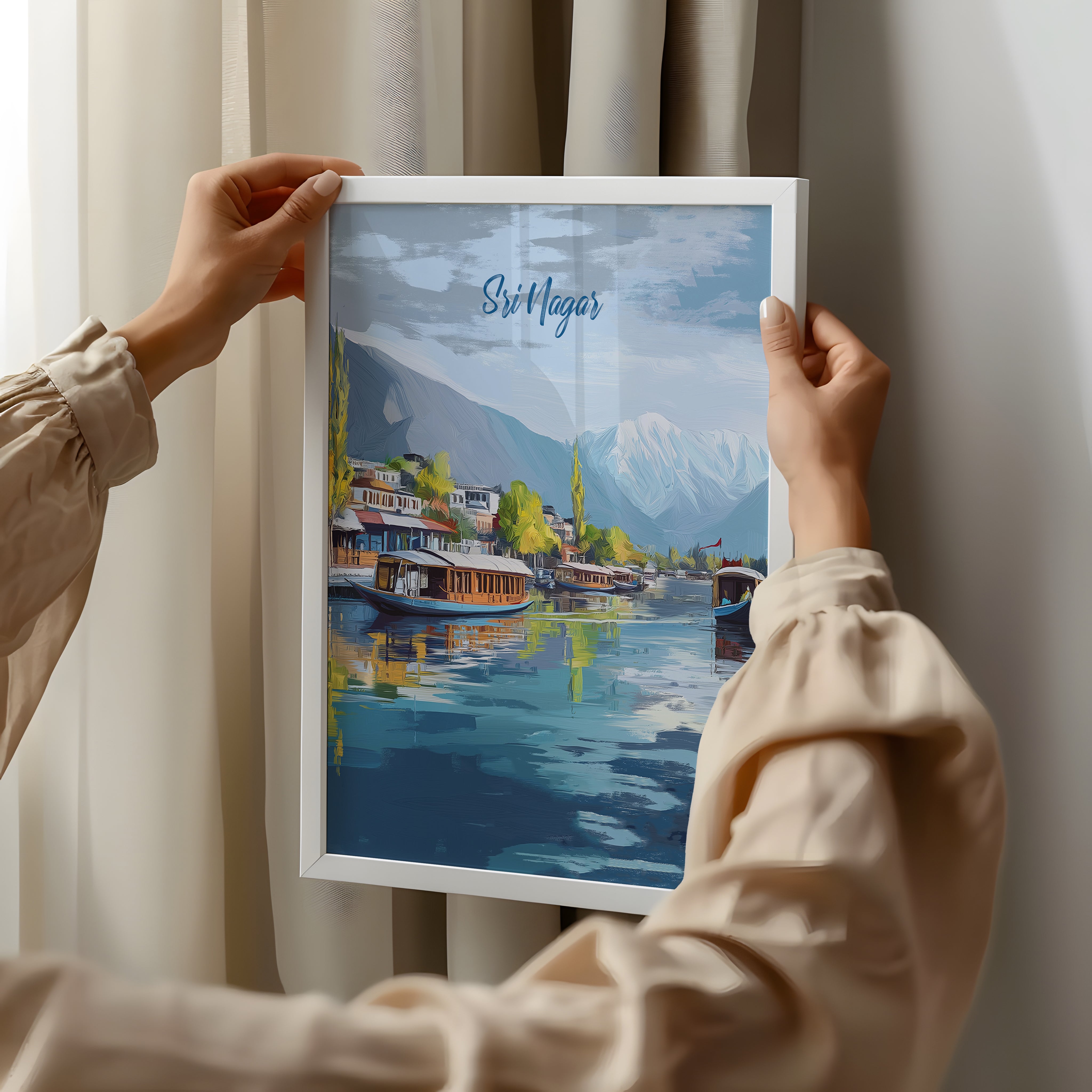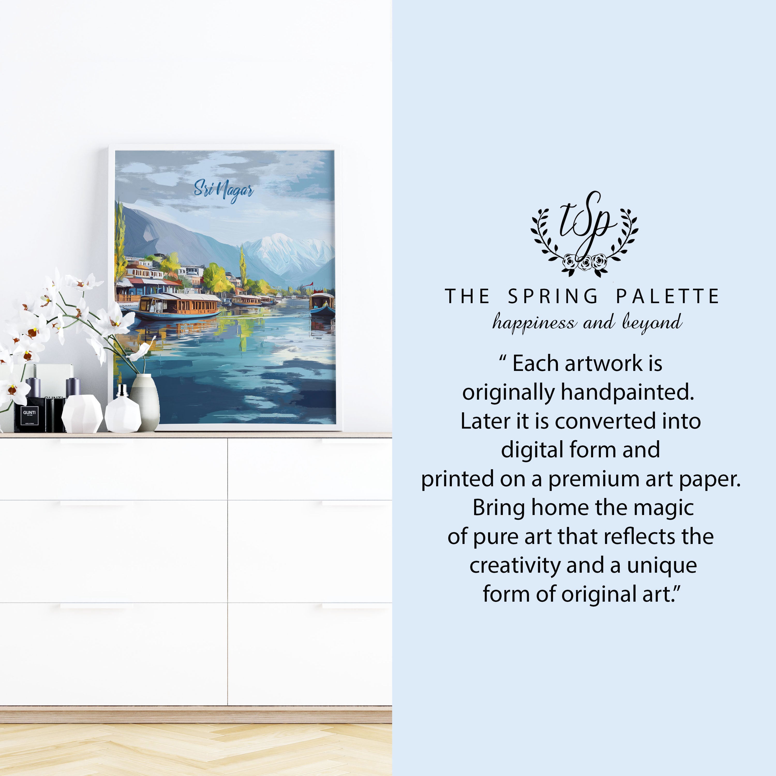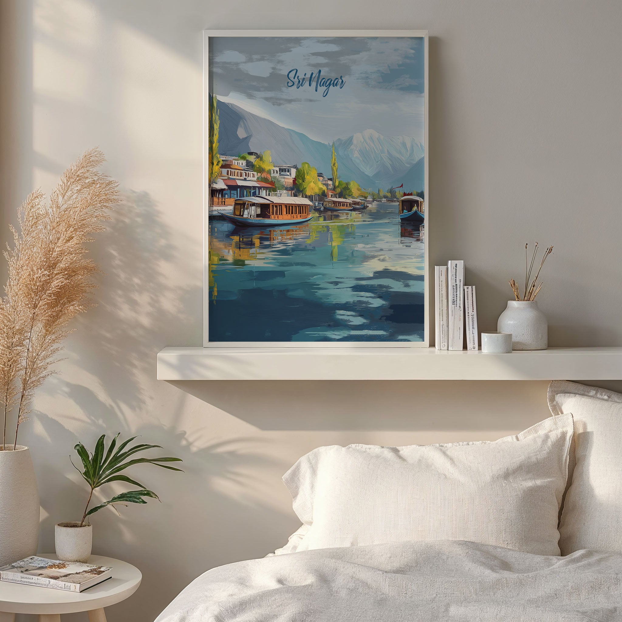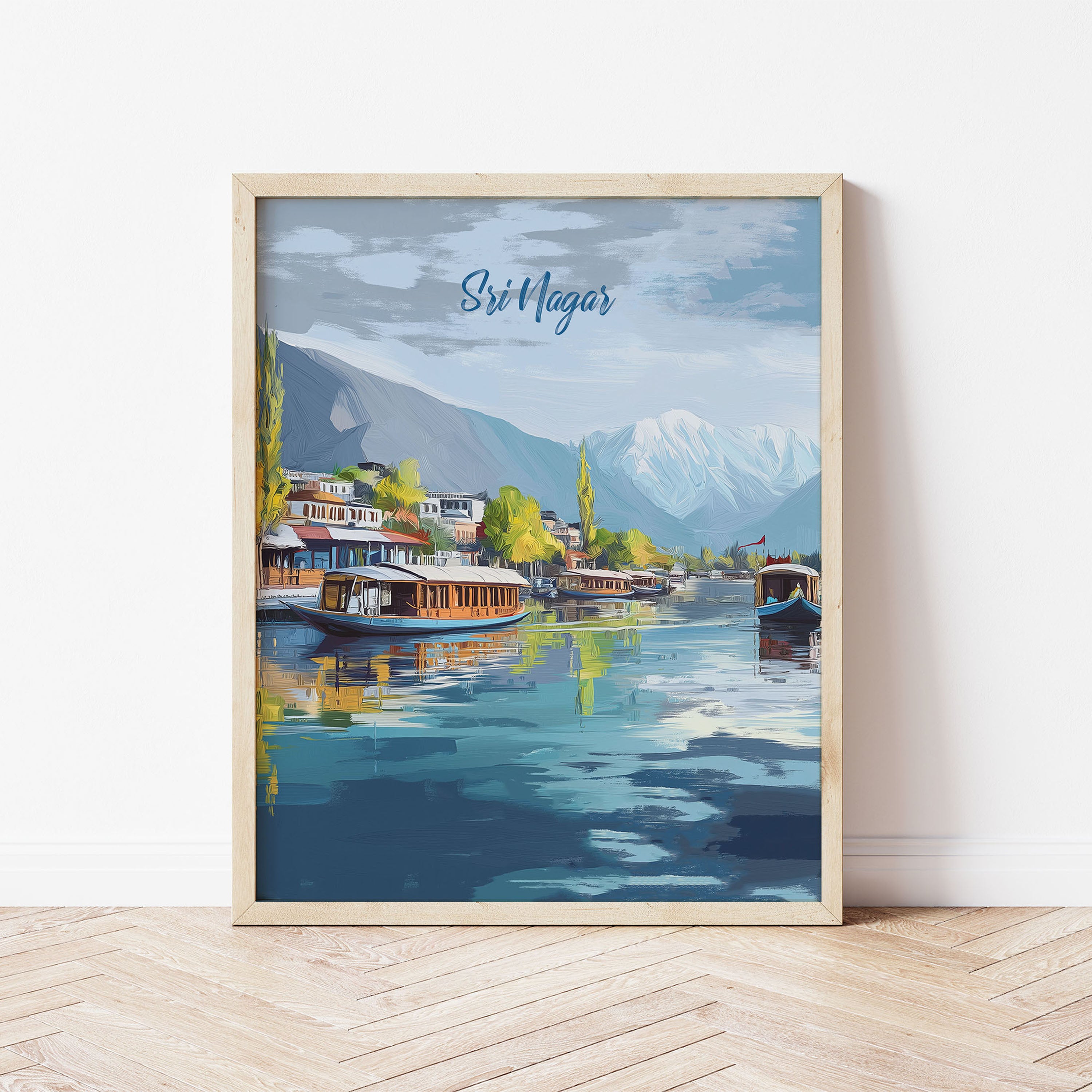 This serene illustration titled "Srinagar" beautifully captures the tranquil beauty of Kashmir's famous Dal Lake. The artwork showcases traditional wooden houseboats and Shikaras gently floating on the calm waters, reflecting the vibrant colors of the surroundings.