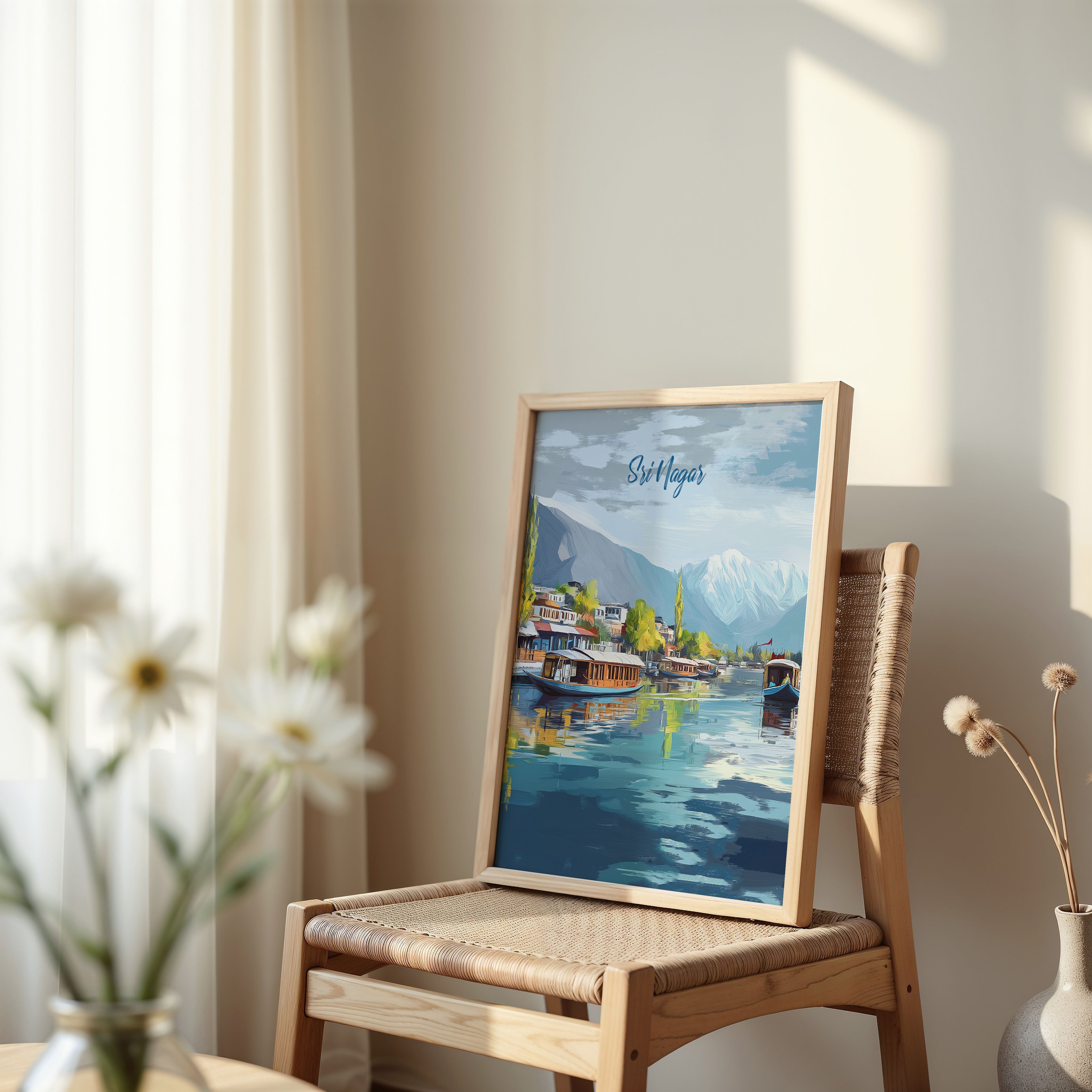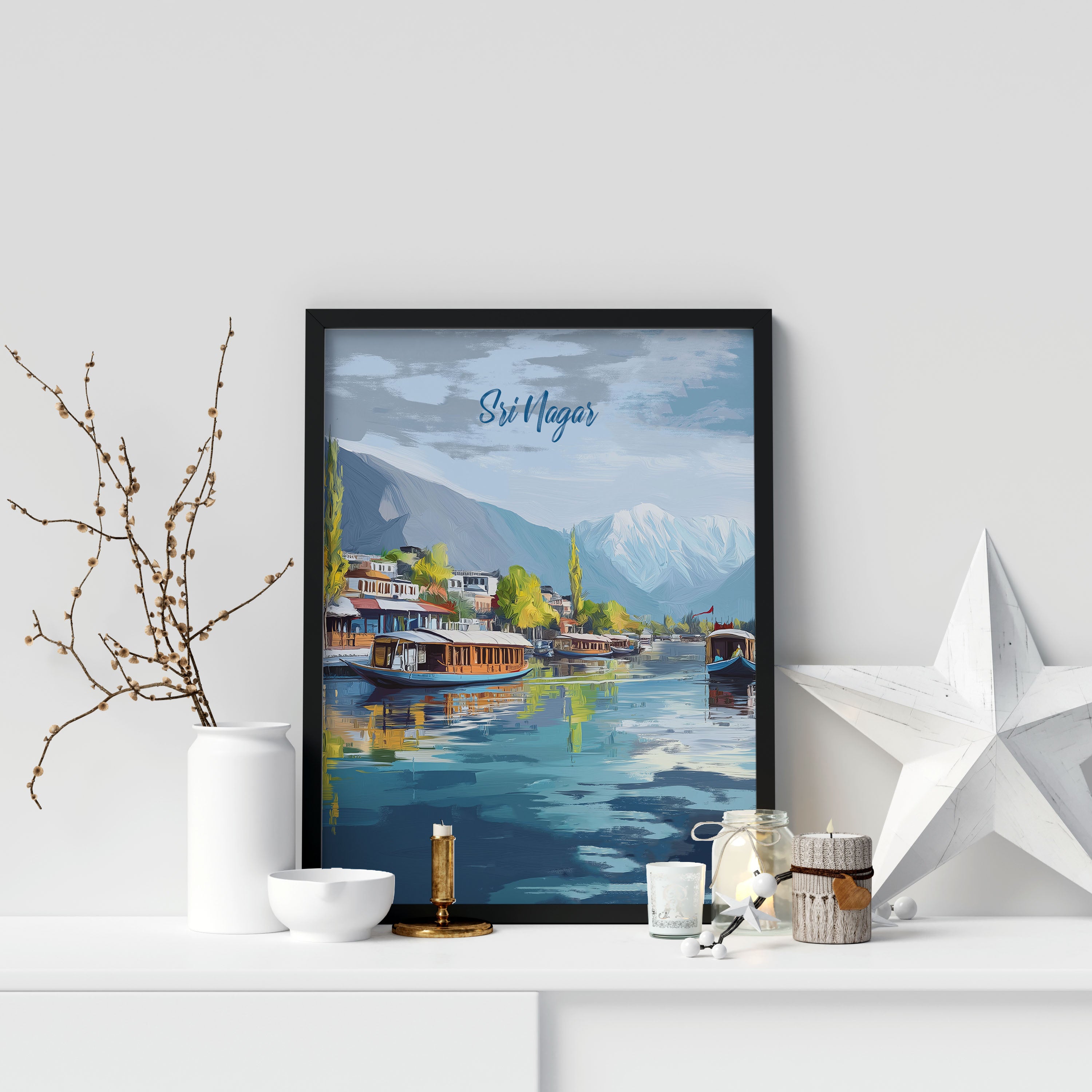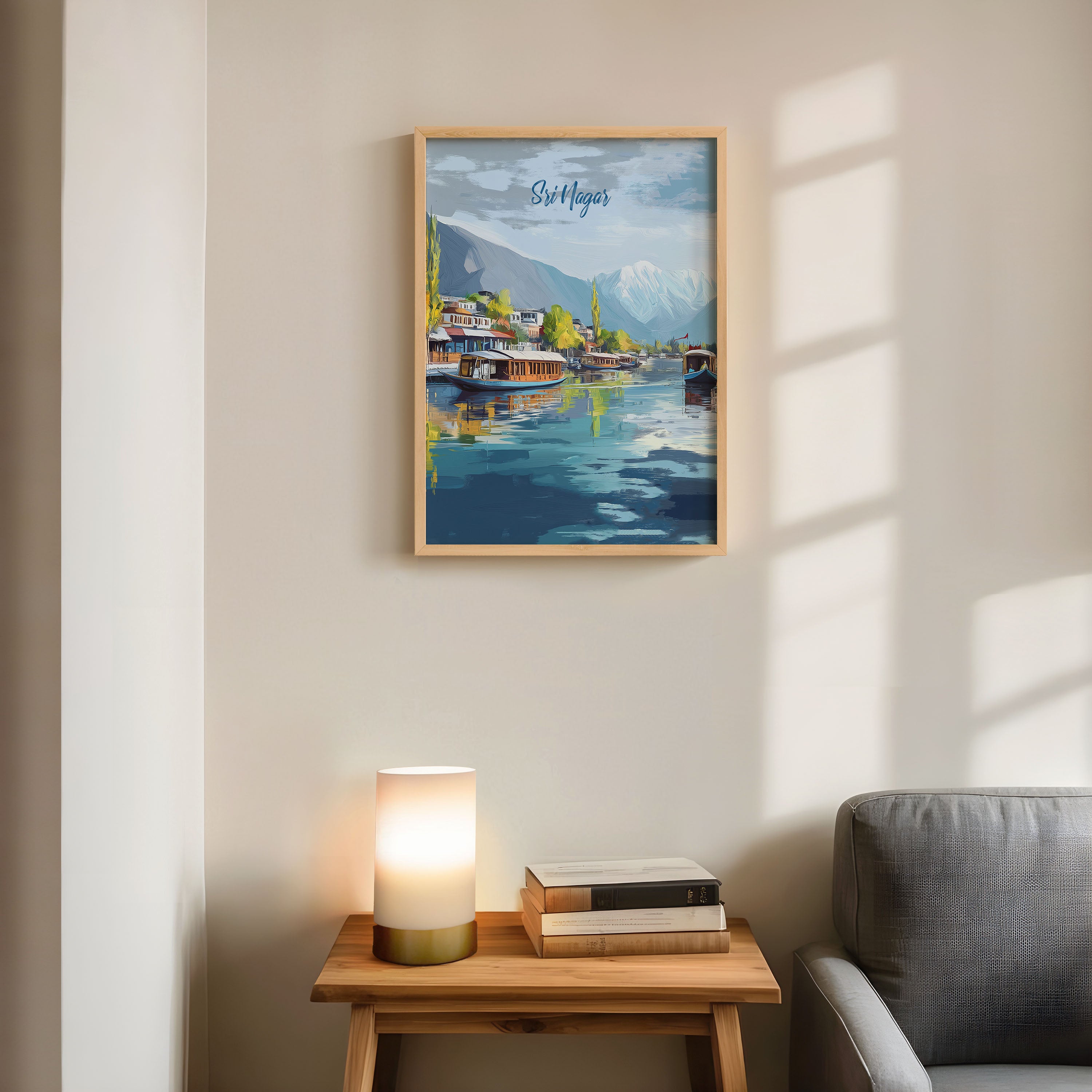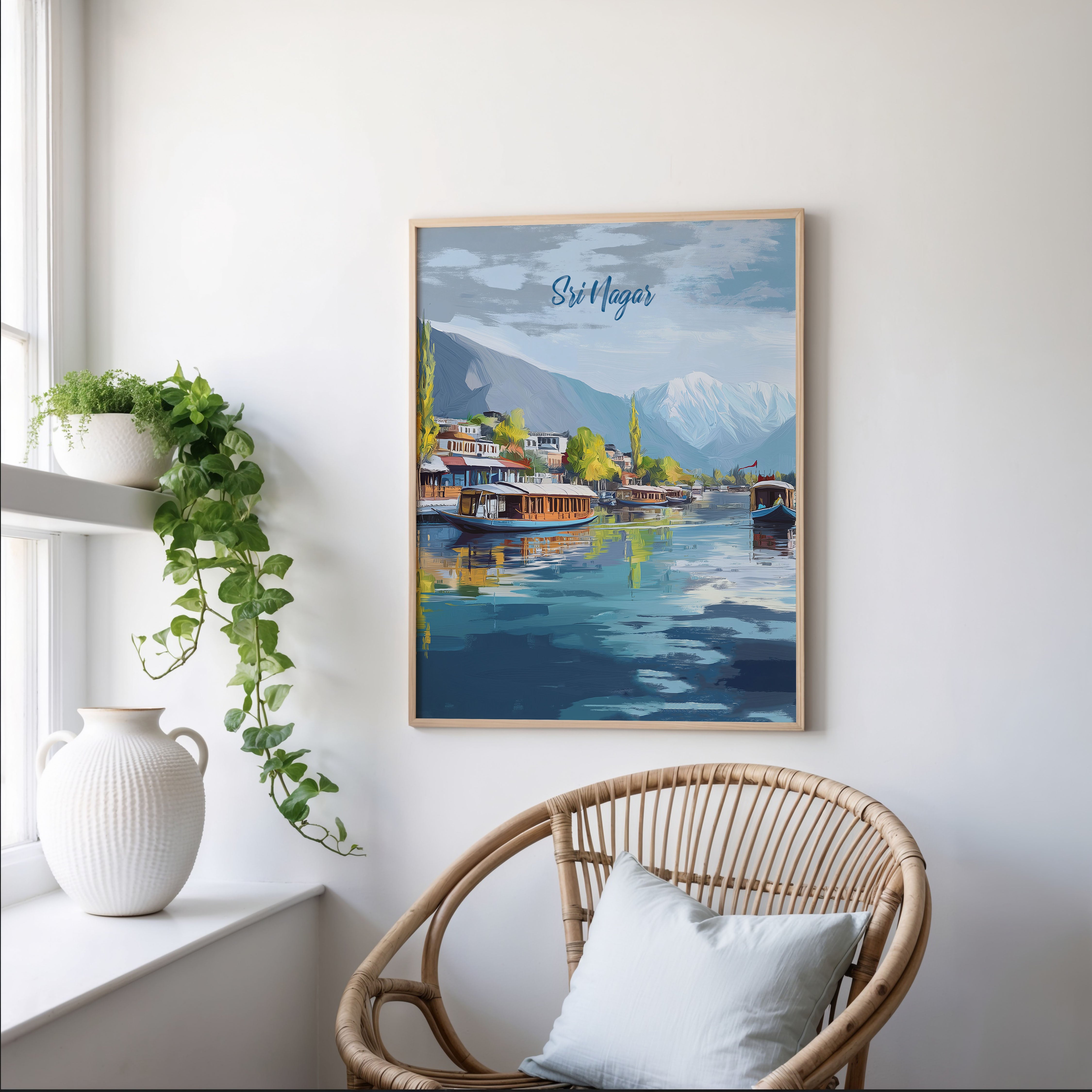 This serene illustration titled "Srinagar" beautifully captures the tranquil beauty of Kashmir's famous Dal Lake. The artwork showcases traditional wooden houseboats and Shikaras gently floating on the calm waters, reflecting the vibrant colors of the surroundings.