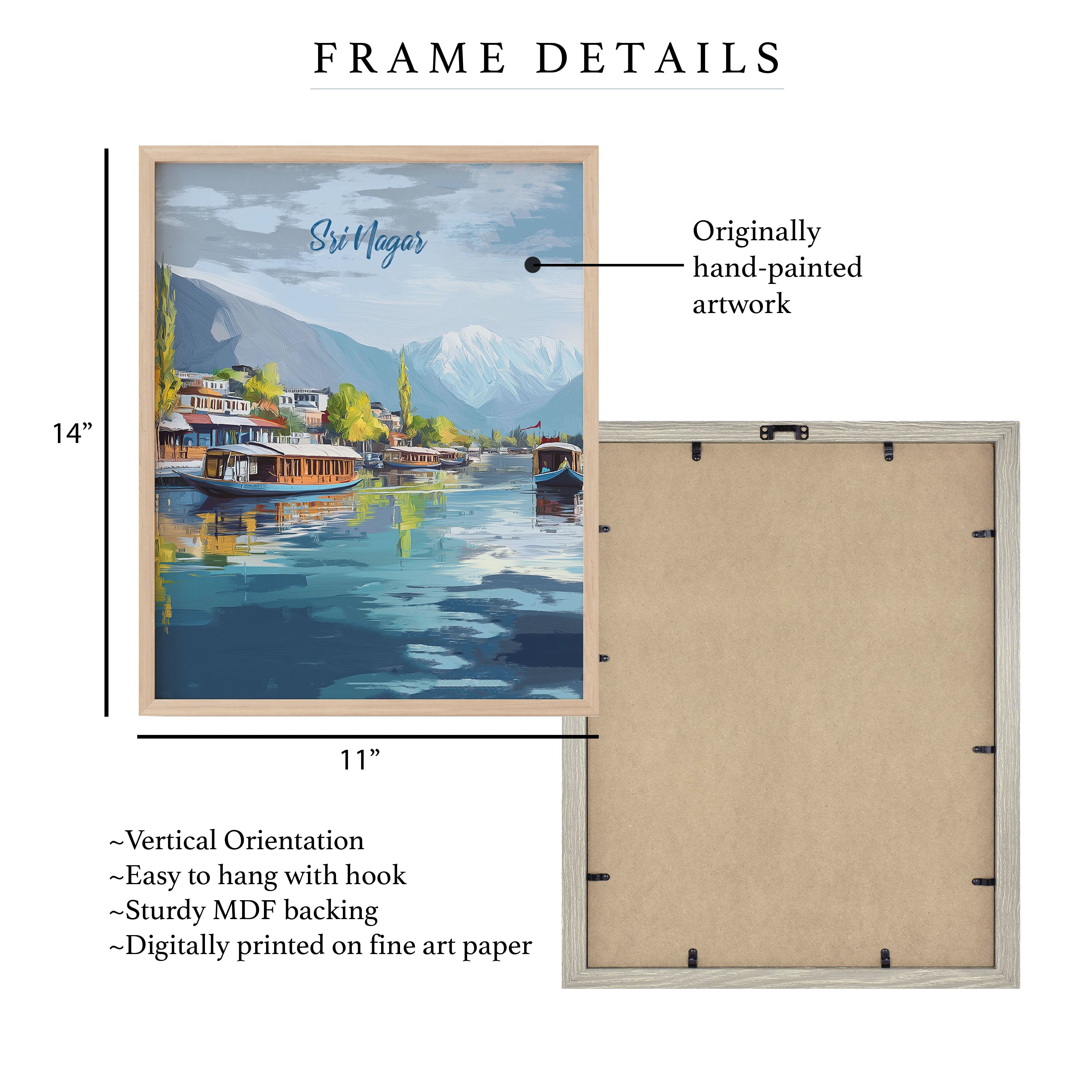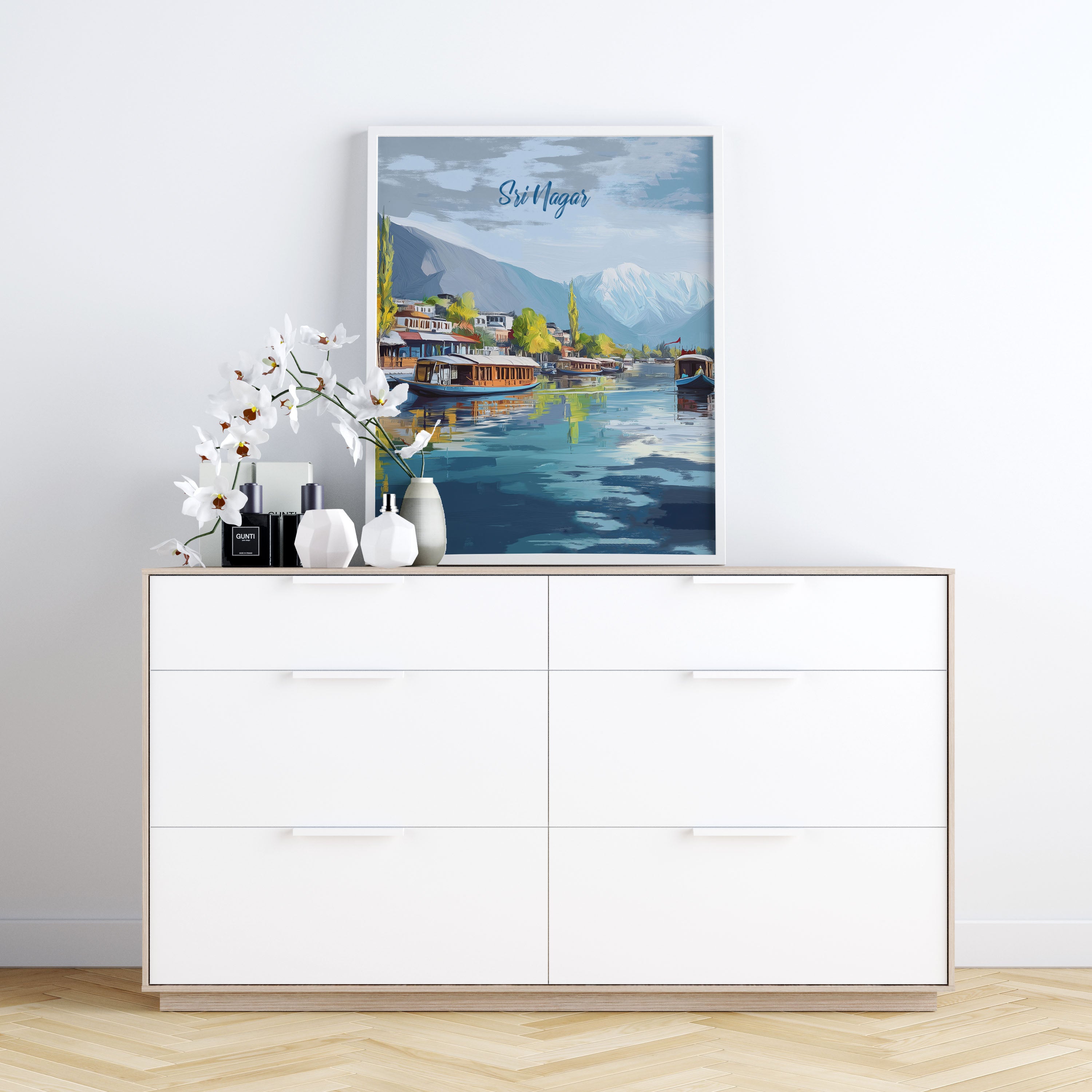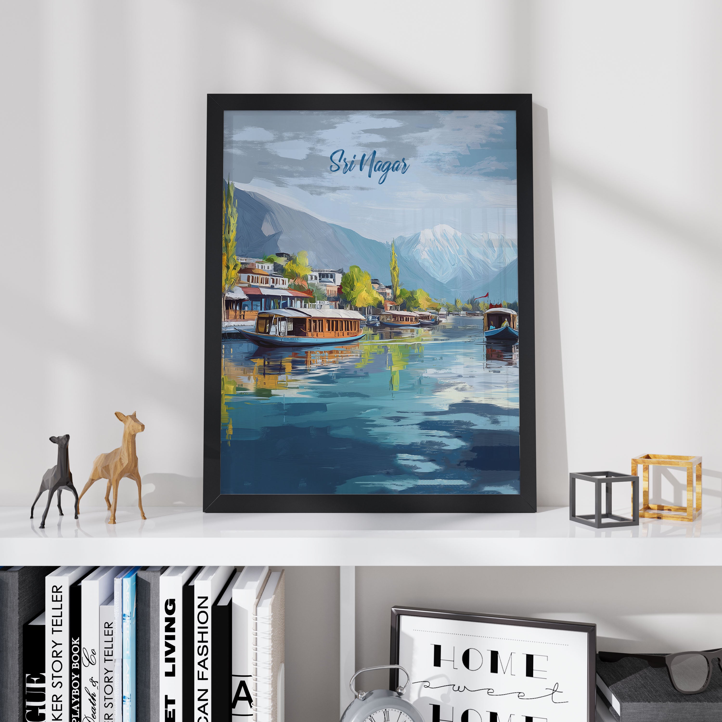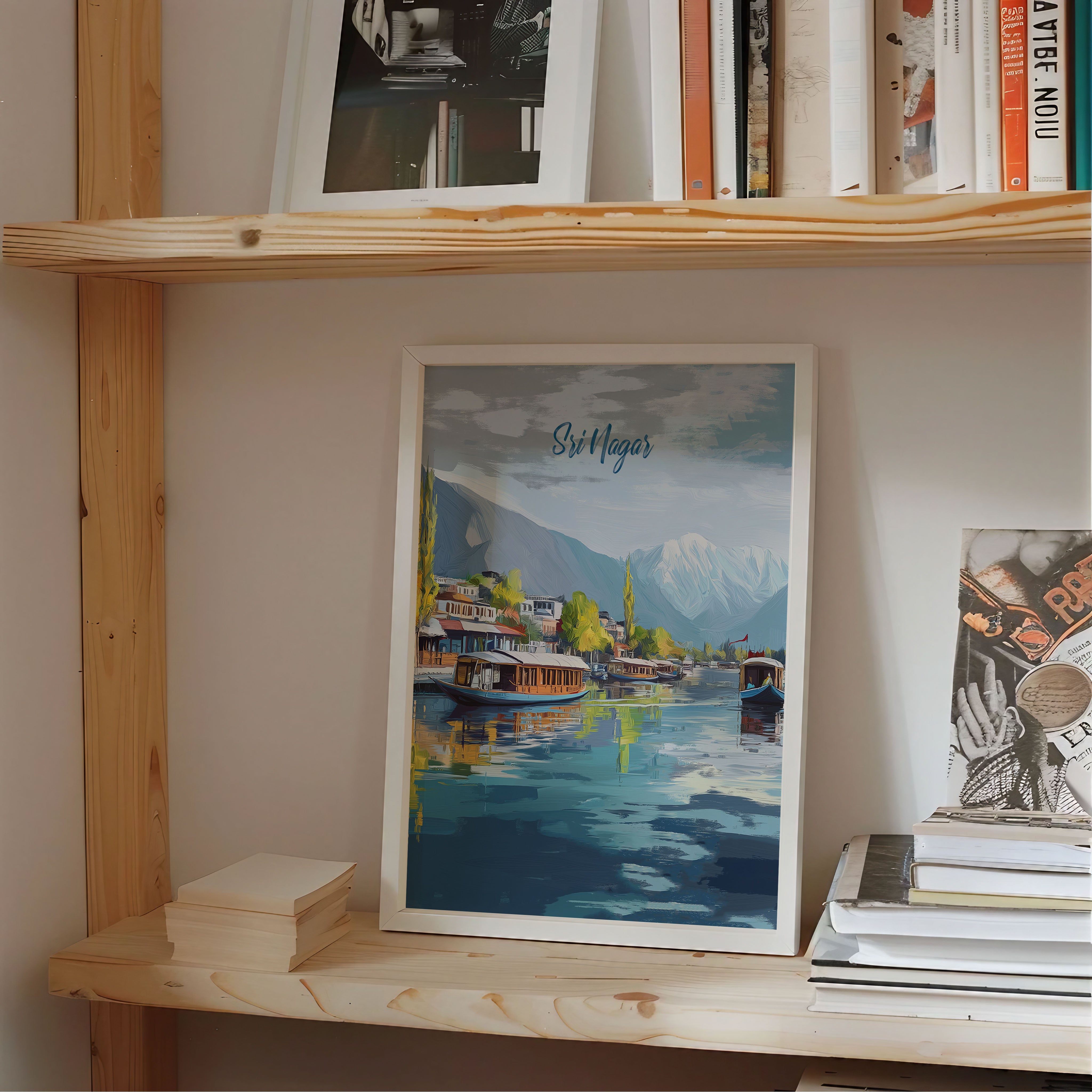 This serene illustration titled "Srinagar" beautifully captures the tranquil beauty of Kashmir's famous Dal Lake. The artwork showcases traditional wooden houseboats and Shikaras gently floating on the calm waters, reflecting the vibrant colors of the surroundings.