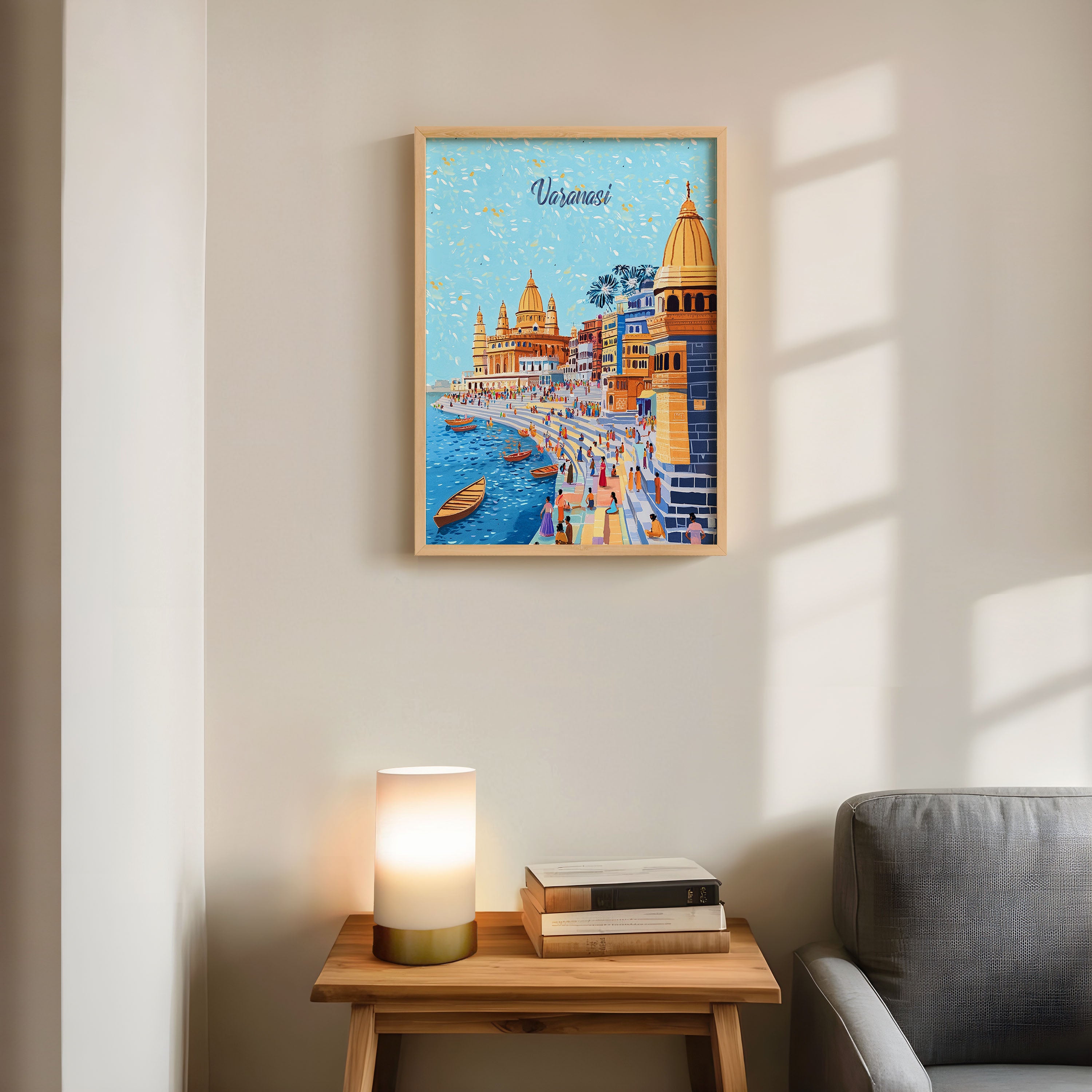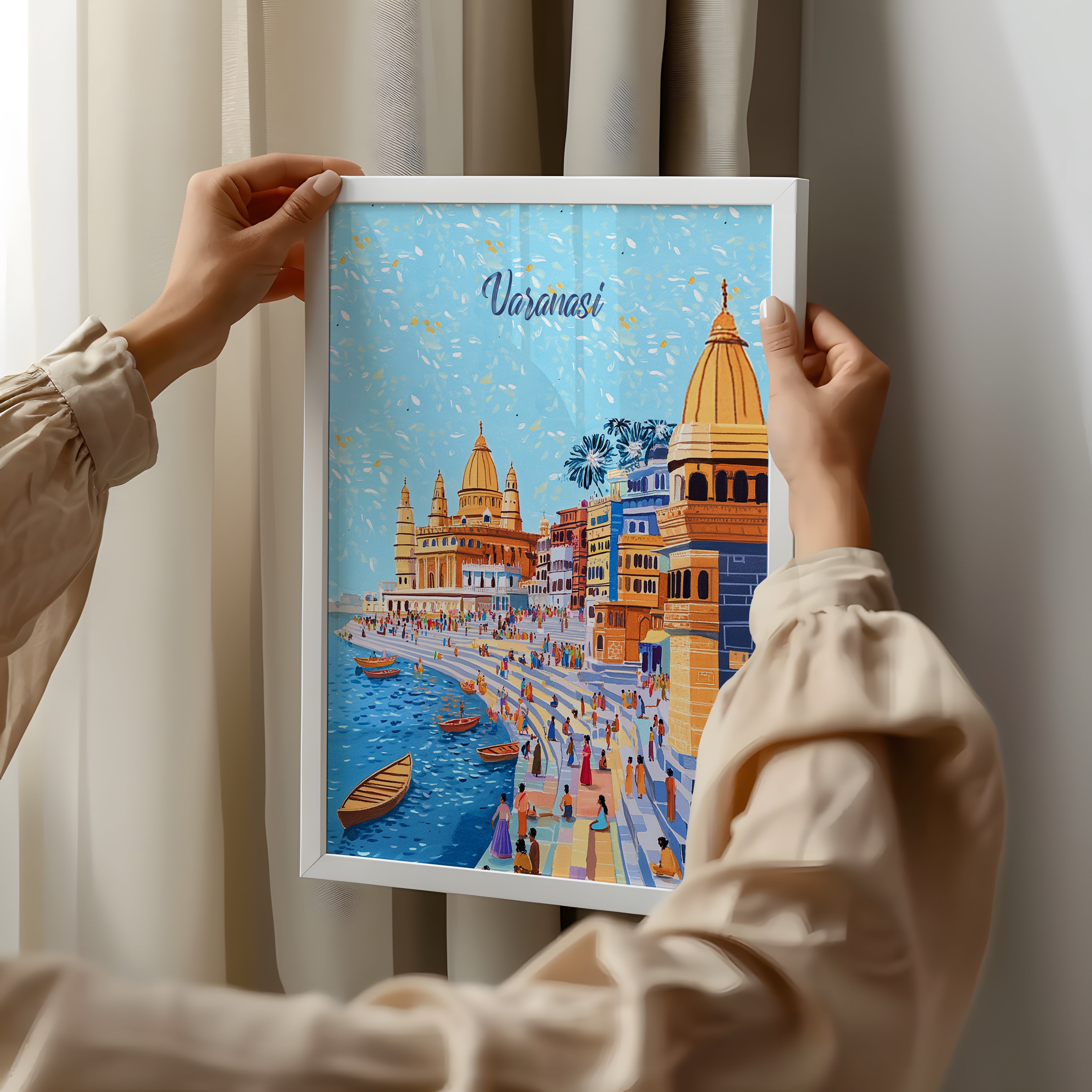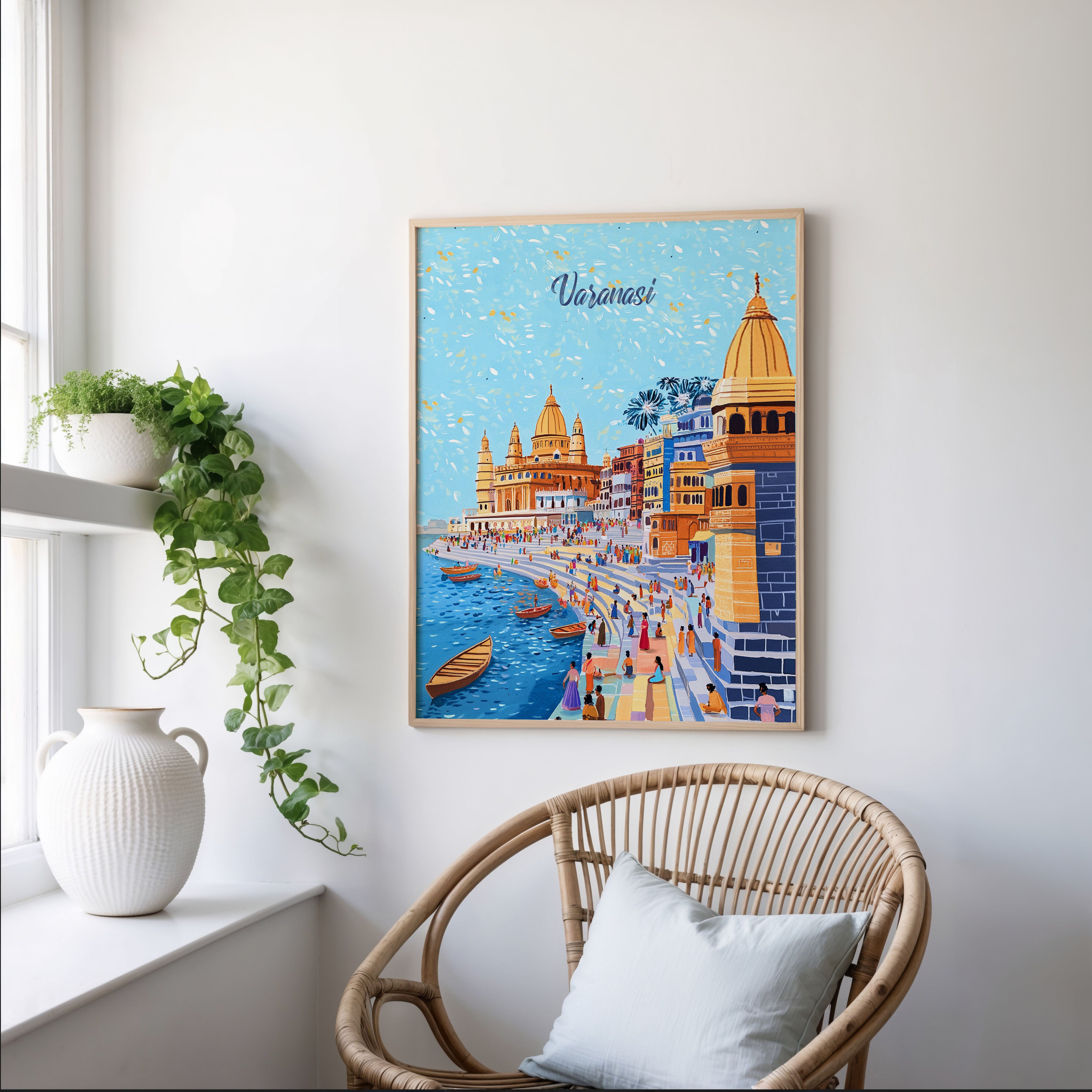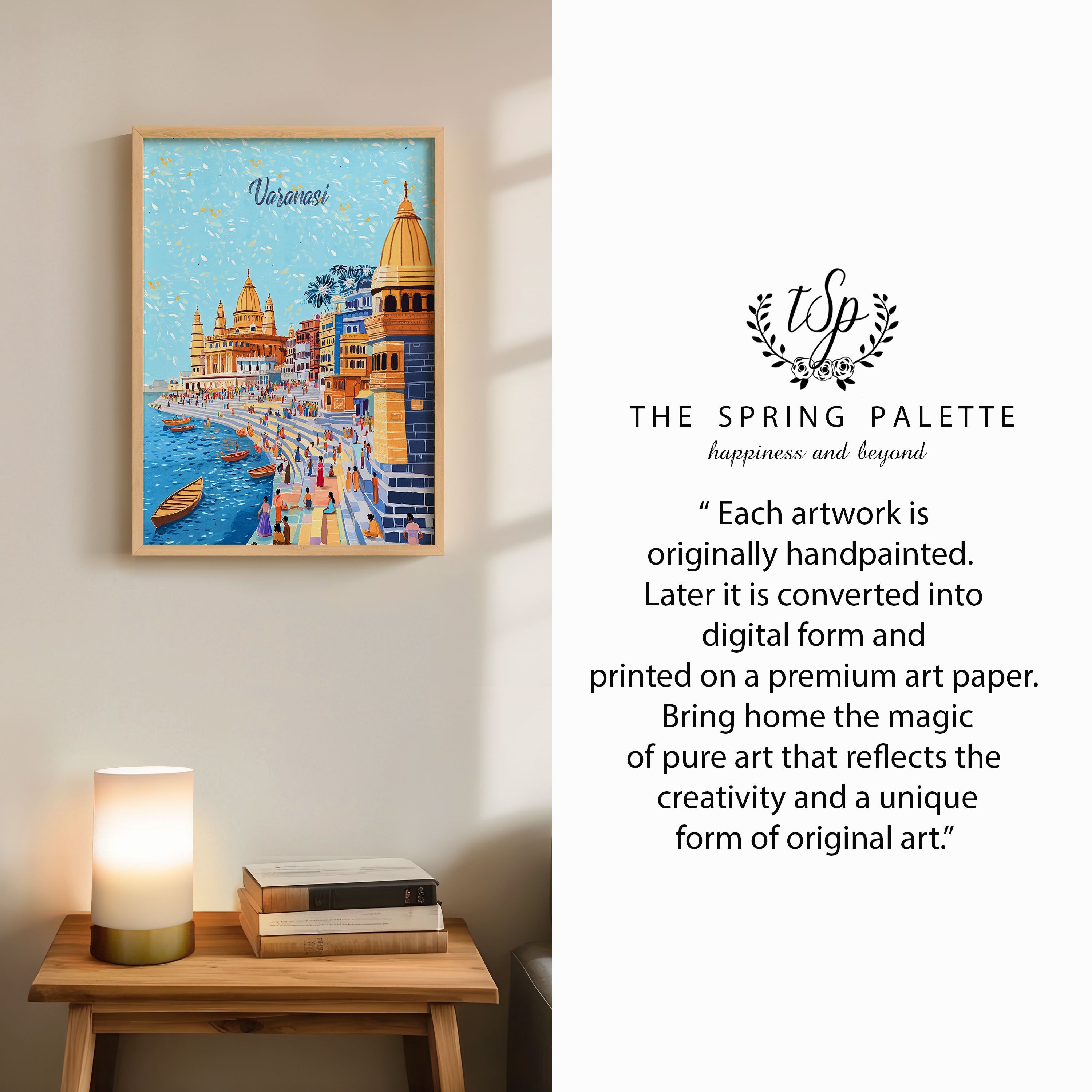 This stunning illustration titled "Varanasi" captures the vibrant essence of the ancient city along the banks of the sacred Ganges River. The artwork beautifully portrays the iconic ghats, bustling with devotees, boats floating on the serene waters, and the grandeur of the historic temples. The bright hues and intricate detailing reflect the cultural richness and spiritual aura of Varanasi, making this artwork a perfect tribute to India's spiritual capital.