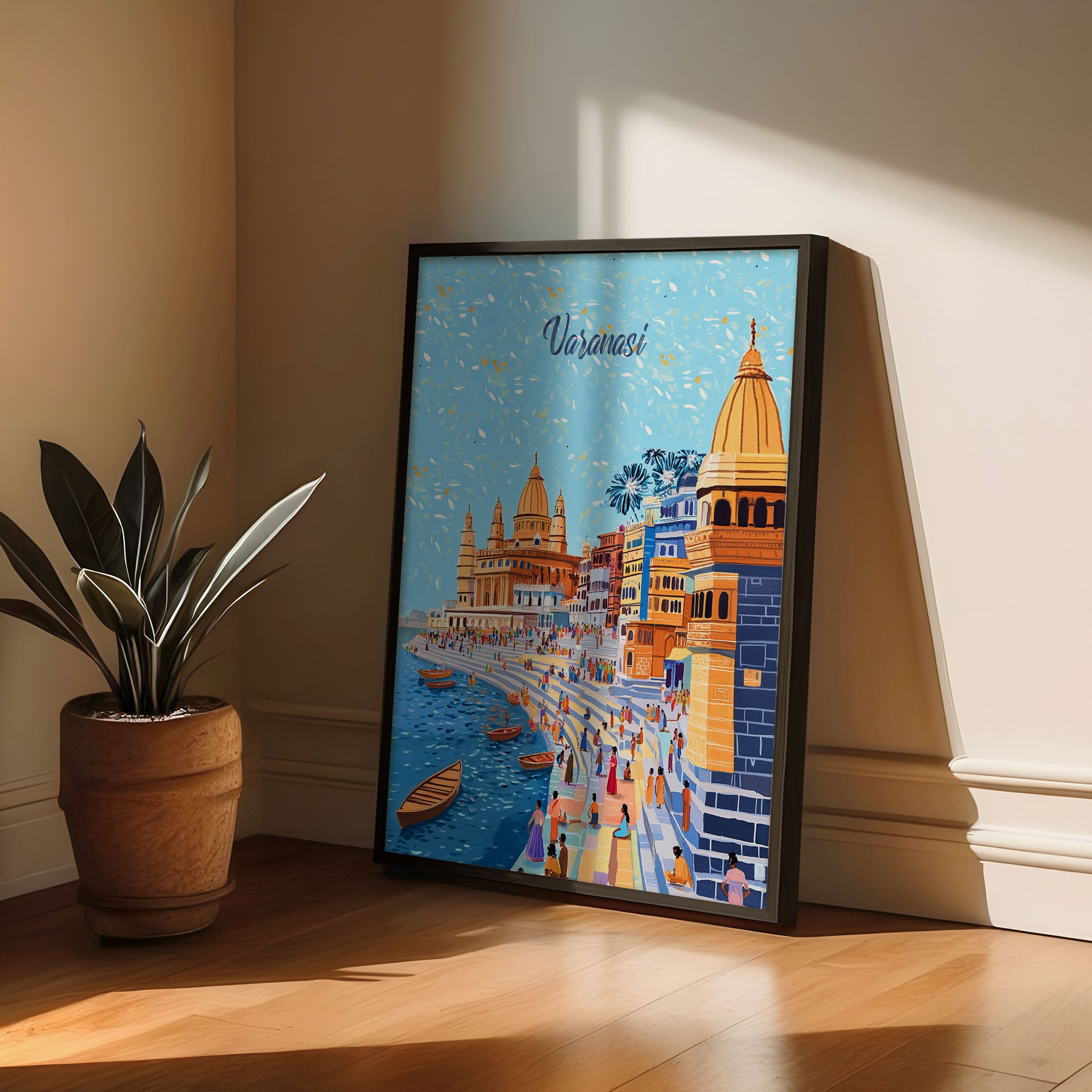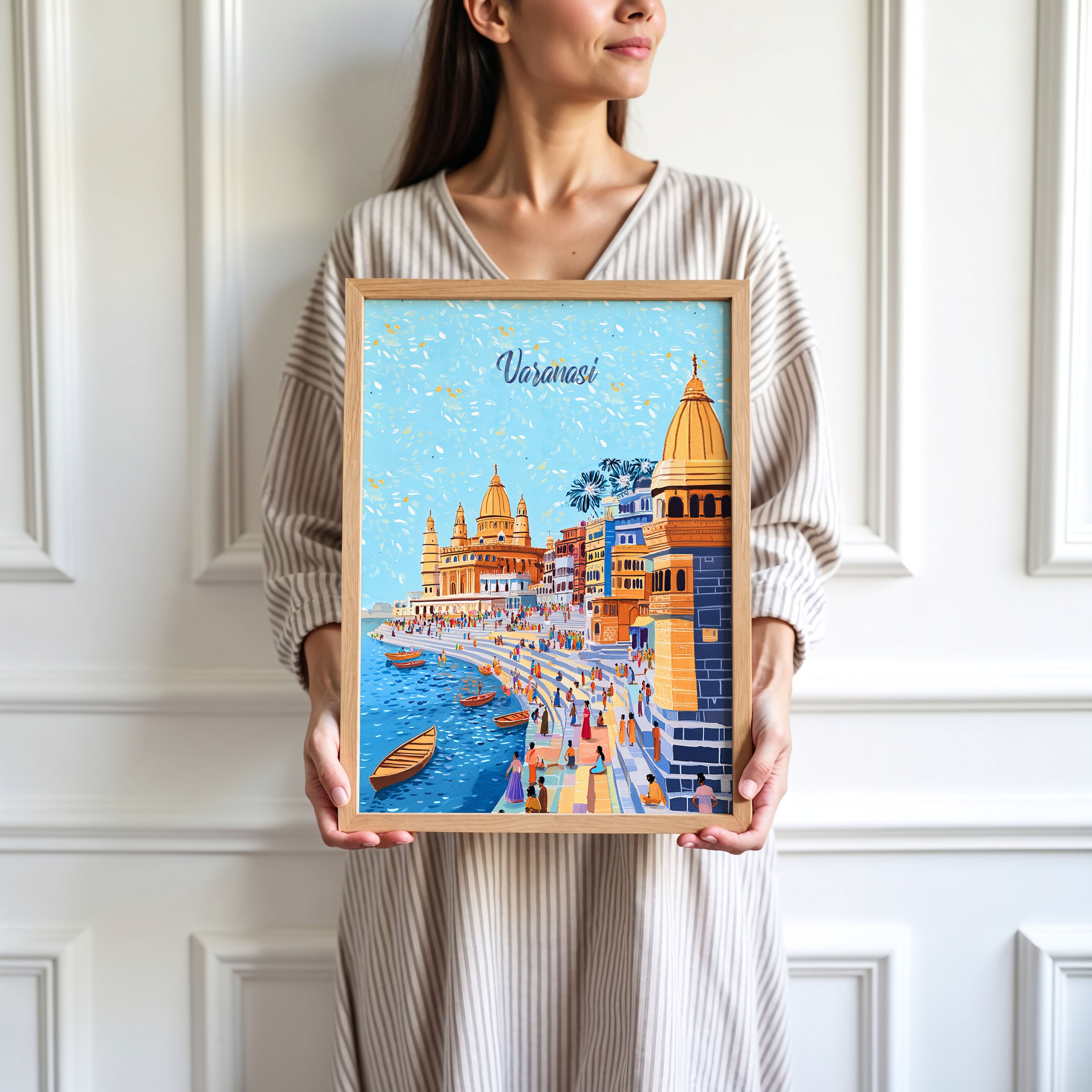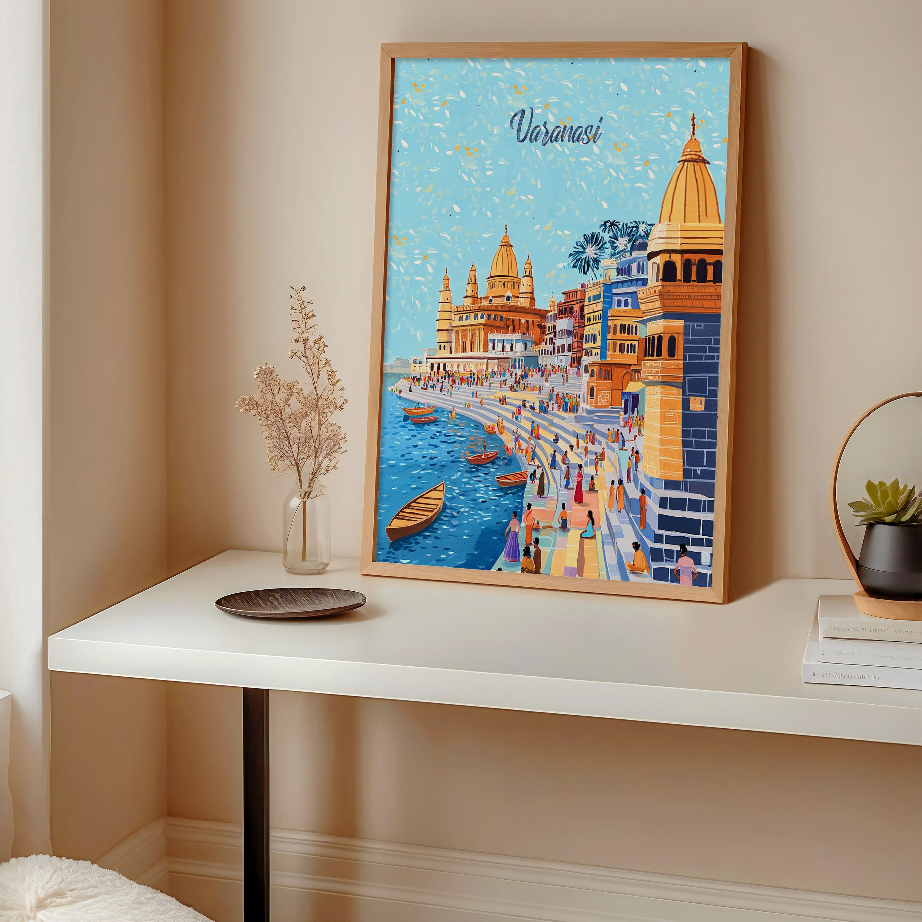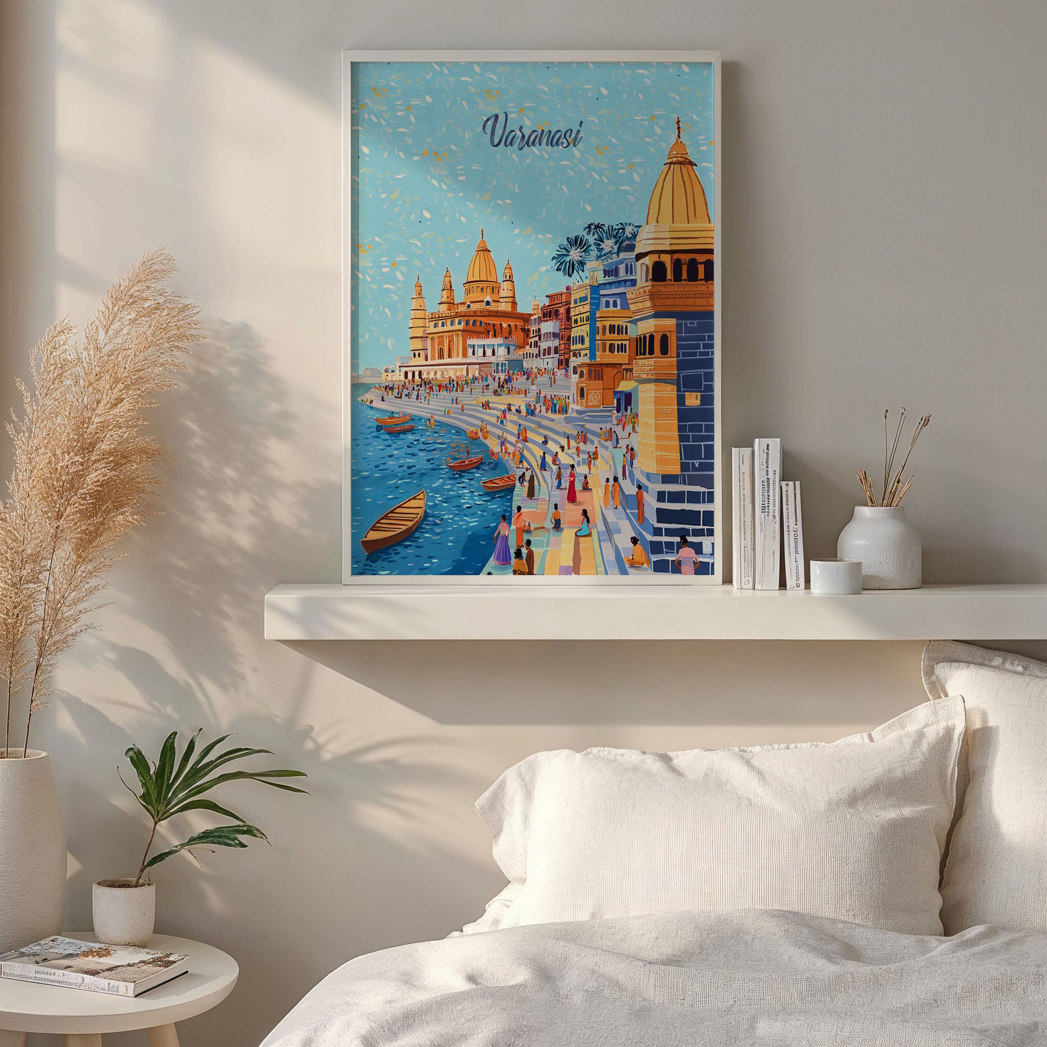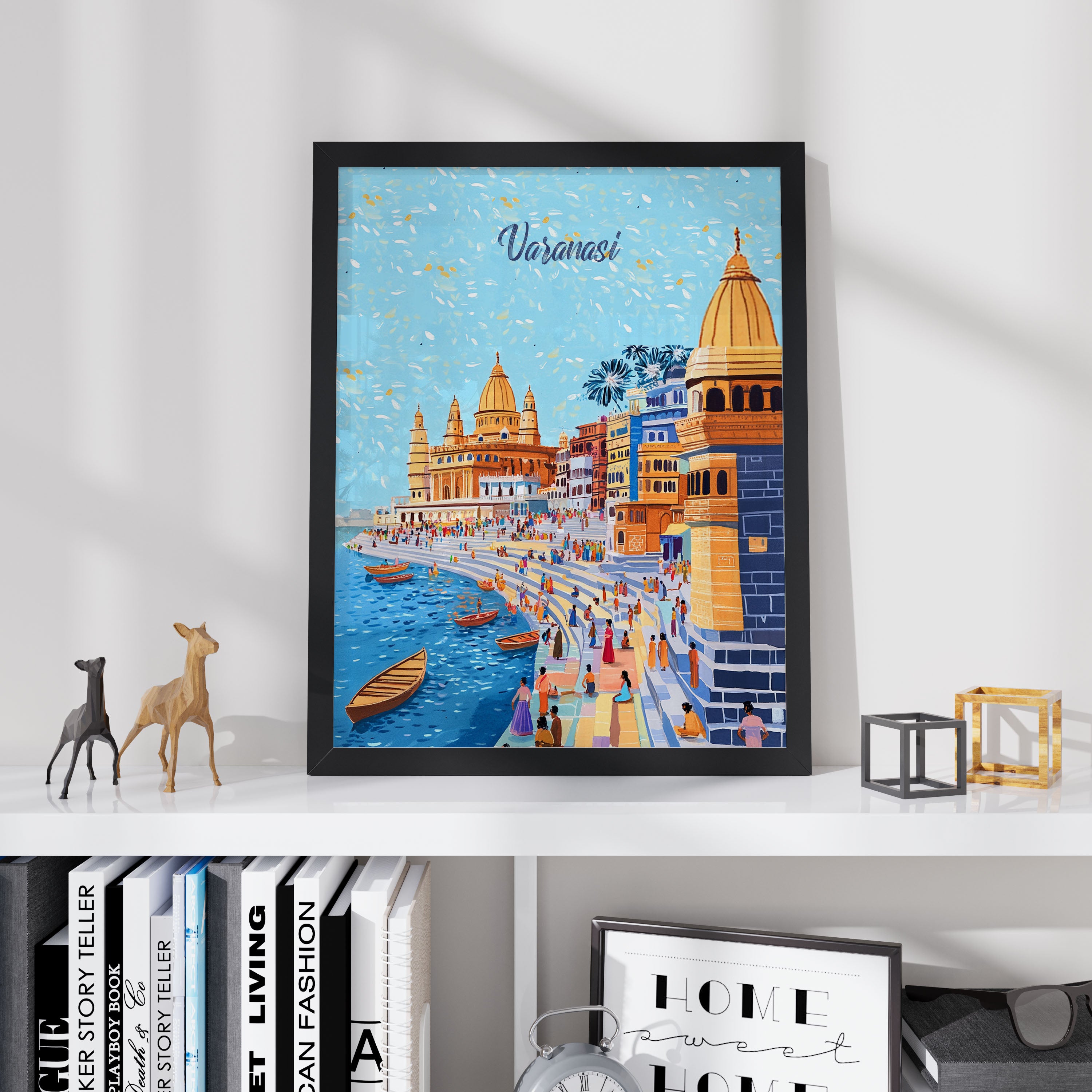 This stunning illustration titled "Varanasi" captures the vibrant essence of the ancient city along the banks of the sacred Ganges River. The artwork beautifully portrays the iconic ghats, bustling with devotees, boats floating on the serene waters, and the grandeur of the historic temples. The bright hues and intricate detailing reflect the cultural richness and spiritual aura of Varanasi, making this artwork a perfect tribute to India's spiritual capital.