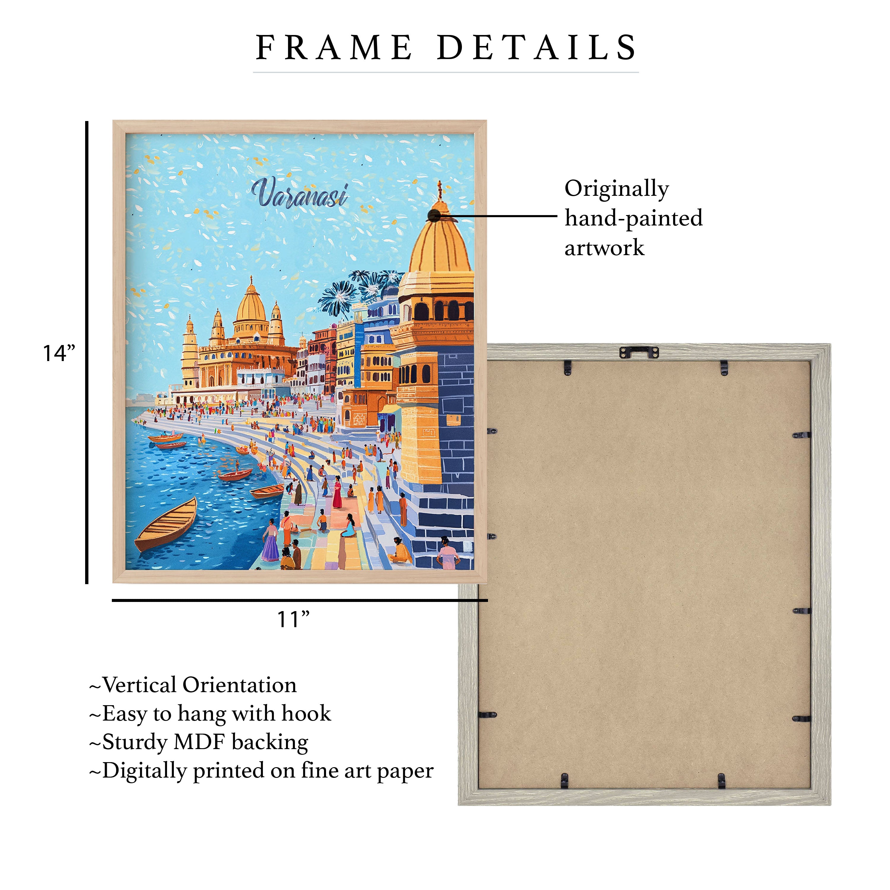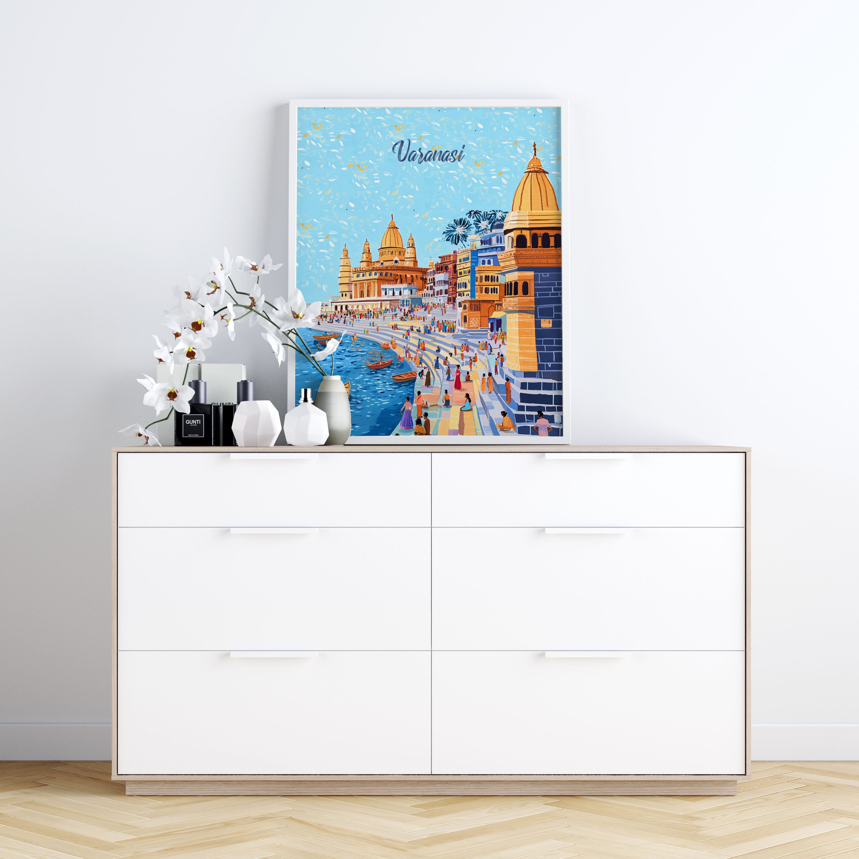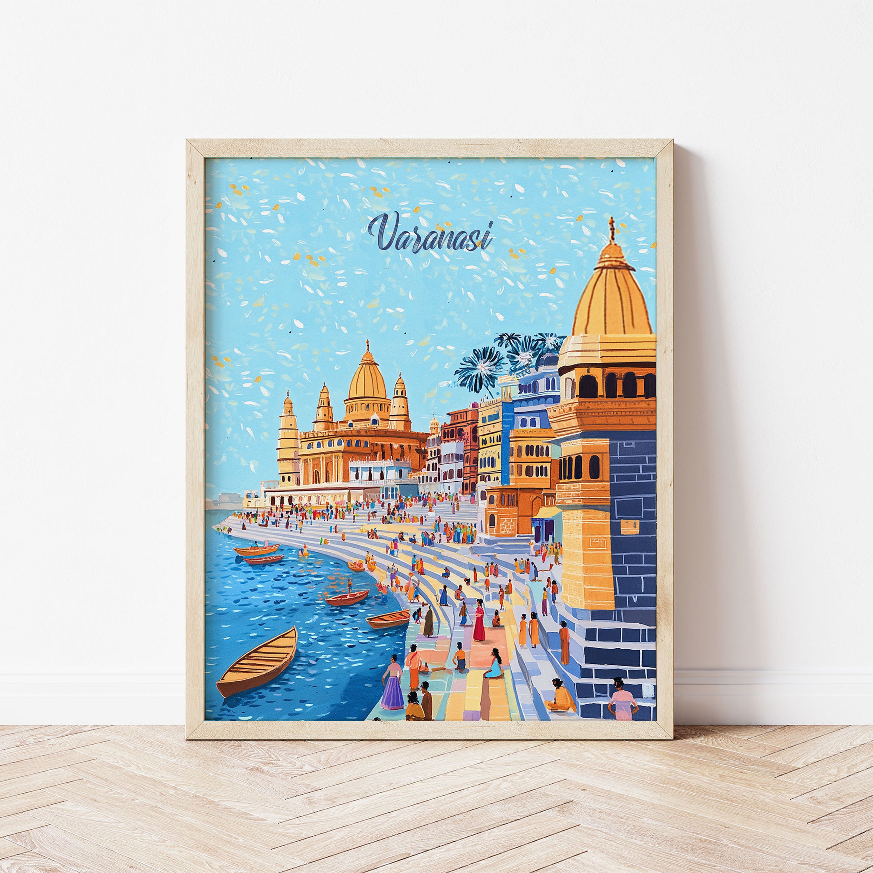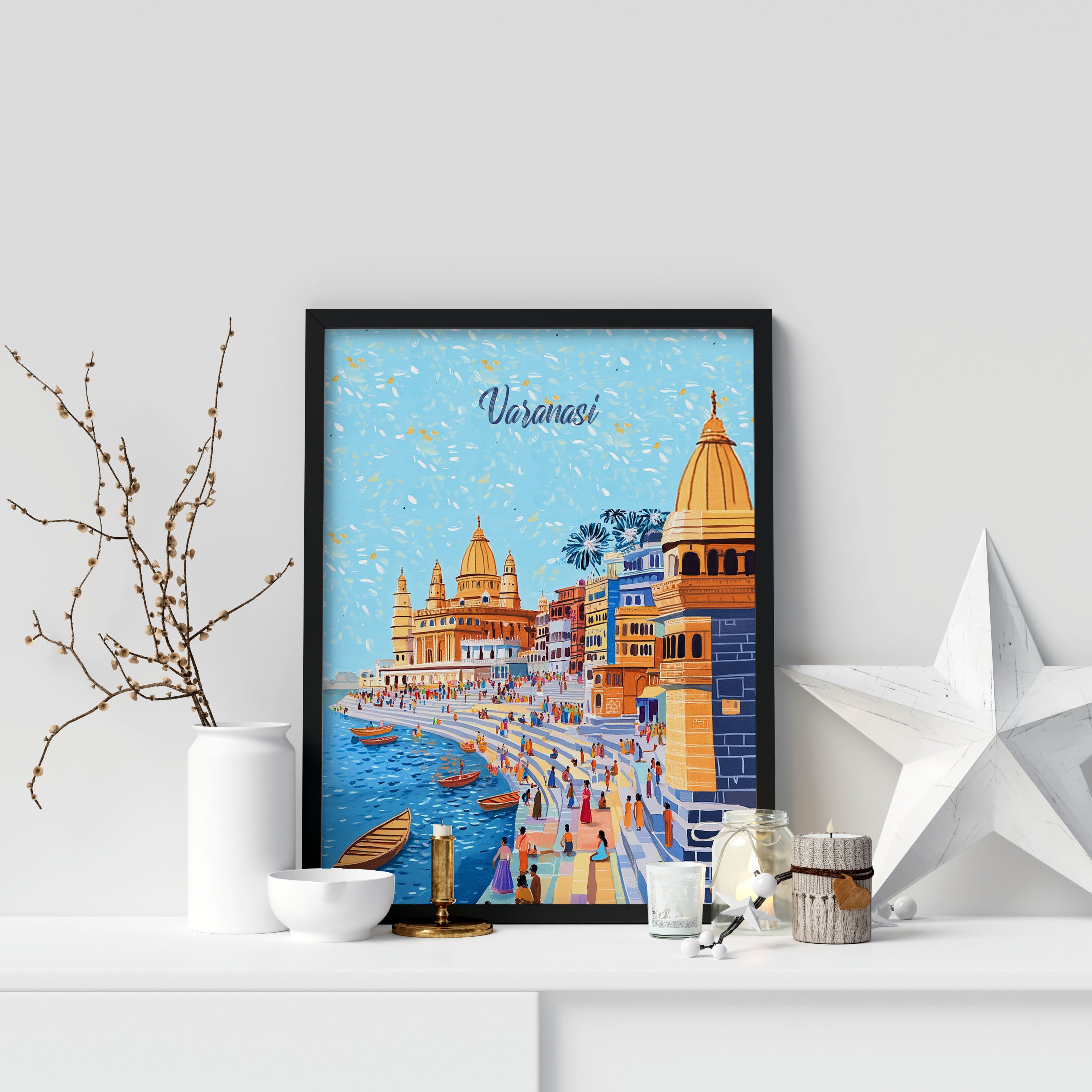 This stunning illustration titled "Varanasi" captures the vibrant essence of the ancient city along the banks of the sacred Ganges River. The artwork beautifully portrays the iconic ghats, bustling with devotees, boats floating on the serene waters, and the grandeur of the historic temples. The bright hues and intricate detailing reflect the cultural richness and spiritual aura of Varanasi, making this artwork a perfect tribute to India's spiritual capital.