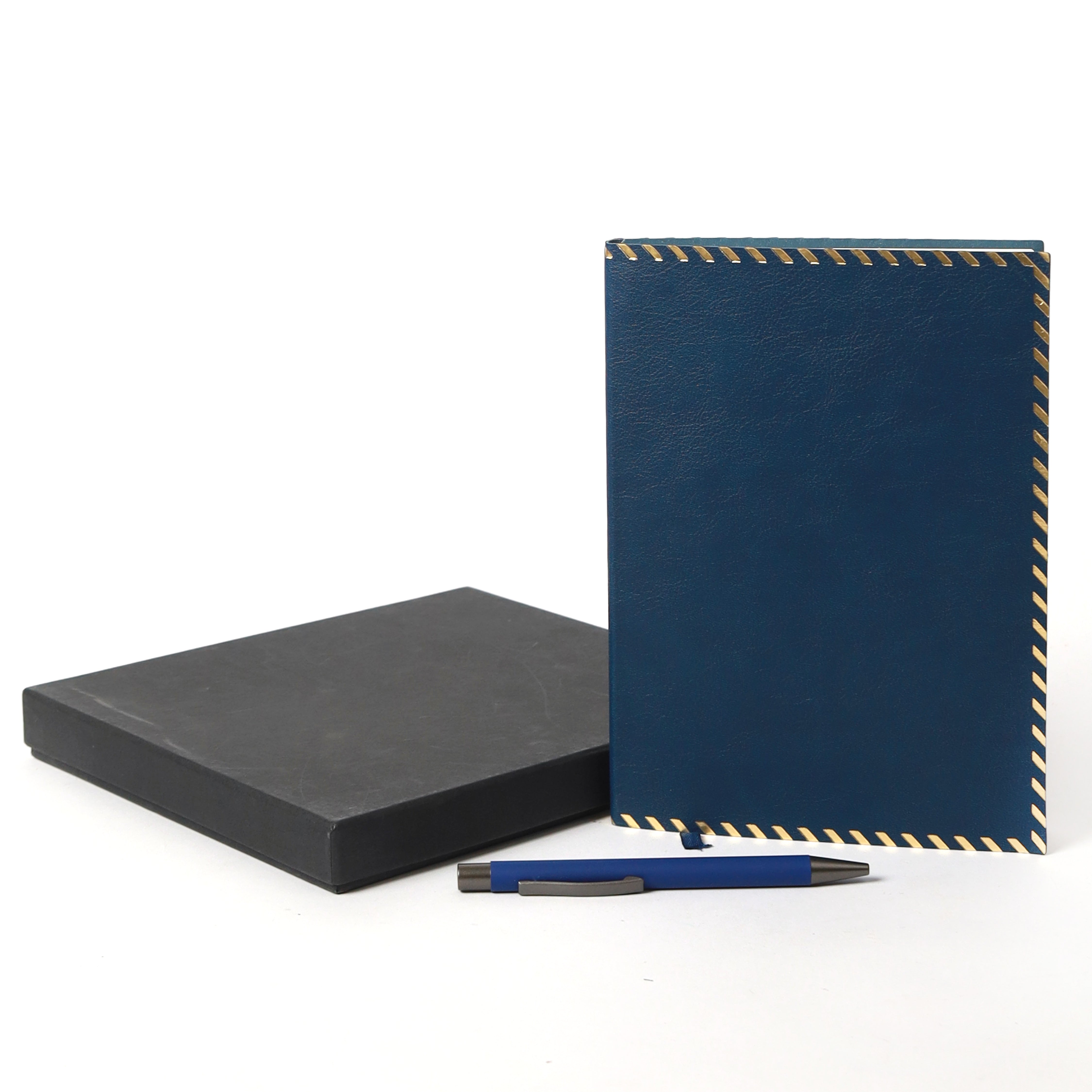 This elegant corporate gift set features a premium blue leatherette notebook with chic silver diagonal accents, paired with a stylish blue ballpoint pen. Neatly packed in a black presentation box, it’s perfect for meetings, journaling, or corporate events—making it an ideal giveaway for conferences, trainings, and client outreach.This set includes:
