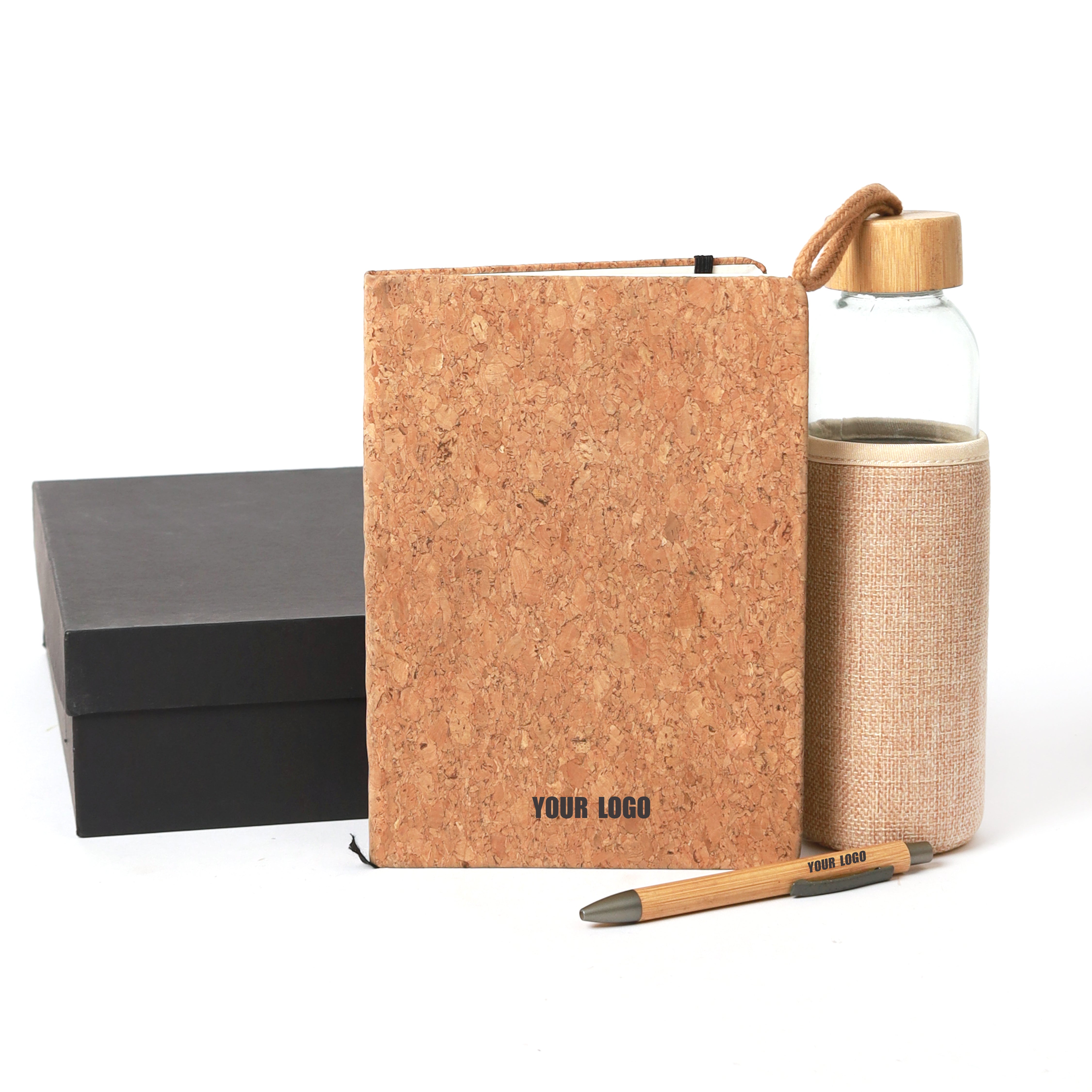 Thoughtfully designed for the conscious professional, this eco-friendly corporate gift set blends style with sustainability. Featuring a cork-finish notebook, a bamboo-accented eco pen, and a sleek glass bottle with a fabric sleeve, each item in this set embodies minimalism and mindful living. Neatly packed in a matte black box, it’s the perfect way to show appreciation while promoting a greener planet. This set includes: