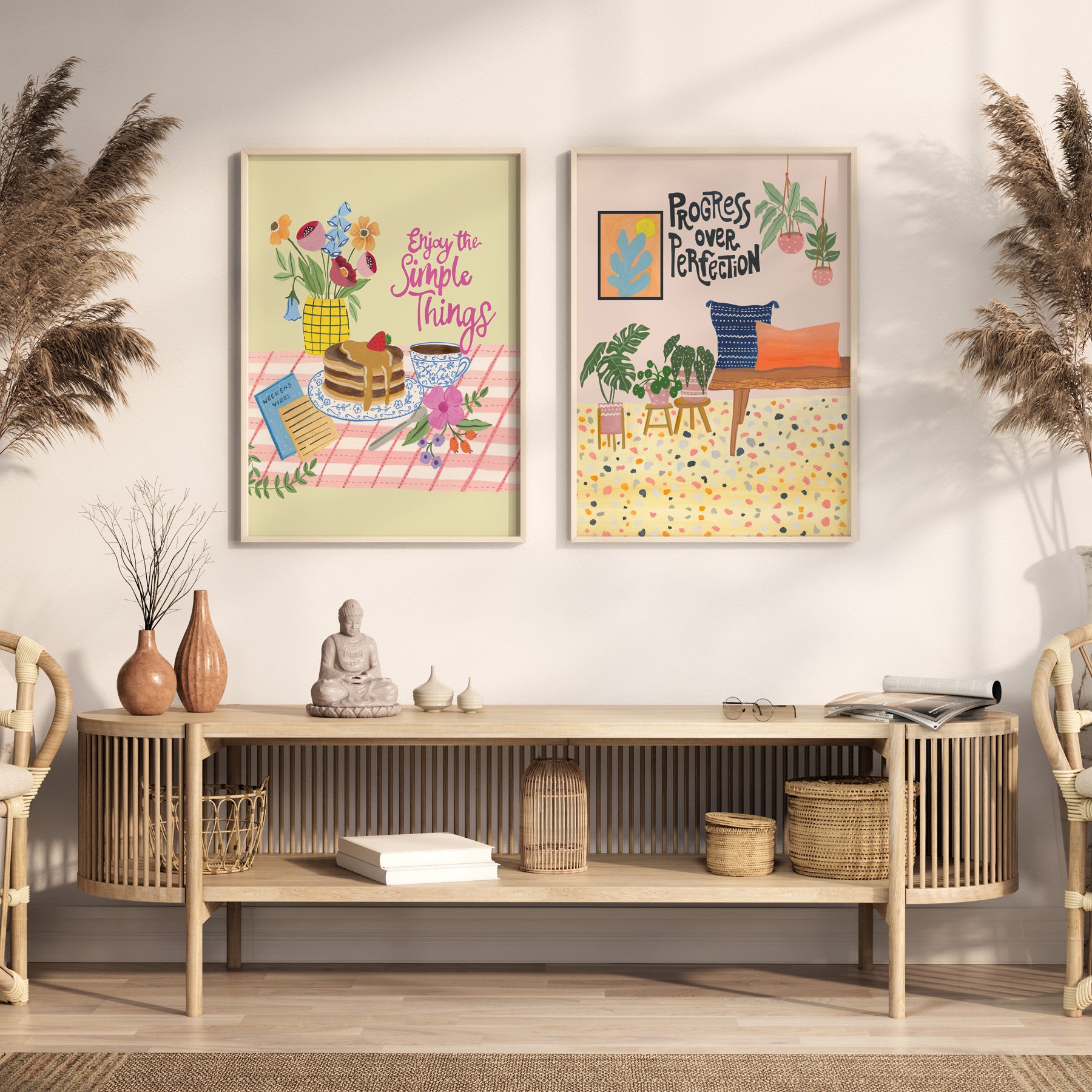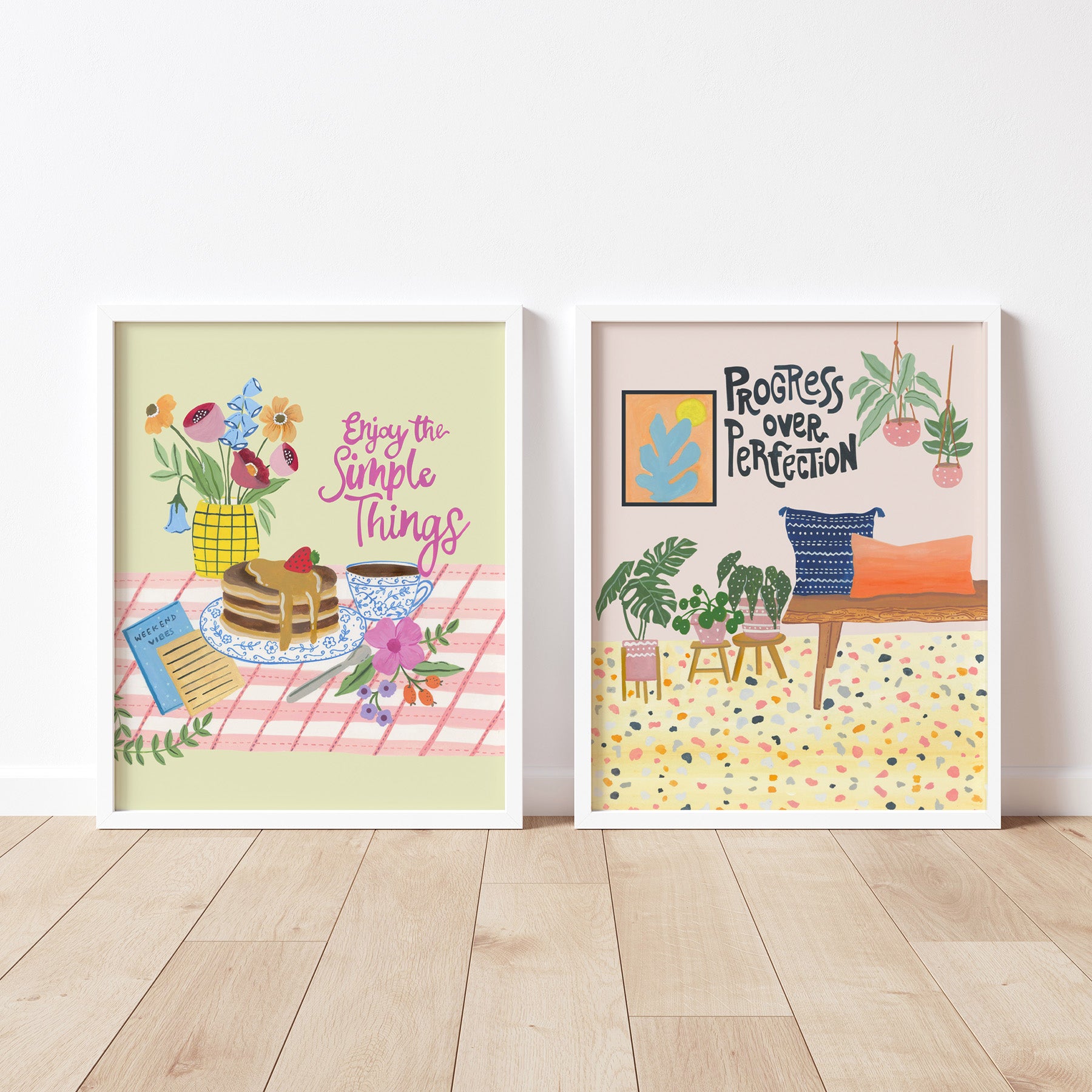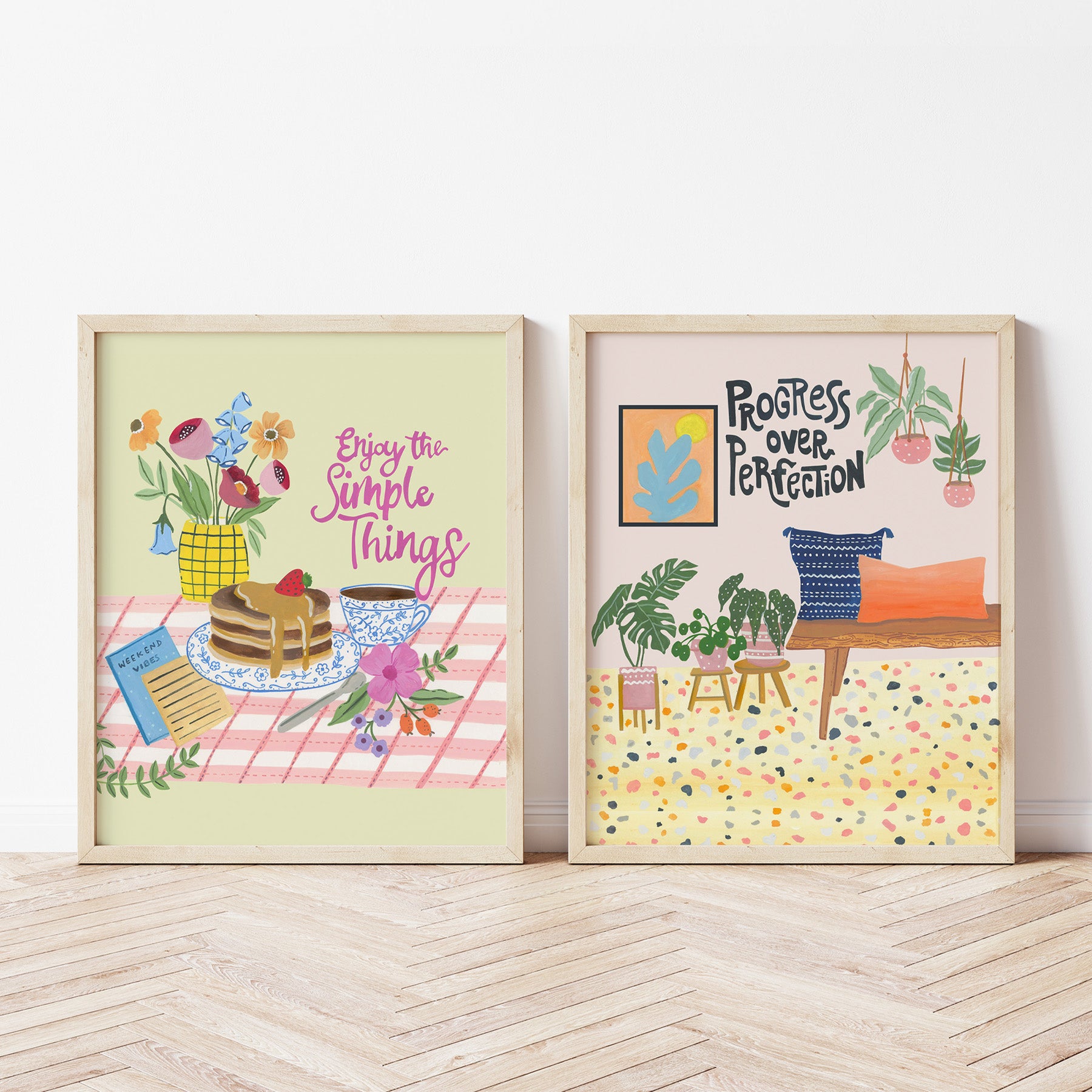 This cheerful art print set brings warmth, colour, and gentle positivity to any living space. Featuring playful florals, cozy home details, and uplifting messages, the artworks celebrate slow living and everyday joy. The soft pastel palette and whimsical illustrations make this set perfect for living rooms, reading corners, studios, or bedrooms adding a light, happy, lived-in feel to your walls.