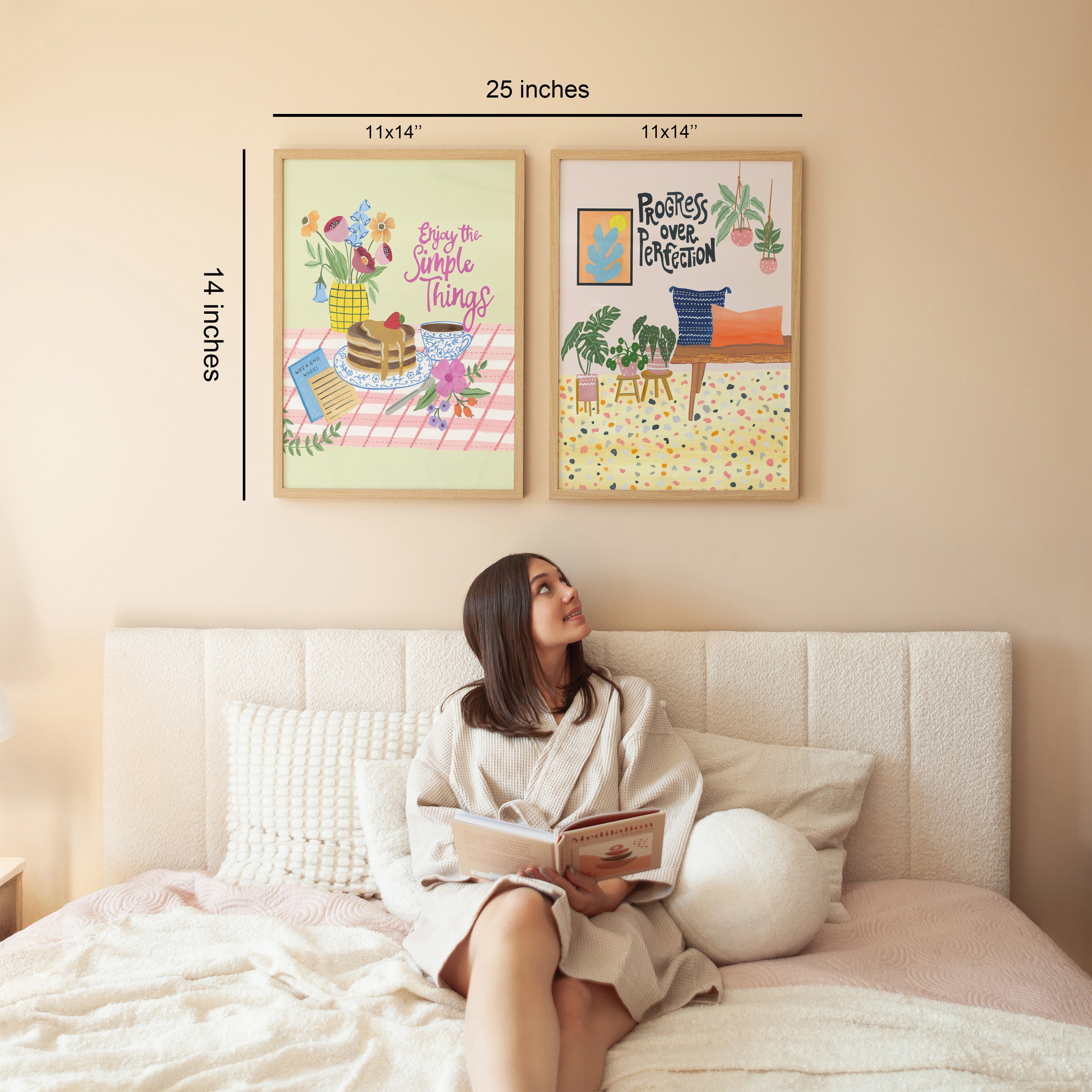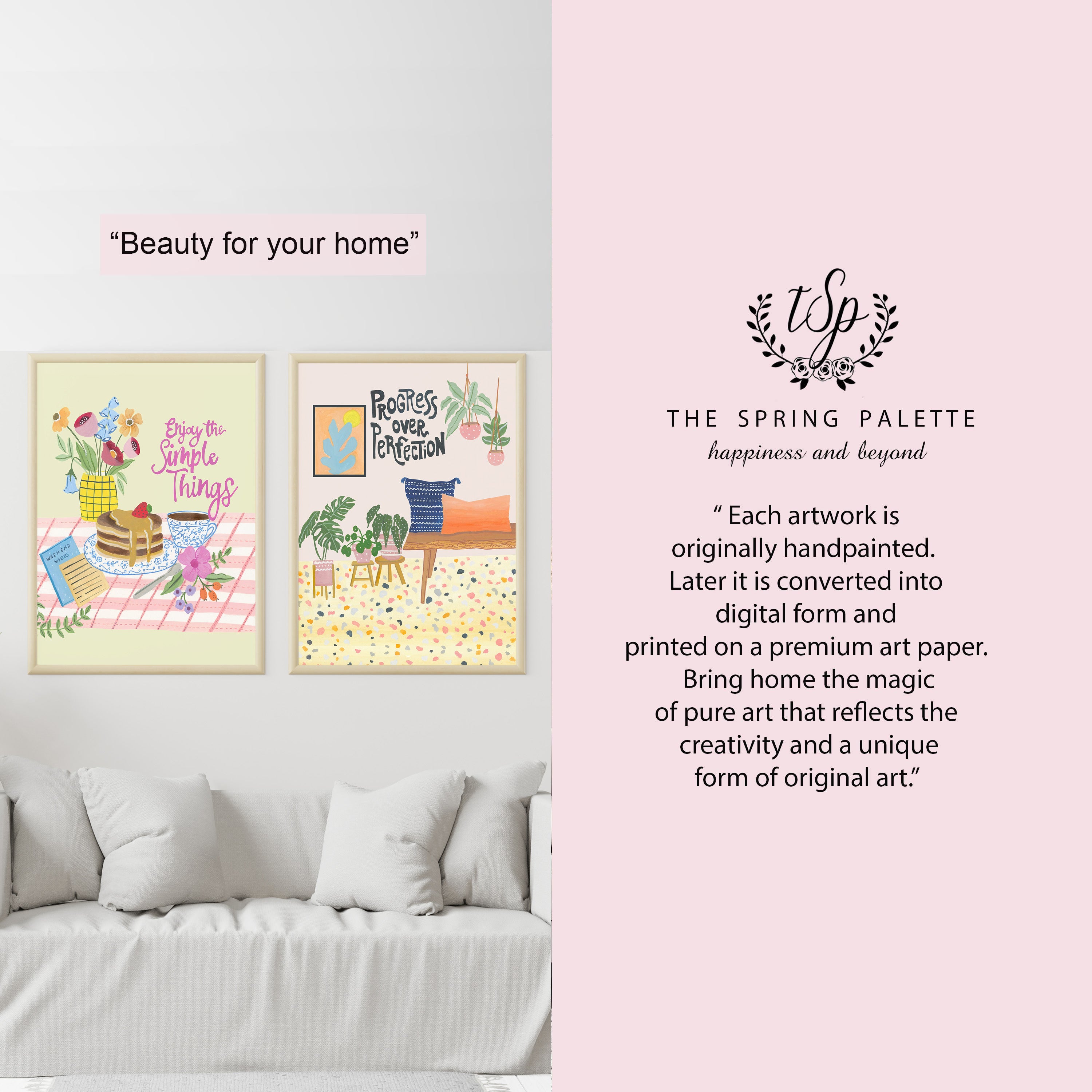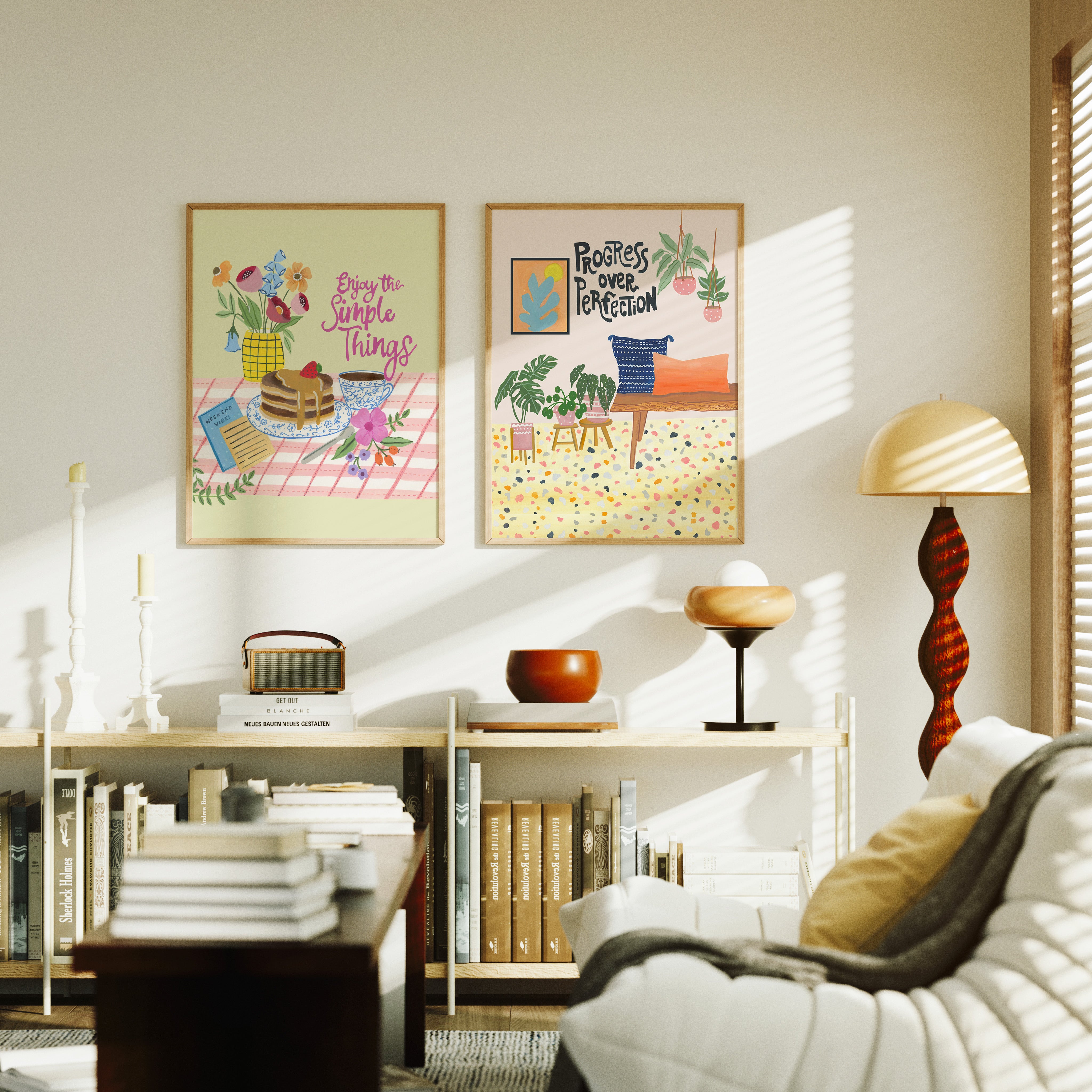 This cheerful art print set brings warmth, colour, and gentle positivity to any living space. Featuring playful florals, cozy home details, and uplifting messages, the artworks celebrate slow living and everyday joy. The soft pastel palette and whimsical illustrations make this set perfect for living rooms, reading corners, studios, or bedrooms adding a light, happy, lived-in feel to your walls.