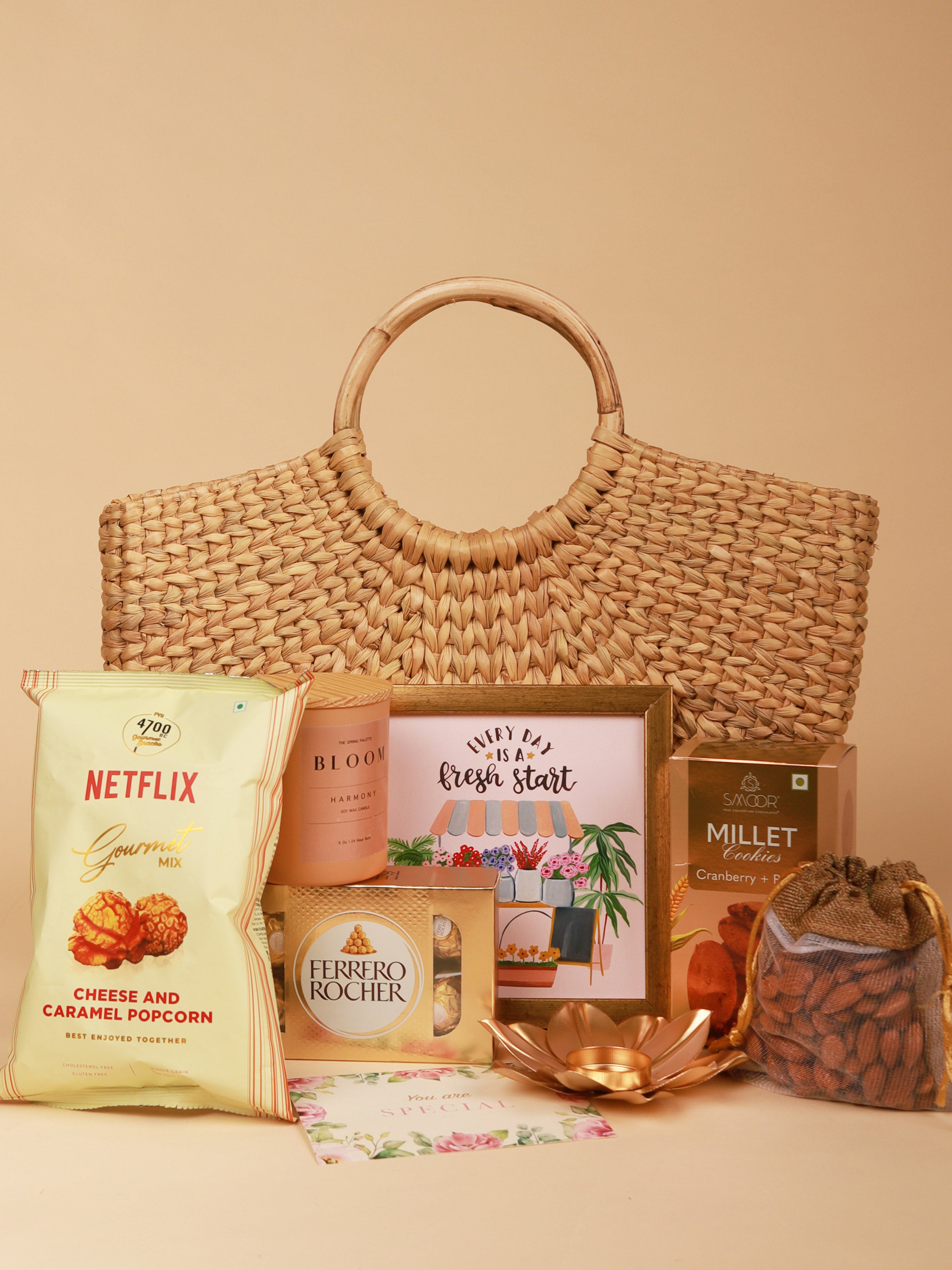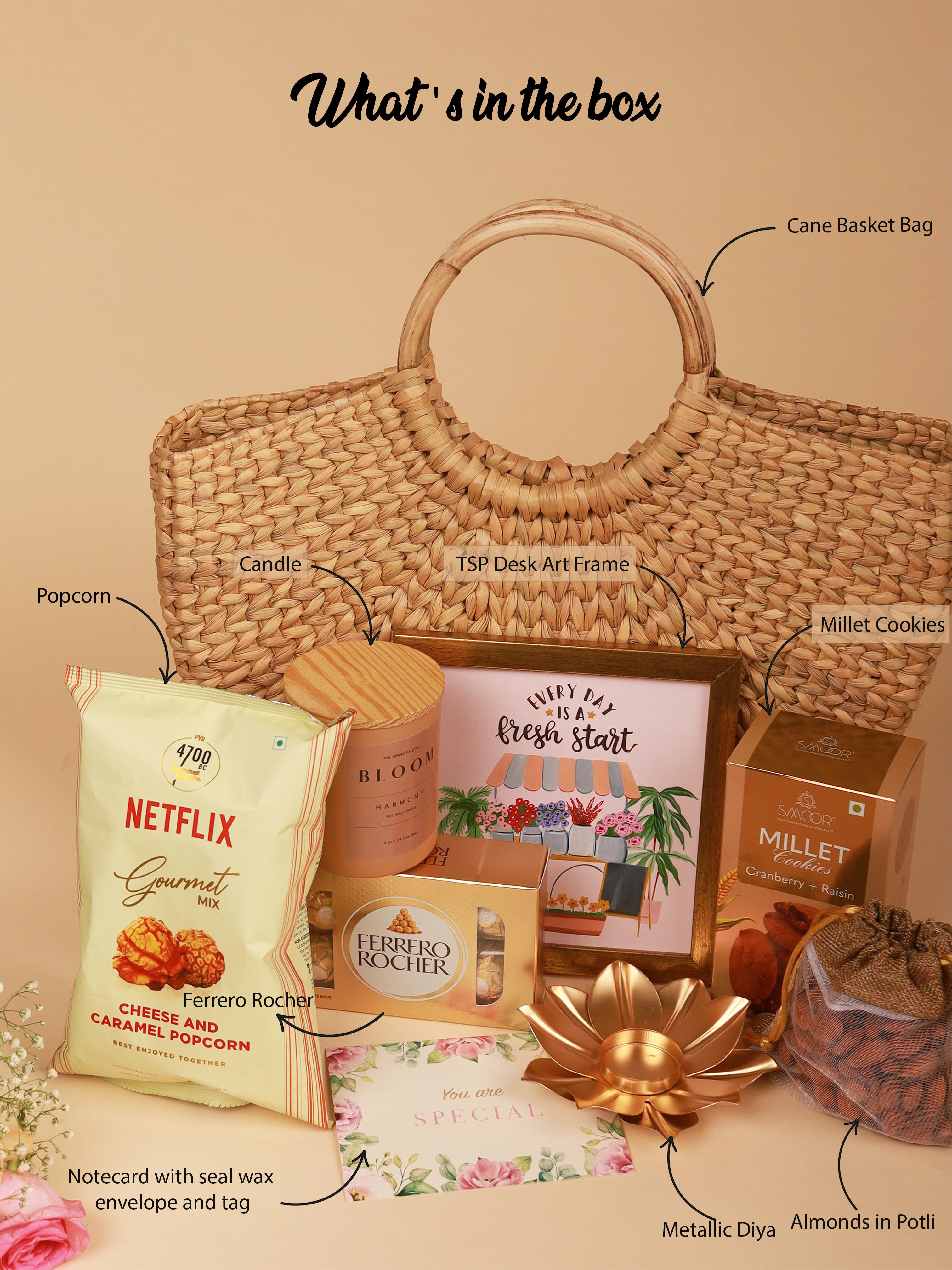 Celebrate the spirit of Diwali with The Spring Palette's exquisite gift hampers, a perfect fusion of tradition, elegance, and festive joy. Each hamper is thoughtfully curated to capture the essence of the festival, featuring a luxurious assortment of gourmet treats, artisanal sweets, and handpicked gifts. From fragrant candles and handcrafted diyas to indulgent chocolates and savory delights, every item is designed to enhance the warmth and festivity of the occasion. Whether for corporate gifting or personal celebrations, The Spring Palette's hampers make every Diwali moment memorable and special.