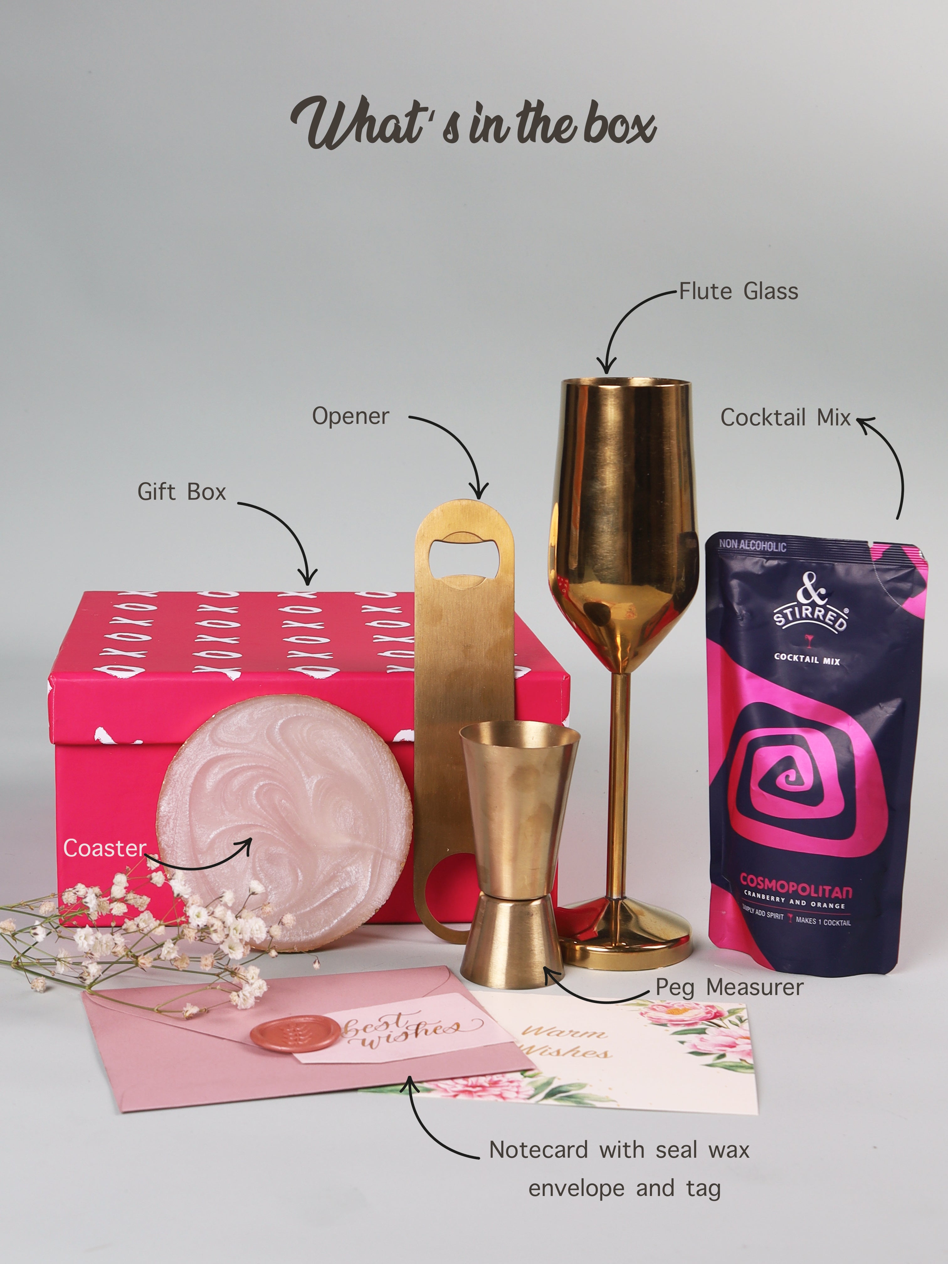 Unveil a world of elegance with our Cocktail Gift Hamper, featuring opulent flute glass and a golden-hued opener and peg measurer. Elevate every pour and celebrate in style with this luxurious hamper.