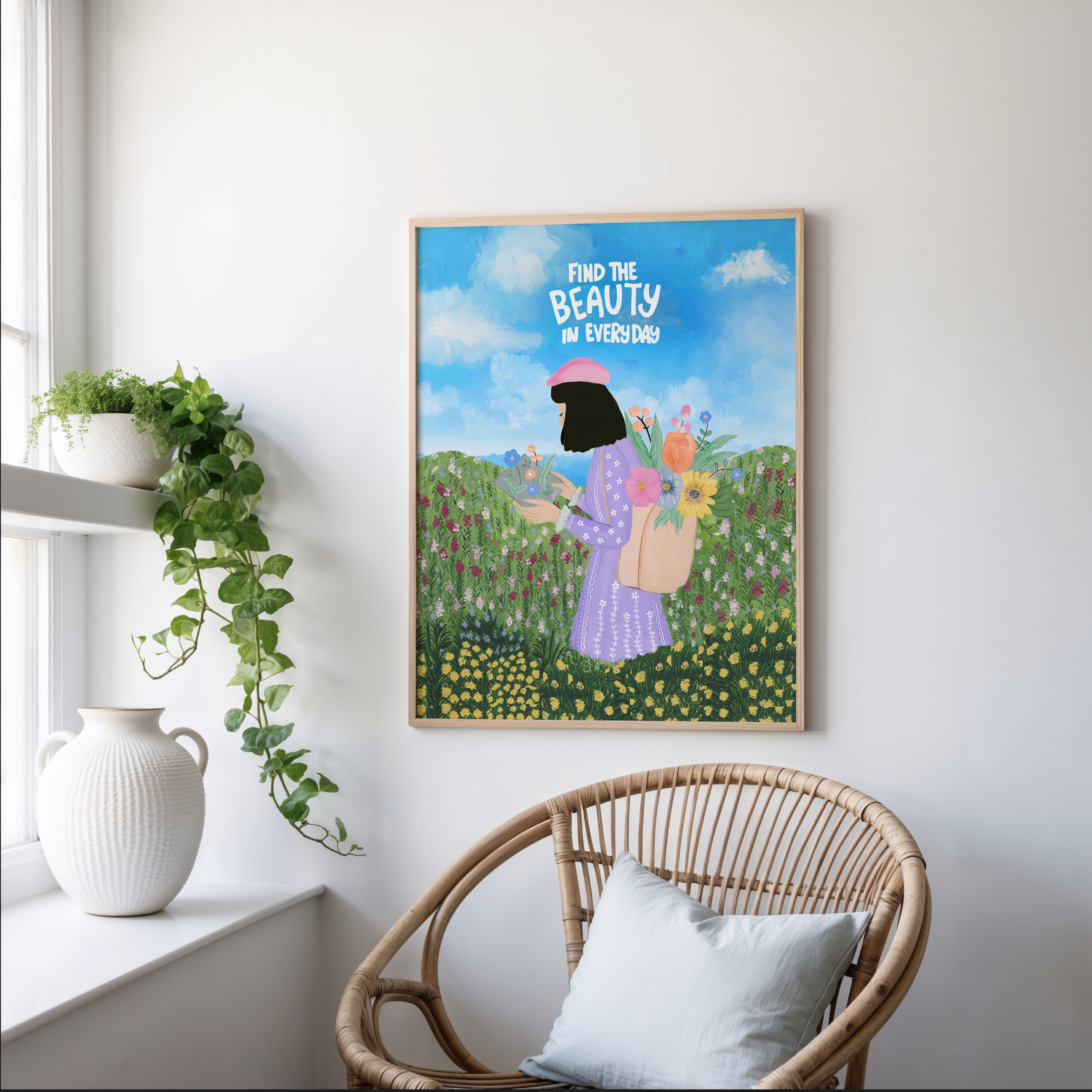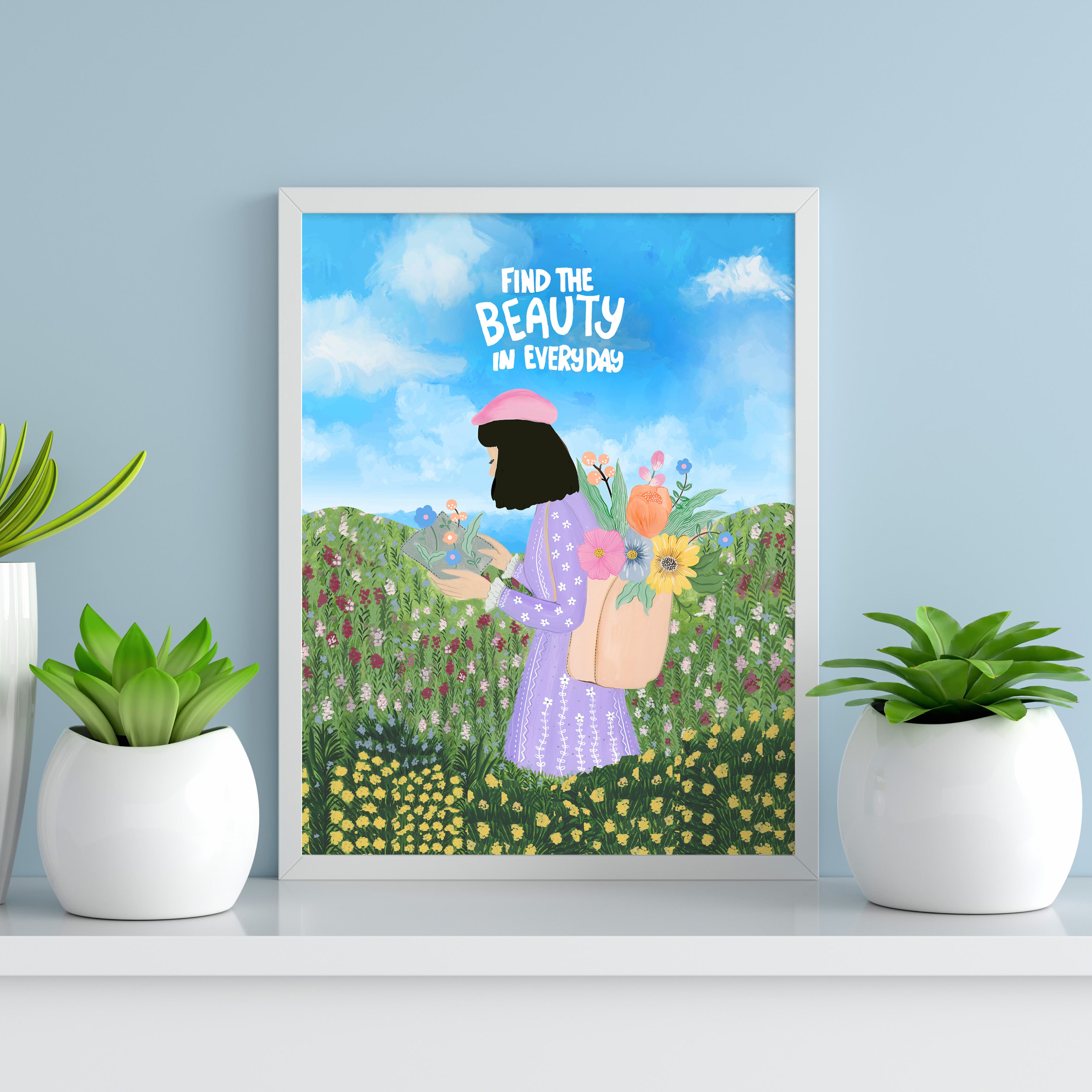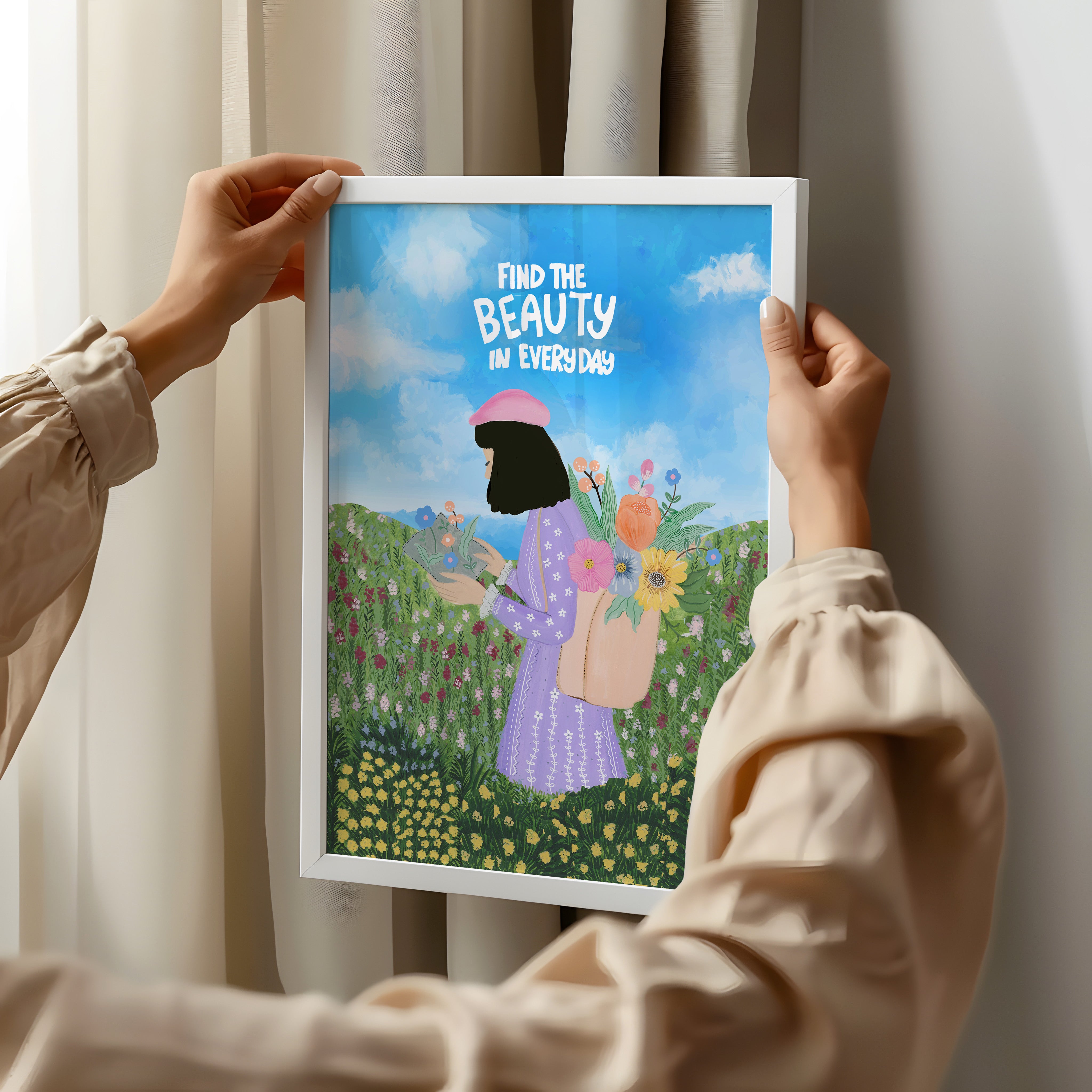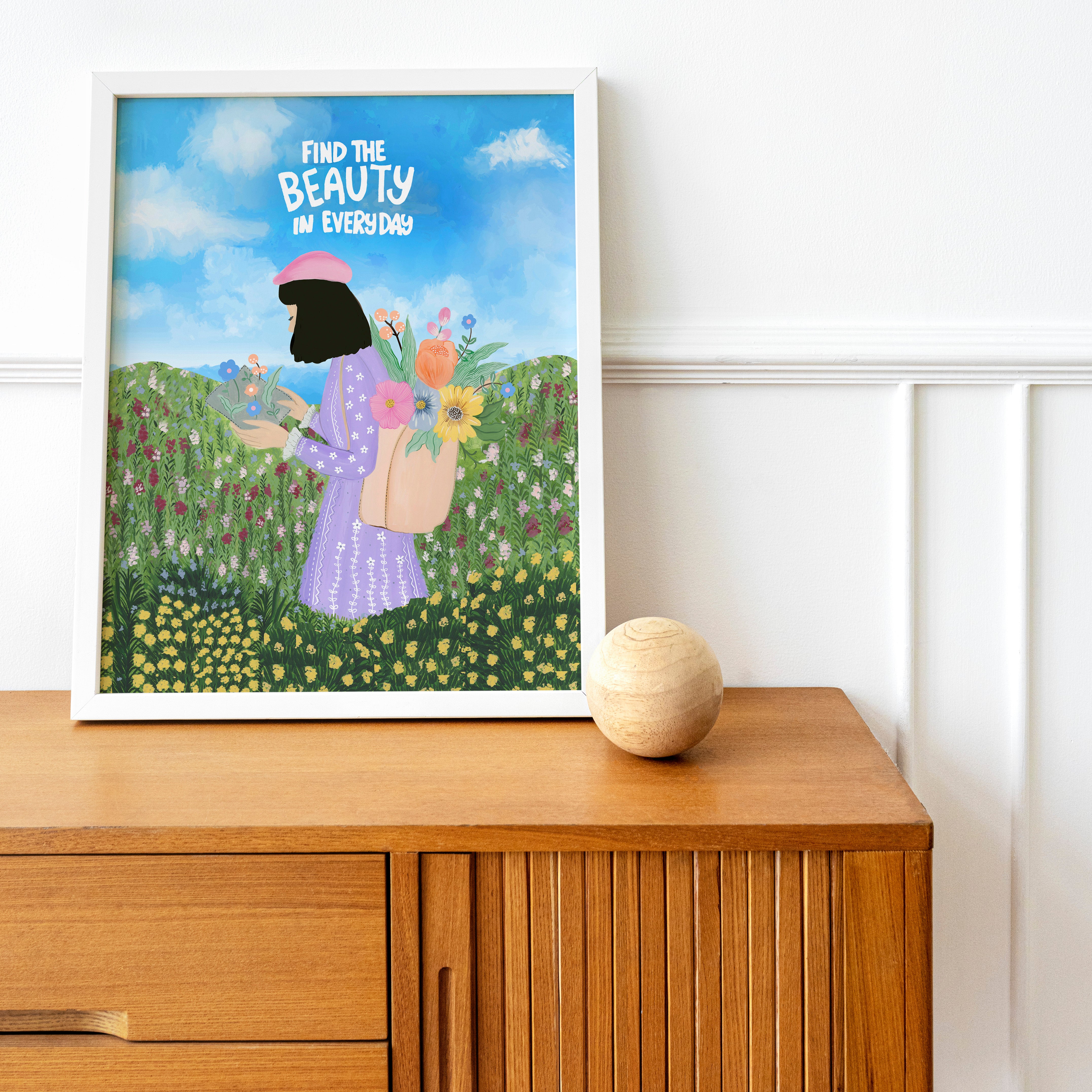 The artwork portrays a serene scene where a woman, seated comfortably amidst lush greenery and vibrant blossoms, takes a moment to unwind. The soothing palette of greens, pinks, and blues evokes a sense of calm, reinforcing the importance of self-care and inner peace. The words "Find The Beauty In Everyday" serve as a powerful affirmation, encouraging you to nurture your mind, body, and soul.