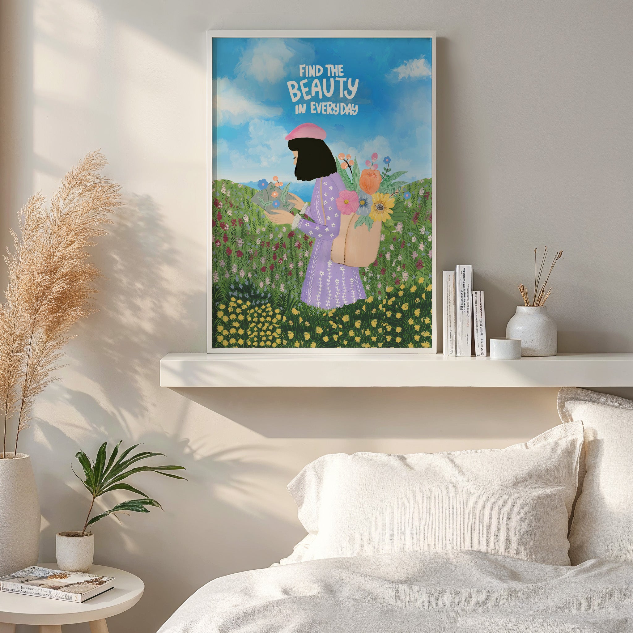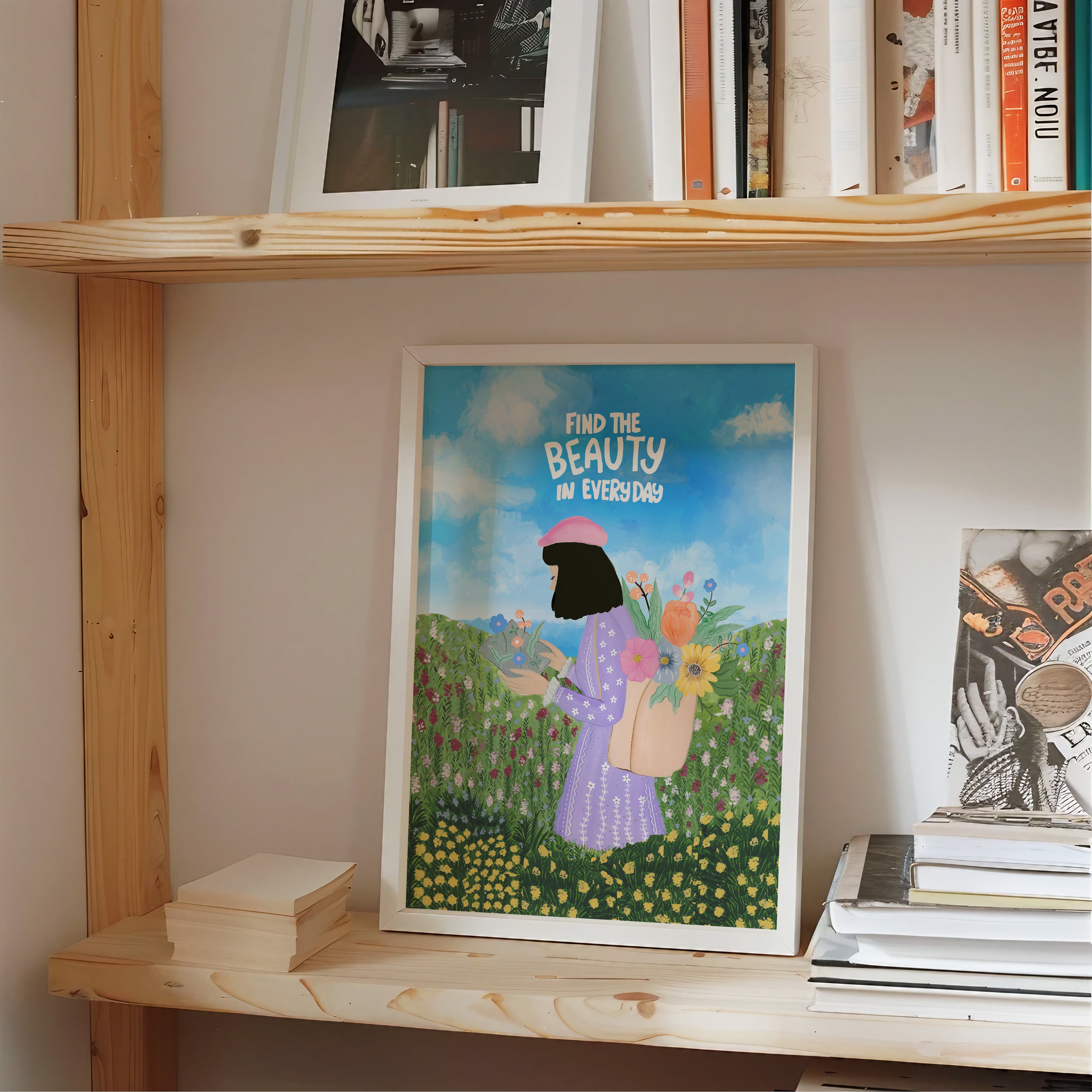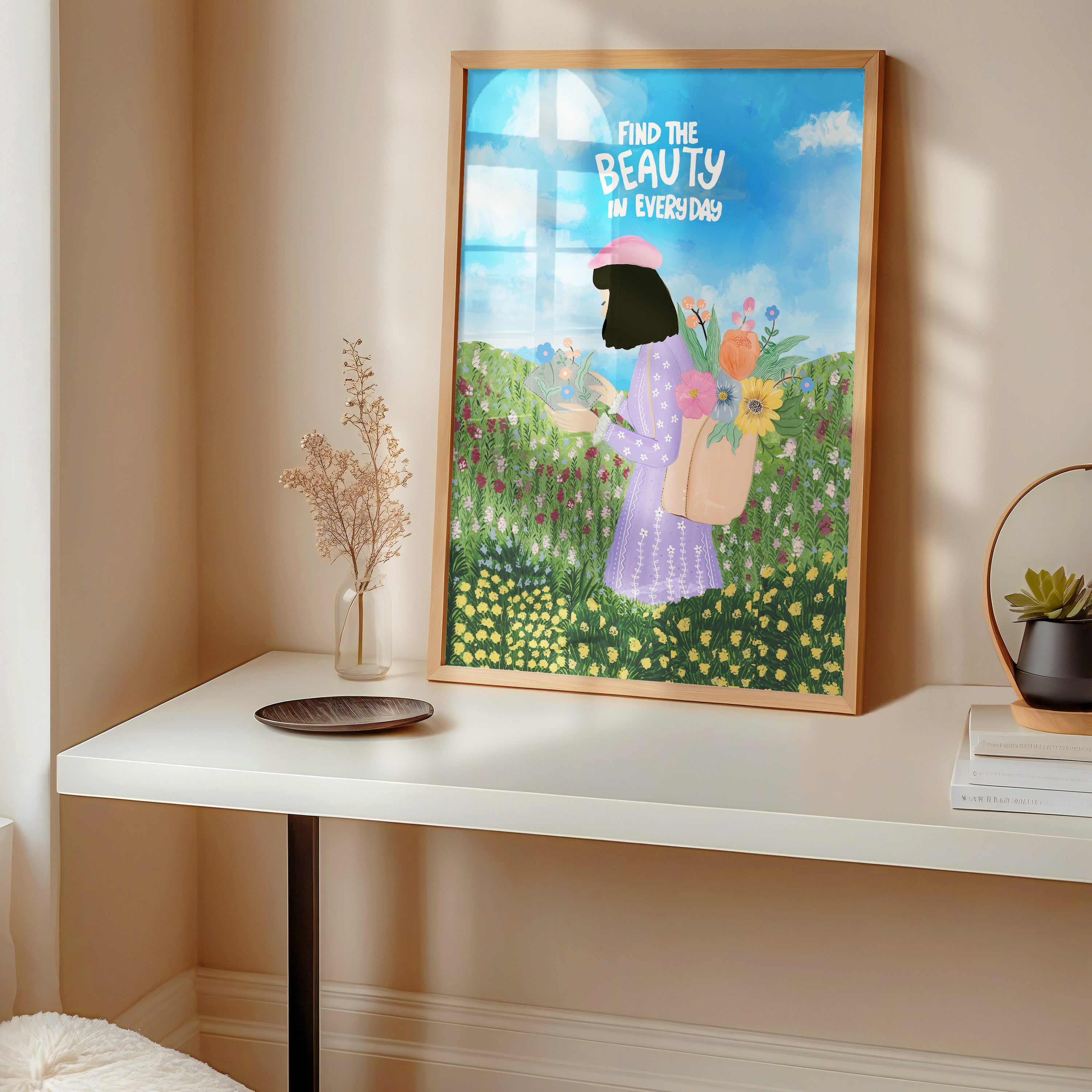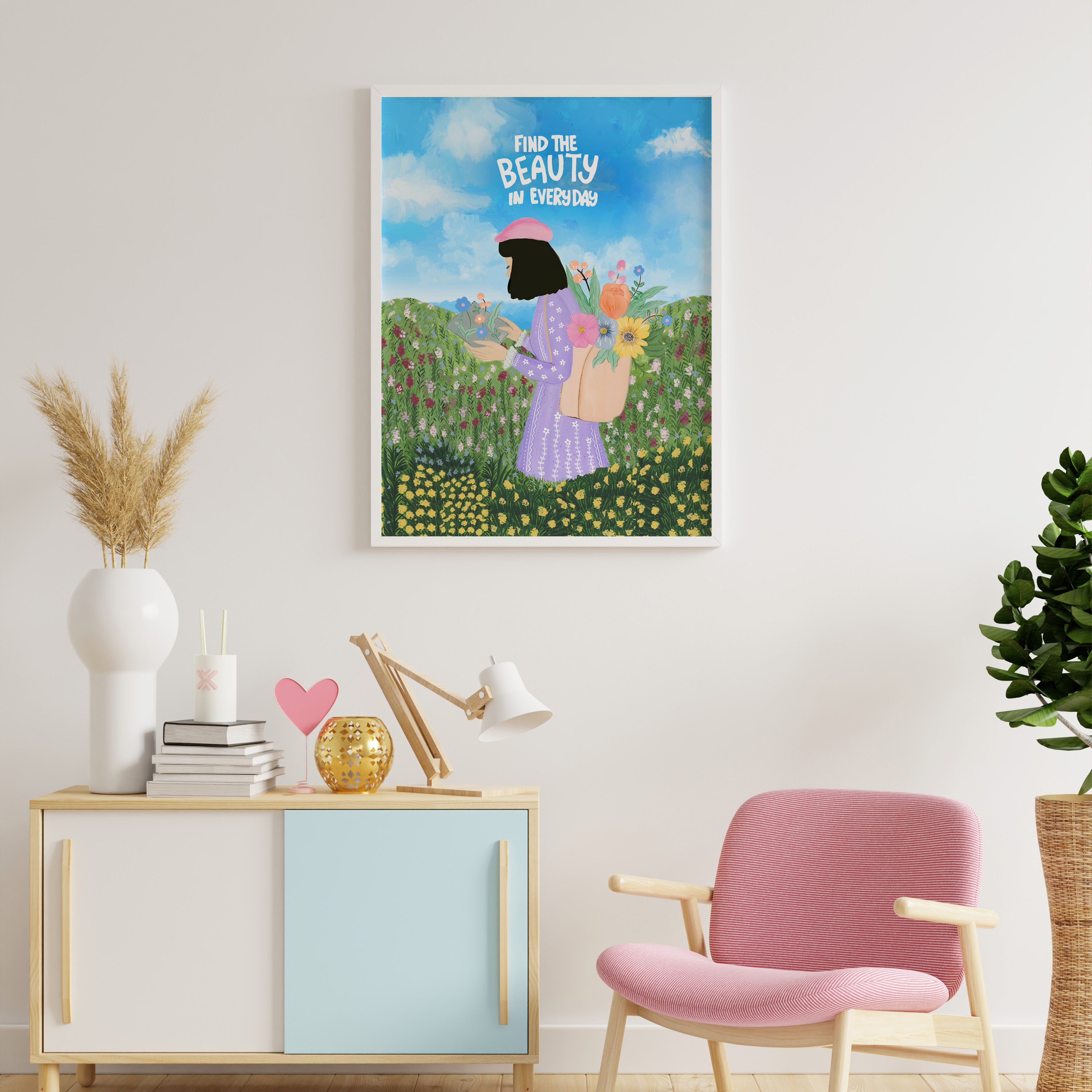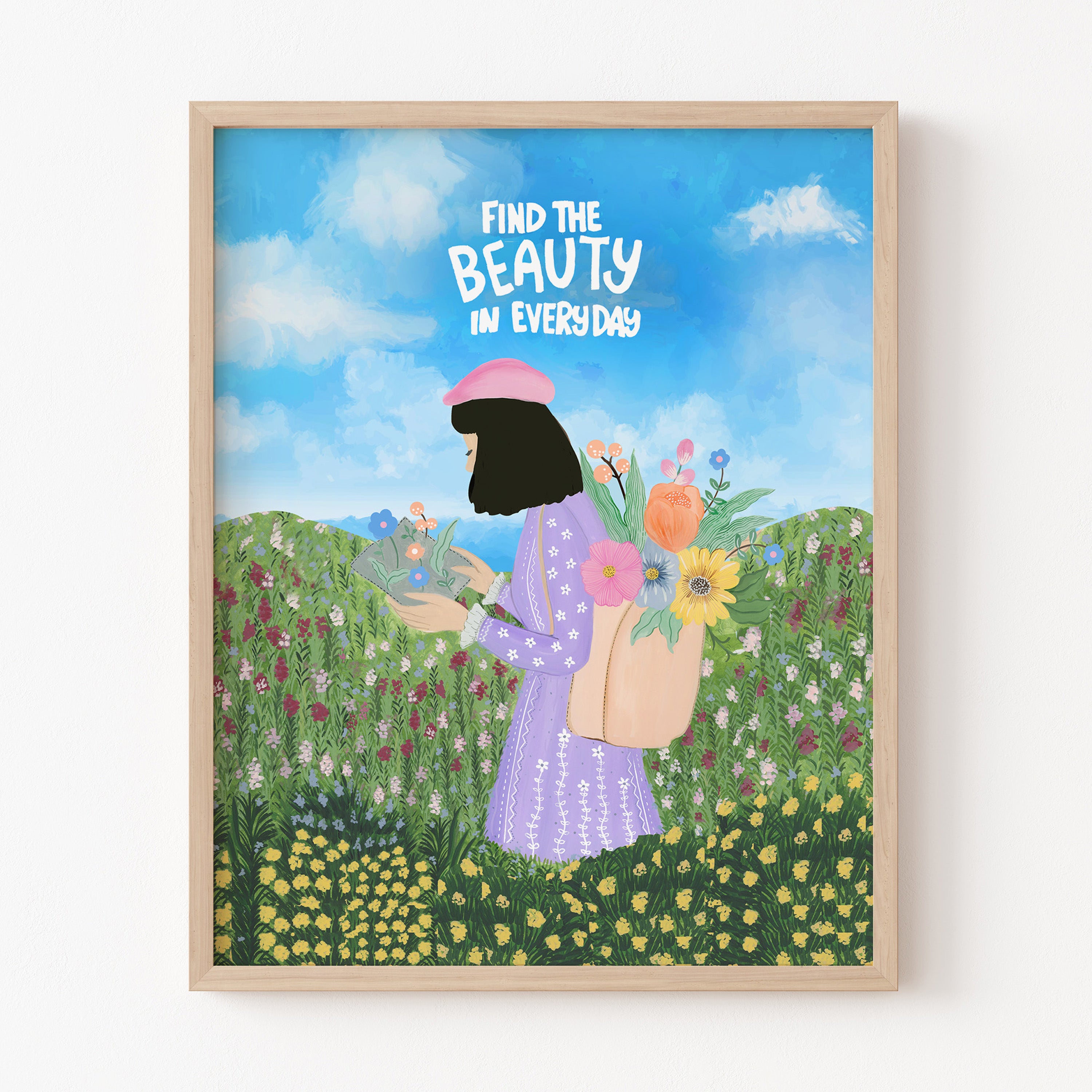 The artwork portrays a serene scene where a woman, seated comfortably amidst lush greenery and vibrant blossoms, takes a moment to unwind. The soothing palette of greens, pinks, and blues evokes a sense of calm, reinforcing the importance of self-care and inner peace. The words "Find The Beauty In Everyday" serve as a powerful affirmation, encouraging you to nurture your mind, body, and soul.