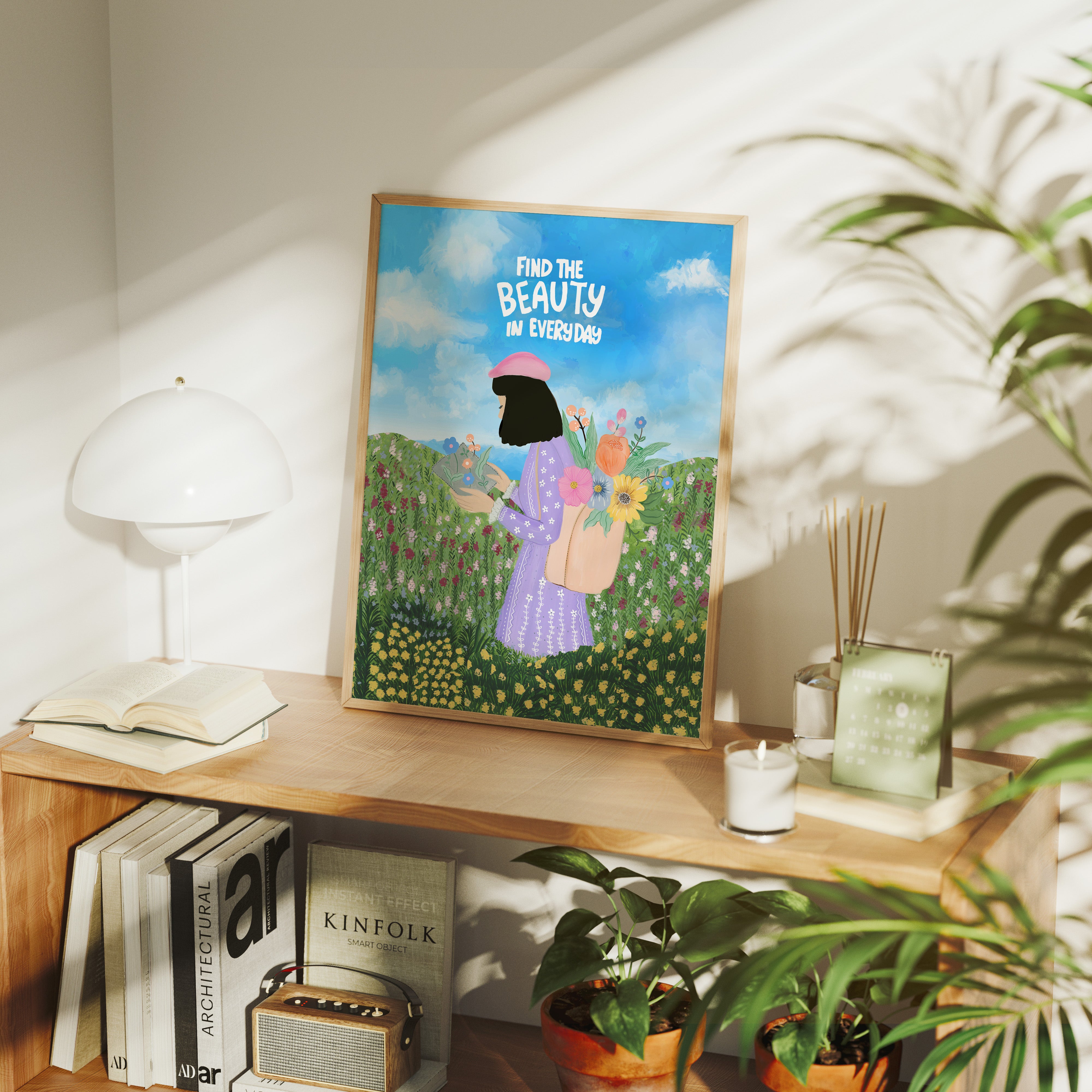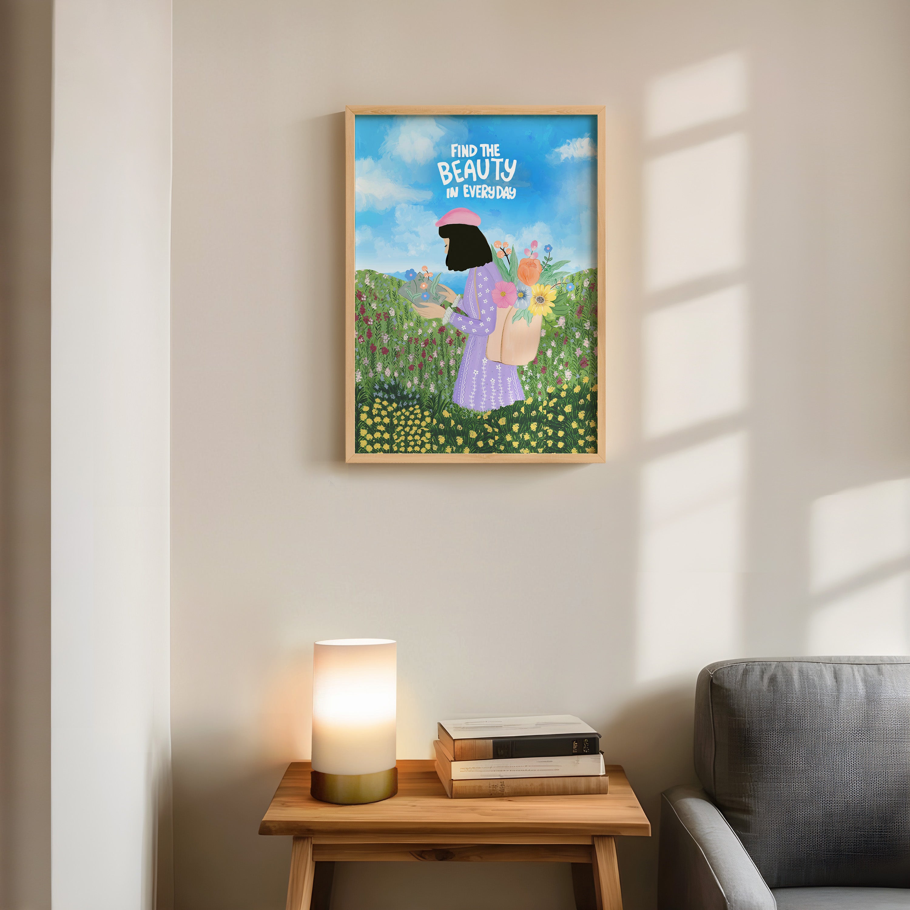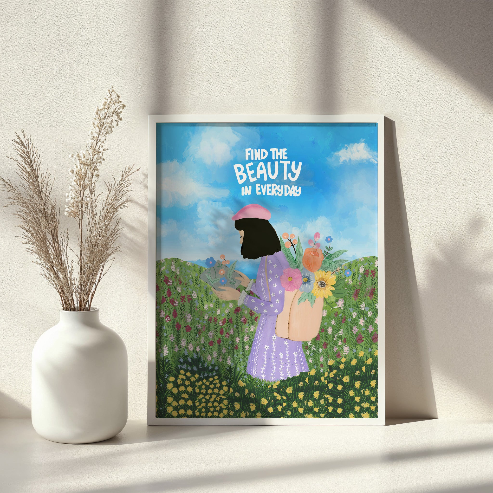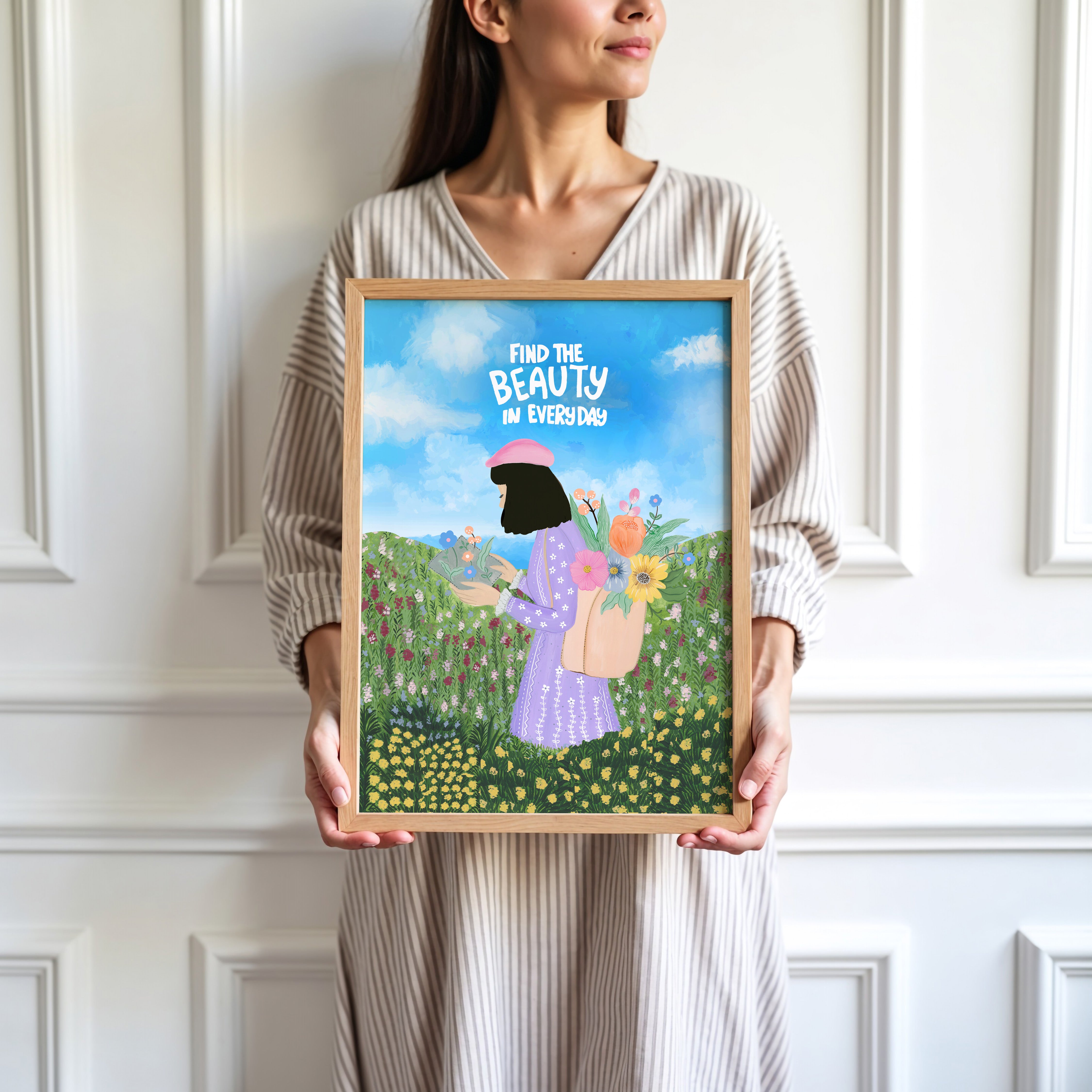 The artwork portrays a serene scene where a woman, seated comfortably amidst lush greenery and vibrant blossoms, takes a moment to unwind. The soothing palette of greens, pinks, and blues evokes a sense of calm, reinforcing the importance of self-care and inner peace. The words "Find The Beauty In Everyday" serve as a powerful affirmation, encouraging you to nurture your mind, body, and soul.