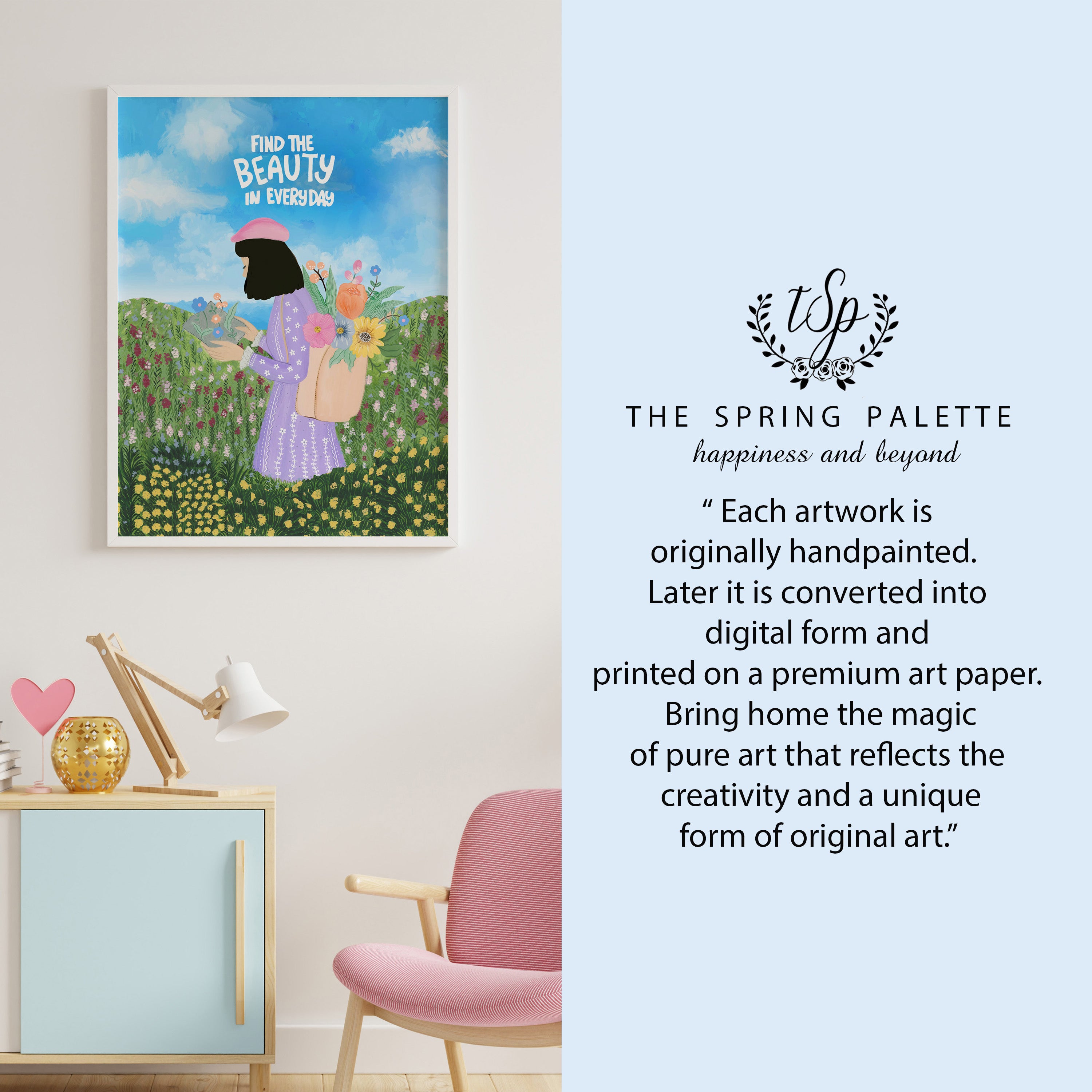 Immerse yourself in a world of tranquility and self-care with this beautifully hand-painted artwork from The Spring Palette. Inspired by the Life Reflections theme, this painting is a gentle reminder to pause, breathe, and prioritize your well-being.