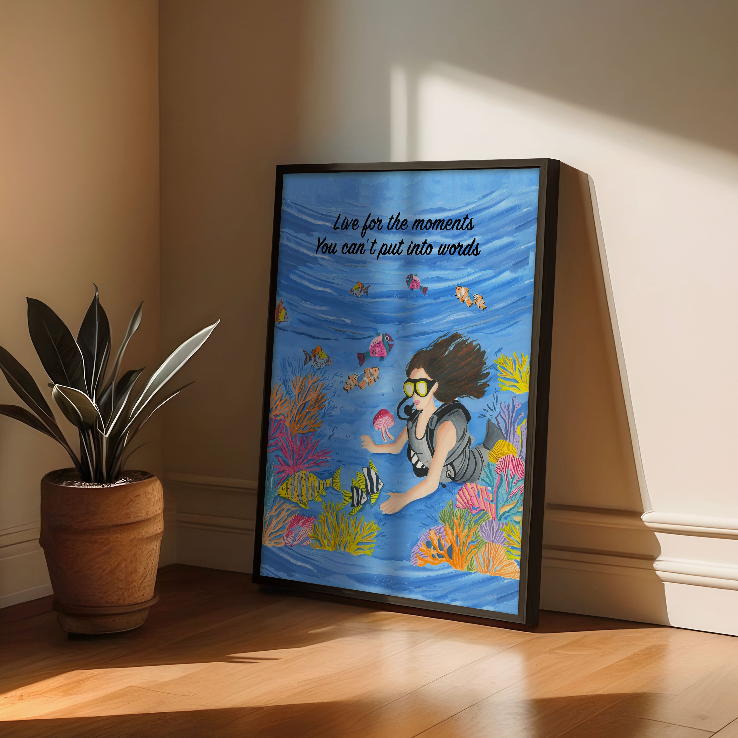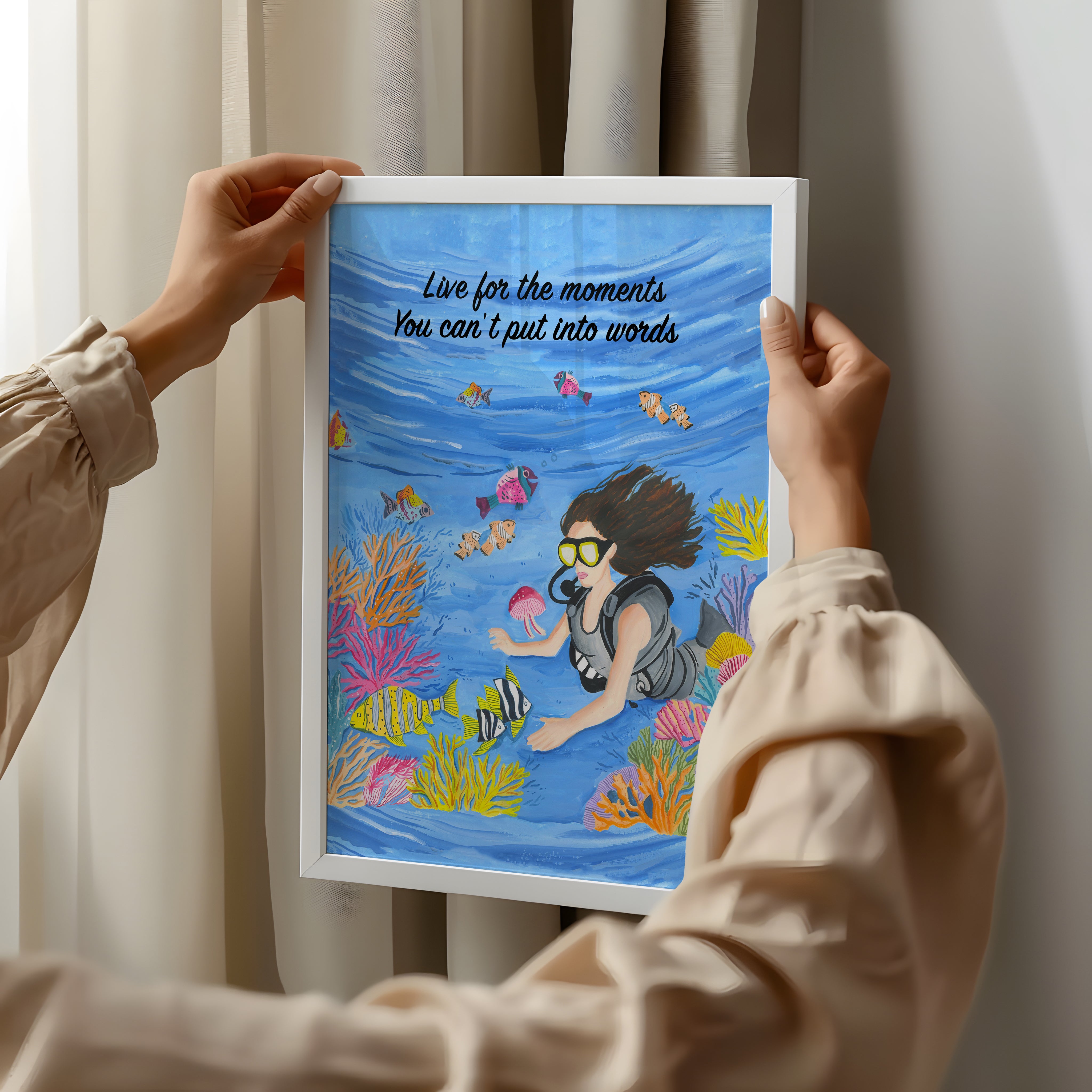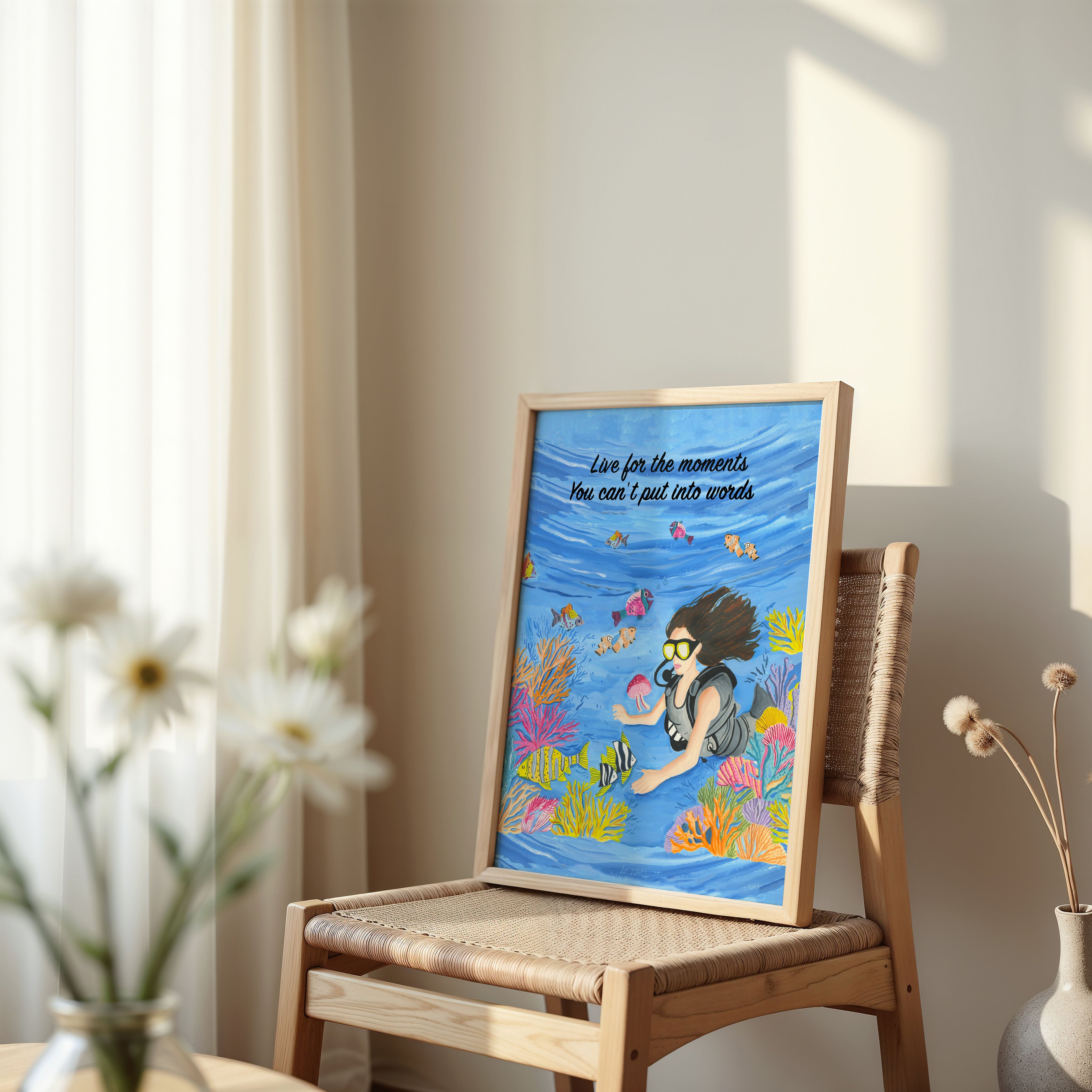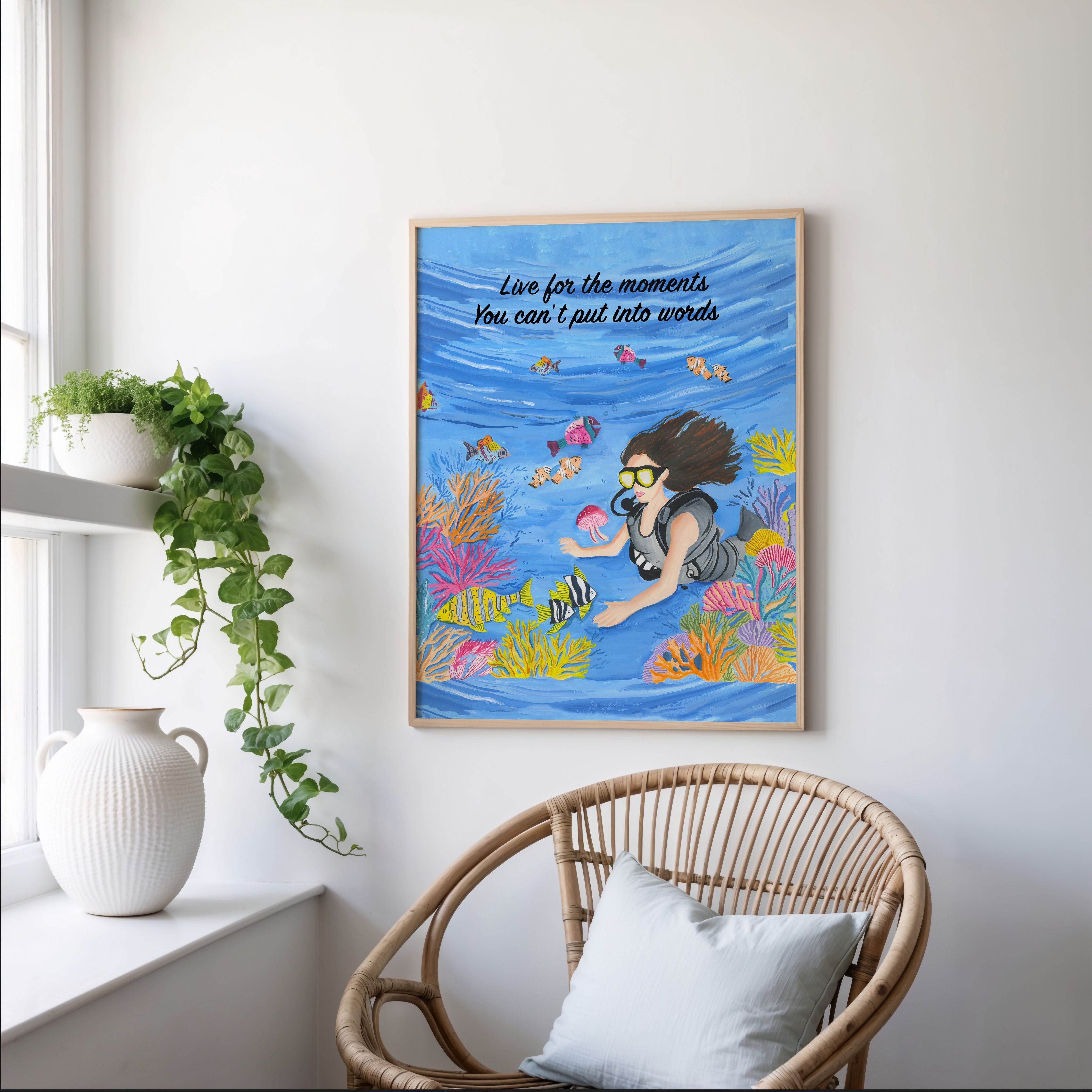 The artwork portrays a serene scene where a woman, seated comfortably amidst lush greenery and vibrant blossoms, takes a moment to unwind. The soothing palette of greens, pinks, and blues evokes a sense of calm, reinforcing the importance of self-care and inner peace. The words "Live For The Moments" serve as a powerful affirmation, encouraging you to nurture your mind, body, and soul.