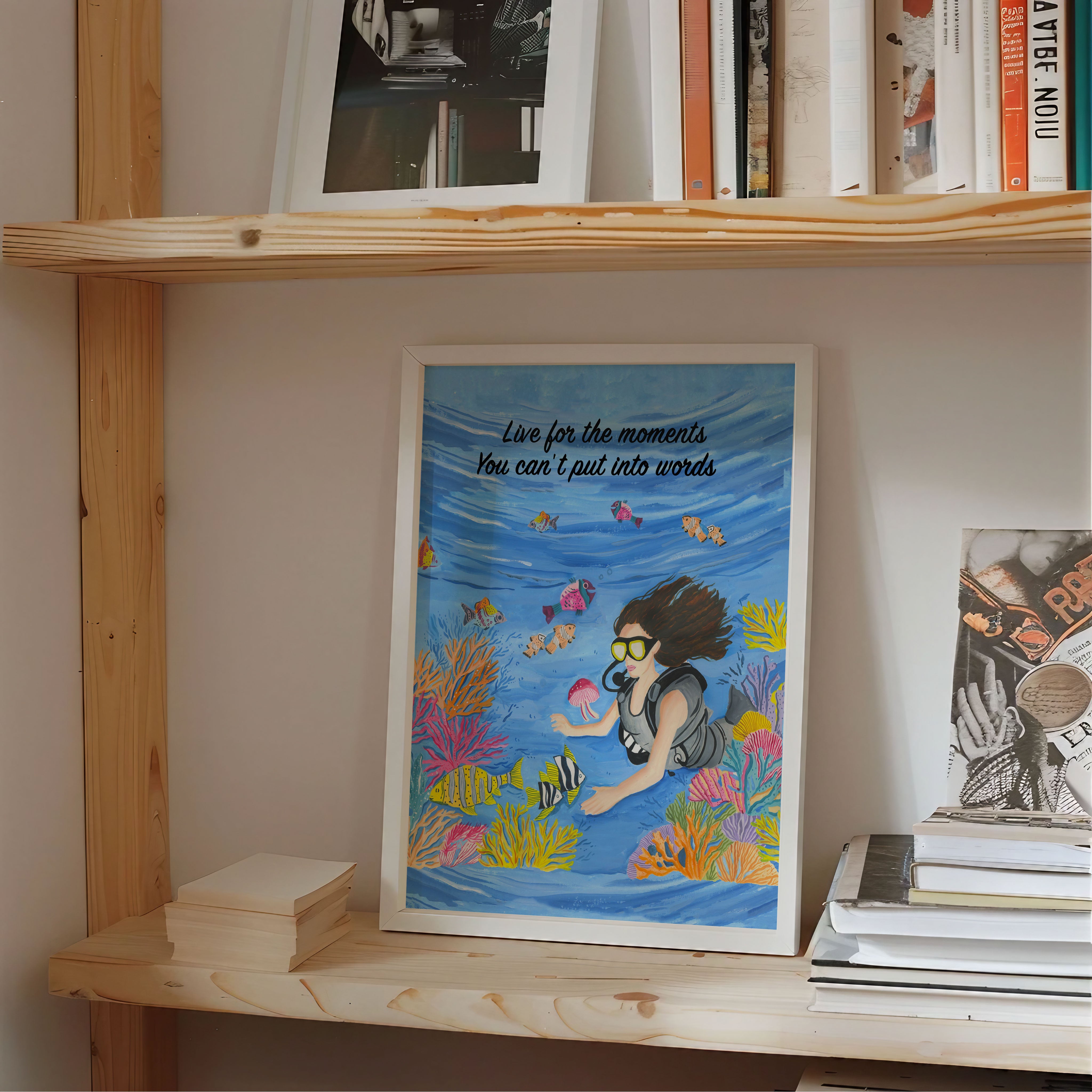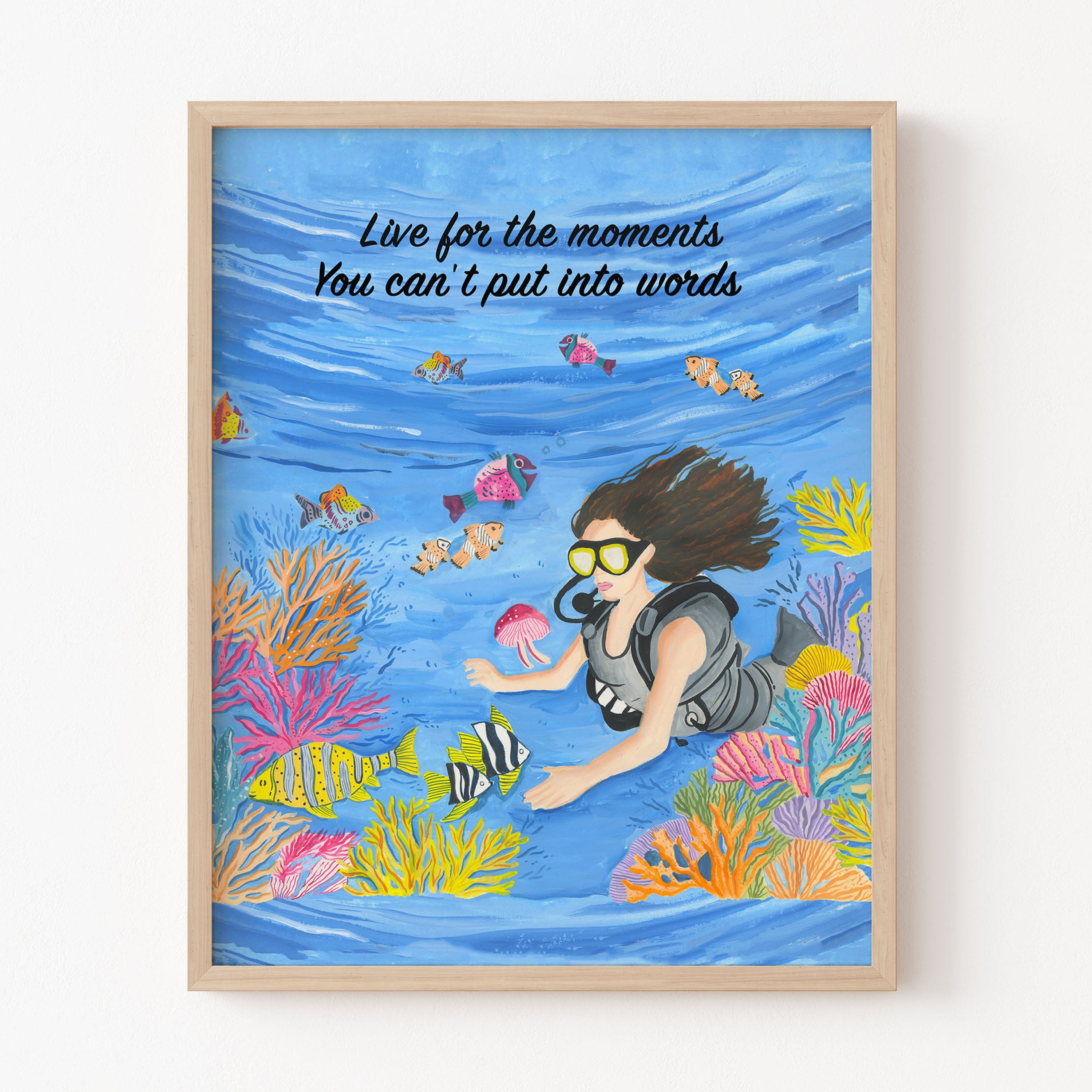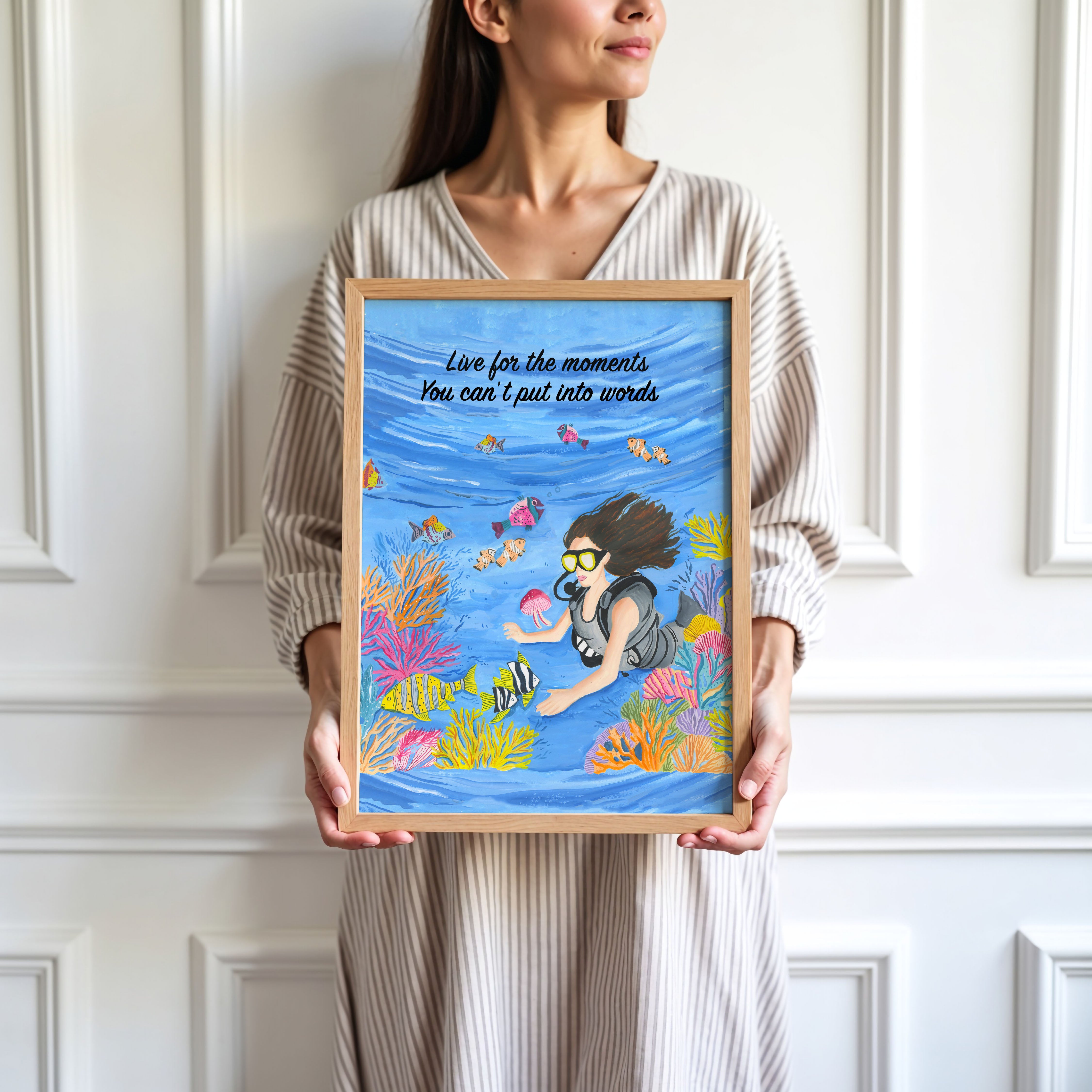 The artwork portrays a serene scene where a woman, seated comfortably amidst lush greenery and vibrant blossoms, takes a moment to unwind. The soothing palette of greens, pinks, and blues evokes a sense of calm, reinforcing the importance of self-care and inner peace. The words "Live For The Moments" serve as a powerful affirmation, encouraging you to nurture your mind, body, and soul.
