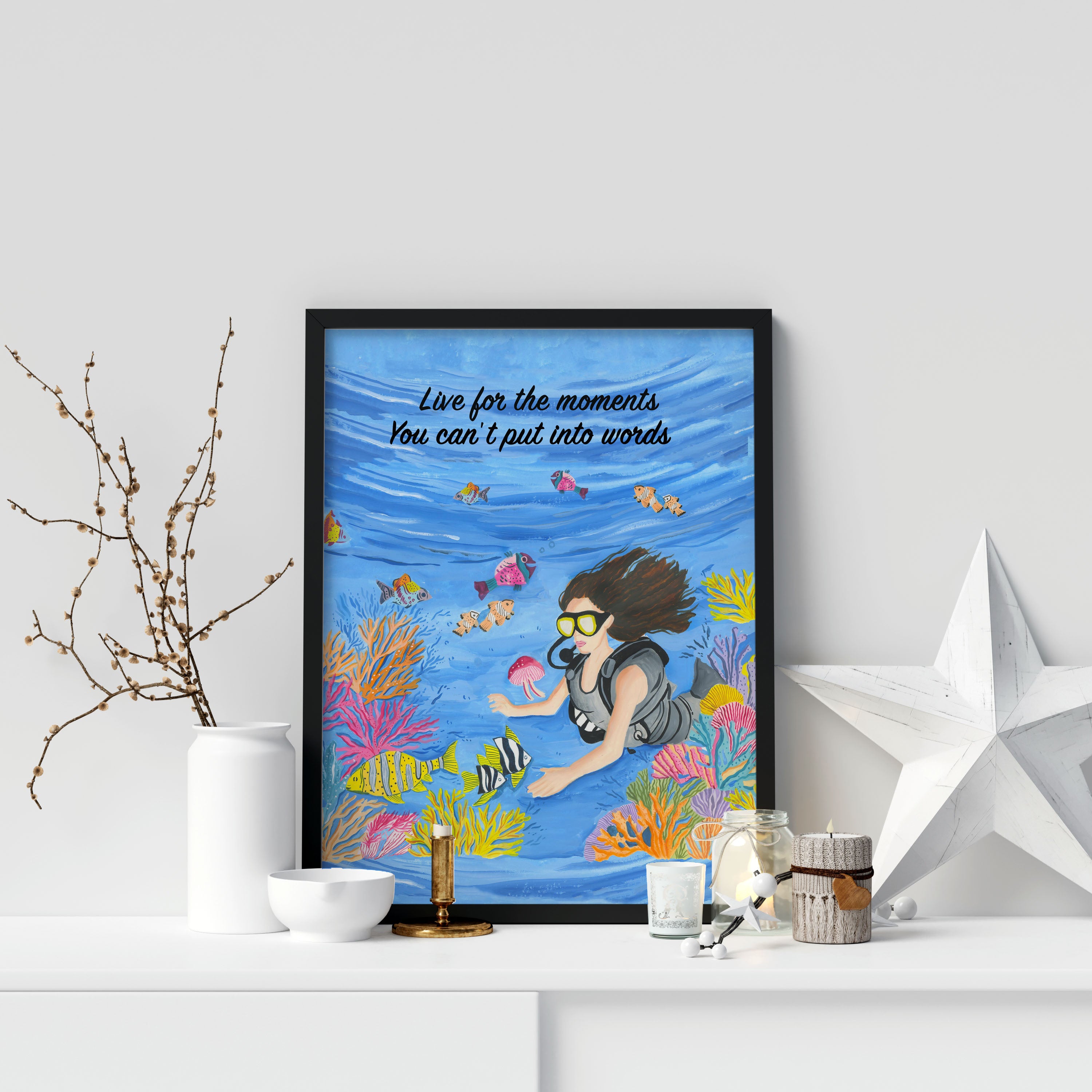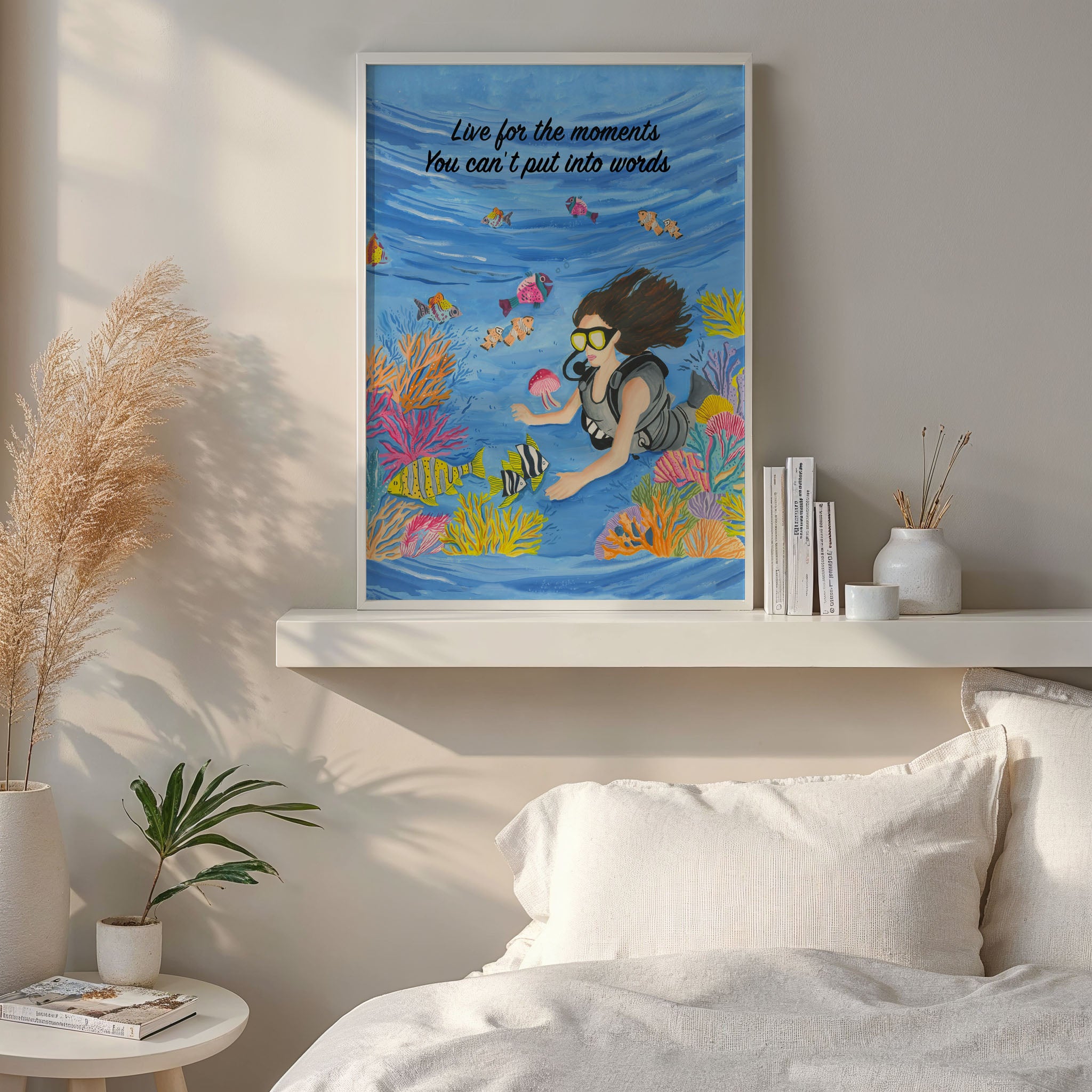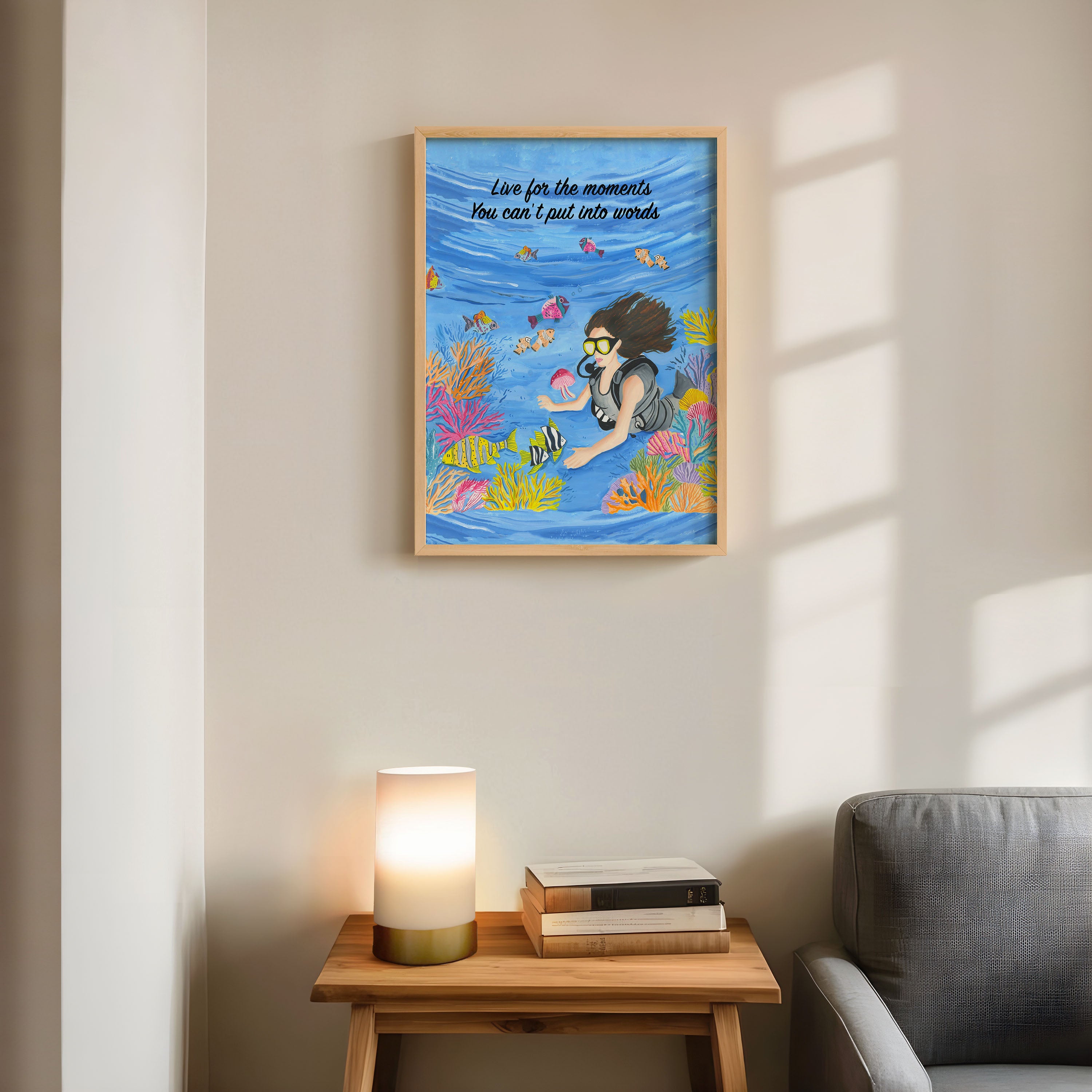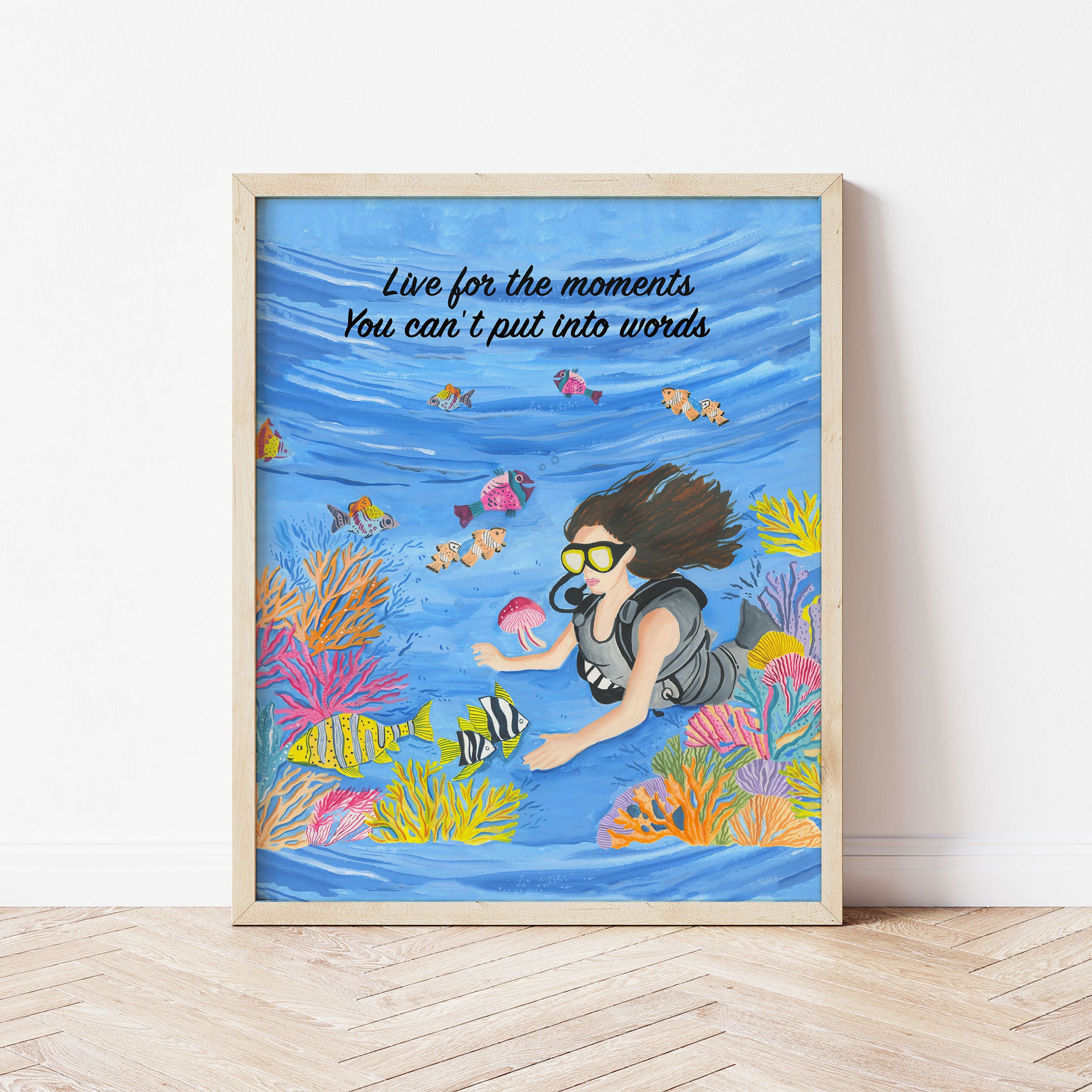 The artwork portrays a serene scene where a woman, seated comfortably amidst lush greenery and vibrant blossoms, takes a moment to unwind. The soothing palette of greens, pinks, and blues evokes a sense of calm, reinforcing the importance of self-care and inner peace. The words "Live For The Moments" serve as a powerful affirmation, encouraging you to nurture your mind, body, and soul.