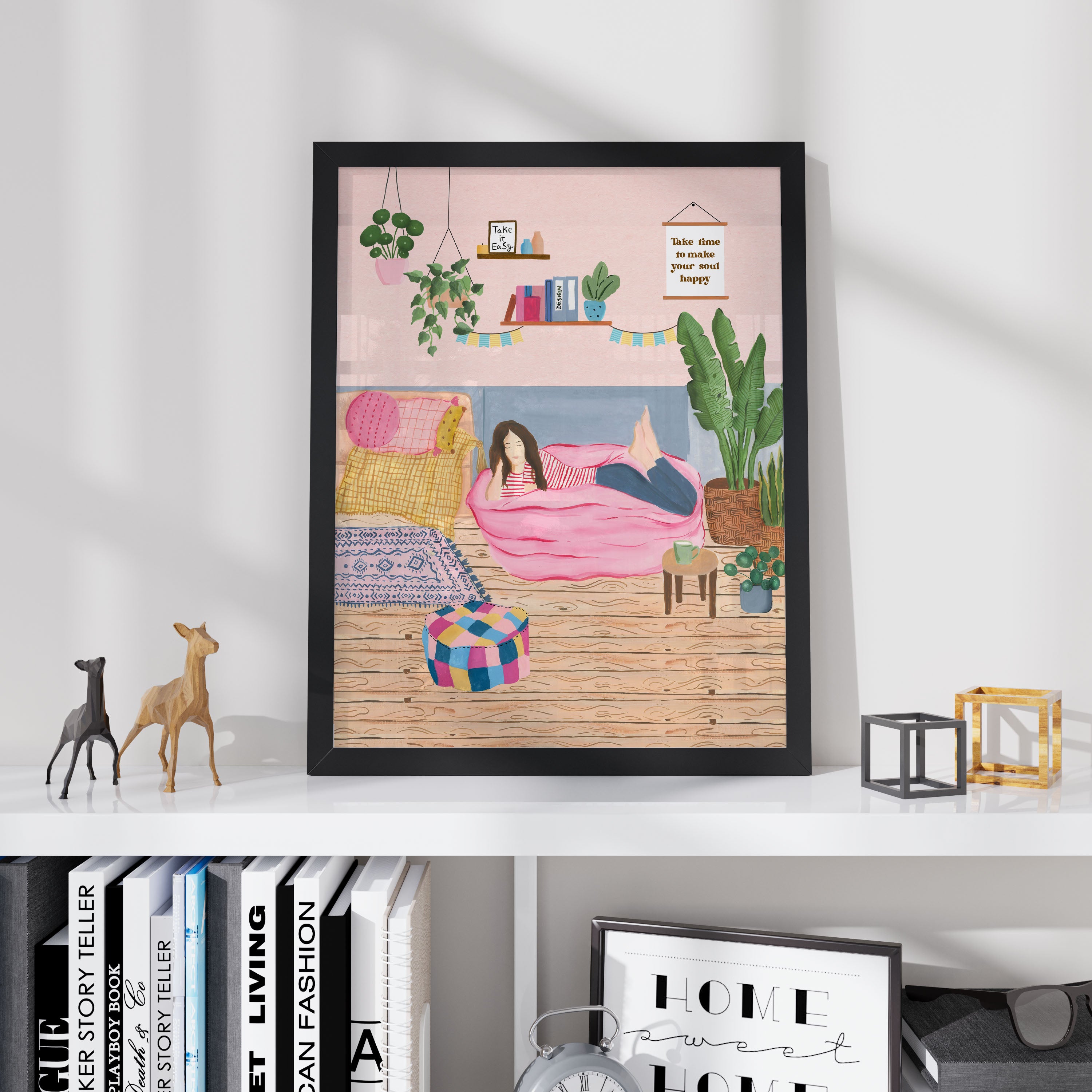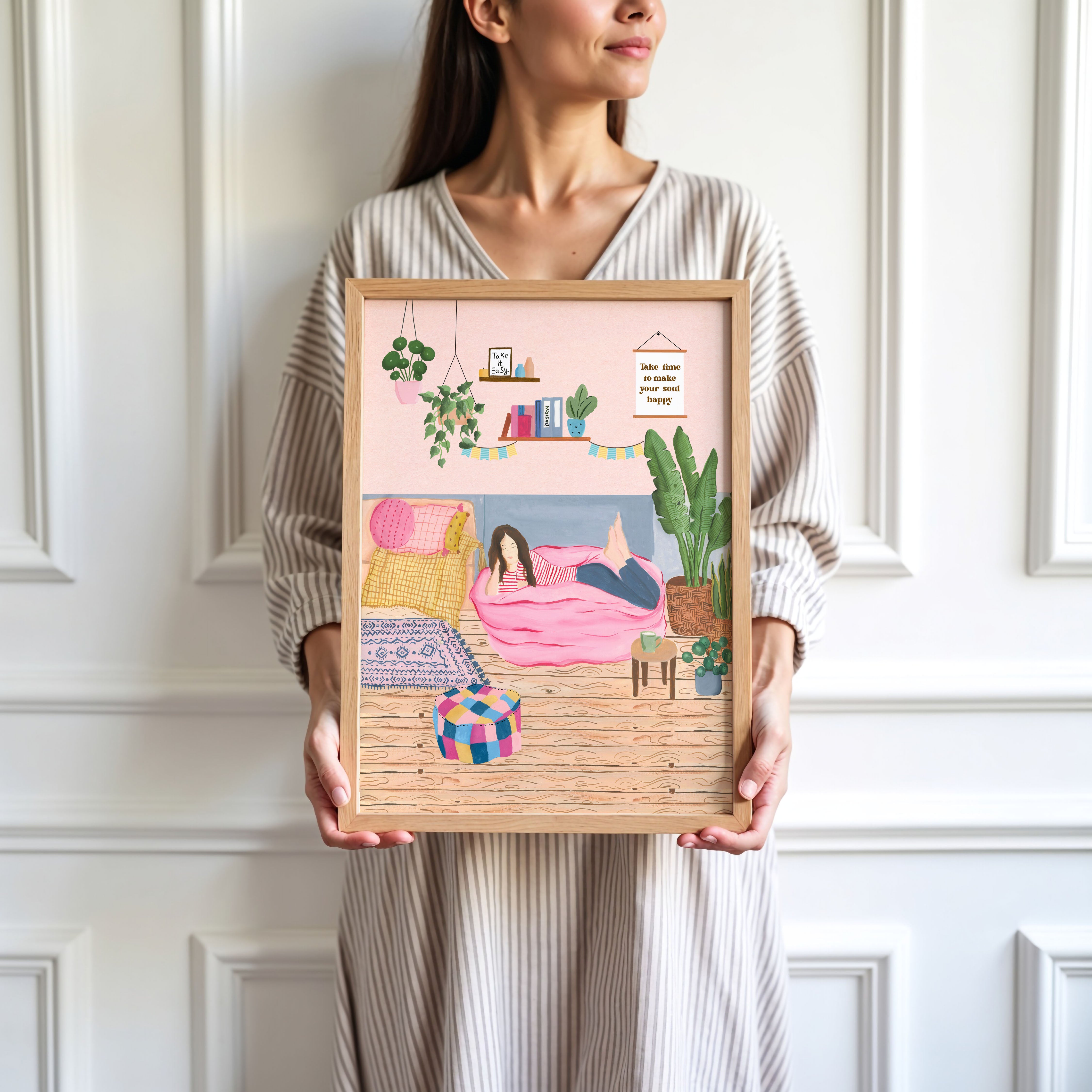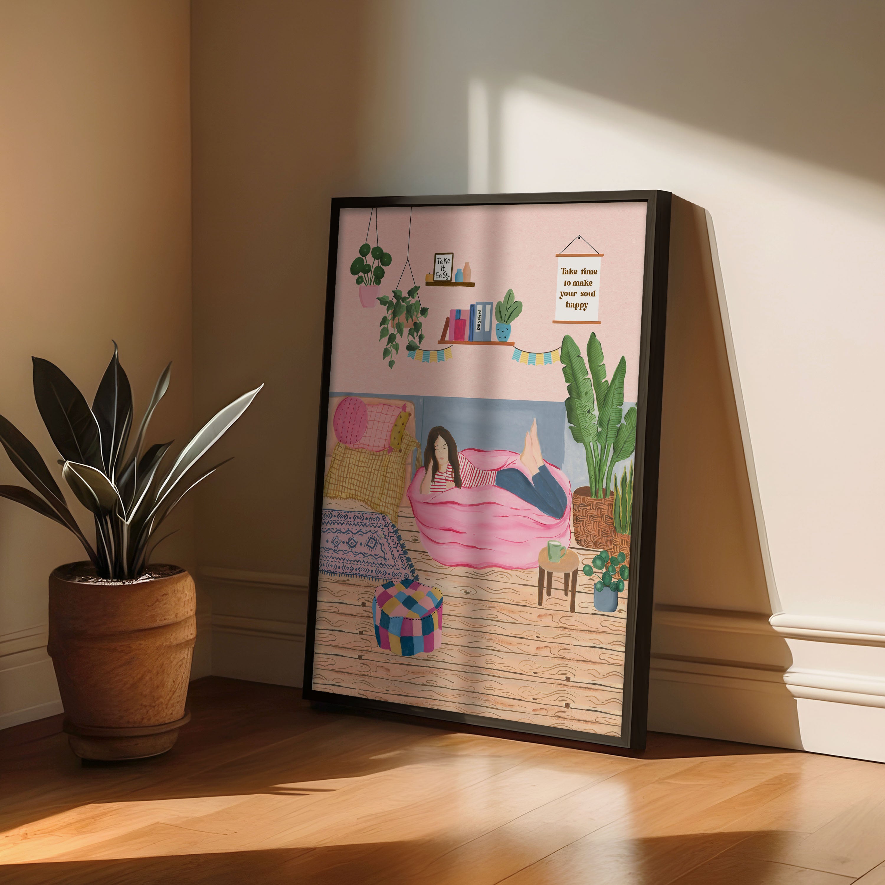 The artwork portrays a serene scene where a woman, seated comfortably amidst lush greenery and vibrant blossoms, takes a moment to unwind. The soothing palette of greens, pinks, and blues evokes a sense of calm, reinforcing the importance of self-care and inner peace. The words "Take Time To Make Your Soul Happy" serve as a powerful affirmation, encouraging you to nurture your mind, body, and soul.