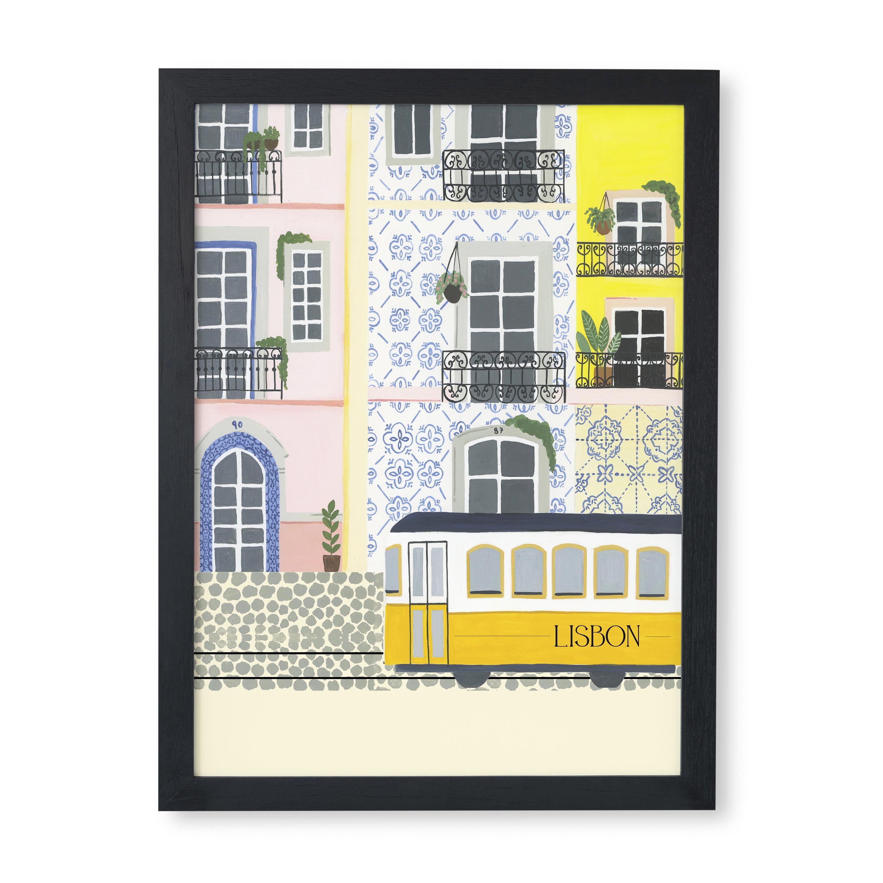 The painting also features one of Lisbon's famous trams, which is an integral part of the city's transportation system and a symbol of the city's charm. The attention to detail in the tram's design and color adds an extra touch of authenticity to the artwork.
