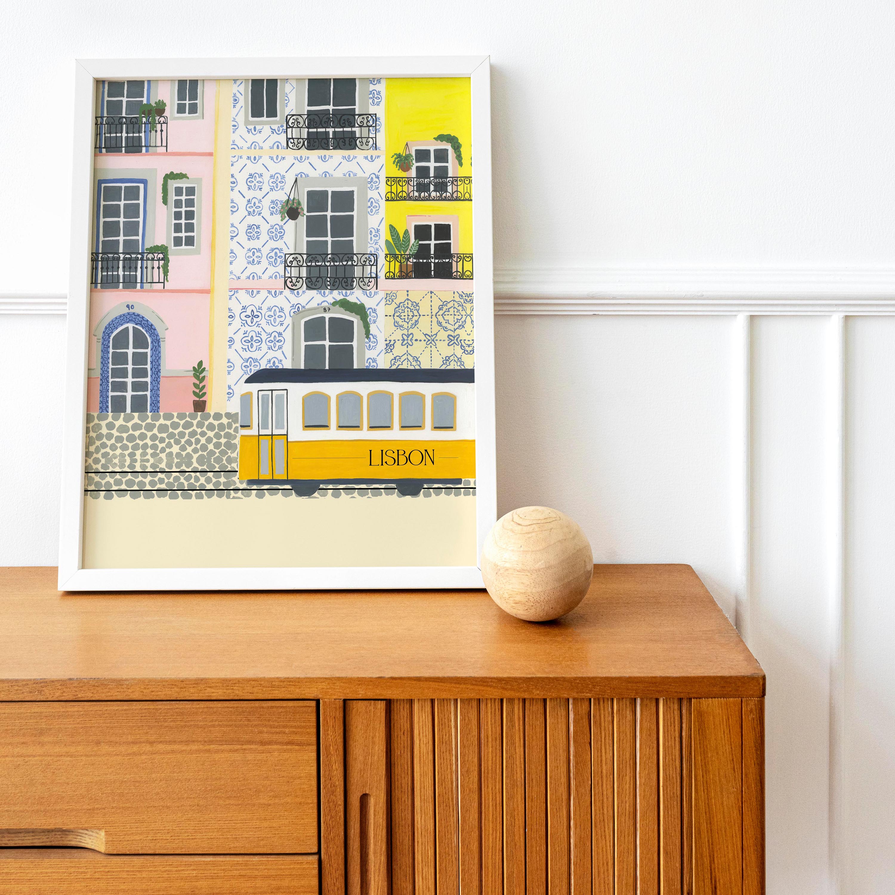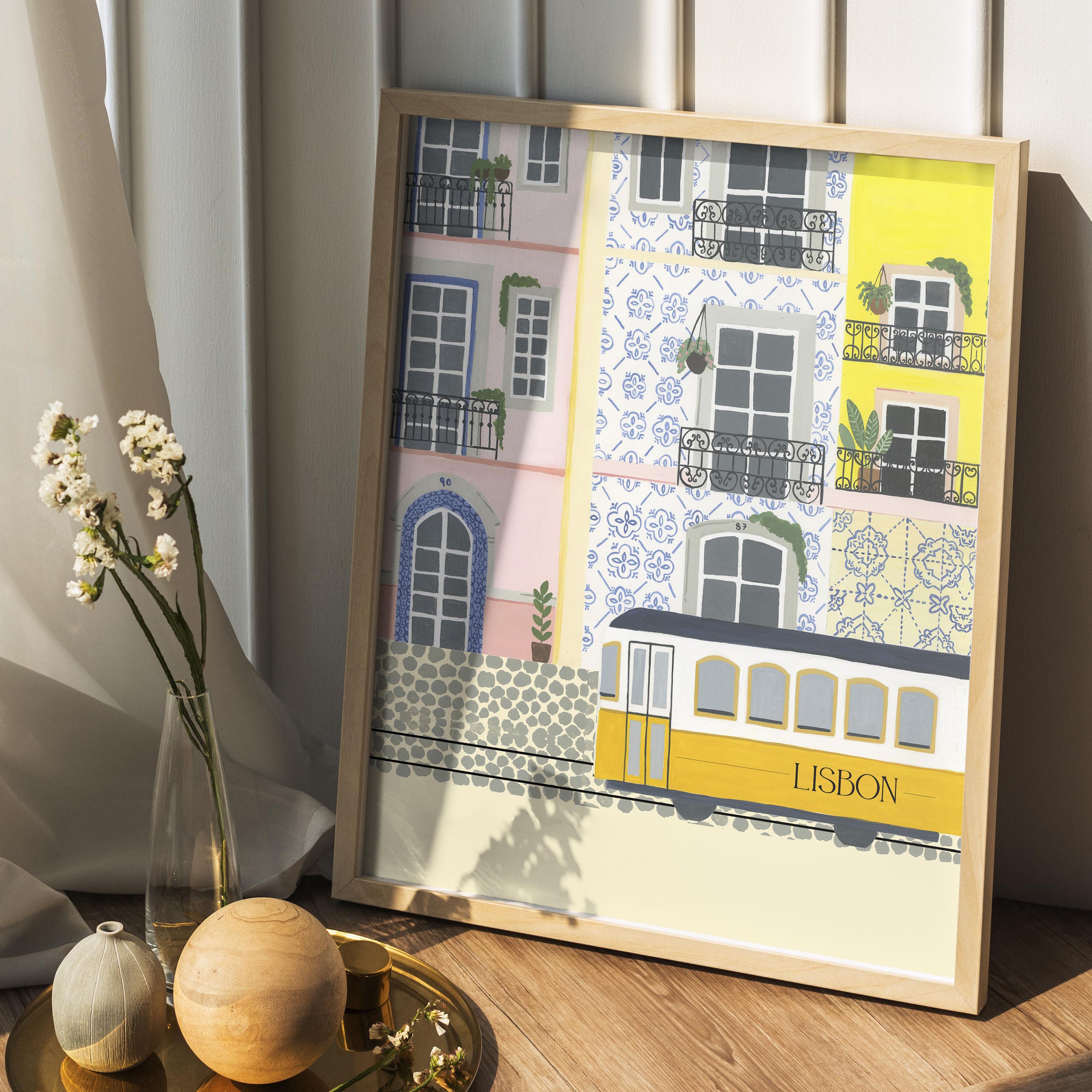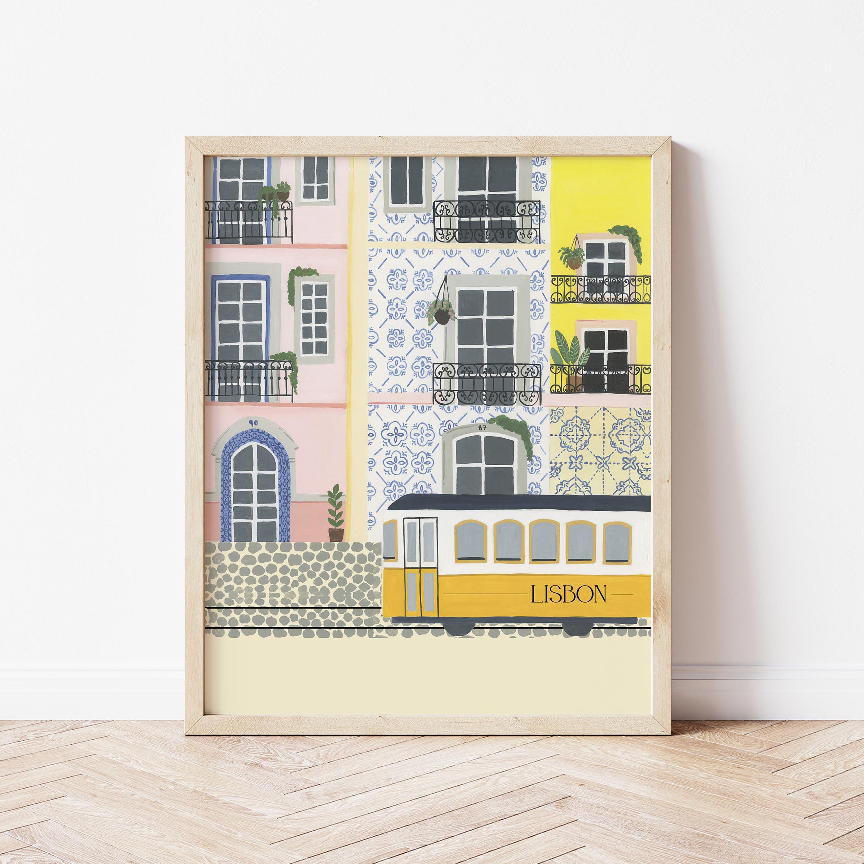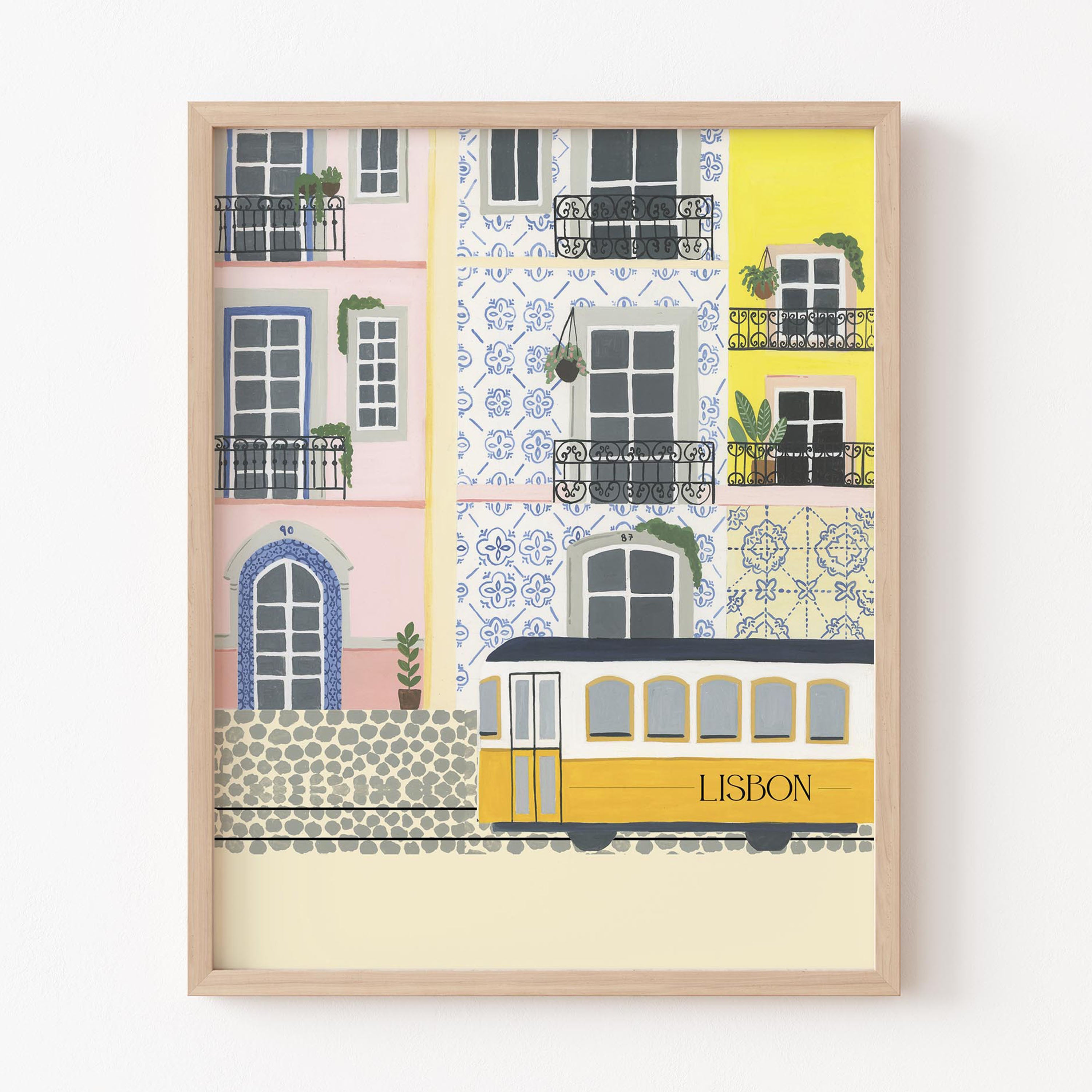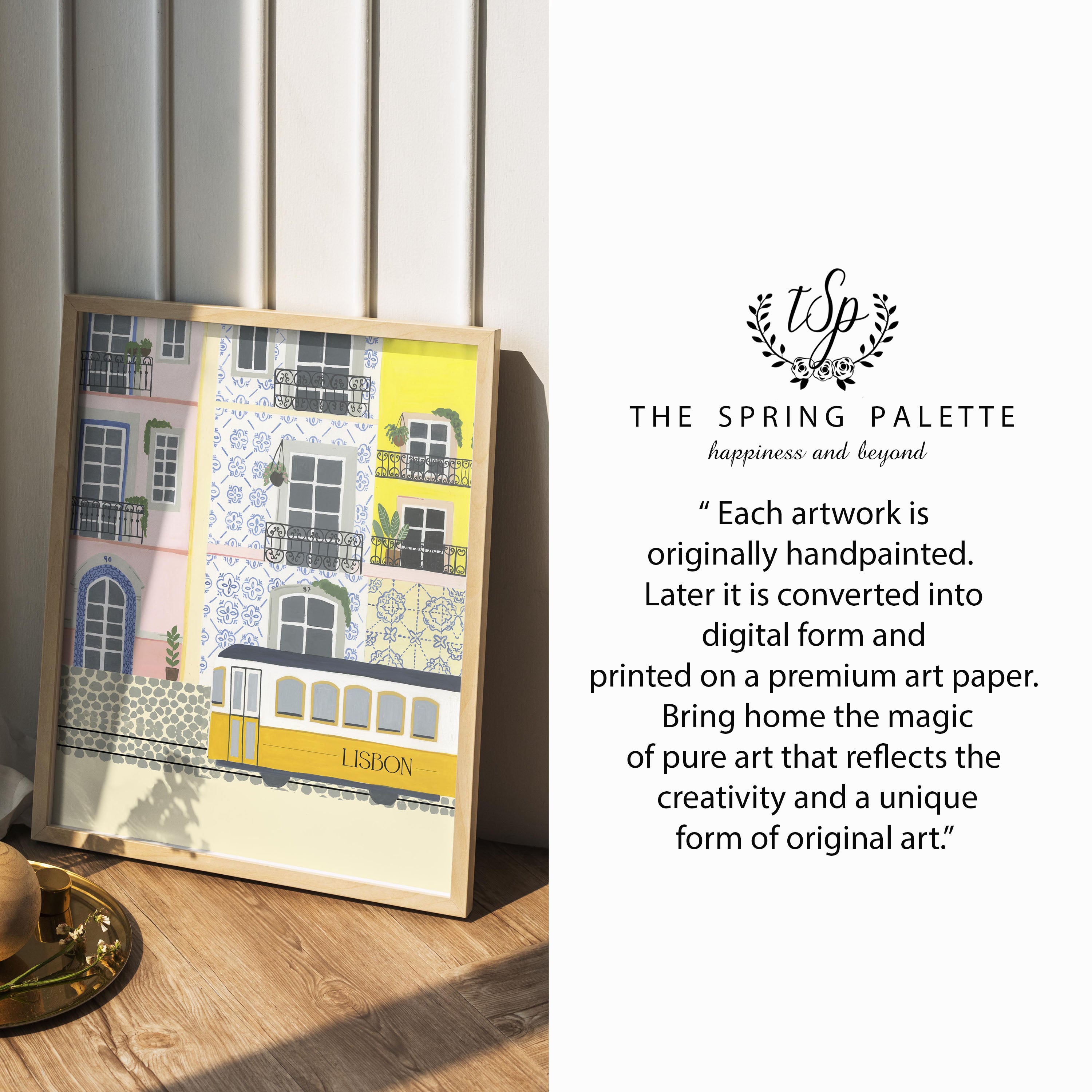 Introducing our stunning wall painting that depicts the beautiful city of Lisbon, Portugal, capturing the essence of its colorful architecture and famous tram.