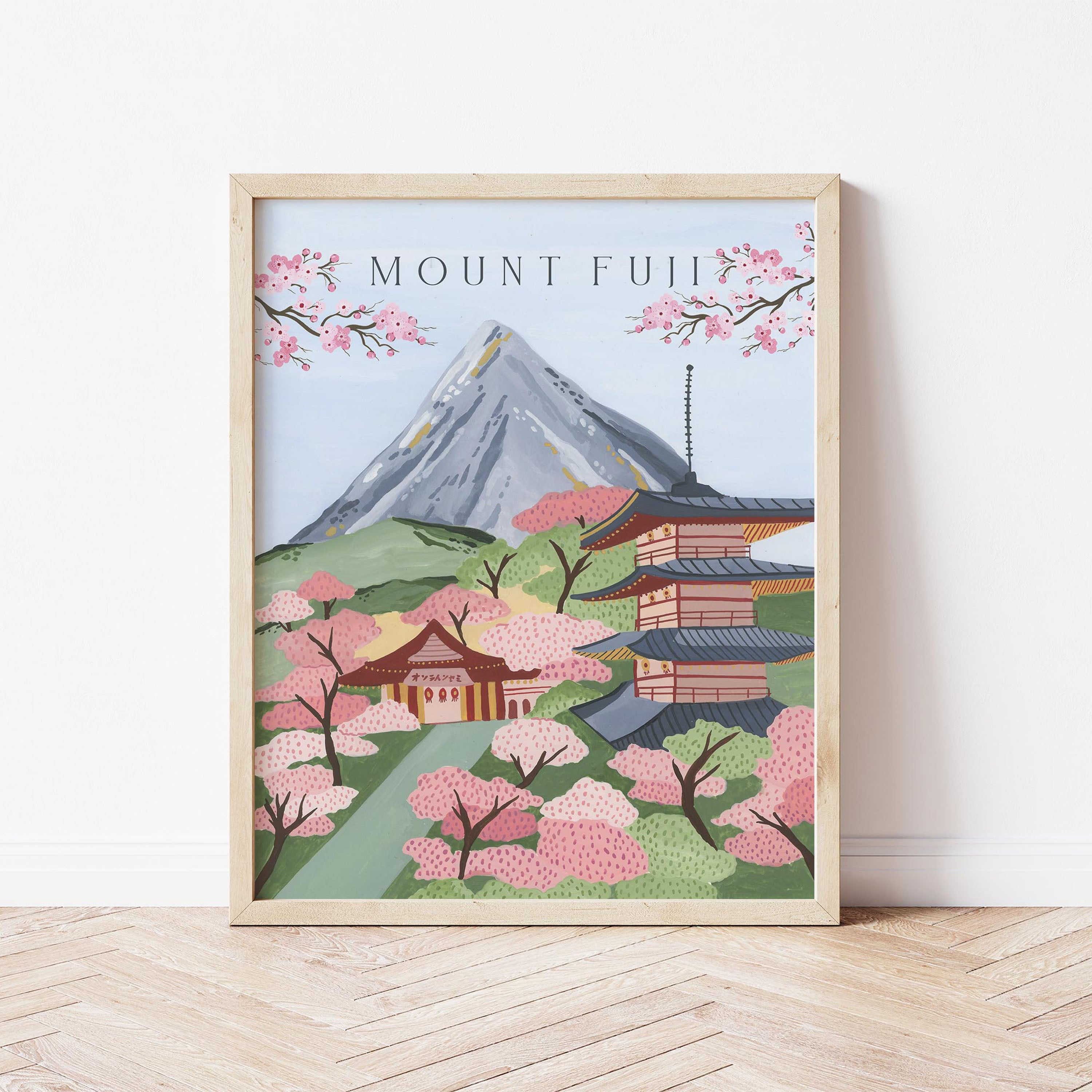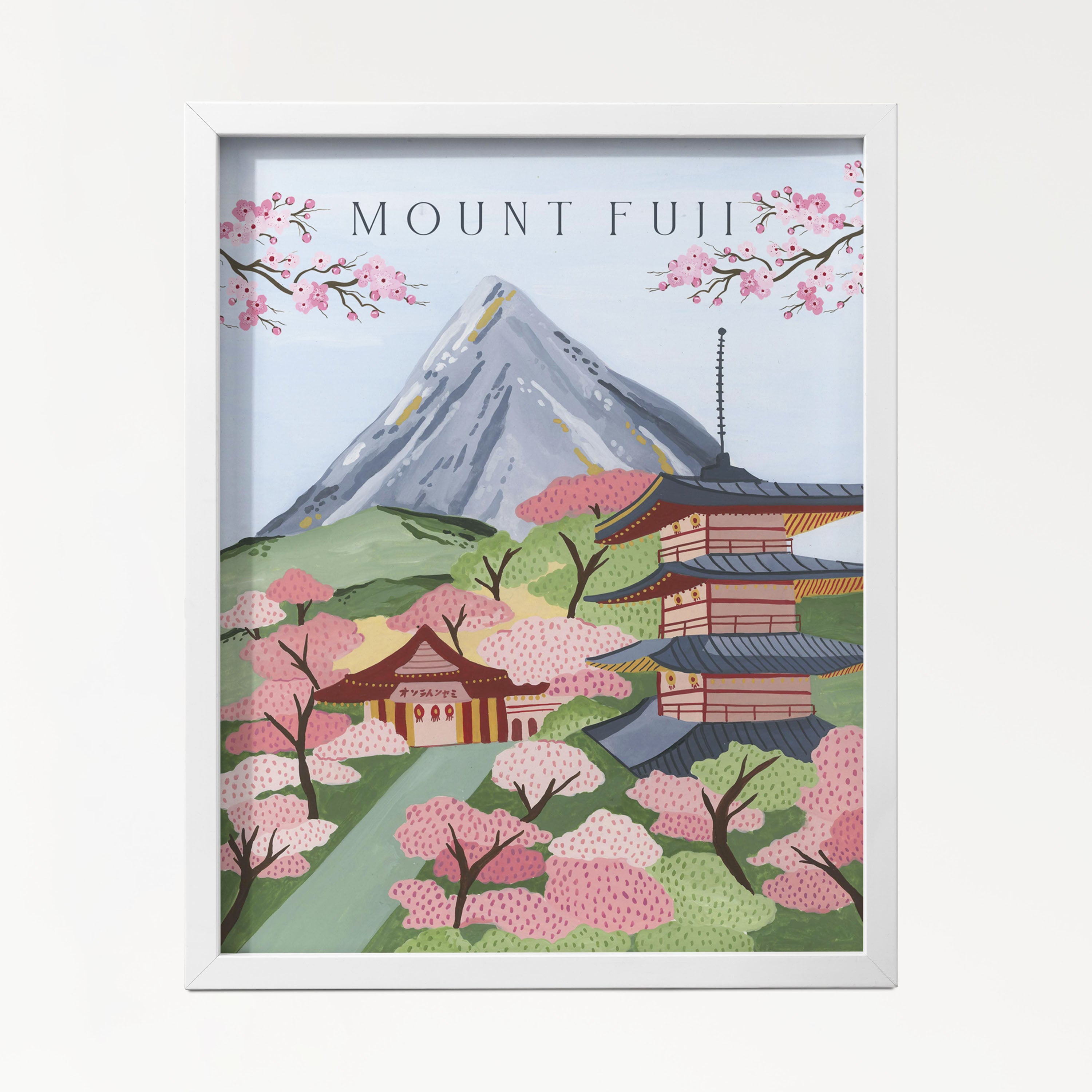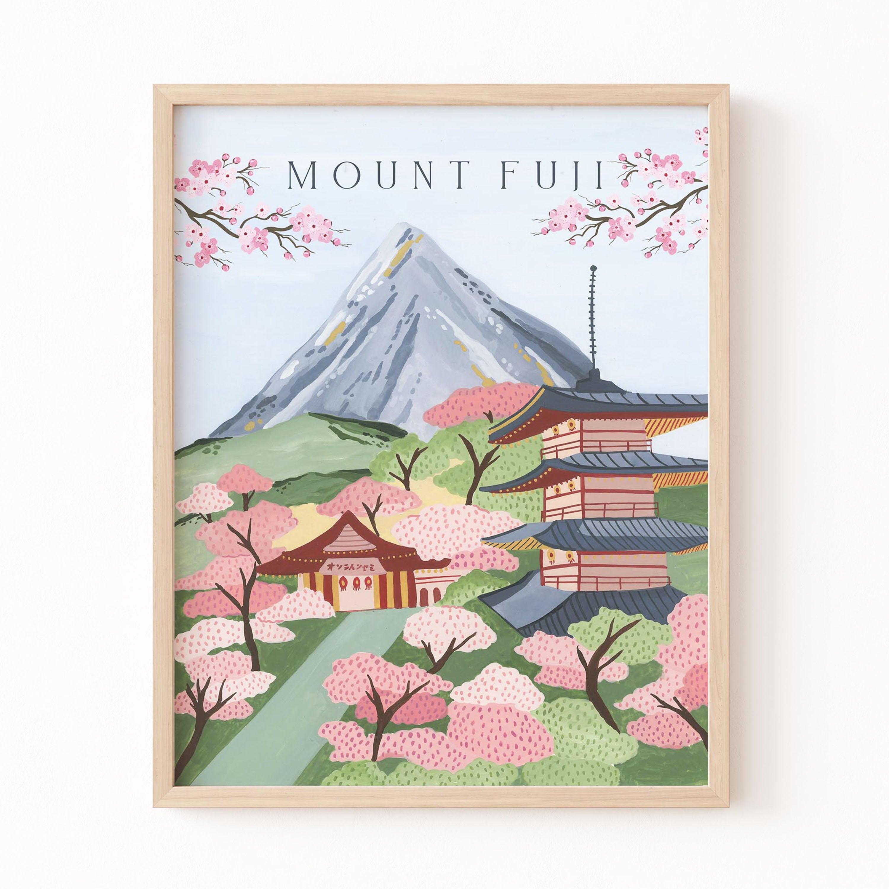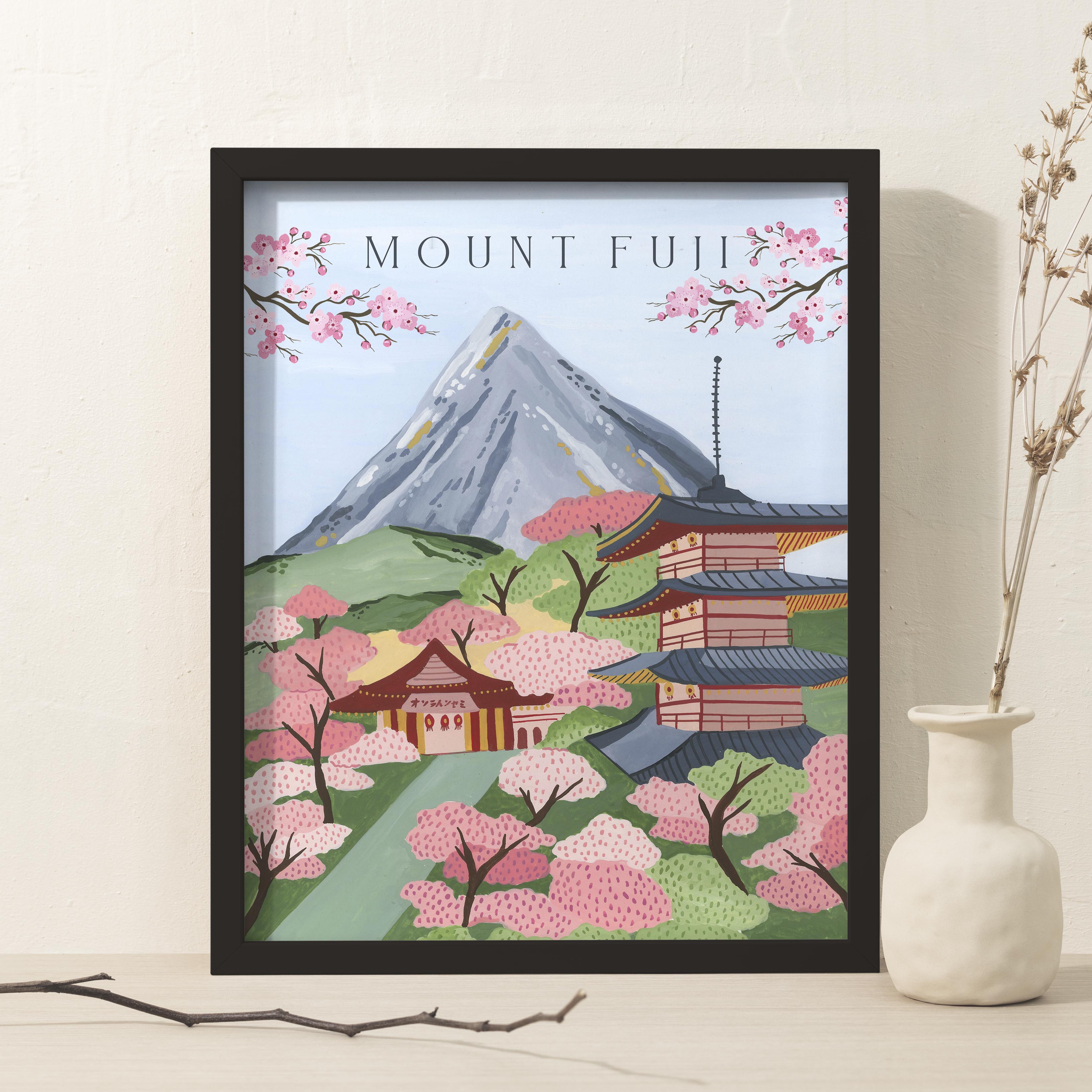 The painting features the majestic Mount Fuji, one of Japan's most famous landmarks and a symbol of Japan's rich culture and history. The portrayal of the mountain in the painting captures its serene and powerful essence, with its snow-capped peak towering over the surrounding landscape.