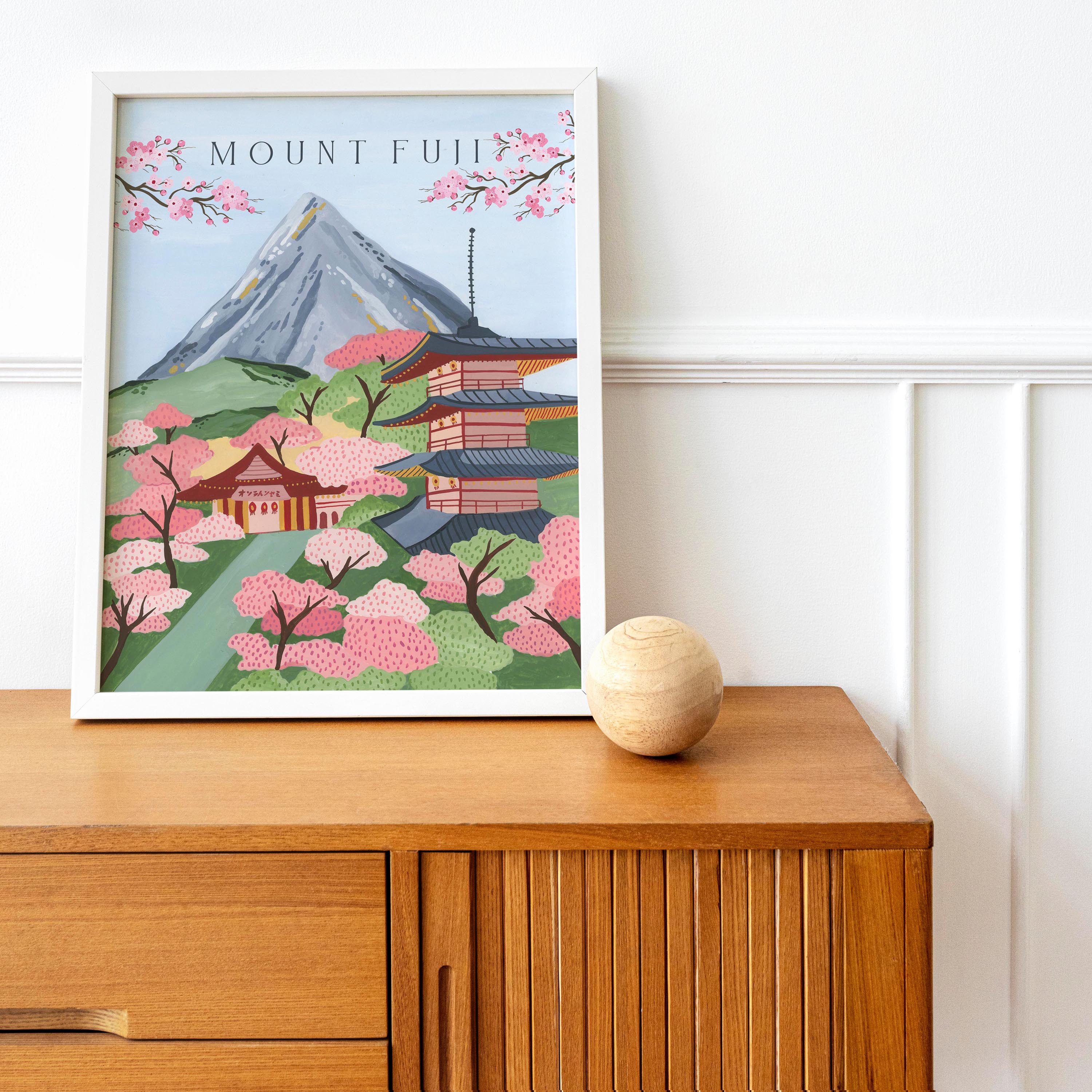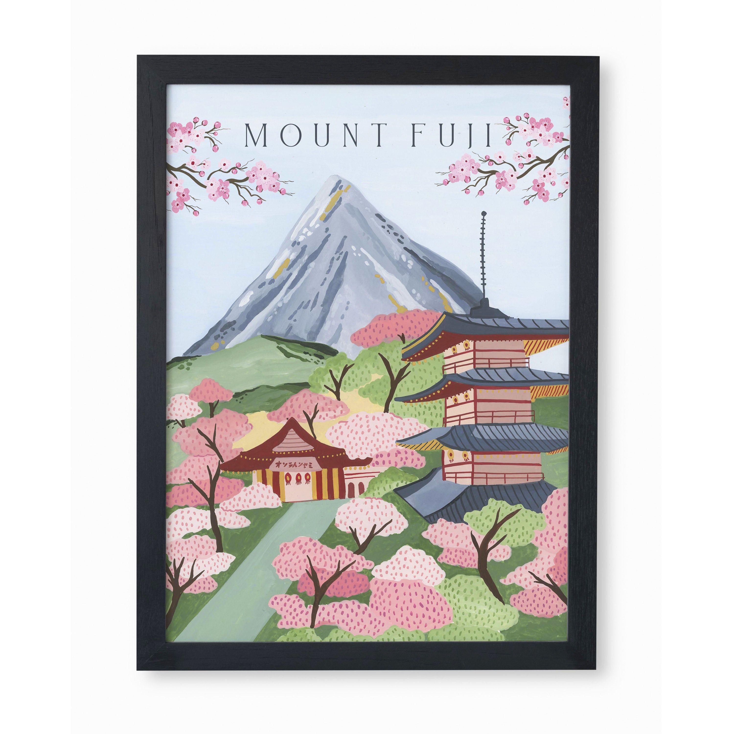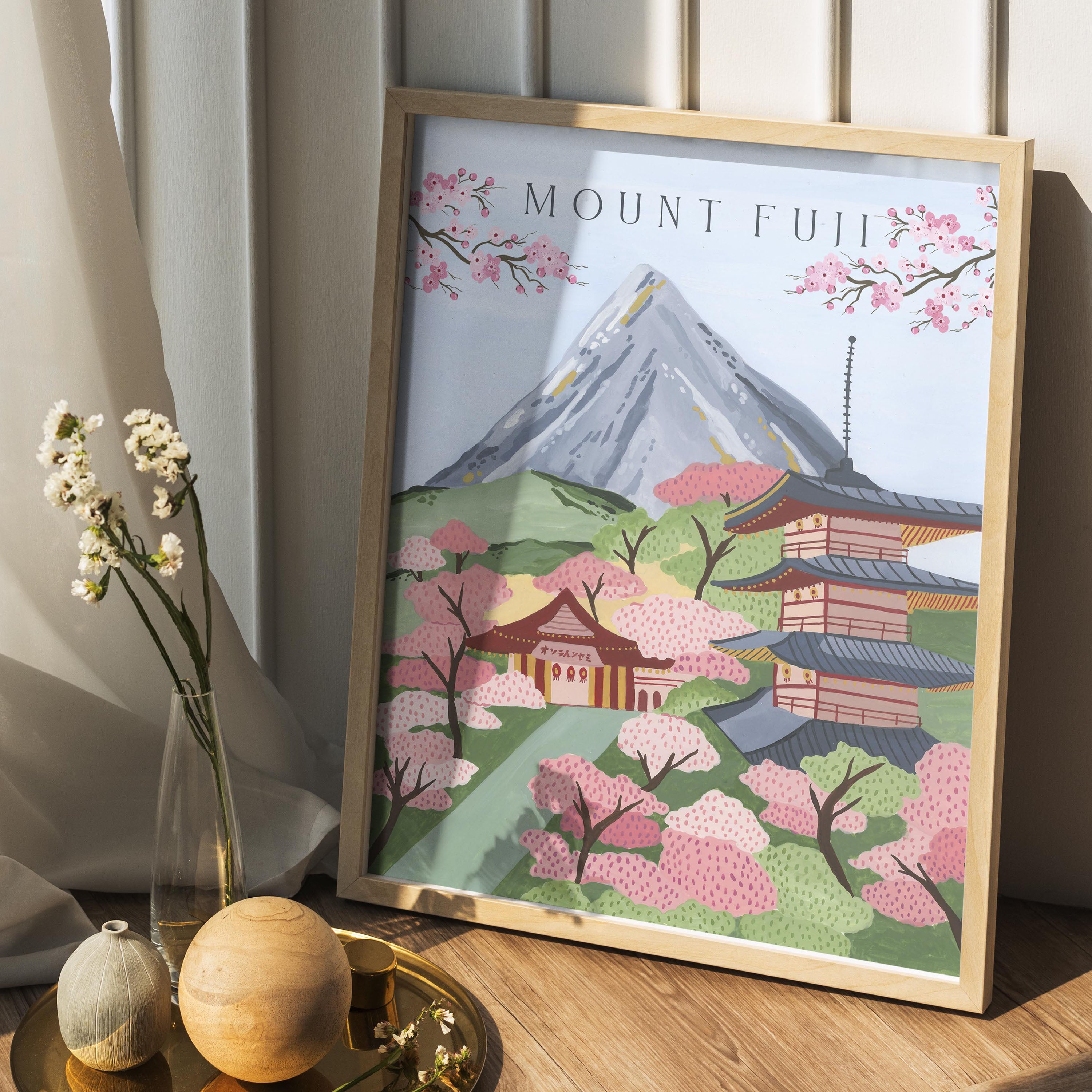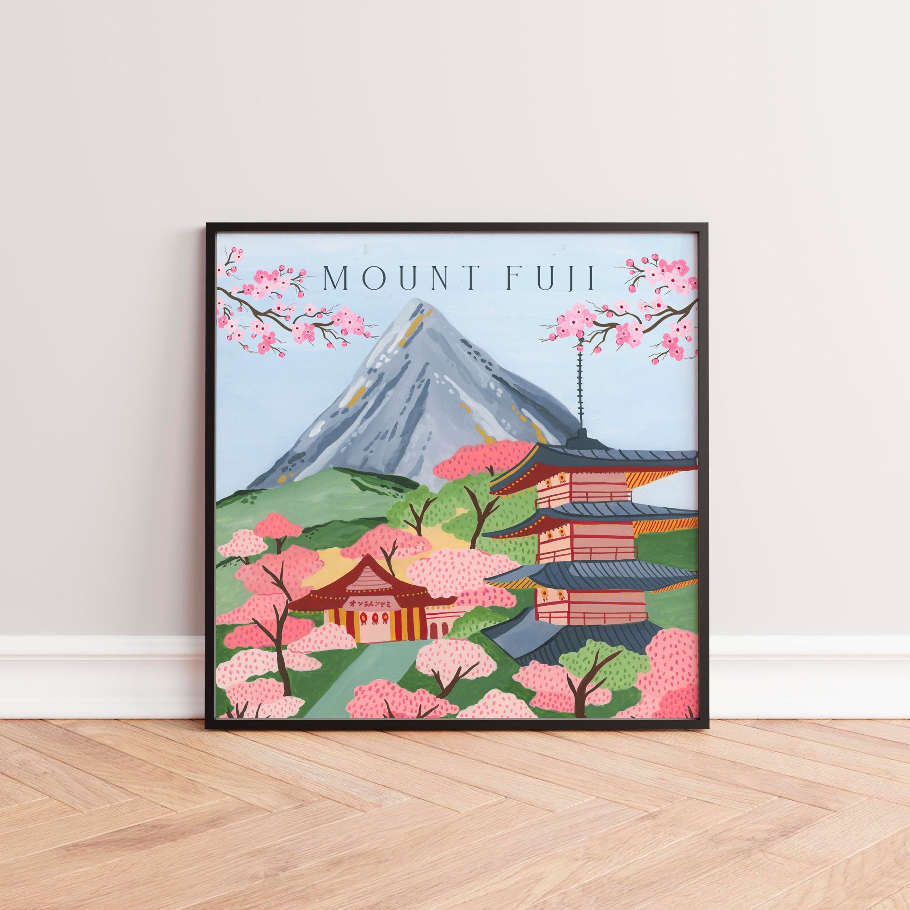 The painting features the majestic Mount Fuji, one of Japan's most famous landmarks and a symbol of Japan's rich culture and history. The portrayal of the mountain in the painting captures its serene and powerful essence, with its snow-capped peak towering over the surrounding landscape.