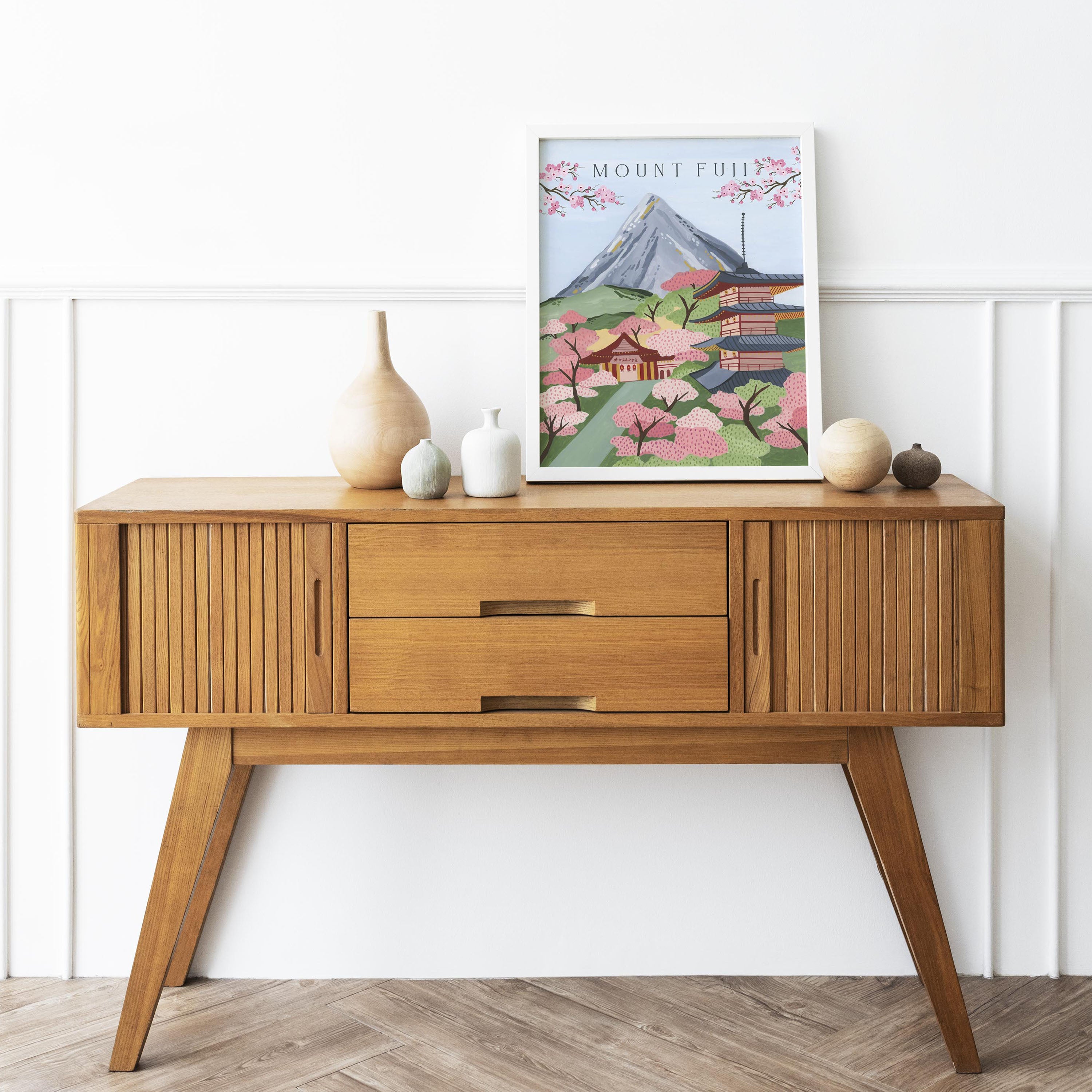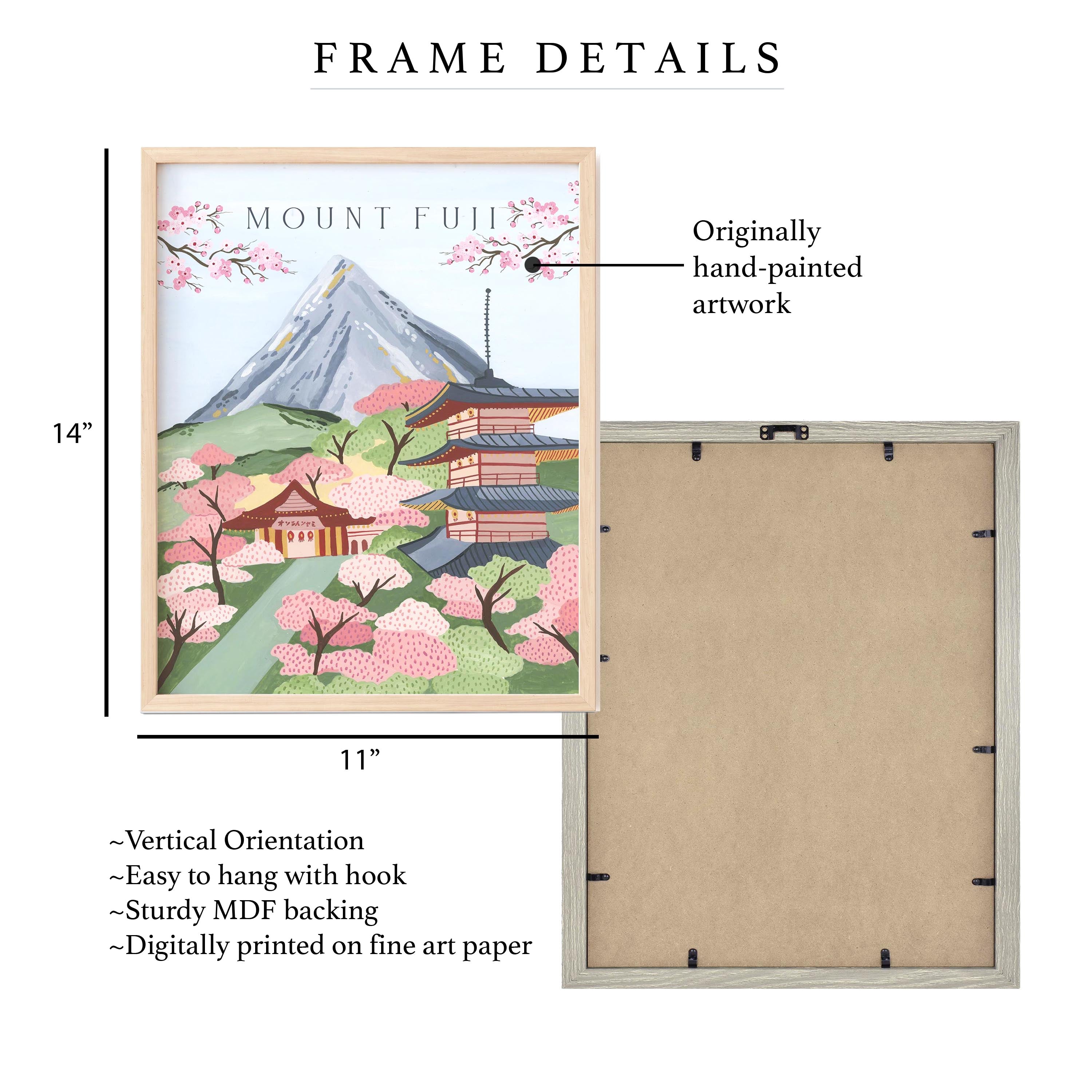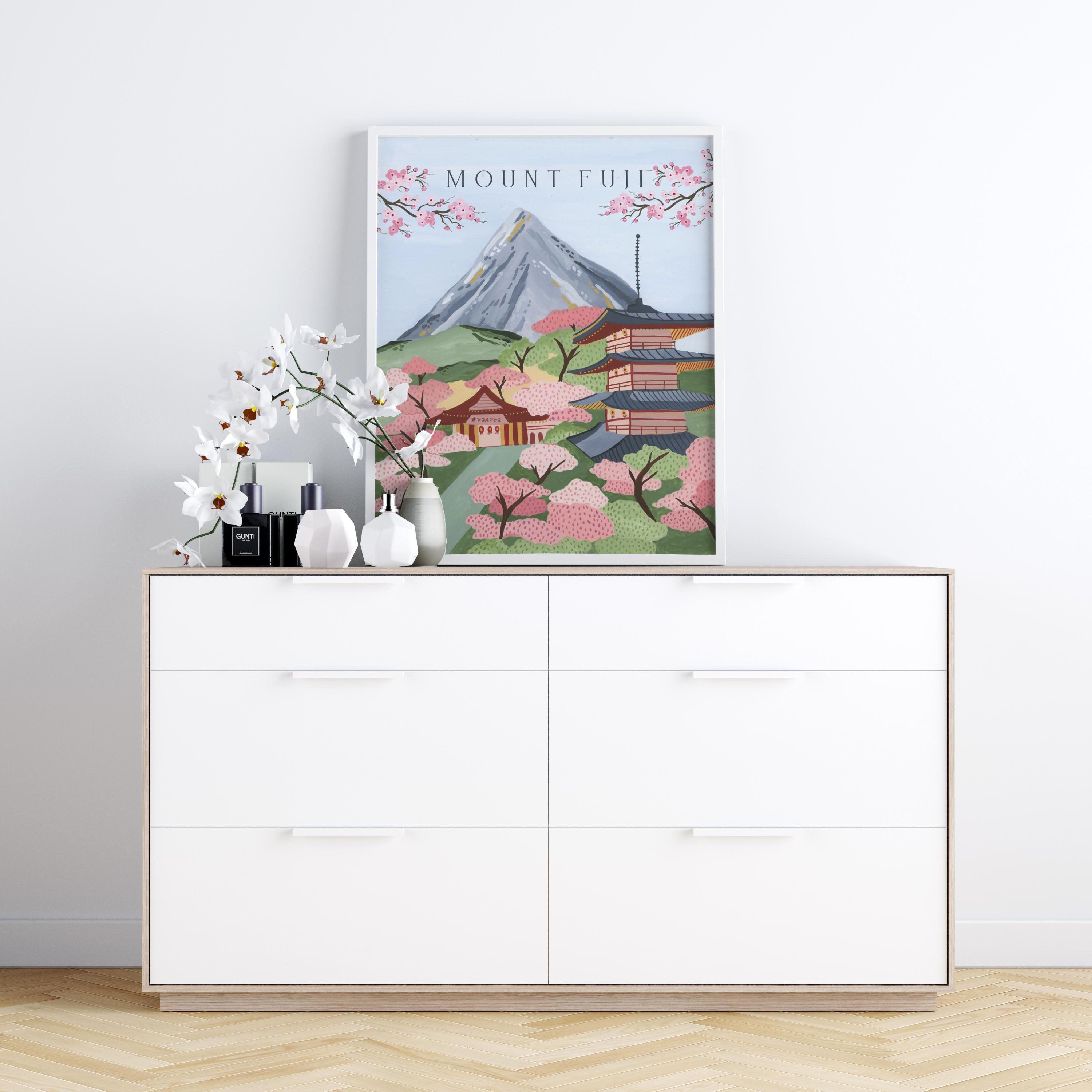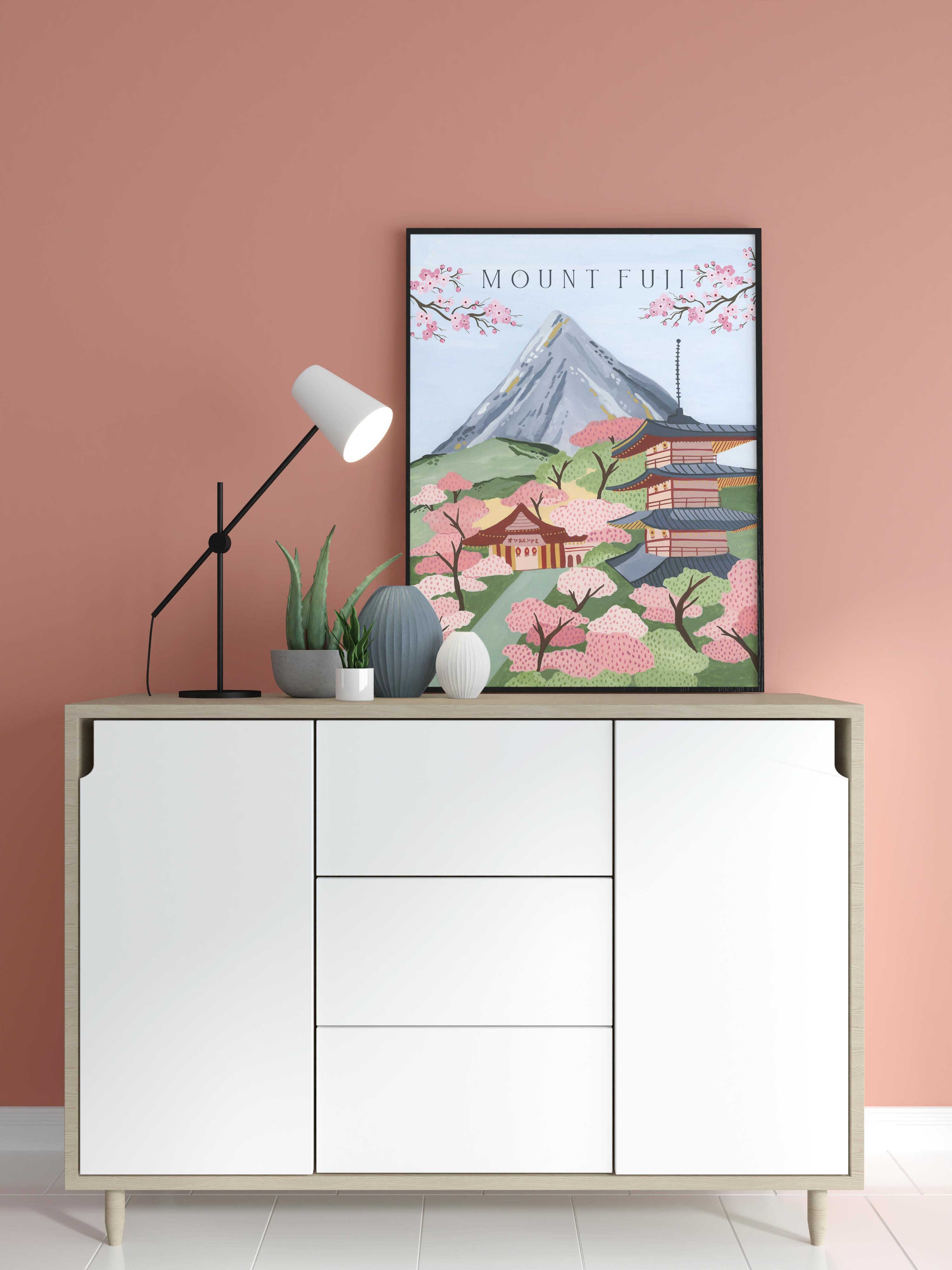 The painting features the majestic Mount Fuji, one of Japan's most famous landmarks and a symbol of Japan's rich culture and history. The portrayal of the mountain in the painting captures its serene and powerful essence, with its snow-capped peak towering over the surrounding landscape.