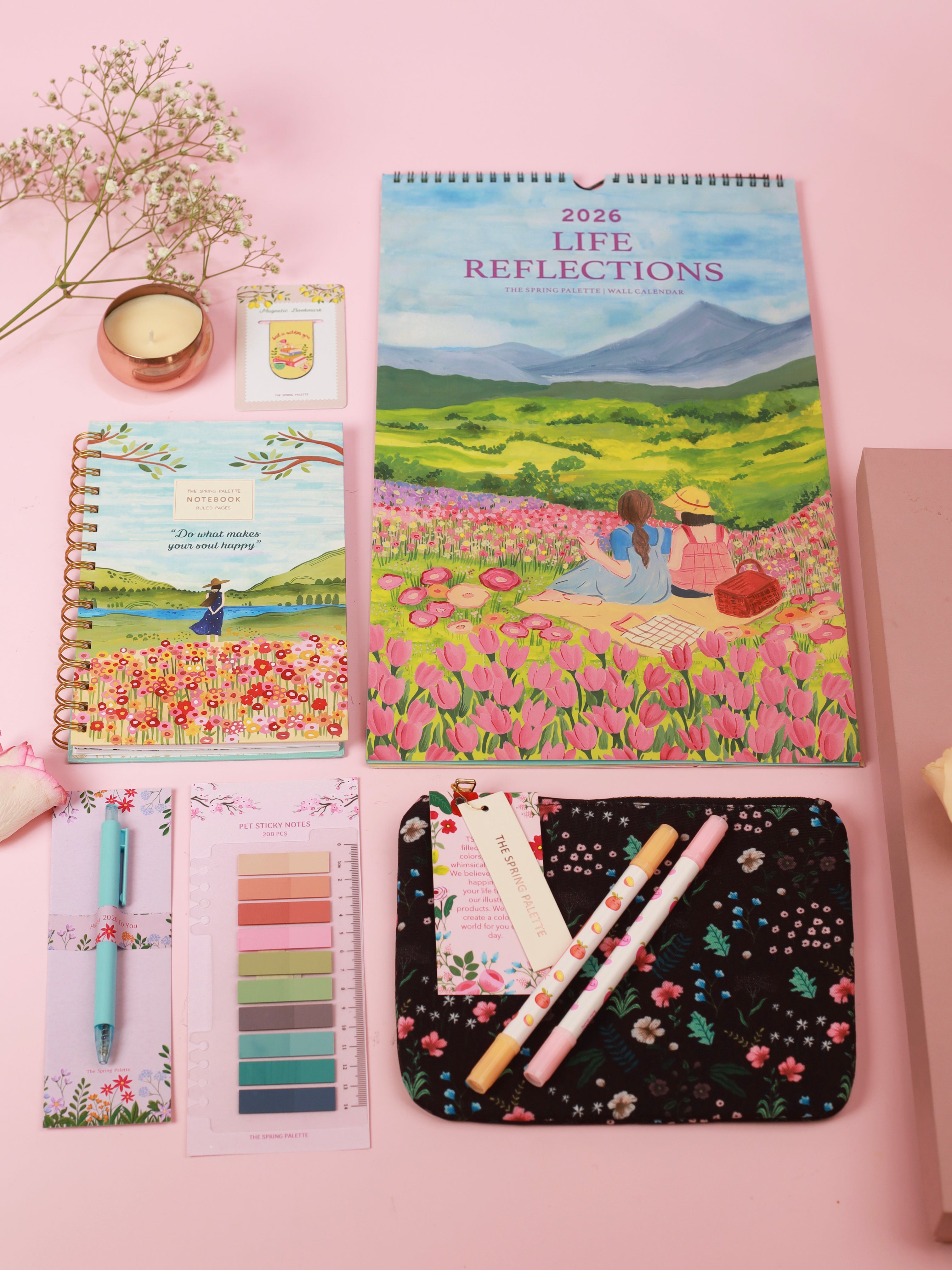 This beautifully curated Happiness Gift Box is perfect for dreamers, planners, explorers, and anyone who finds joy in wanderlust. Packed with thoughtfully illustrated goodies, it features the 2026 Travel Wall Calendar, charming notebooks, scenic postcards, pastel sticky notes, vibrant bookmarks, a travel themed framed artwork, luggage tag, and playful sticker sheet. Each item is designed to spark creativity and bring the magic of new destinations into everyday moments.
