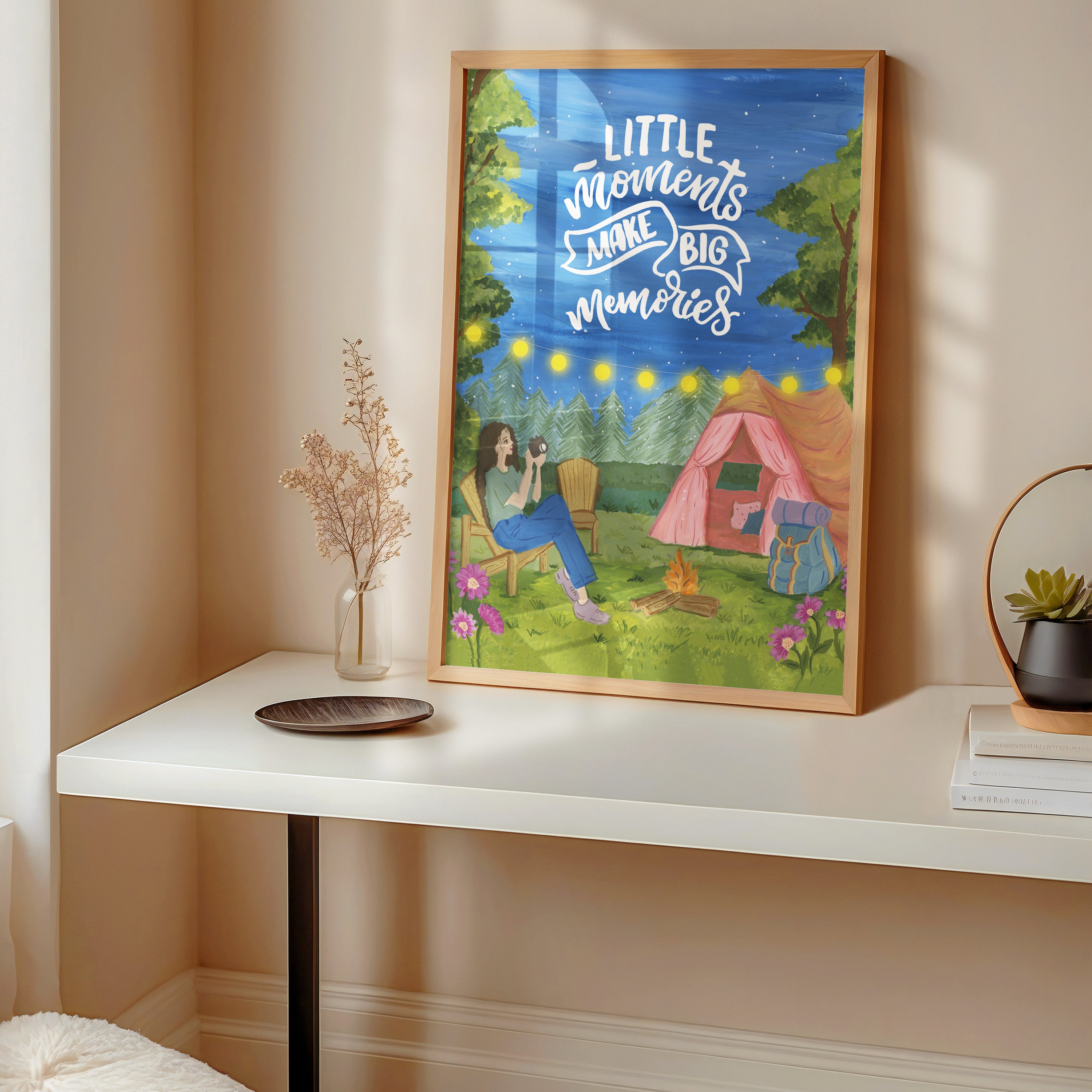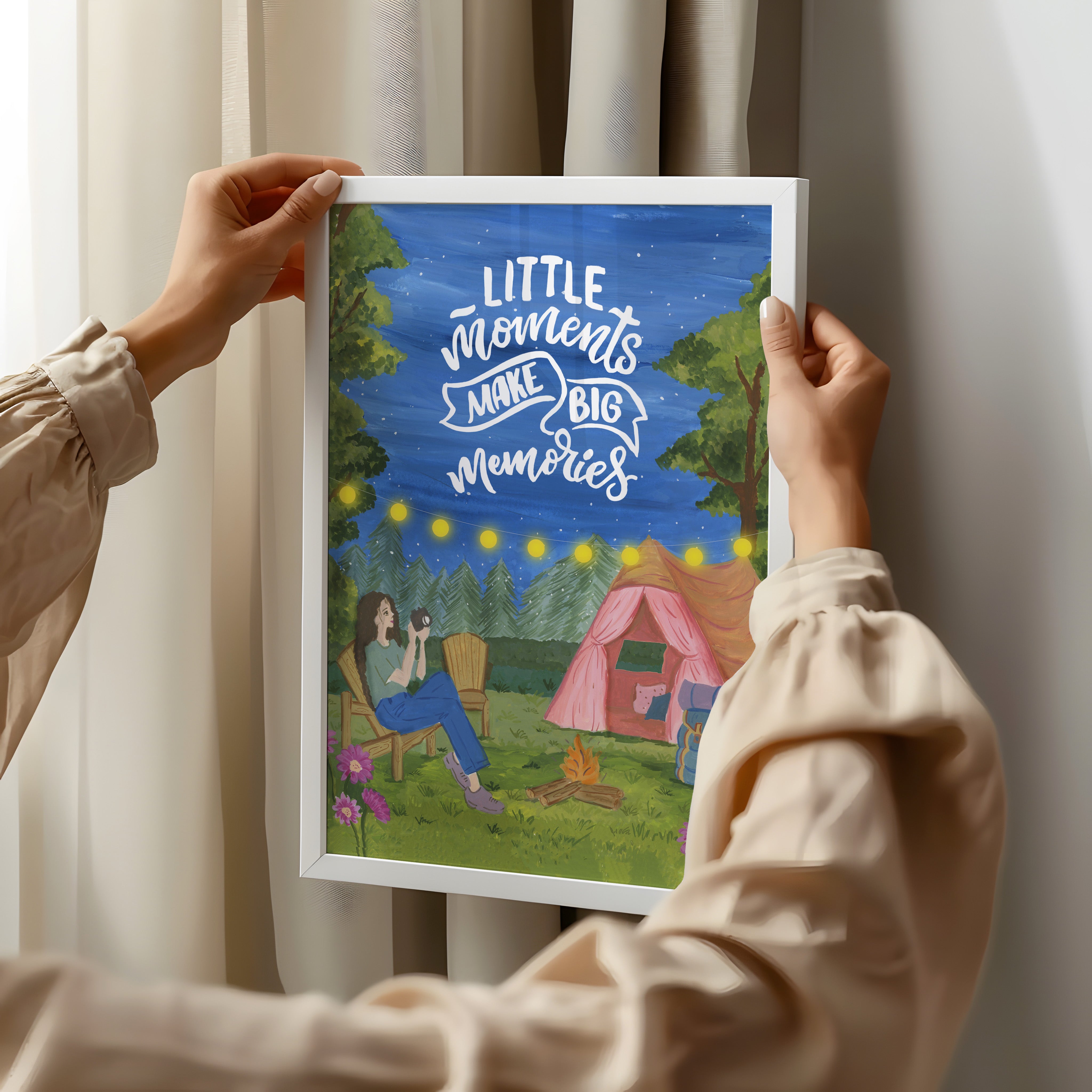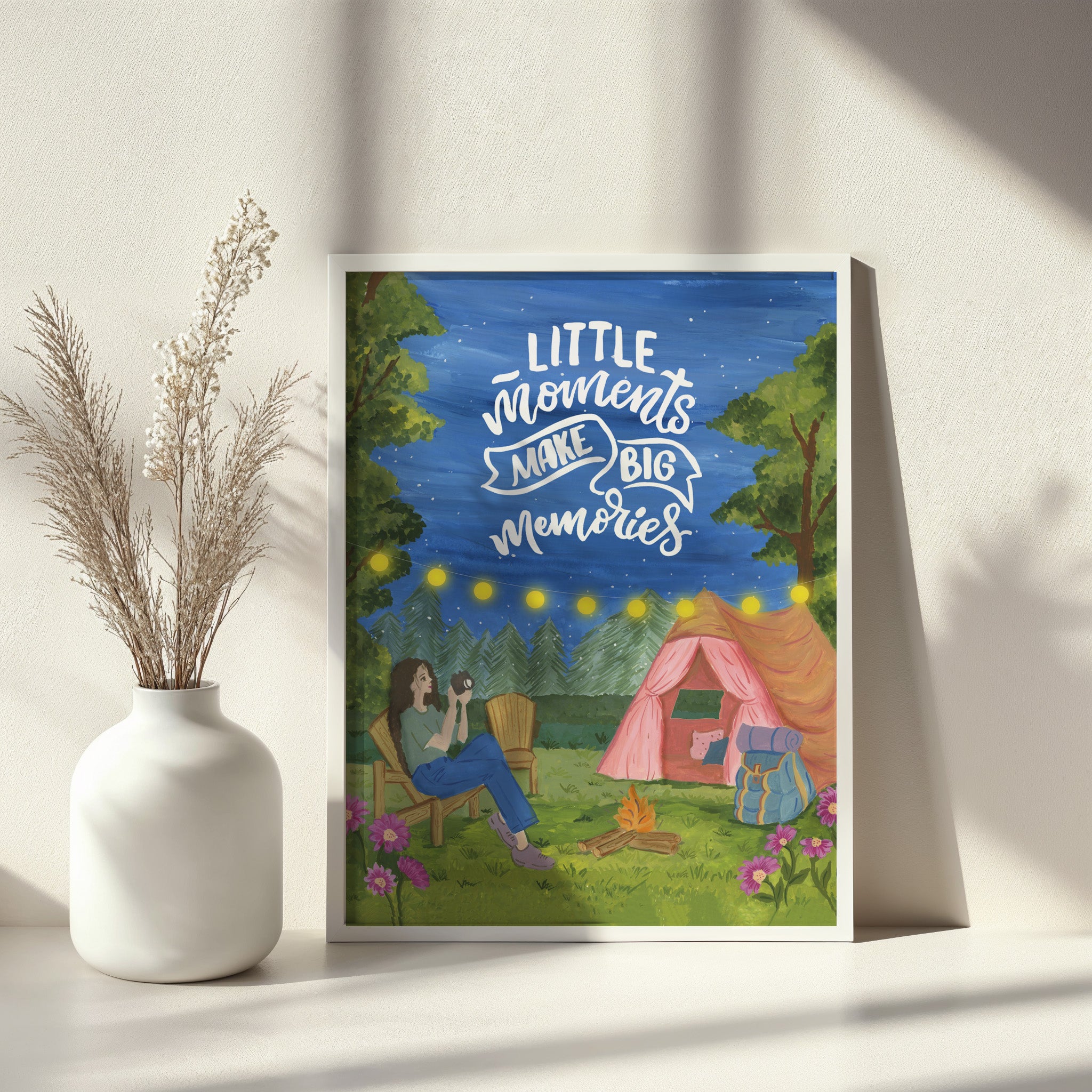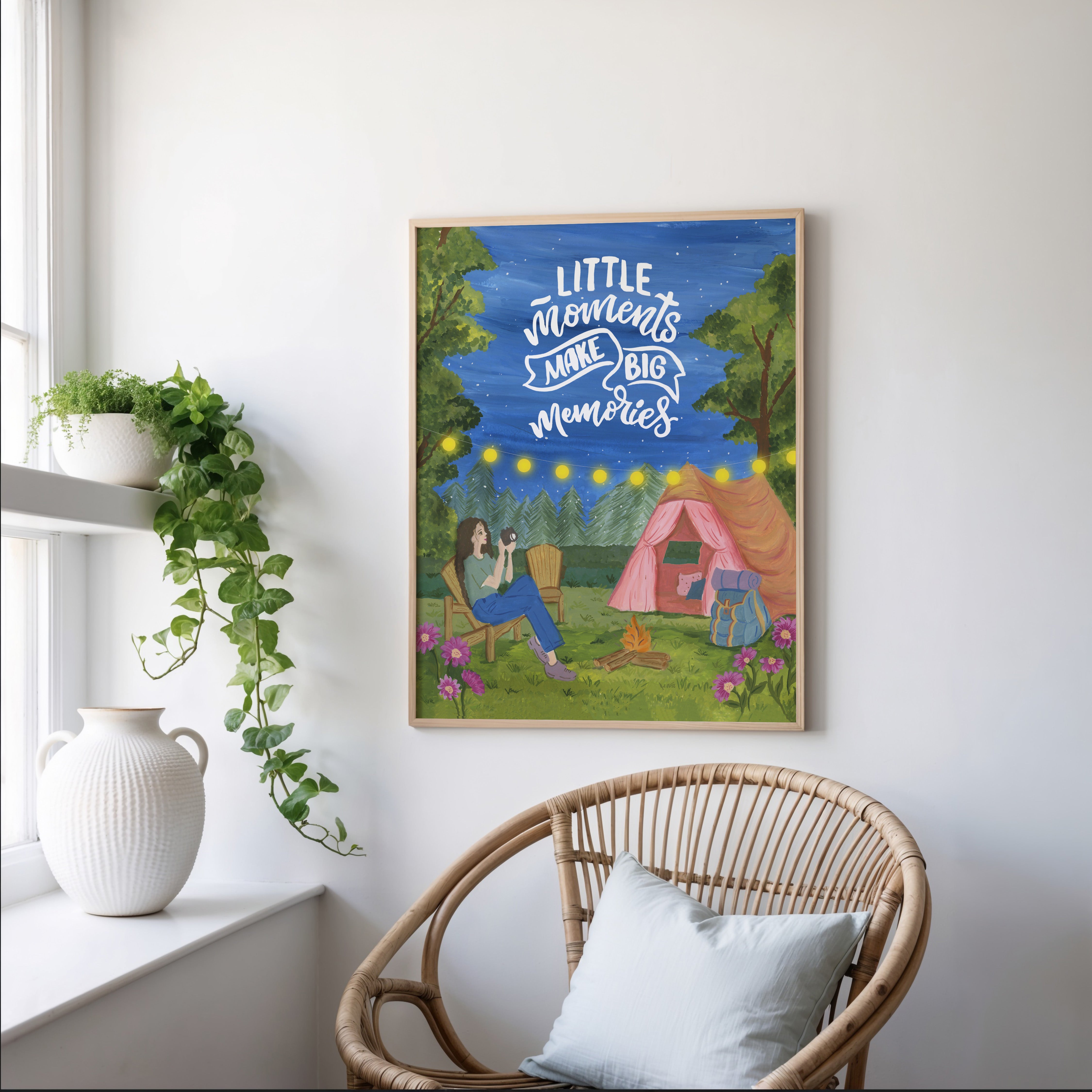 The artwork portrays a serene scene where a woman, seated comfortably amidst lush greenery and vibrant blossoms, takes a moment to unwind. The soothing palette of greens, pinks, and blues evokes a sense of calm, reinforcing the importance of self-care and inner peace. The words "Little moments make big memories Wall Art" serve as a powerful affirmation, encouraging you to nurture your mind, body, and soul.
