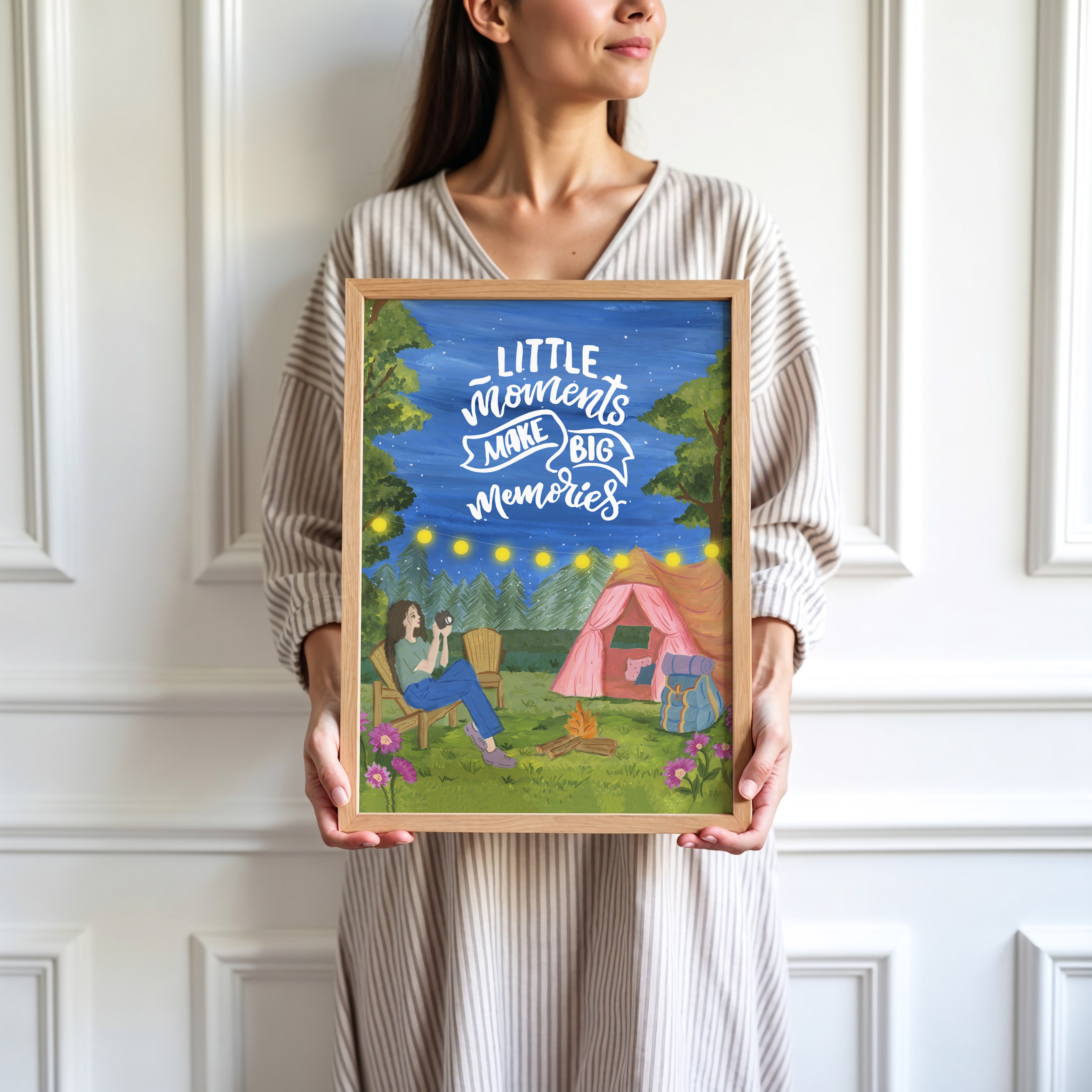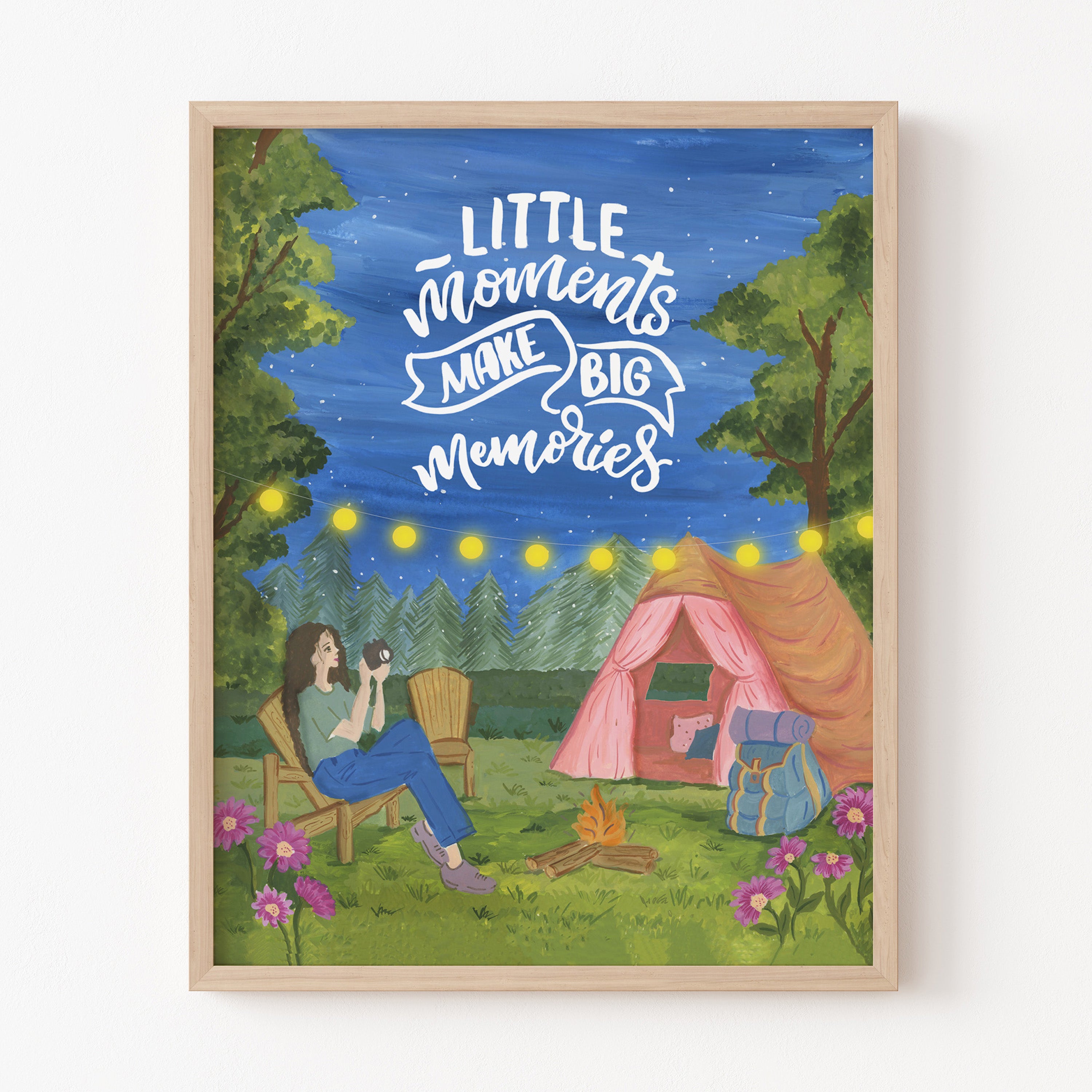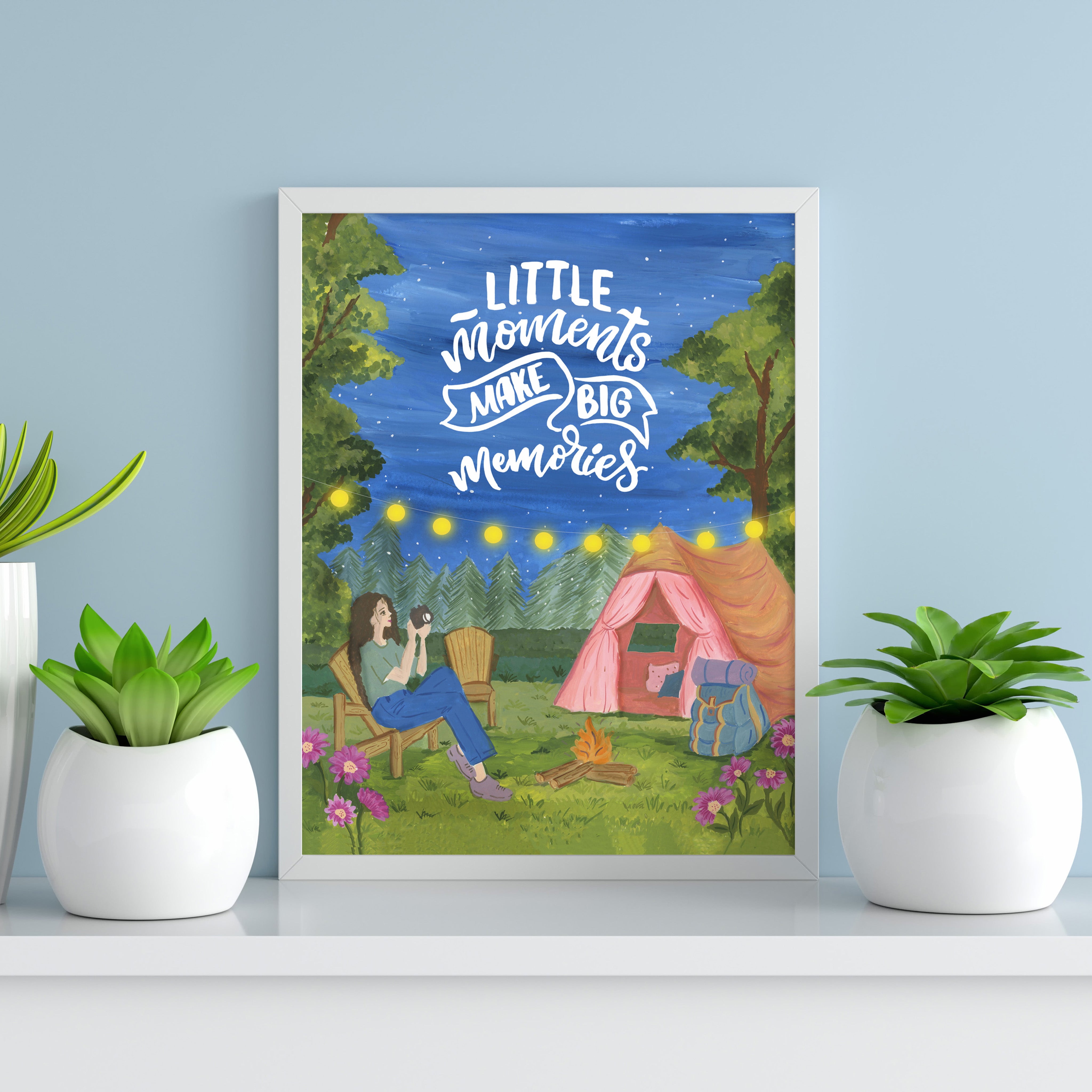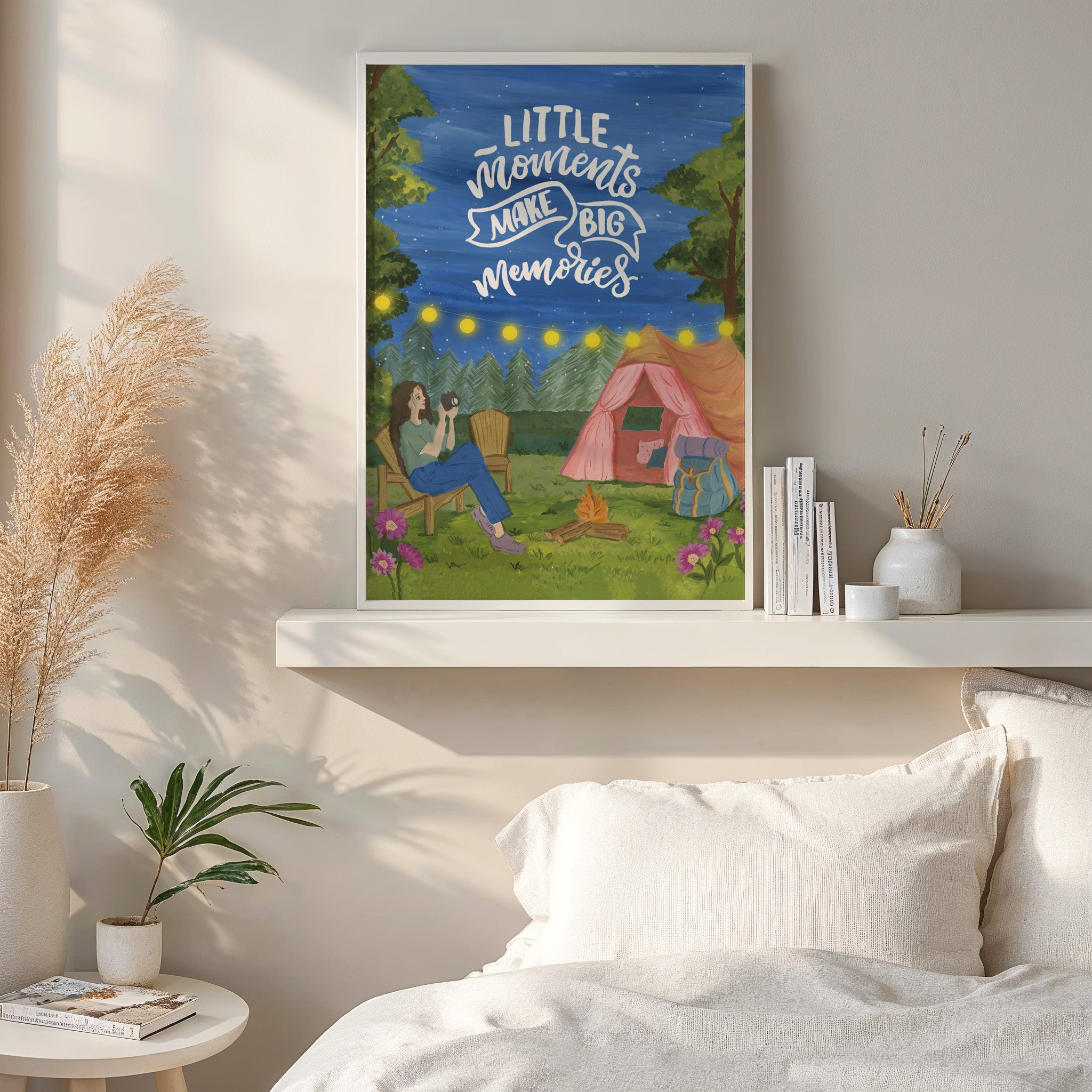 The artwork portrays a serene scene where a woman, seated comfortably amidst lush greenery and vibrant blossoms, takes a moment to unwind. The soothing palette of greens, pinks, and blues evokes a sense of calm, reinforcing the importance of self-care and inner peace. The words "Little moments make big memories Wall Art" serve as a powerful affirmation, encouraging you to nurture your mind, body, and soul.
