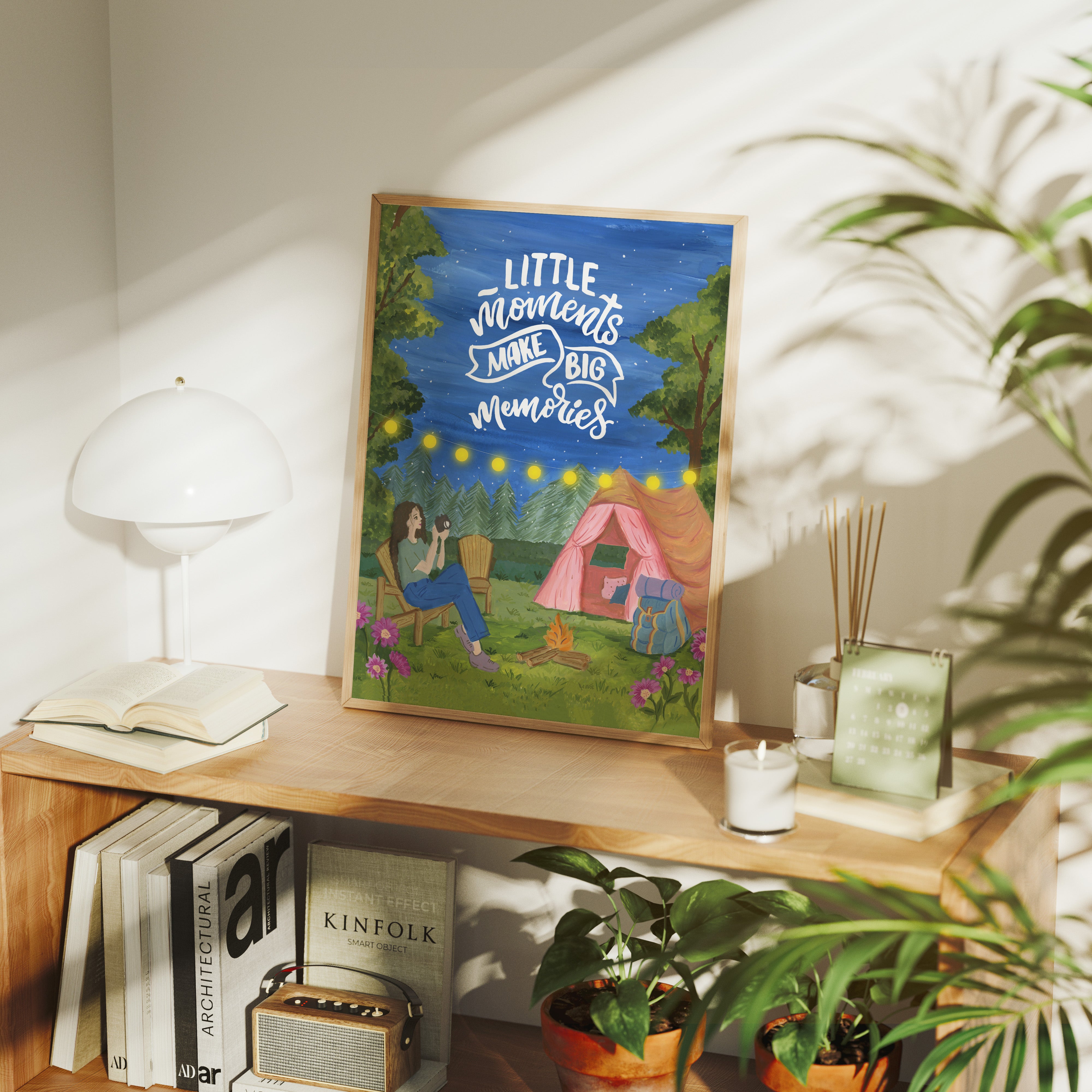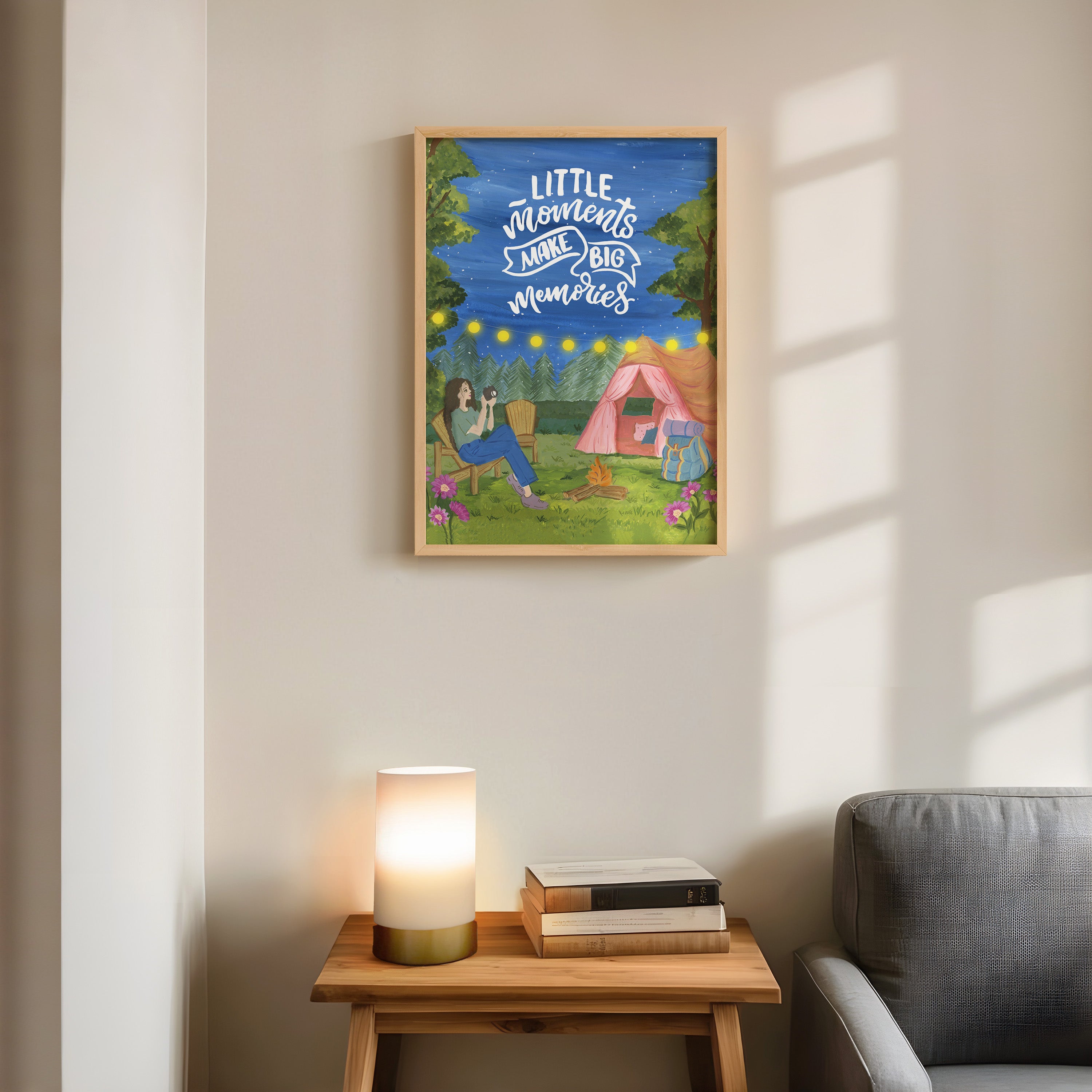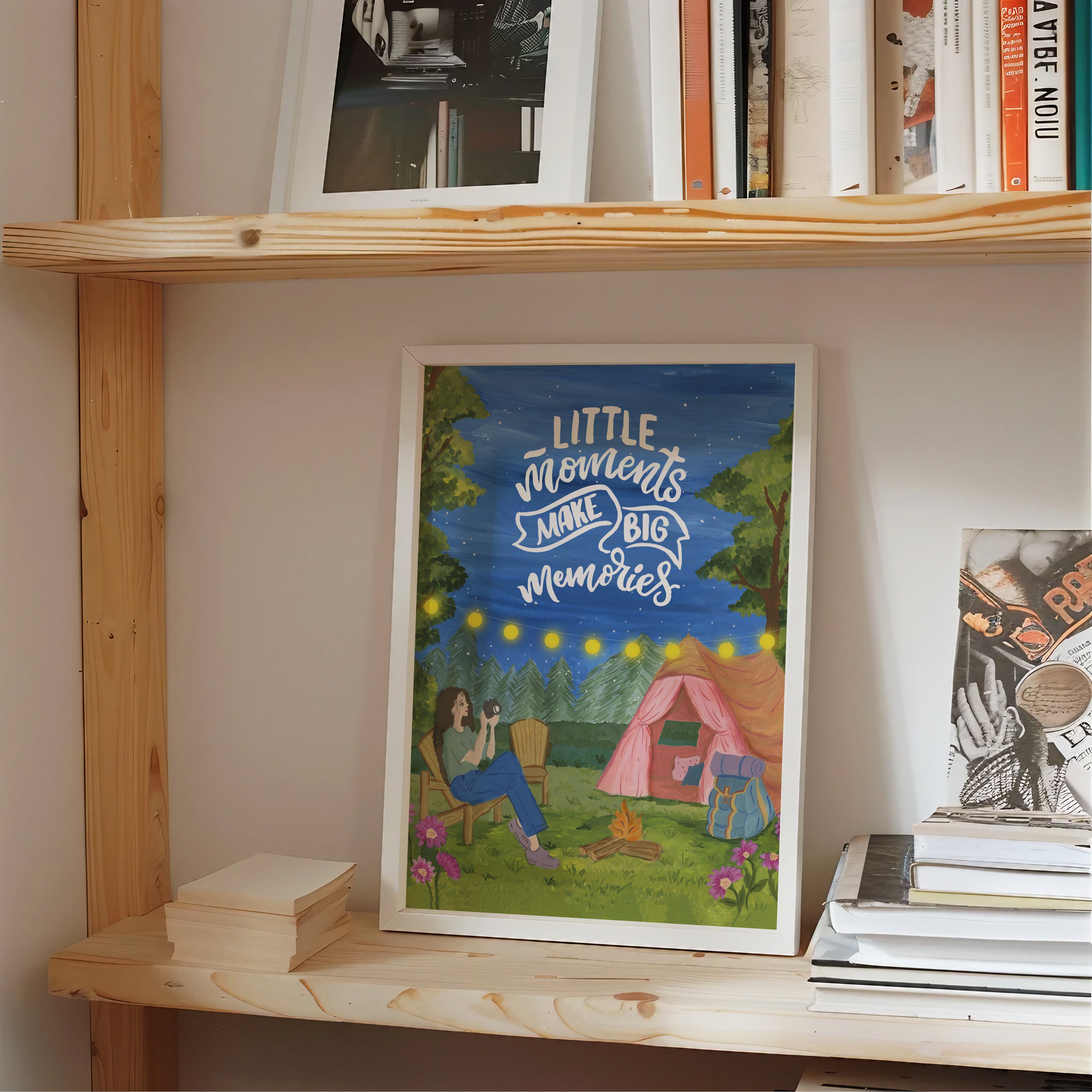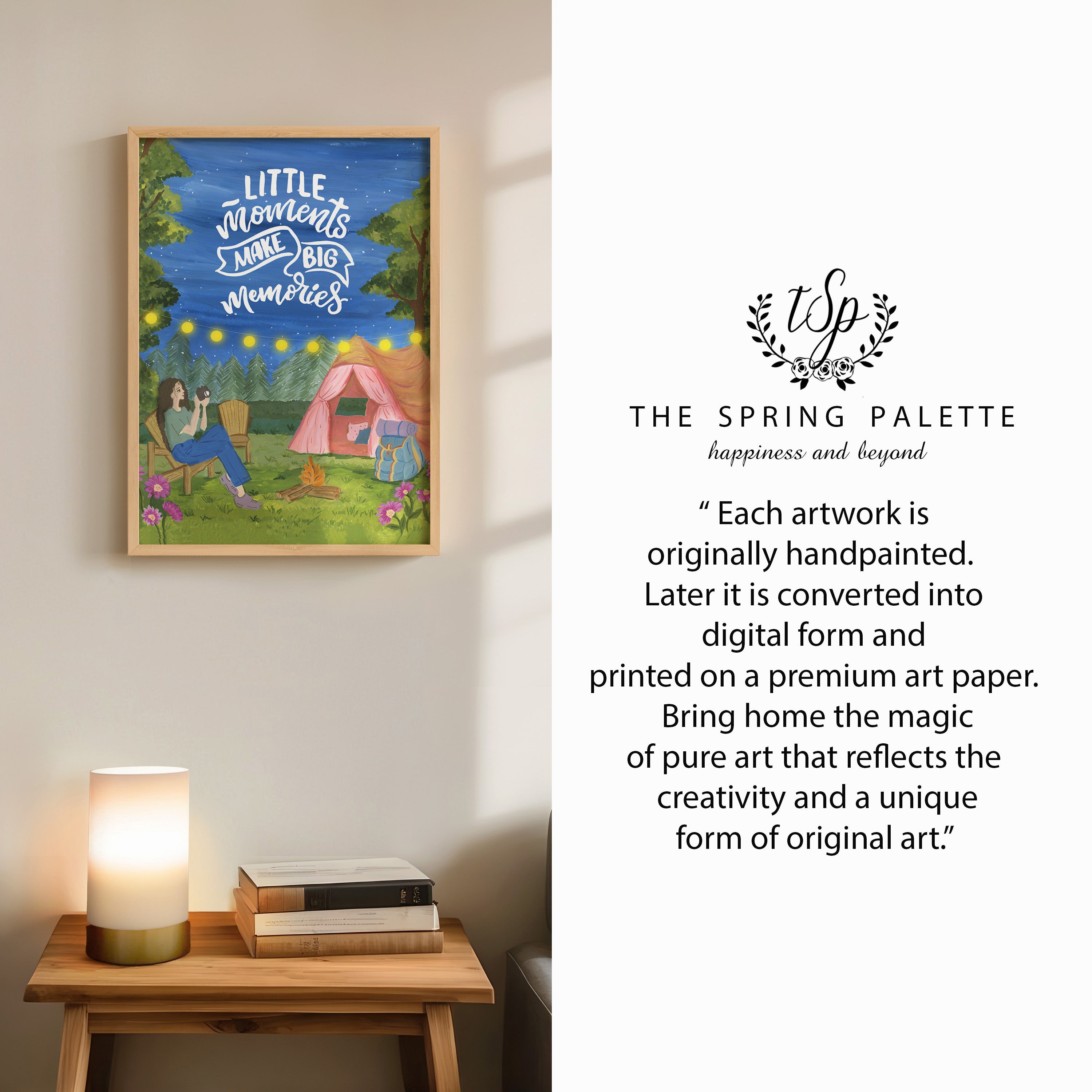 The artwork portrays a serene scene where a woman, seated comfortably amidst lush greenery and vibrant blossoms, takes a moment to unwind. The soothing palette of greens, pinks, and blues evokes a sense of calm, reinforcing the importance of self-care and inner peace. The words "Little moments make big memories Wall Art" serve as a powerful affirmation, encouraging you to nurture your mind, body, and soul.