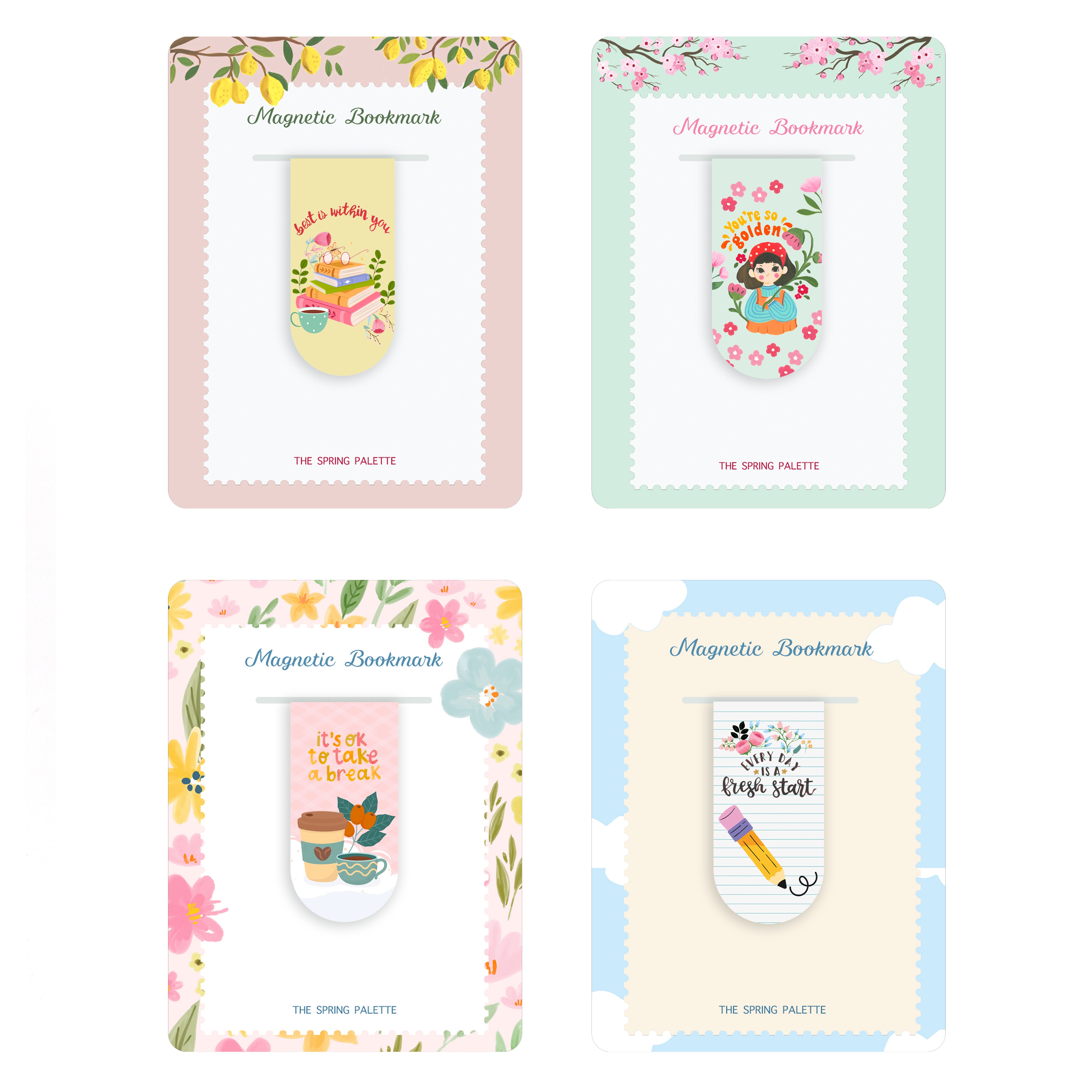 Add charm and color to your reading journey with The Spring Palette’s Magnetic Bookmarks – a set of originally hand-drawn bookmarks designed to inspire and delight. With vibrant artwork on both sides, these bookmarks don’t just mark a page—they add a personal touch to your reading routine. Whether you're gifting a fellow book lover or treating yourself, these bookmarks bring joy, motivation, and a little magic to every flip of the page.
