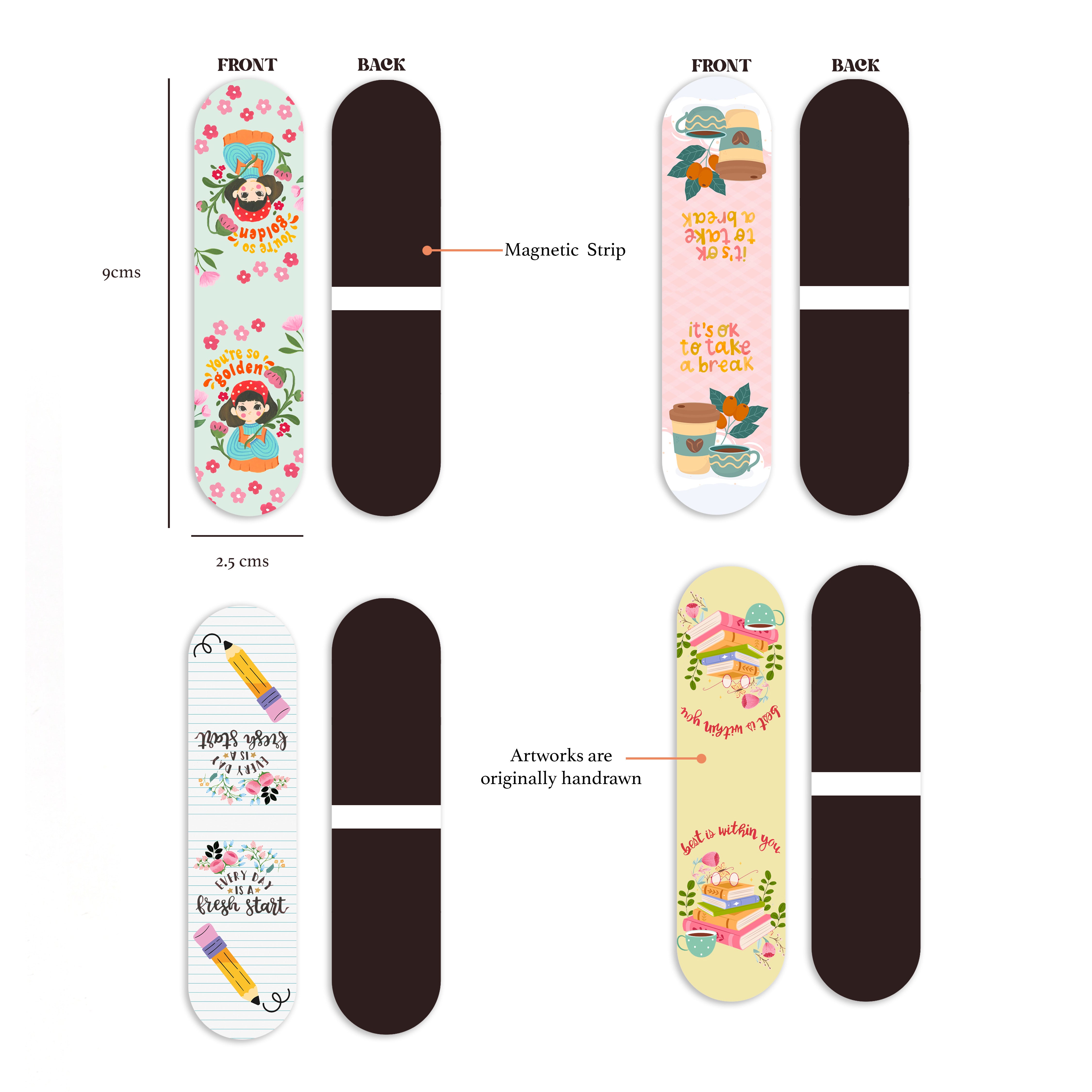 - Set of 4 Handcrafted Designs – Featuring originally hand-drawn artwork with motivational themes to brighten your day.