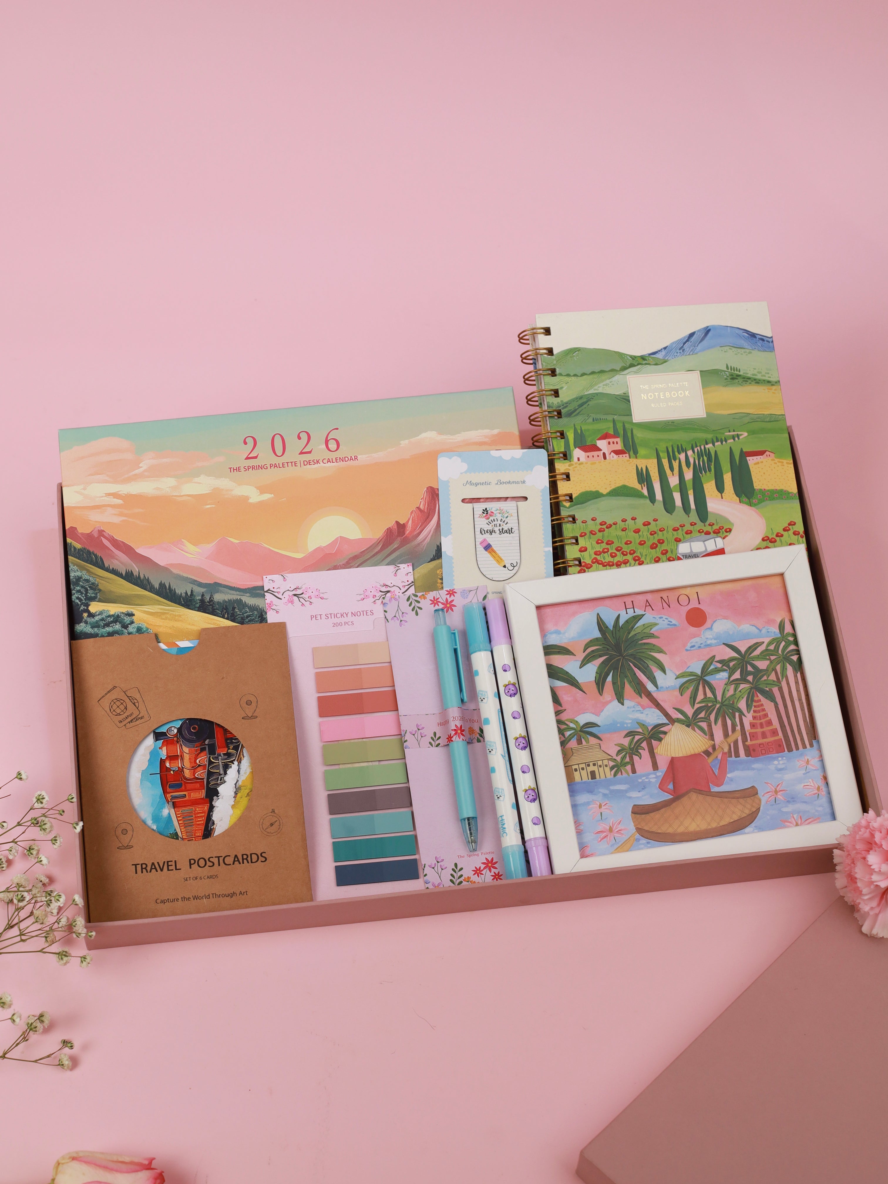 This beautifully curated Happiness Gift Box is perfect for dreamers, planners, explorers, and anyone who finds joy in wanderlust. Packed with thoughtfully illustrated goodies, it features the 2026 Travel Wall Calendar, charming notebooks, scenic postcards, pastel sticky notes, vibrant bookmarks, a travel themed framed artwork, luggage tag, and playful sticker sheet. Each item is designed to spark creativity and bring the magic of new destinations into everyday moments.