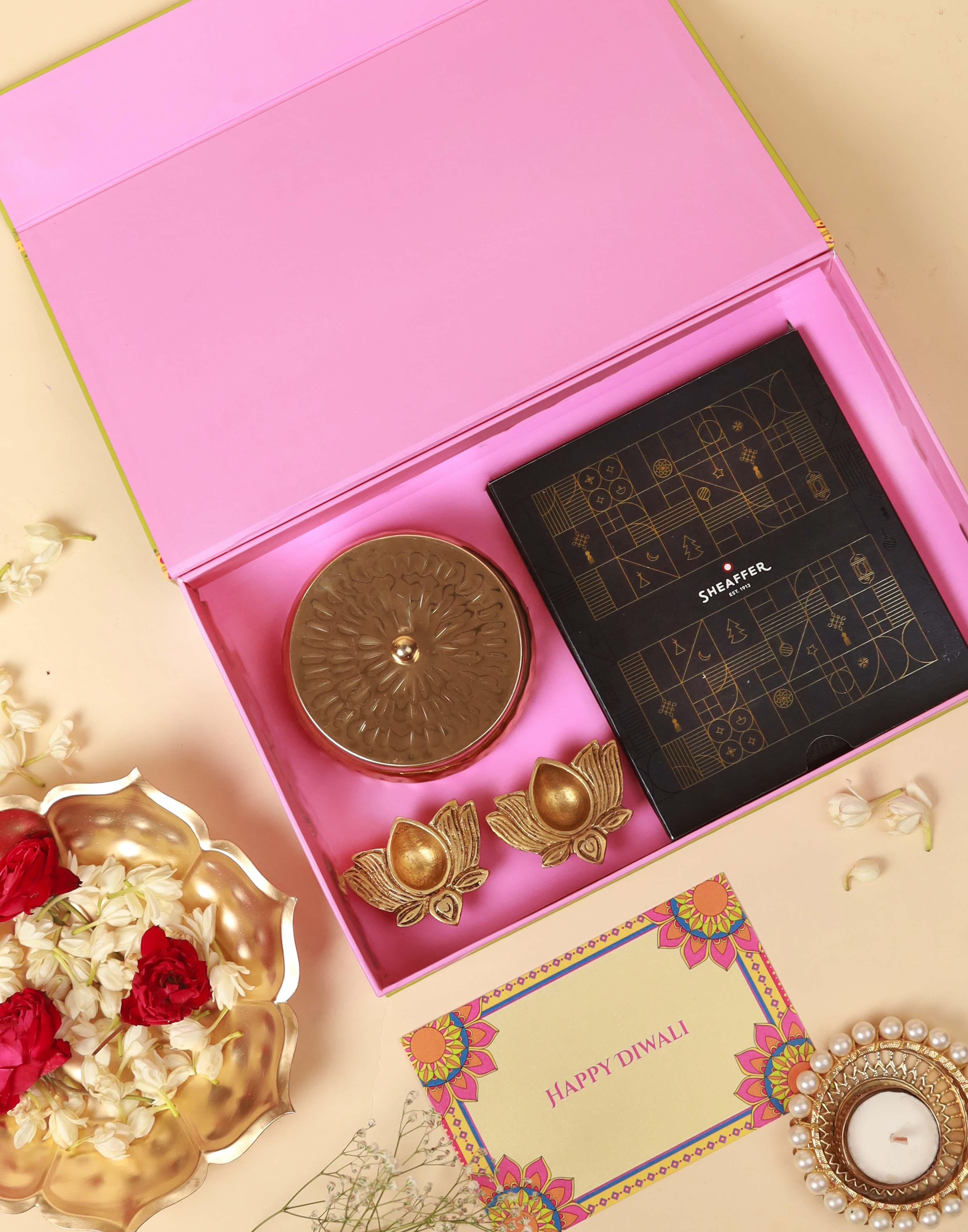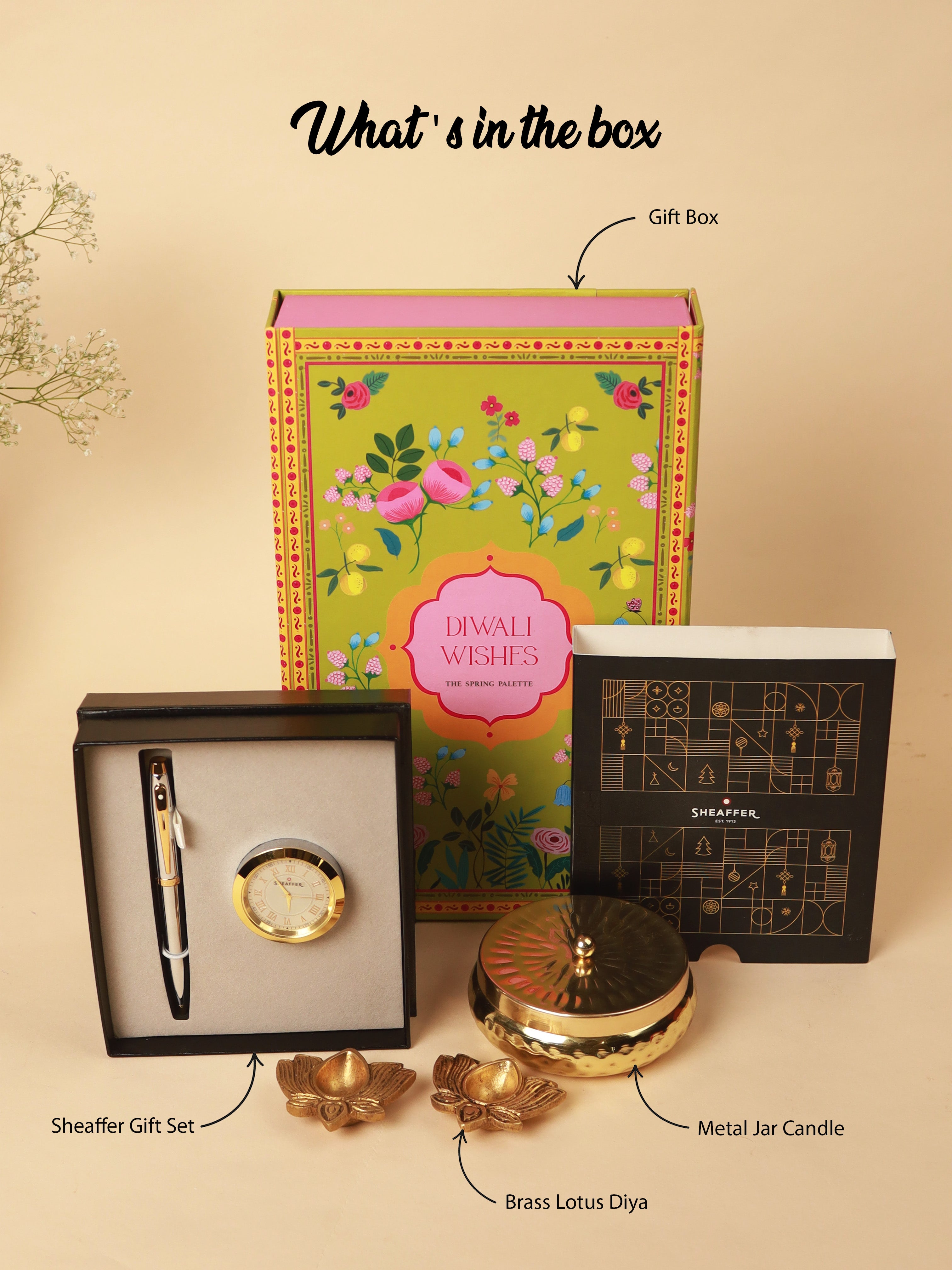 Make Diwali special with The Spring Palette’s elegant hamper, featuring artisanal diyas, a golden jar, and a premium Sheaffer gift set in a vibrant festive box. ✨🌸