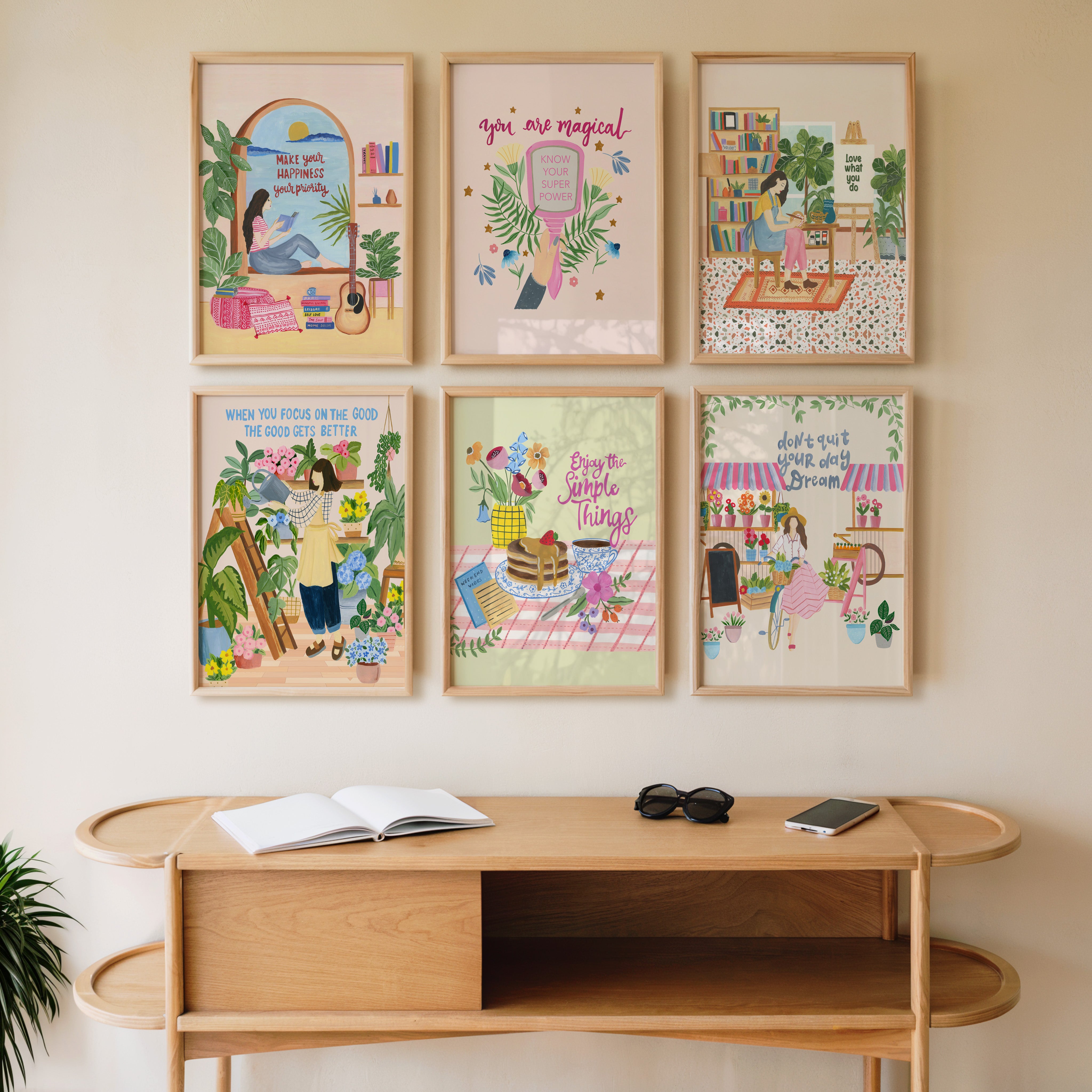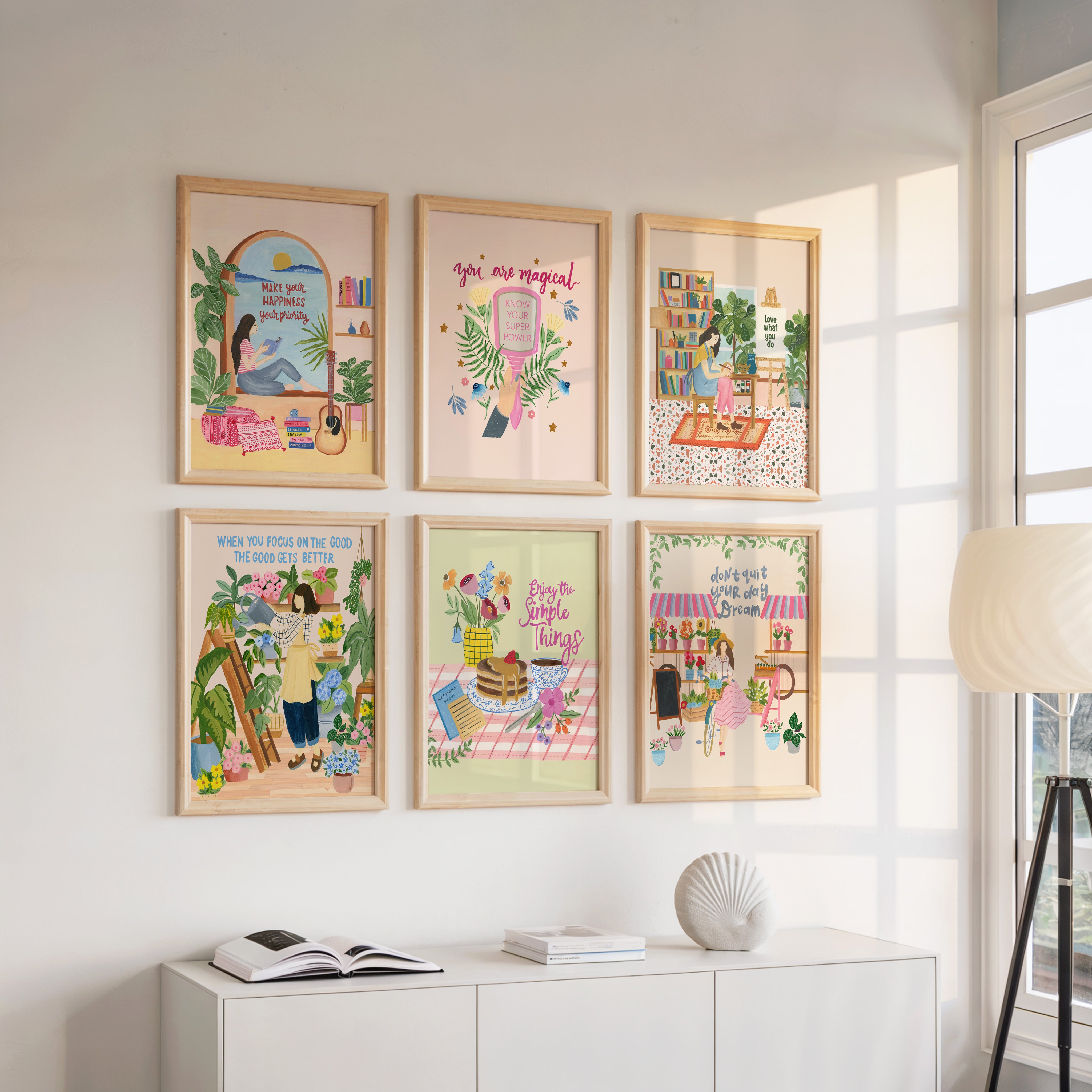 This joyful gallery art set brings together uplifting affirmations, cozy interiors, blooming florals, and gentle everyday moments. Each illustration tells a story of slow living, creativity, and finding happiness in simple routines from reading corners and plant care to small rituals that brighten the day.