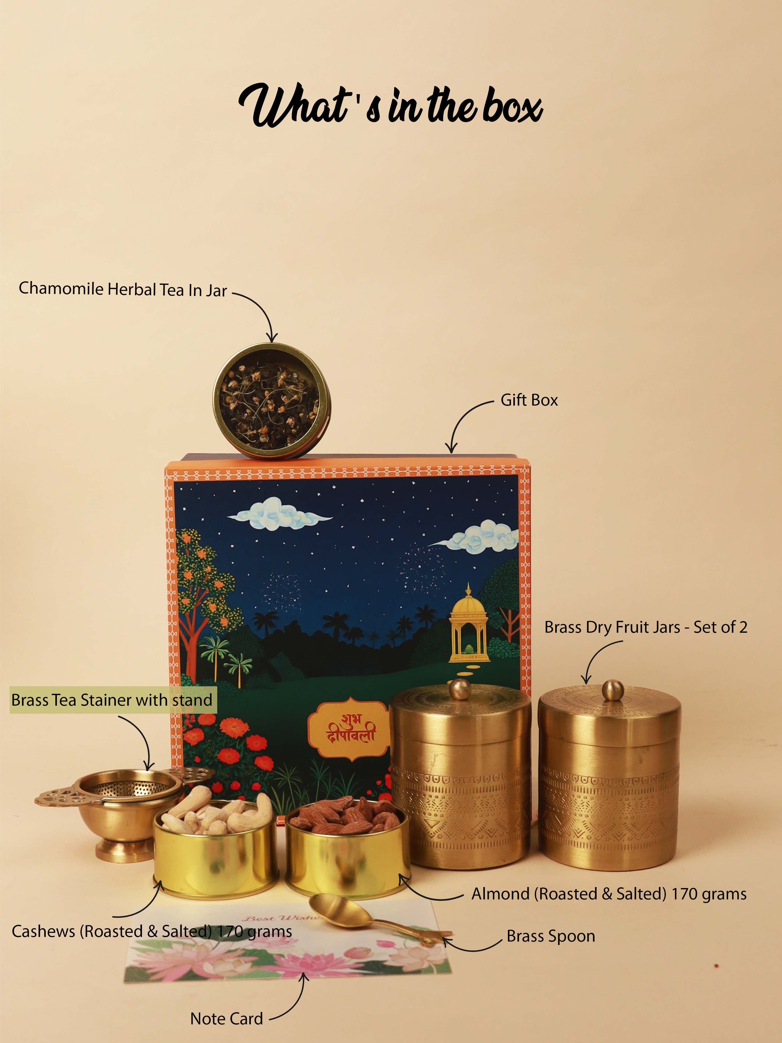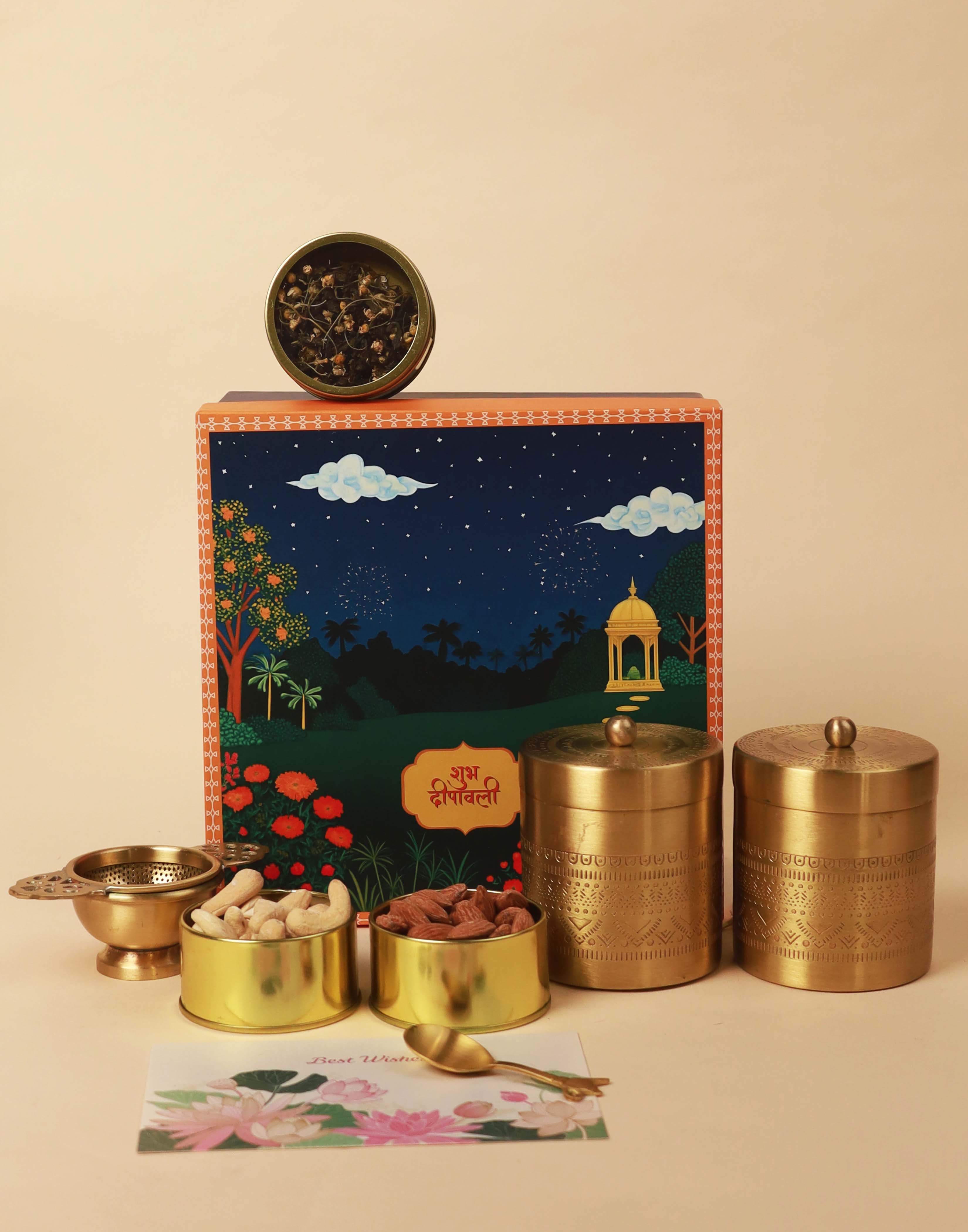 Celebrate the season of light with The Spring Palette’s luxurious Diwali hamper, featuring ornate brass jars, a tea infuser set, and premium dry fruits in a festive keepsake box. ✨🌼
