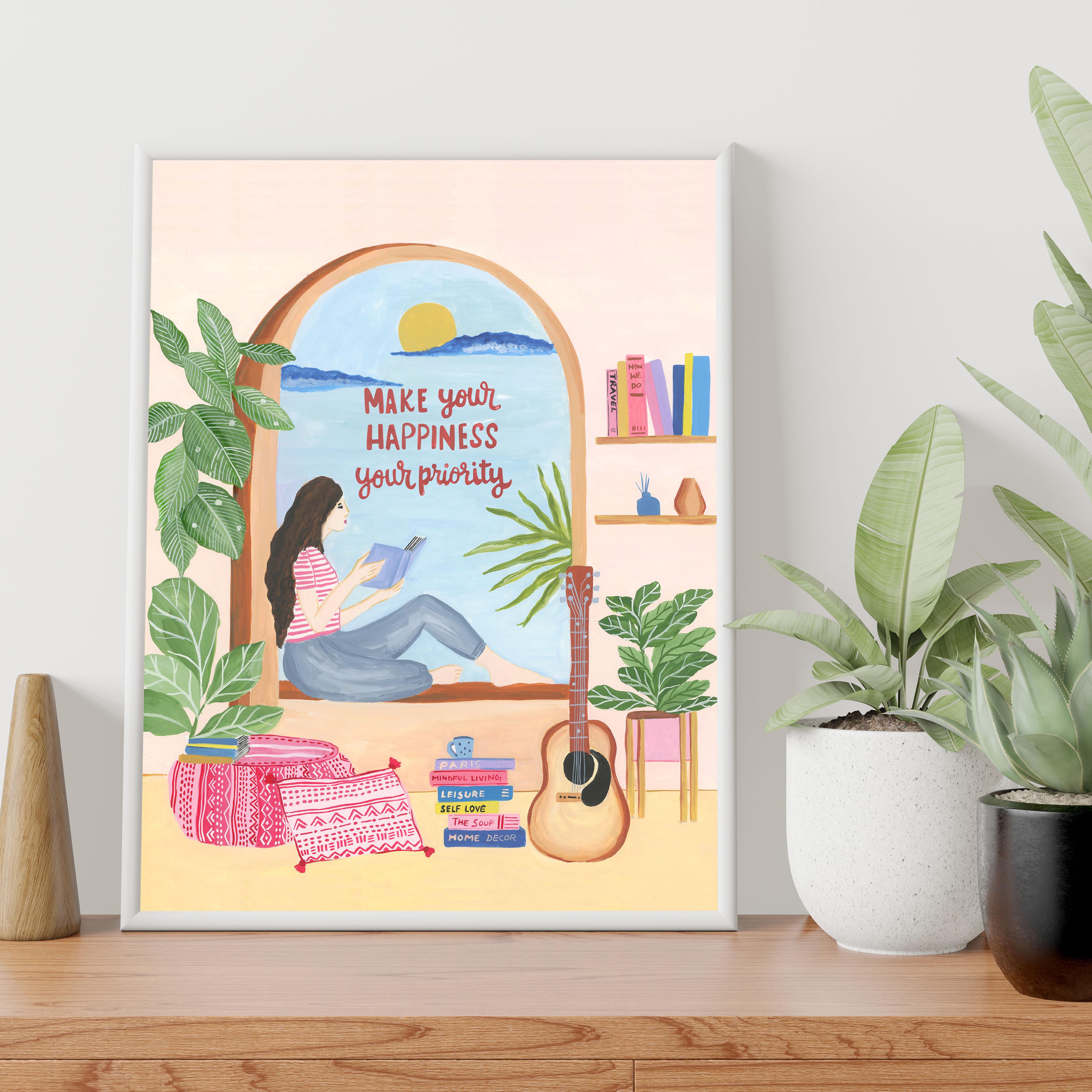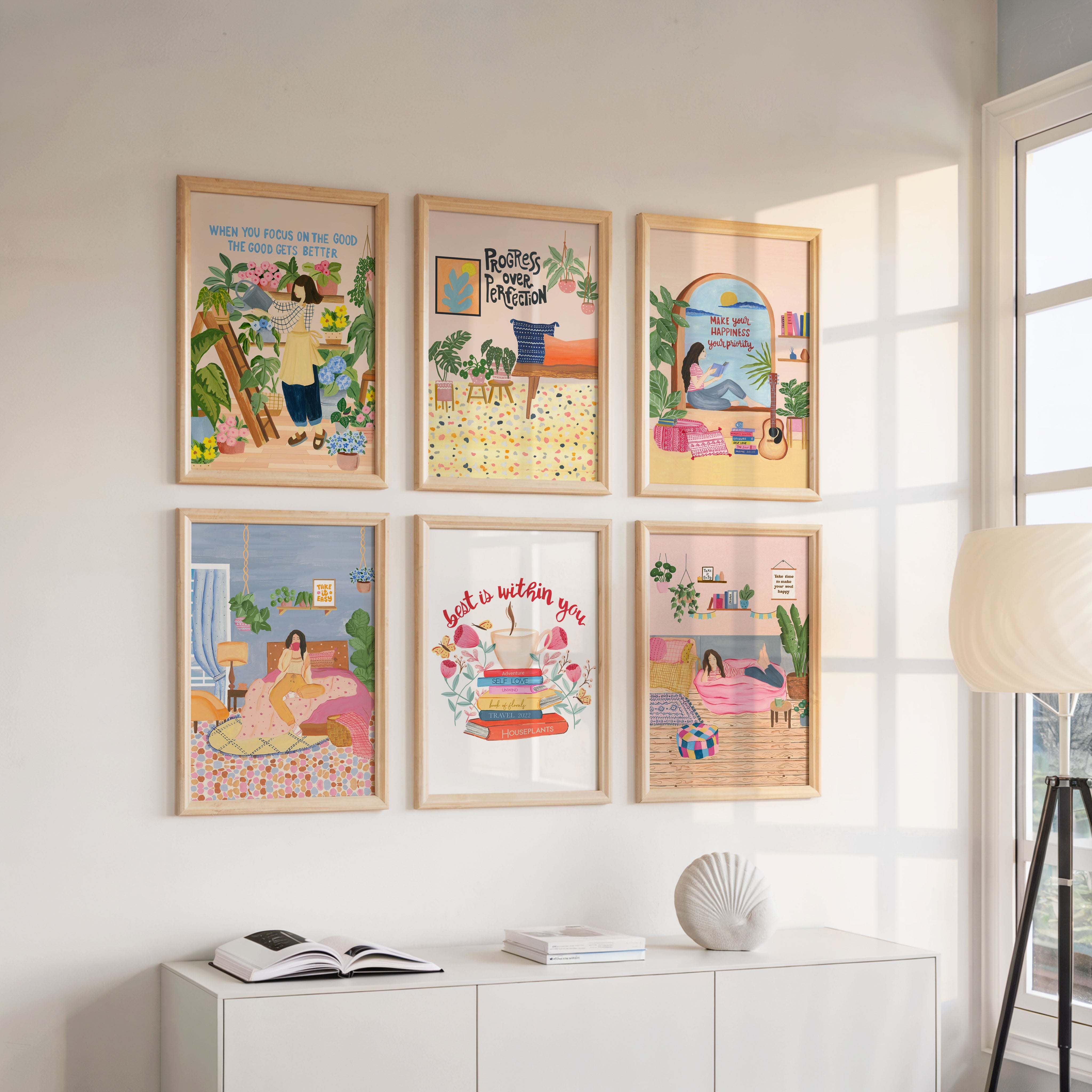 This delightful set of six wall art frames is a celebration of everyday joy, quiet moments, and the cozy comforts of home. Bursting with color and charm, each illustration tells a heartwarming story—from slow mornings with books and coffee to nurturing your favorite plants or simply enjoying a slice of cake. The soft pastels and whimsical details invite warmth and personality into any space, making it feel instantly lived-in and loved.